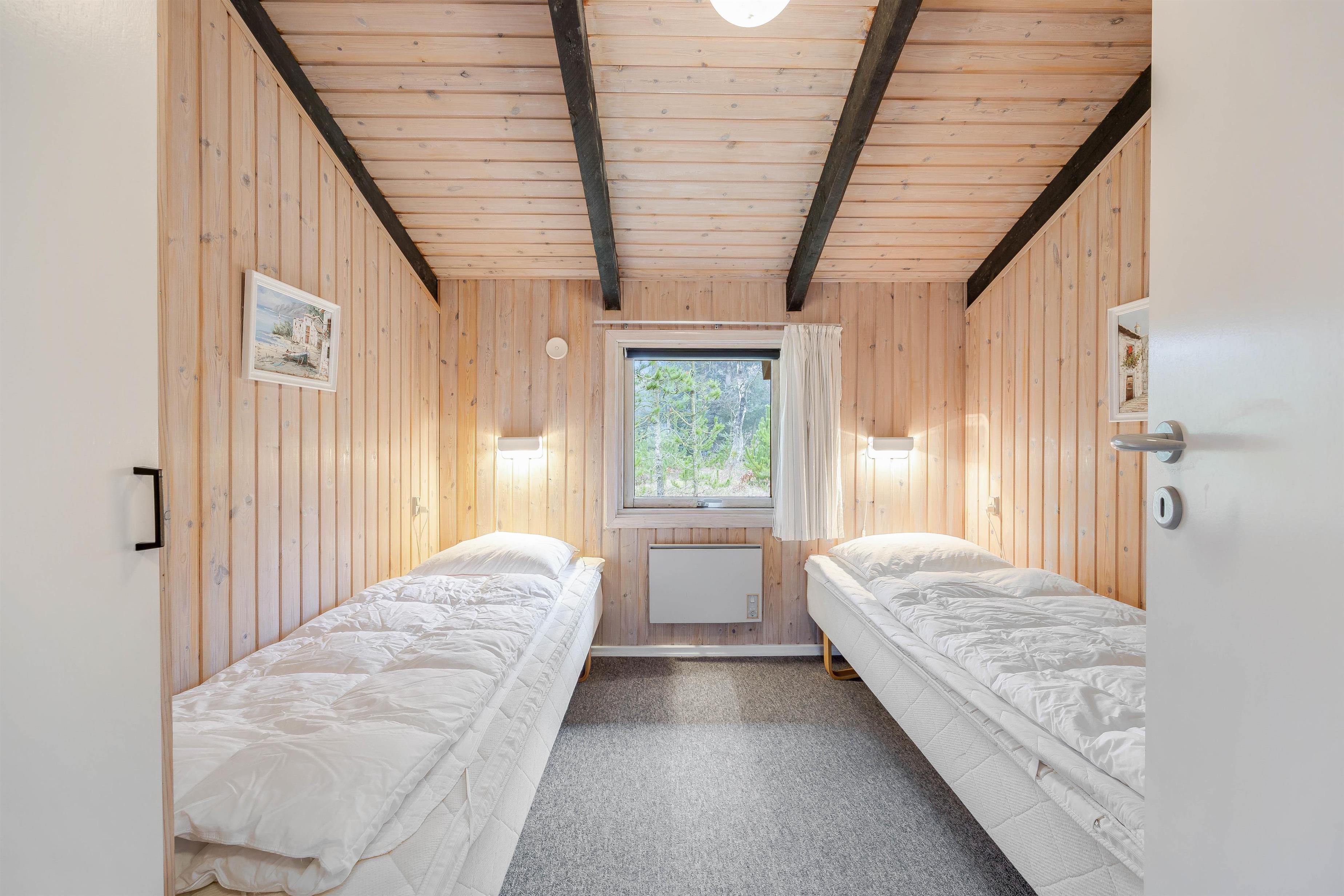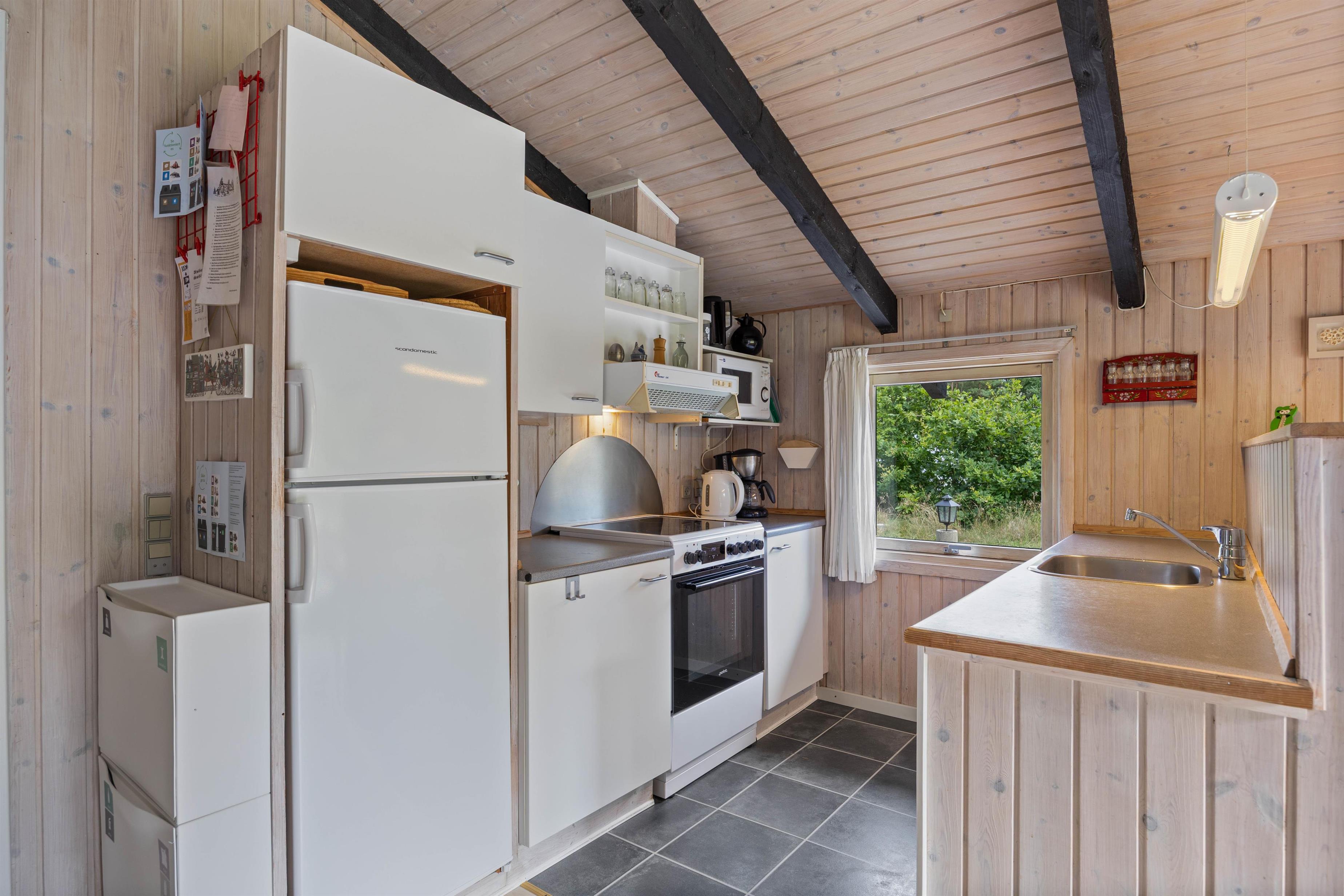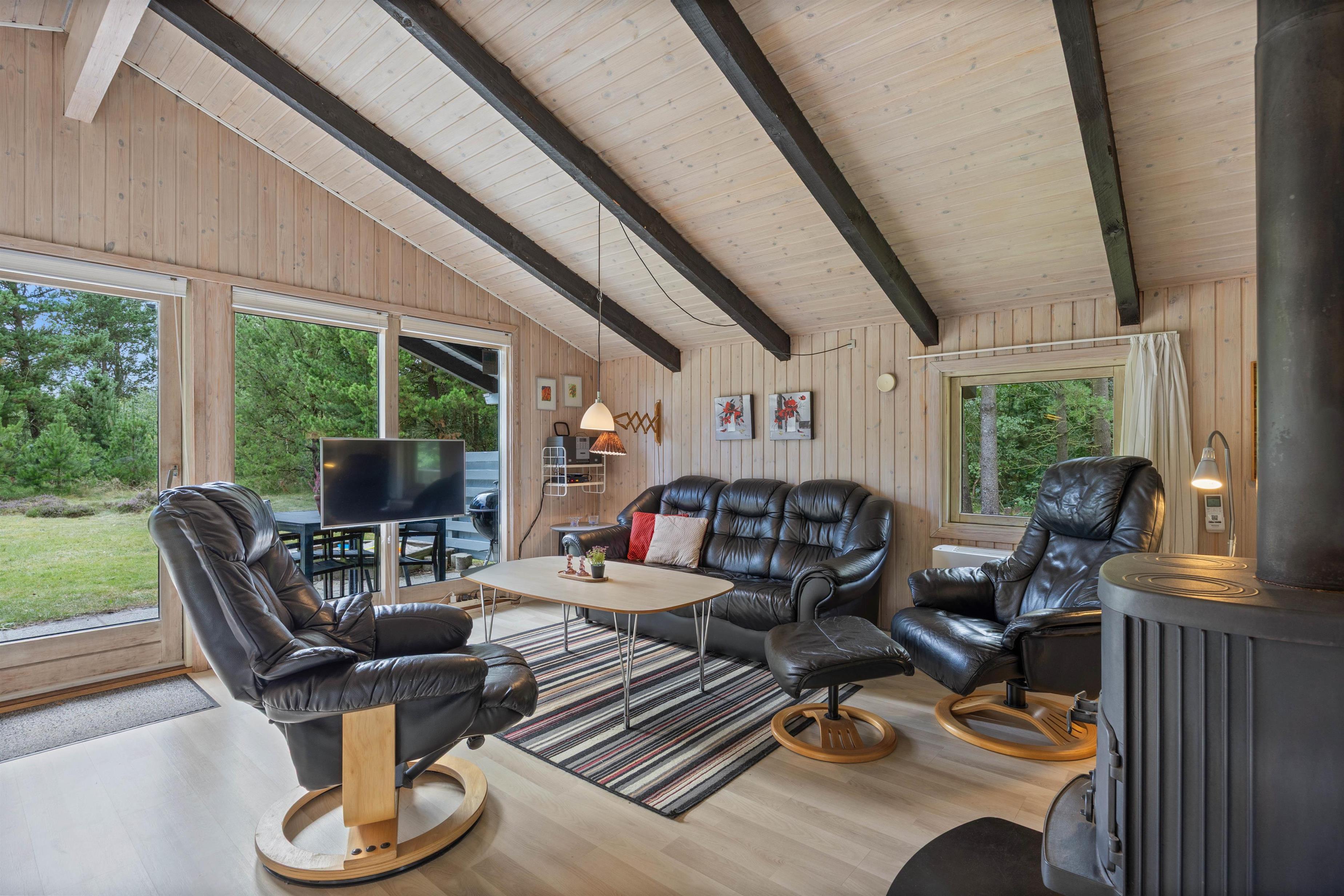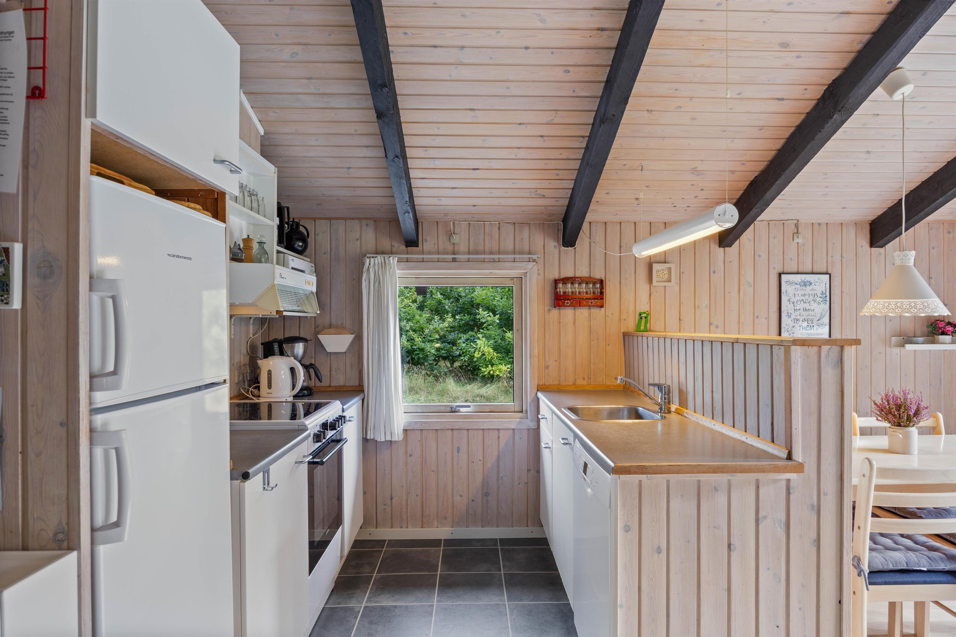 Feriehuset er lyst indrettet og med de sorte loftsbjælker, som går igen i hele huset, opnår det en hyggelig steming, som man kender fra et klassisk dansk feriehus.