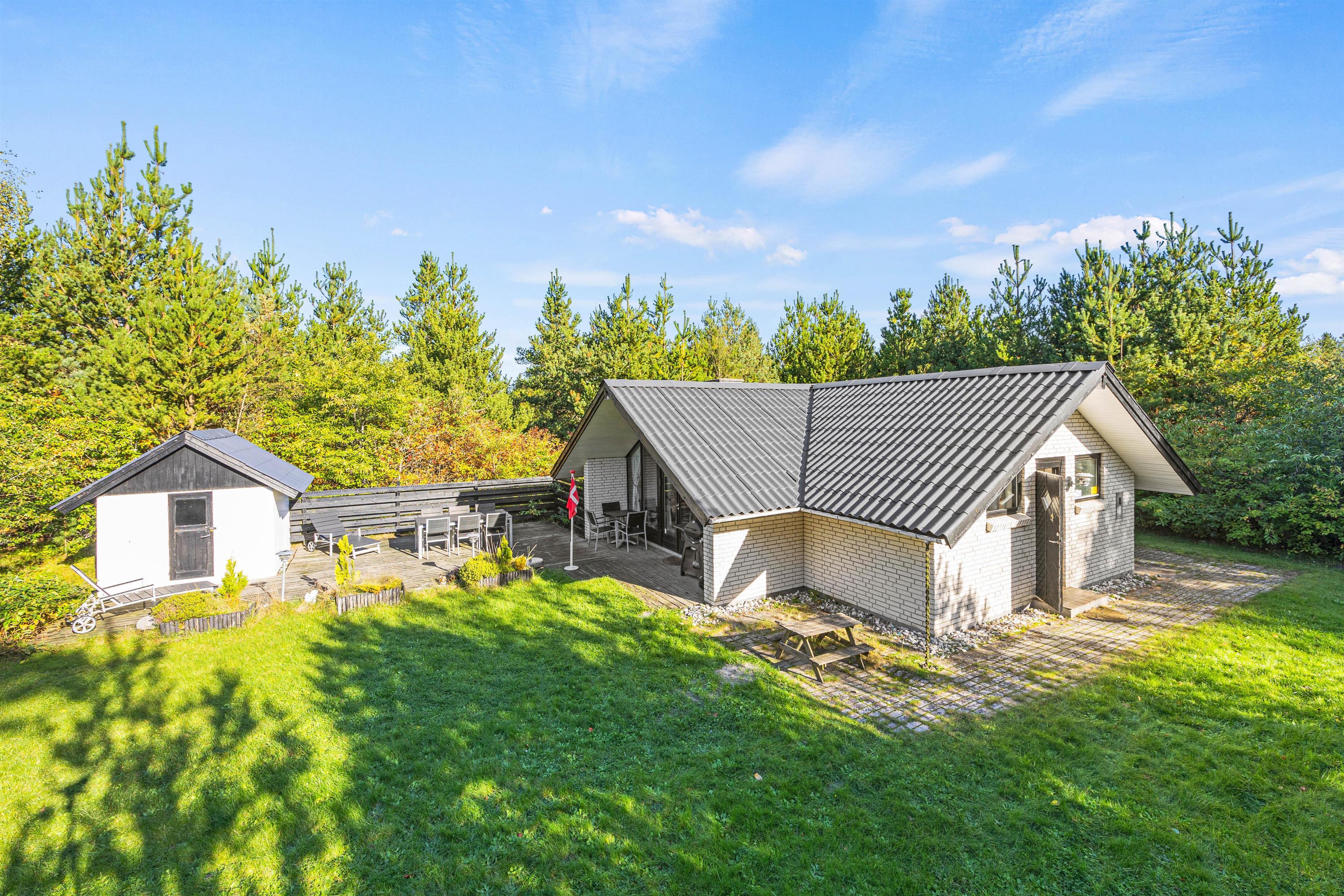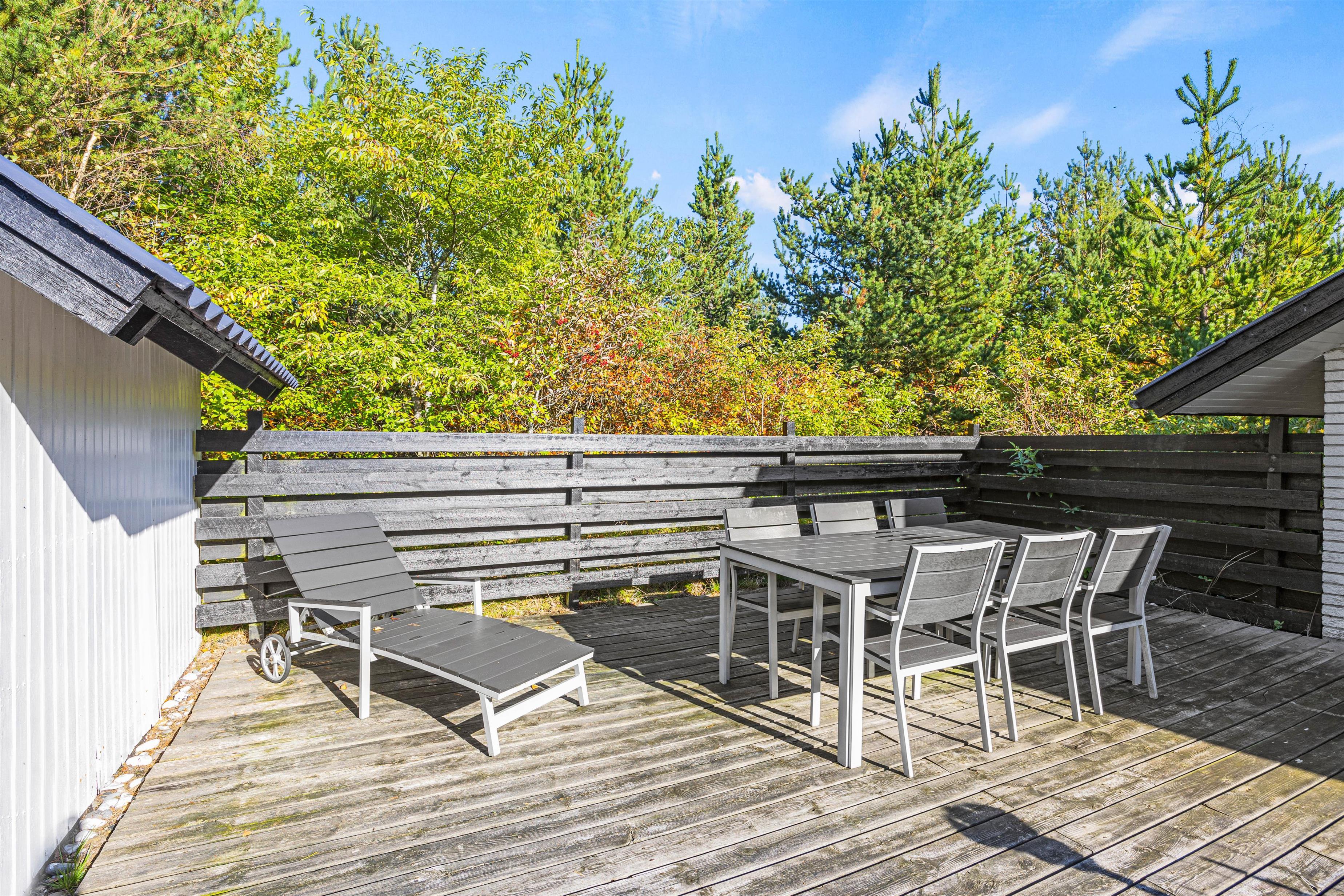 Fra stuen har I adgang til terrassen, som er afskærmet og dermed giver en masse privatliv. Her kan I sidde uforstyrret og nyde roen og naturen. Feriehuset er placeret på en naturgrund omgivet af grønne trækroner, og græsplænen indbyder til leg. Her kan børnene boltre sig med boldspil eller underholde jeres firbenede ven. Her er også en gasgrill til rådighed, som I er velkommen til at bruge - hvad med hjemmelavede burgere tilberedt på grillen? Det vil helt sikkert være et hit hos alle. Fra haven er det desuden ikke ualmindeligt at se egern eller rådyr, som af og til passerer skoven.