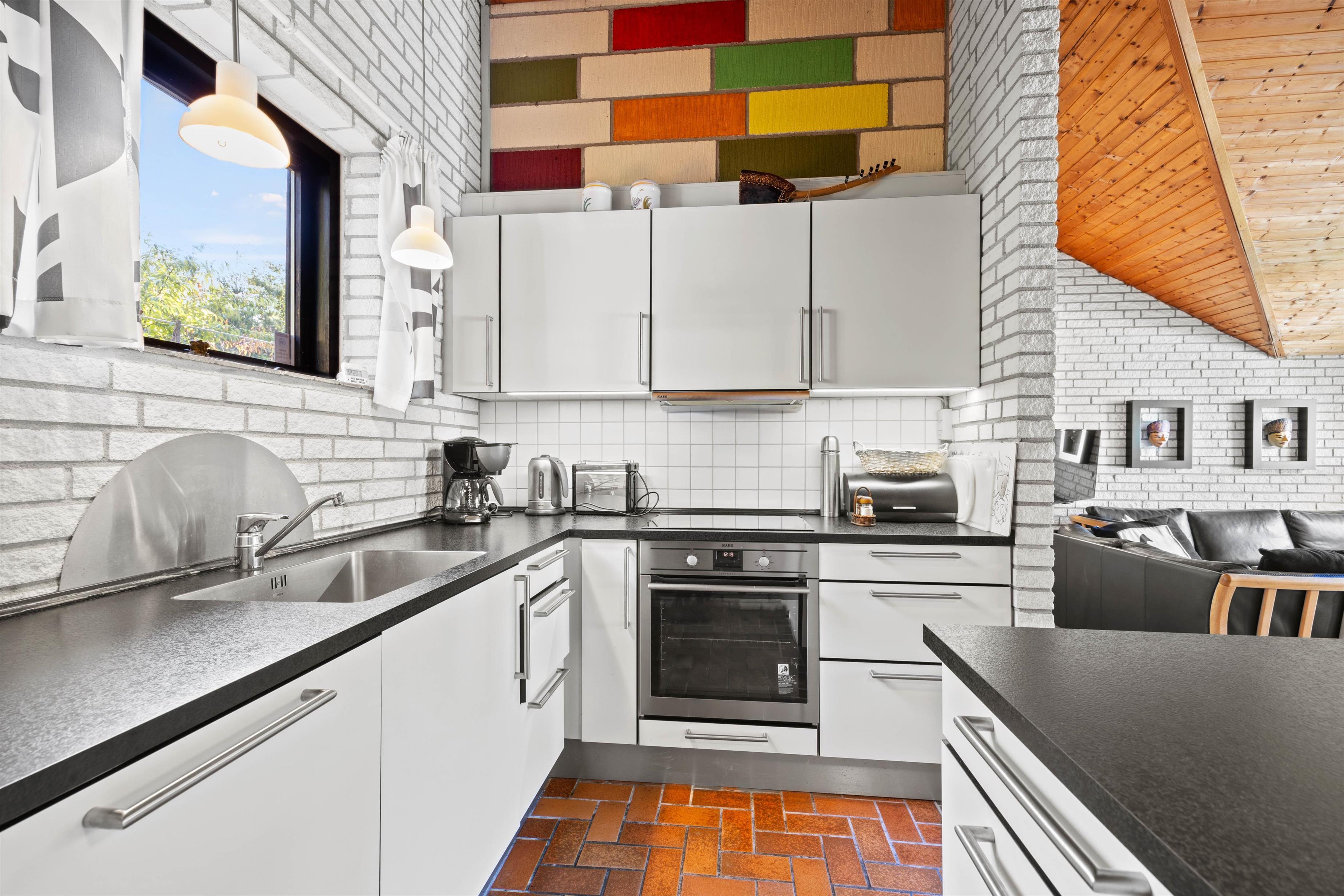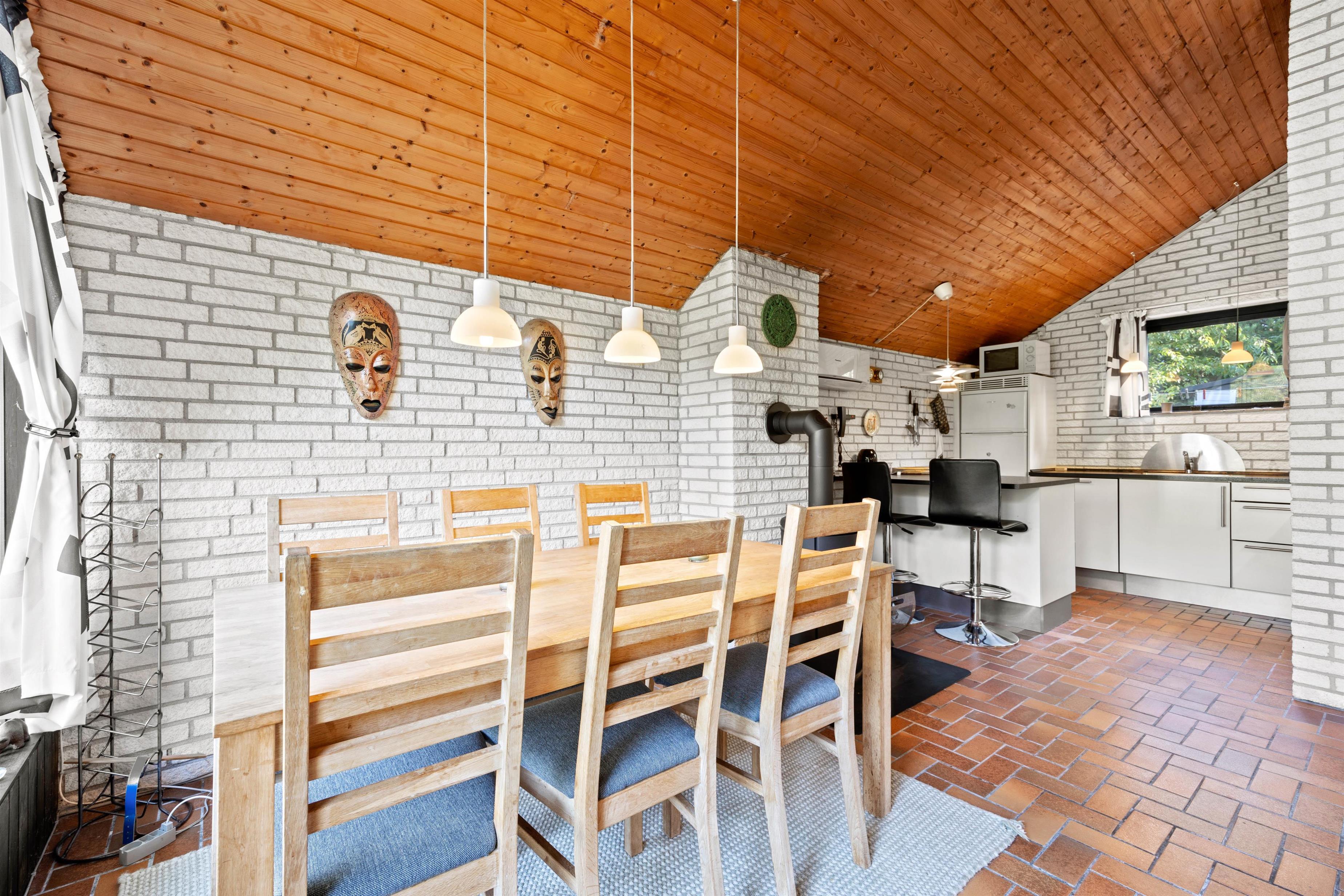 Samlingspunktet bliver uden tvivl alrummet. Her finder I køkkenet i åben forbindelse til stuen med spiseplads lige ved siden af brændeovnen. Med loft til kip og de store vinduer giver dejligt naturligt lys. Sæt jer til rette i sofaen og mens I læser en god bog, kan I mærke pejsens varme. Køkkenet giver gode muligheder for at tilberede feriemåltider, mens børnene kan sidde på barstolene og se på. Efter maden klarer opvaskemaskinen resten, så I har mere tid til hinanden. Her er installeret en energivenlig varmepumpe, som sikrer en behagelig temperatur året rundt.