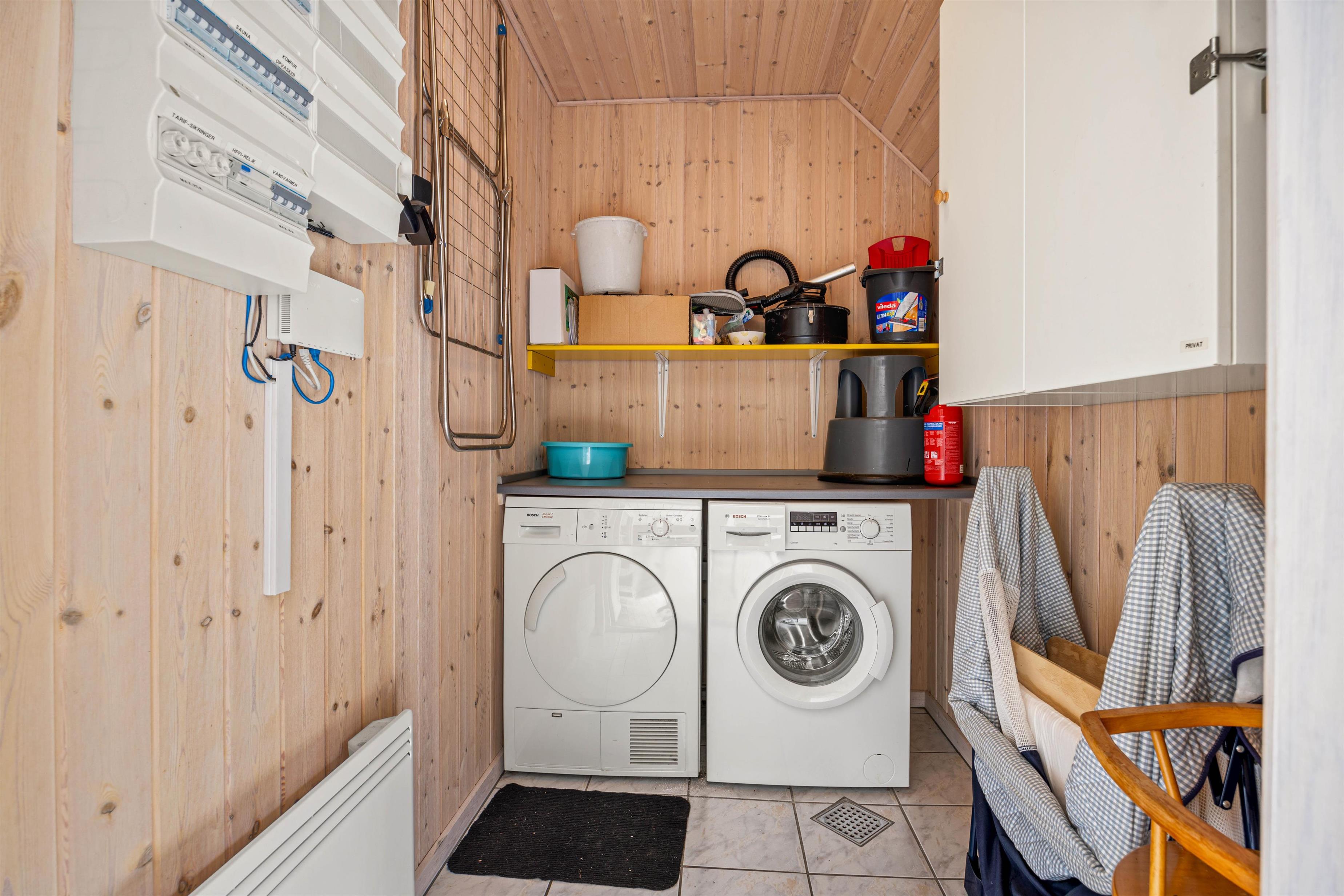 Indenfor venter en hyggelig, åben opholdsstue, udstyret med tv og Bluetooth-højtaler for den bedste underholdning. Slå jer ned i sofaen, læs en bog, eller nyd udsigten til haven. En energibesparende varmepumpe sørger for behagelig temperatur året rundt, mens brændeovnen skaber ekstra hygge på kolde dage. Den typisk danske indretning harmonerer smukt med de lyse trævægge og -lofter samt det praktiske klinkegulv.