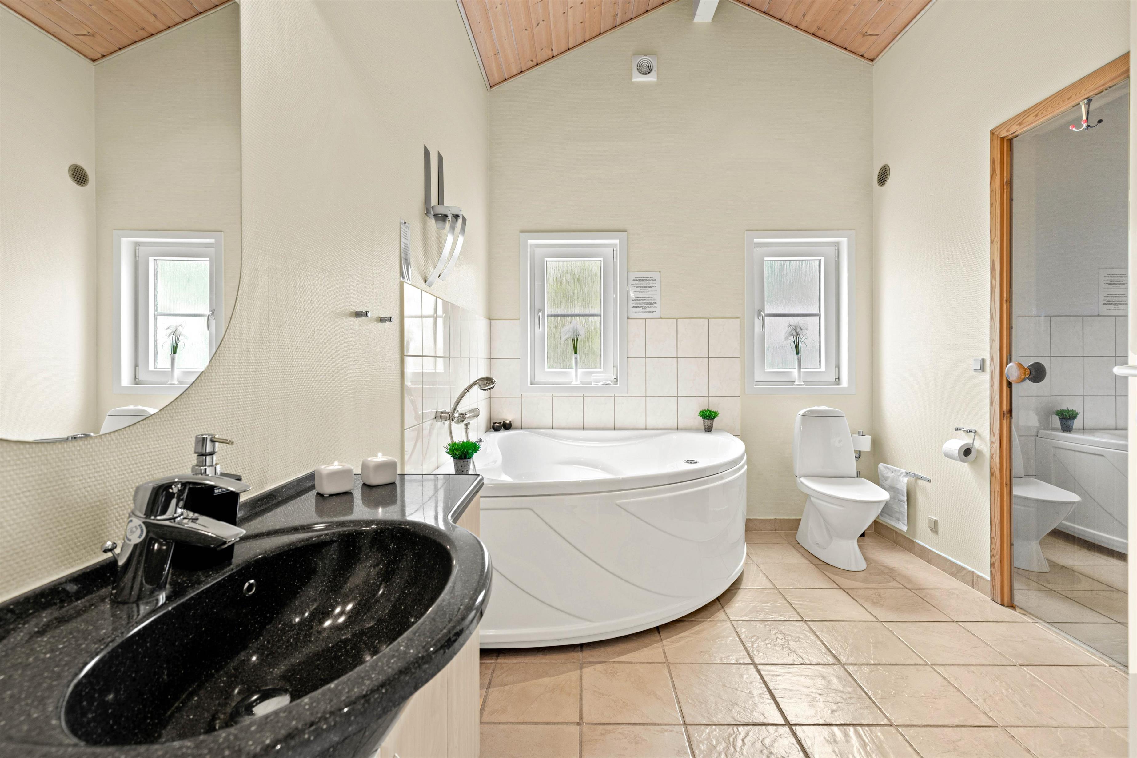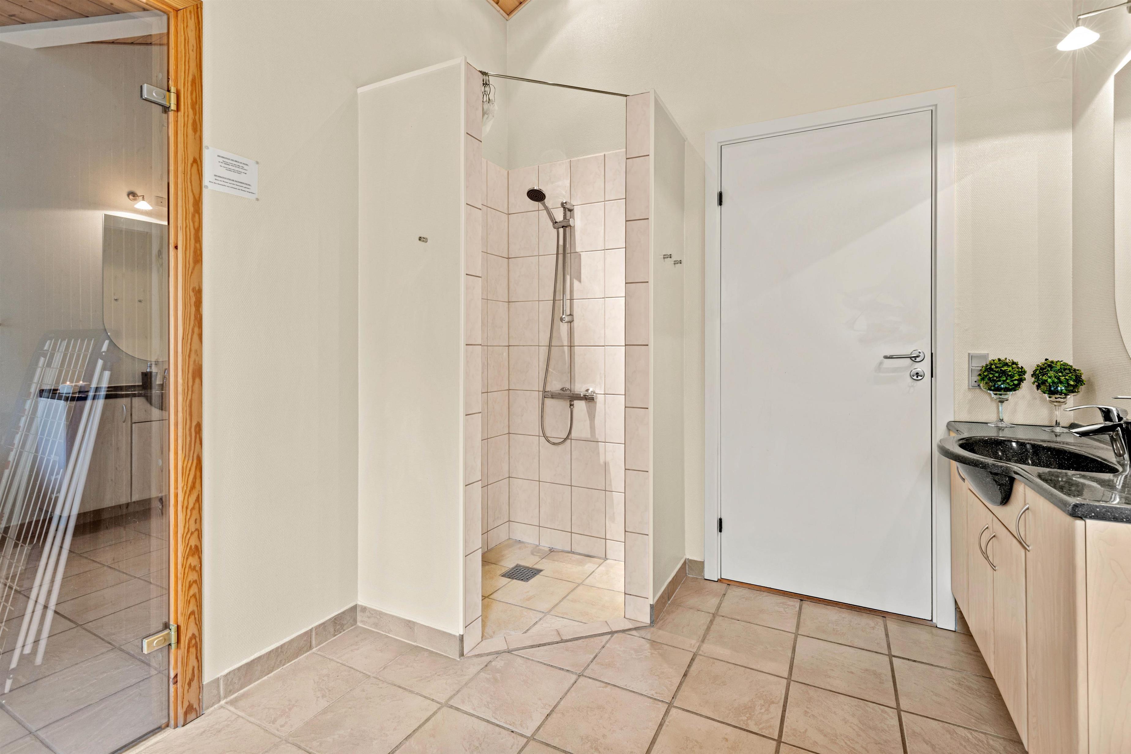 Sommerhuset er praktisk opdelt, så I uden problemer kan holde ferie sammen med vennerne eller to familier sammen. Om morgenen kan I undgå kø til badeværelset, da huset er udstyret med to af slagsen. I det ene badeværelse finder I endda en sauna og et spabad, så der kan slappes godt af efter en feriedag ude i den friske luft.