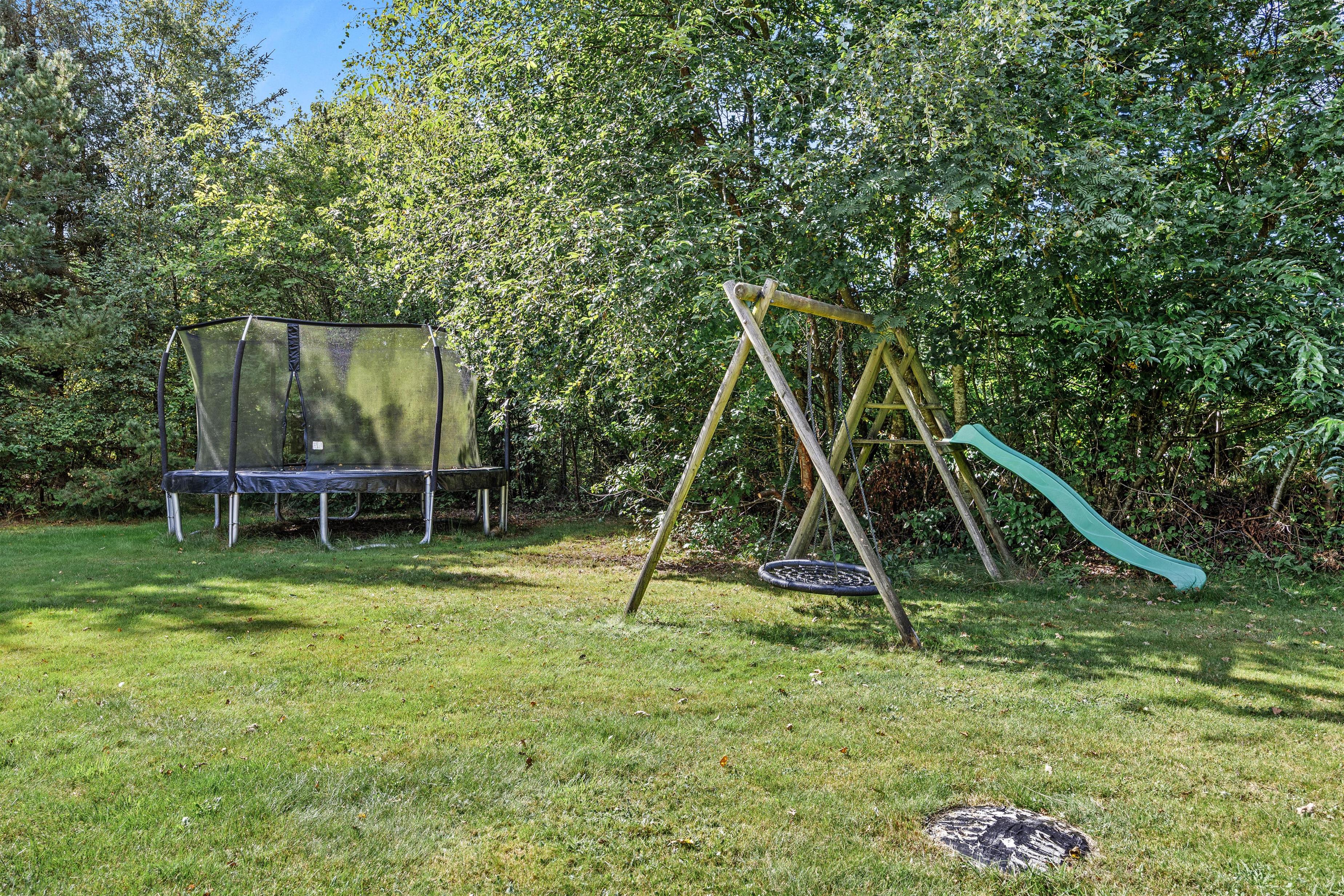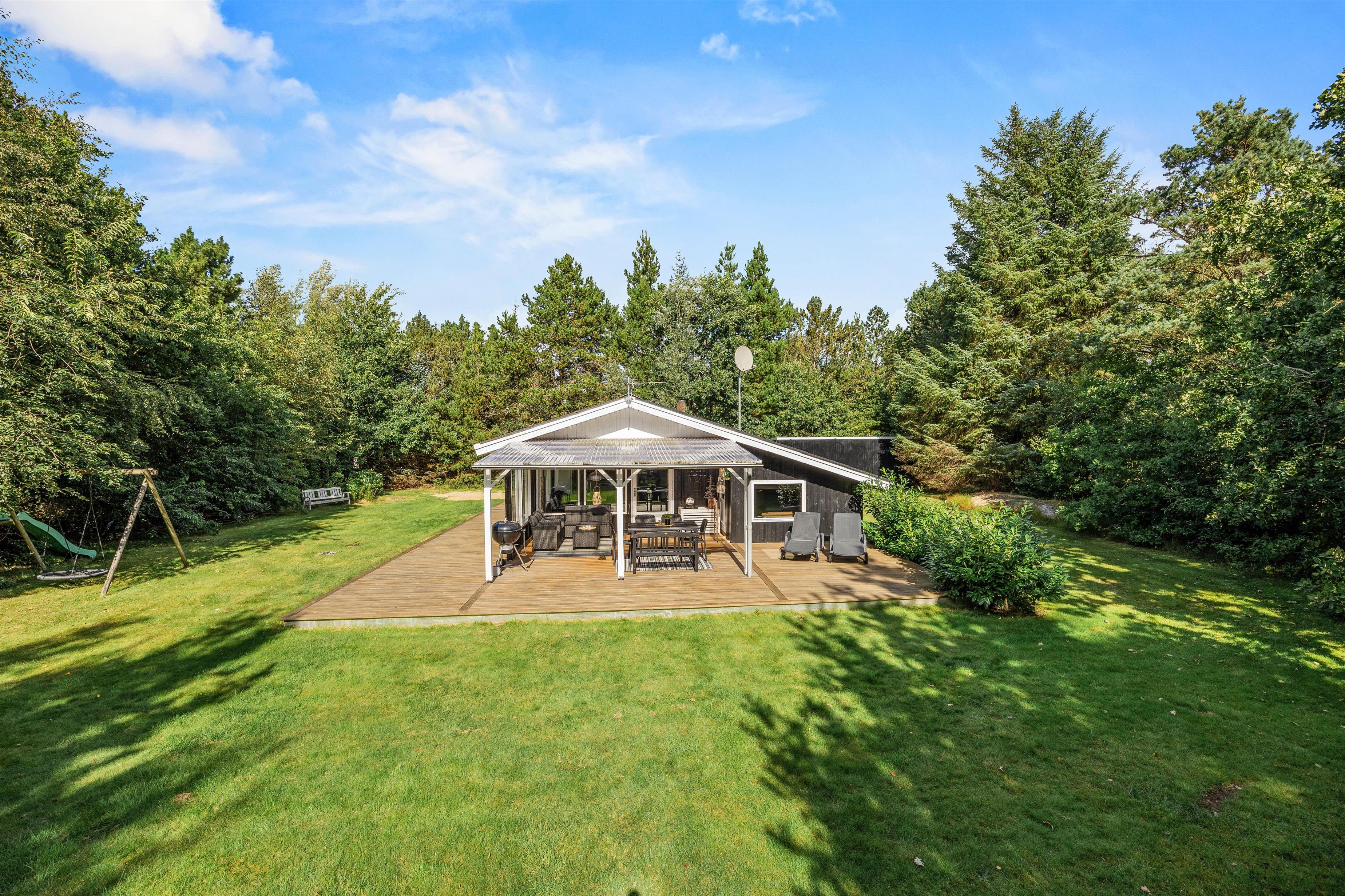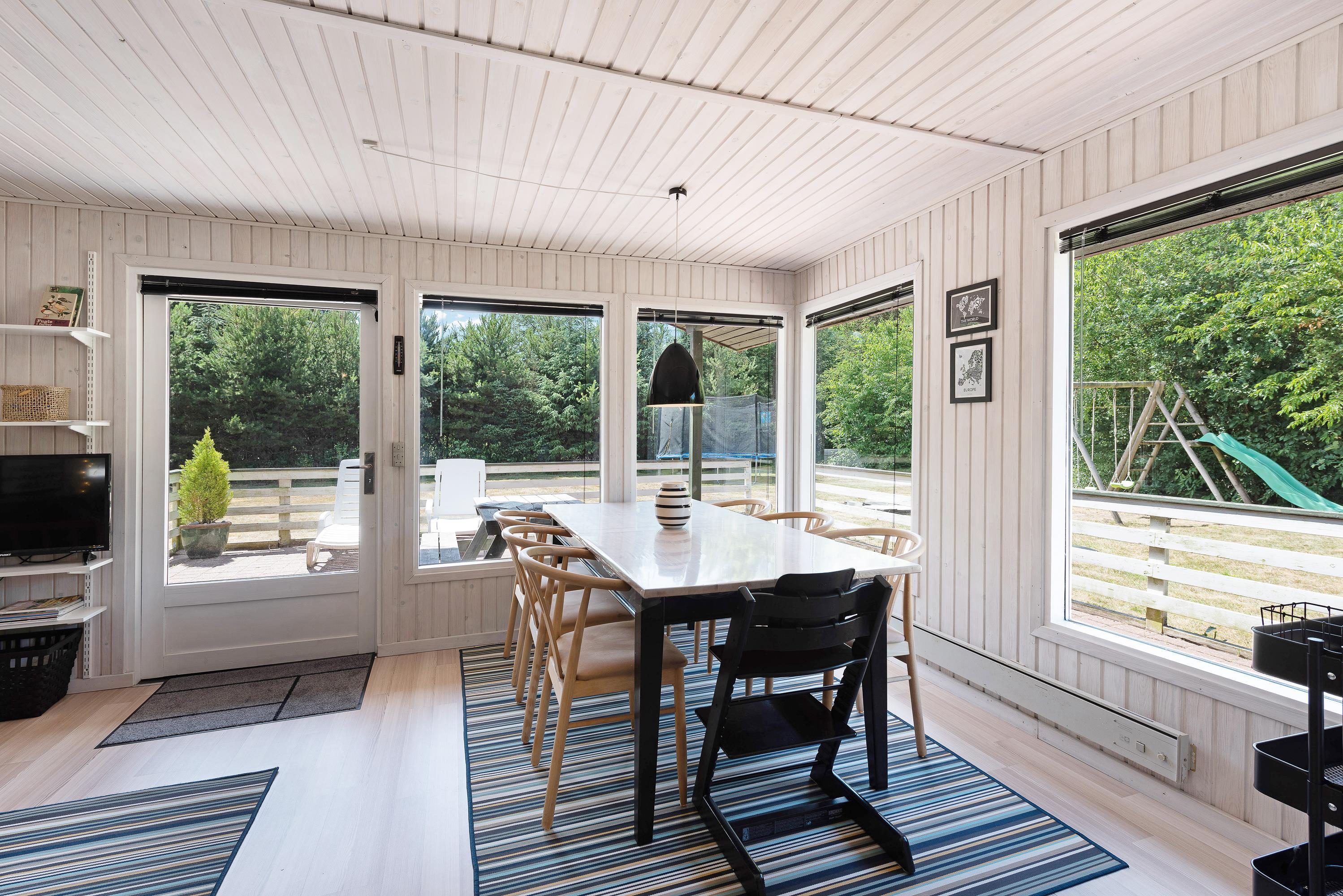 Huset er perfekt til familien med et soveværelse med en stor dobbeltseng, et værelse med 1 3/4 seng og et værelse med en køjeseng. Husets samlingspunkt er stue-alrummet med det moderne lyse køkken, der ikke er stort, men rummer alt I har brug for, - også opvaskemaskine. Her kan I føle jer rigtigt velkomne, -det lyse træværk giver sammen med de moderne møbler og tæpper en dejlig frisk feriehusstemning. Det store spisebord indbyder til lange hyggeaftener med god mad og spil, imens ilden knitrer i brændeovnen og sørger for ekstra hyggestemning og varme. Store vinduer til flere sider giver et dejligt lys og udsigt til naturgrunden. Herfra kan du også følge med i børnenes leg på husets gynger.