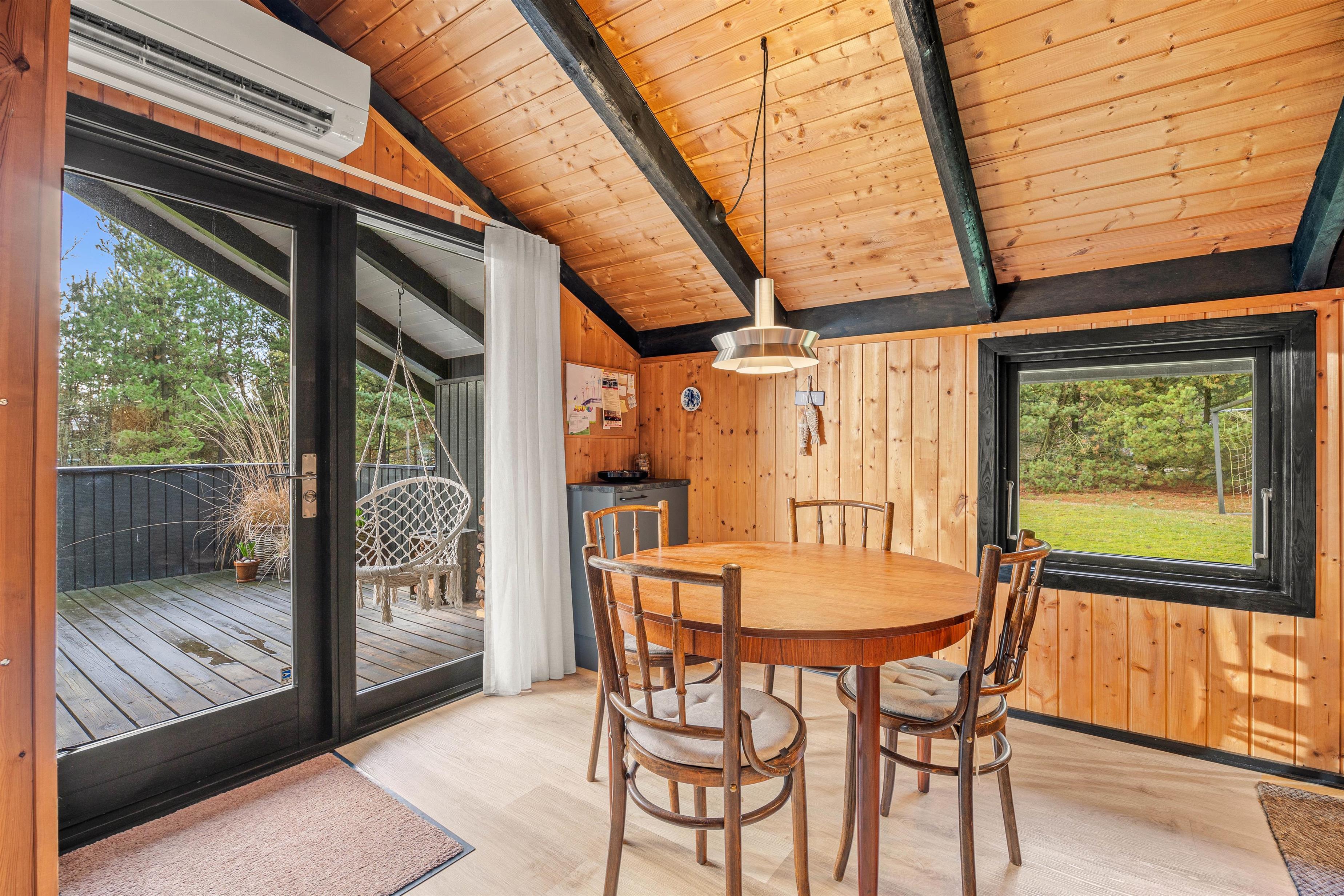 Indenfor byder sommerhuset på et veldisponeret indeareal, der perfekt kombinerer komfort og funktionalitet. Den indbydende stue er centrum for hygge og samvær med sin dejlige brændeovn, som både varmer og bidrager til den hjemlige atmosfære. I det veludstyrede køkken vil opvaskemaskinen være en kærkommen hjælp efter jeres måltider, hvilket giver jer mere tid til afslapning.