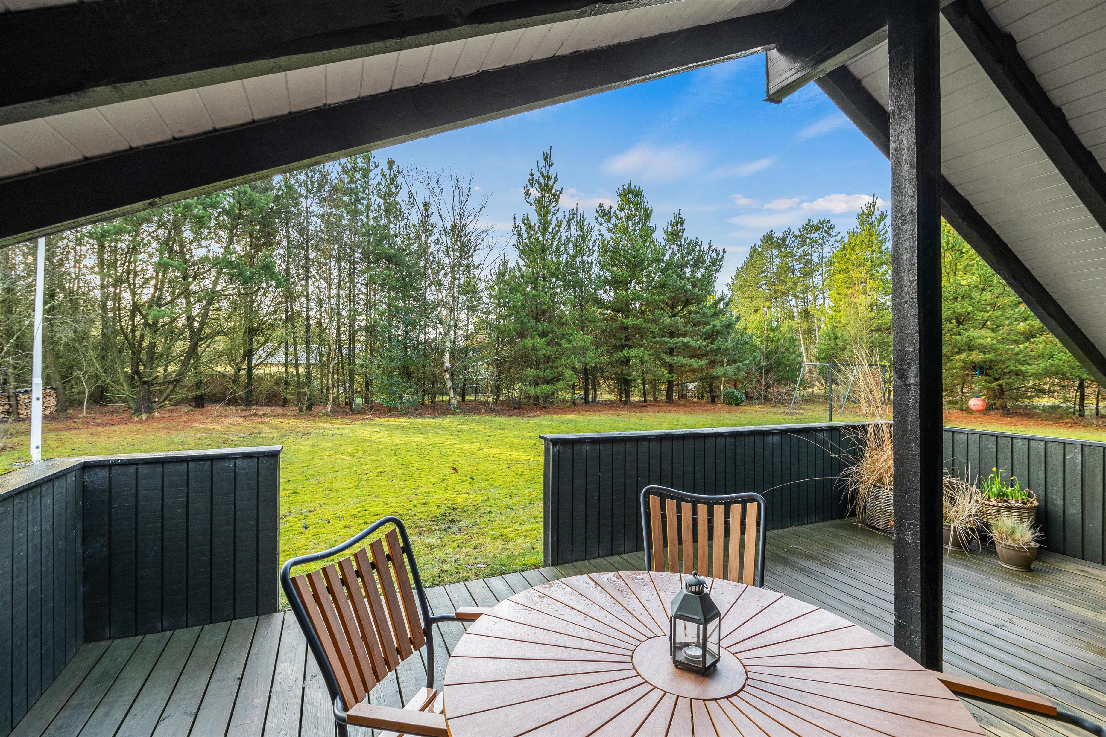 Sommerhuset er omgivet af en fantastisk kombination af en plænegrund og en naturgrund, der giver jer en følelse af at være tæt på naturen, mens I nyder roen. Her er rigelig plads til leg og afslapning i det fri for både voksne og børn. Den åbne, afskærmede og overdækkede terrasse er en oase af komfort, hvor I kan nyde jeres morgenkaffe eller aftensmad under åben himmel, uanset vejret.