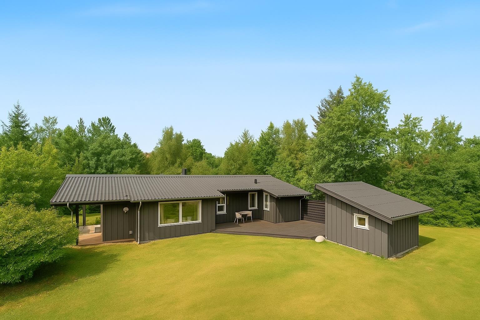 Feriehuset ligger på en imponerende naturgrund på 2.299 m², som giver masser af plads til udendørs aktiviteter. På den delvist overdækkede terrasse kan I nyde solen eller slappe af i skyggen. Gode havemøbler og liggestole inviterer til afslapning, mens en gasgrill står klar til perfekte grillaftener. Her kan I nyde naturens skønhed og lade sjælen få ro.