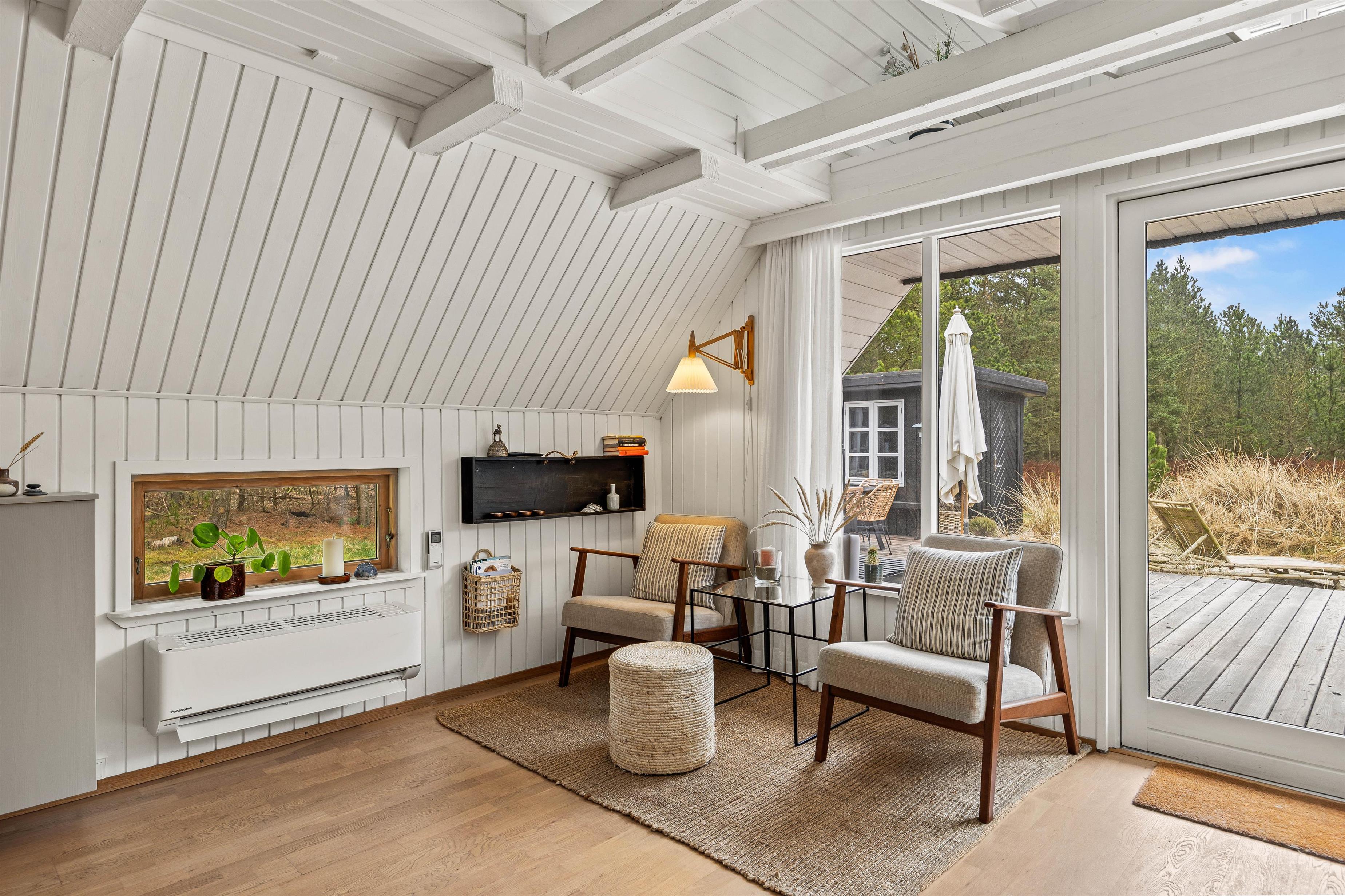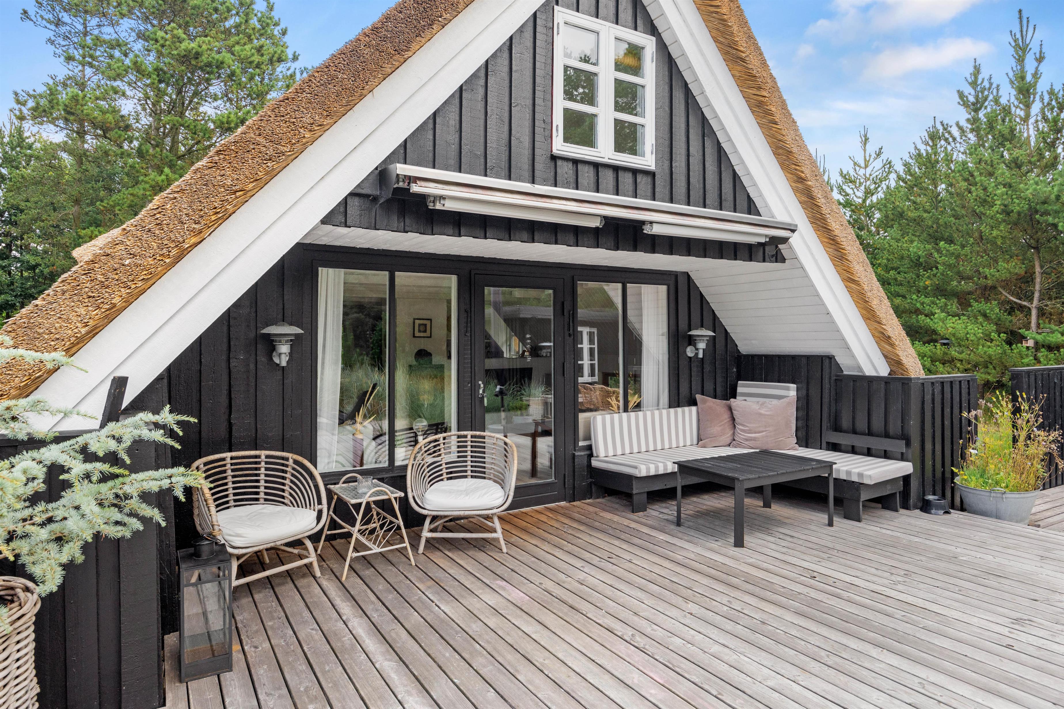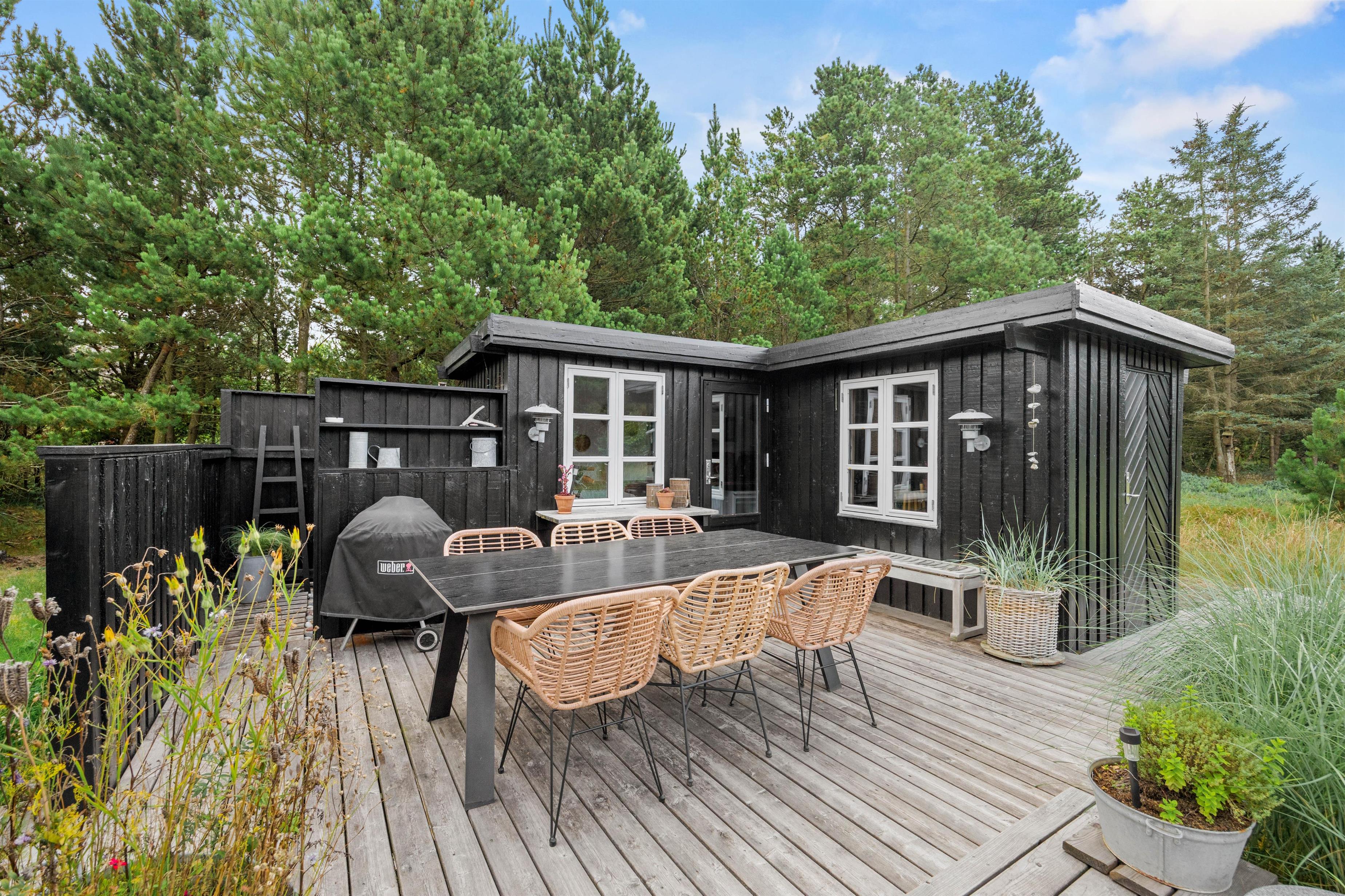 Sommerhuset er omkranset af høje træer, der sikrer et privat rum, hvor I kan finde ro og fordybelse. Fra terrassen har I desuden udsigt over den store naturgrund, der rummer rig mulighed for udforskning og leg.