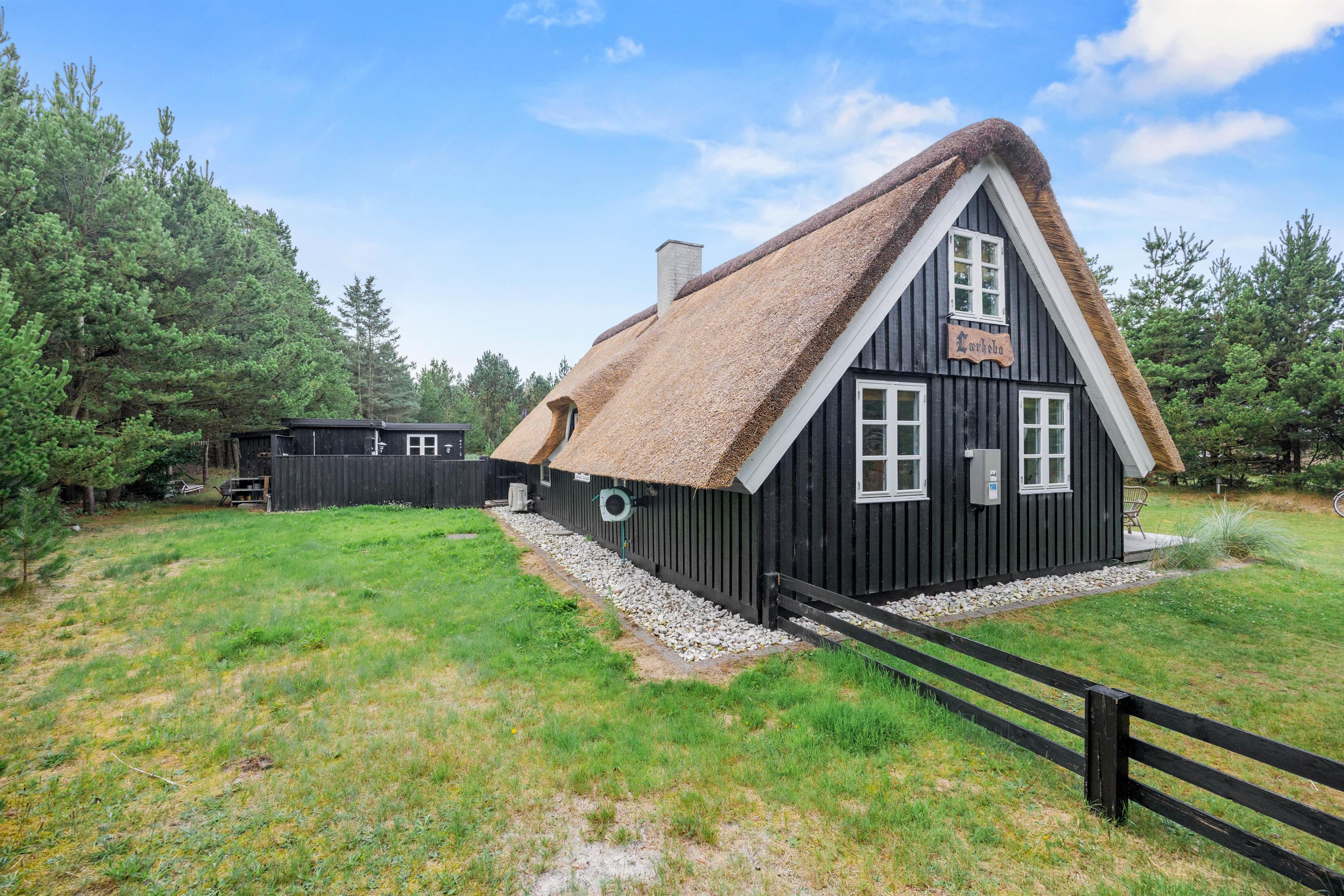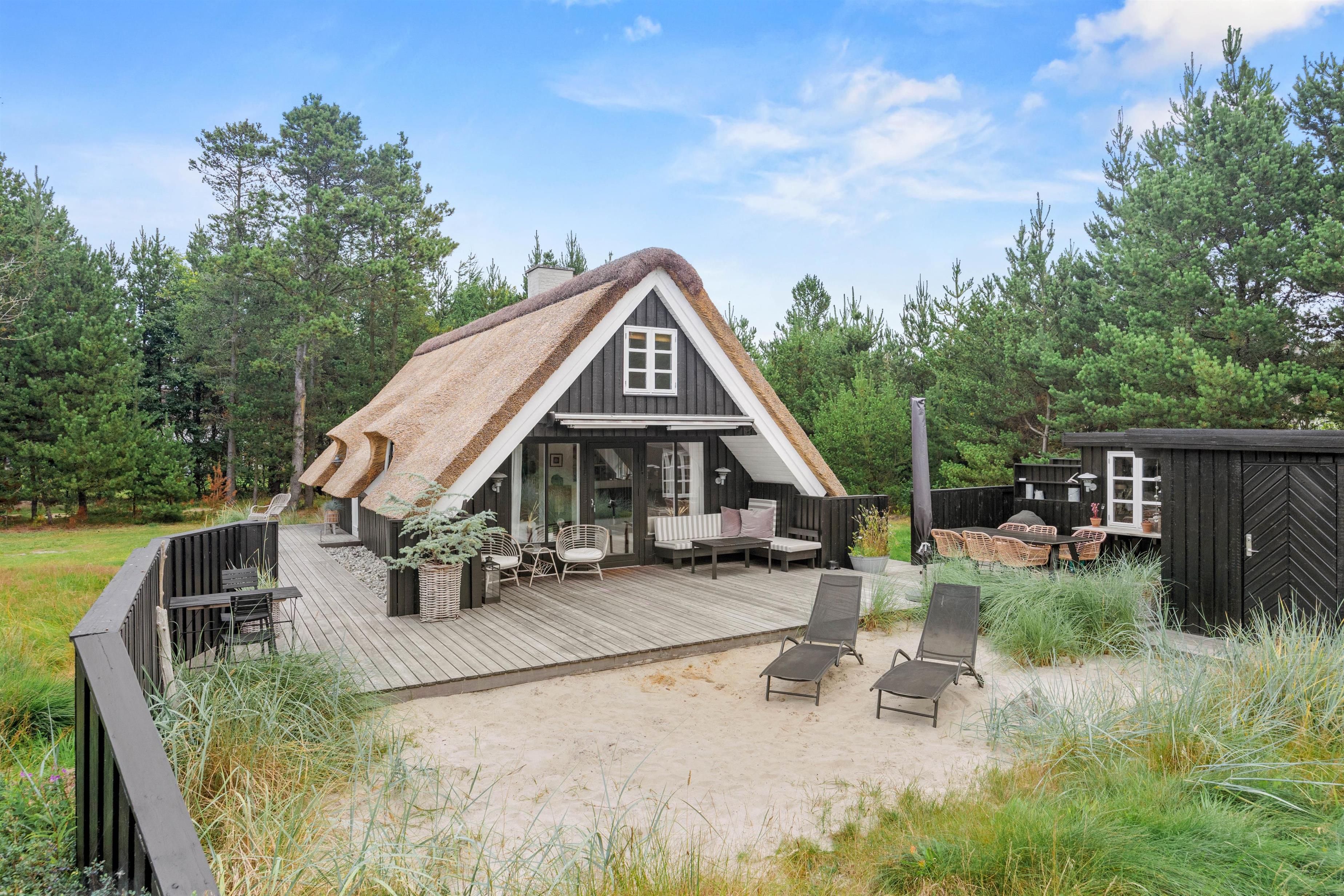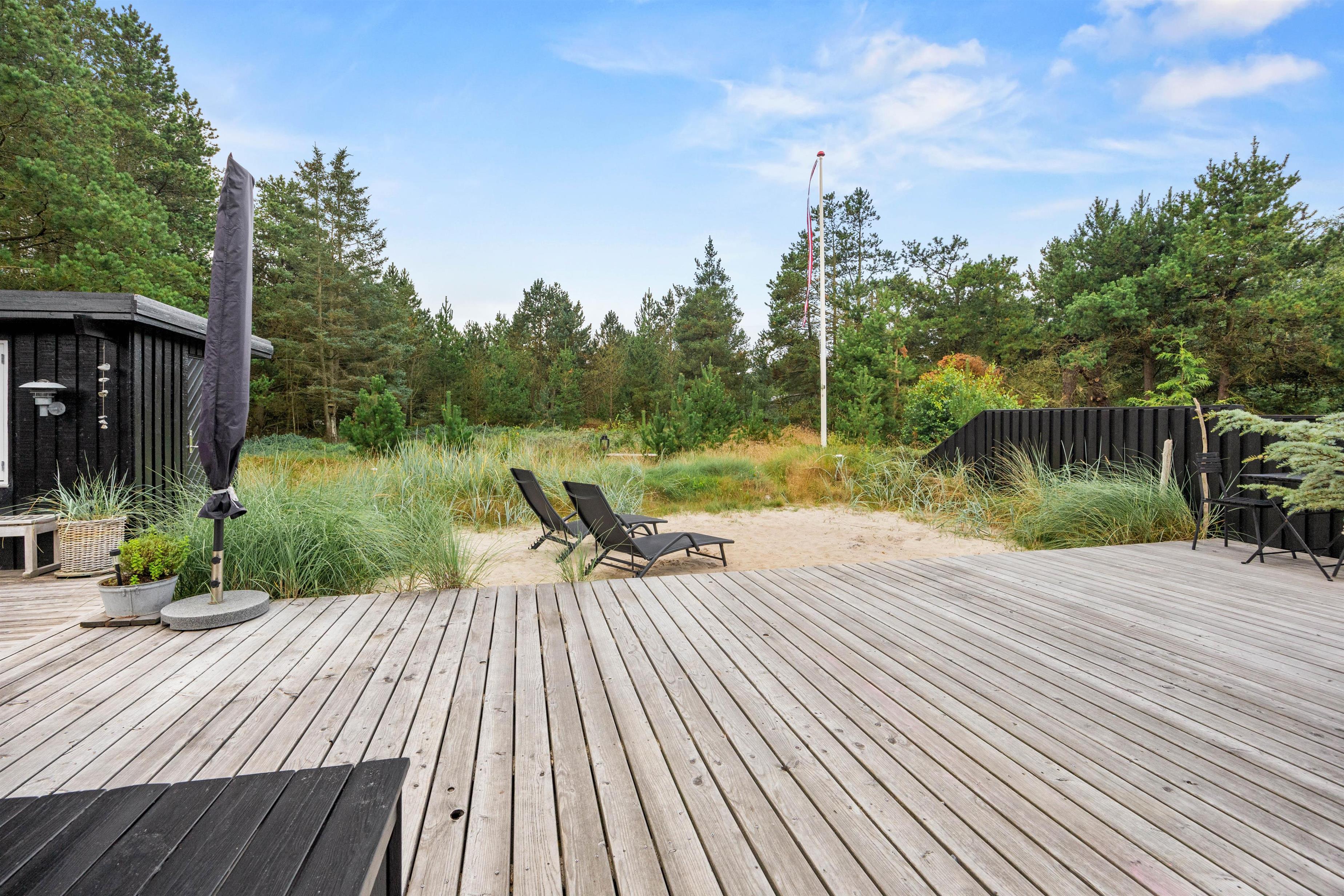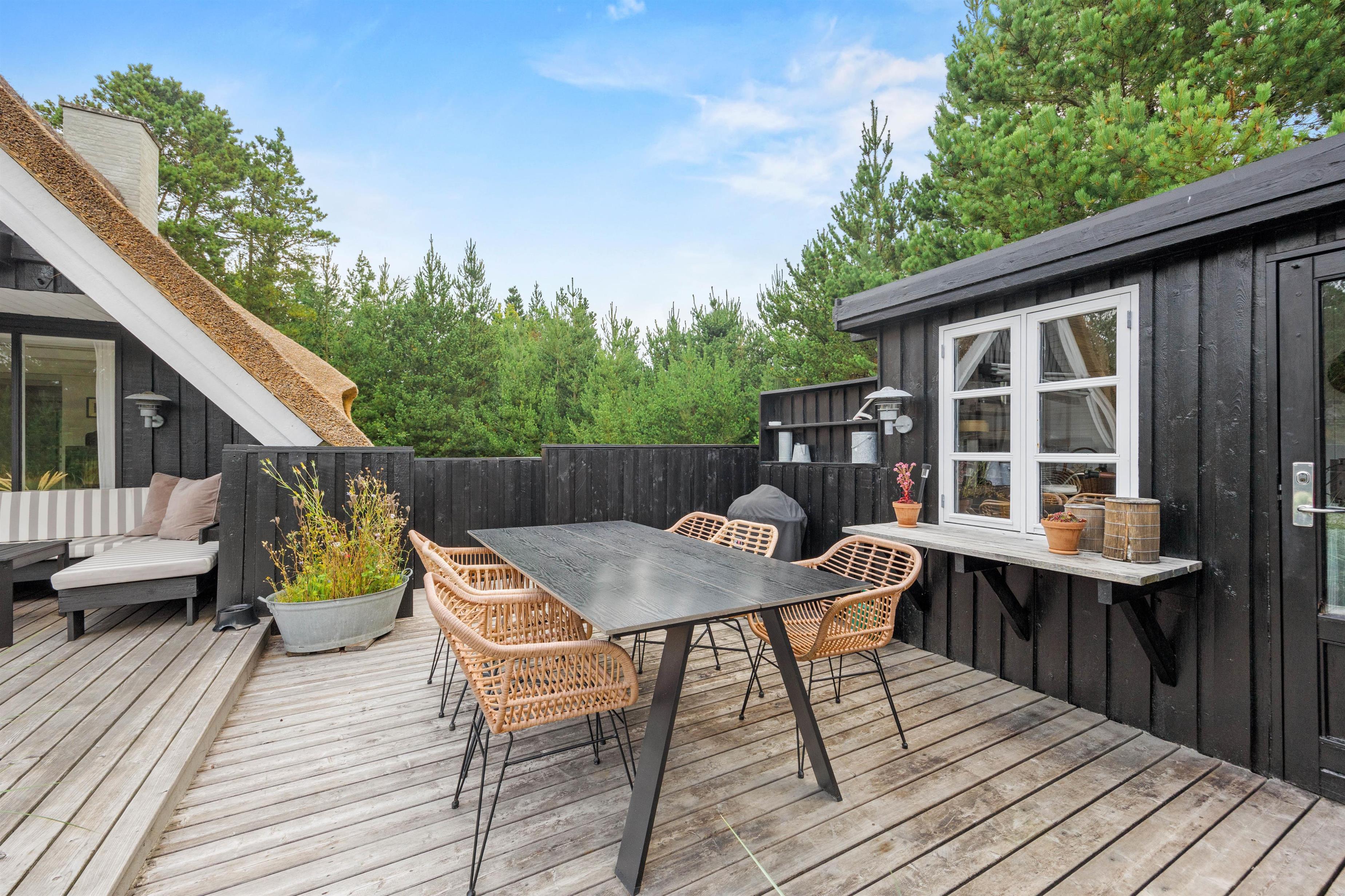 Sommerhuset er omkranset af høje træer, der sikrer et privat rum, hvor I kan finde ro og fordybelse. Fra terrassen har I desuden udsigt over den store naturgrund, der rummer rig mulighed for udforskning og leg.