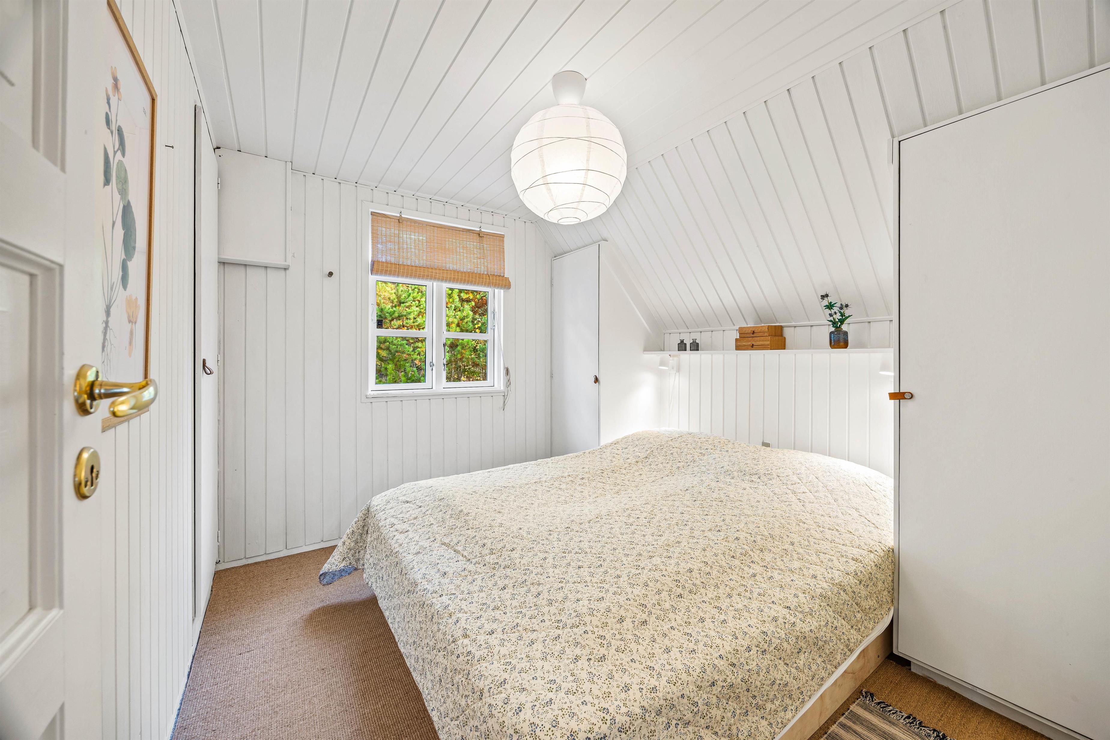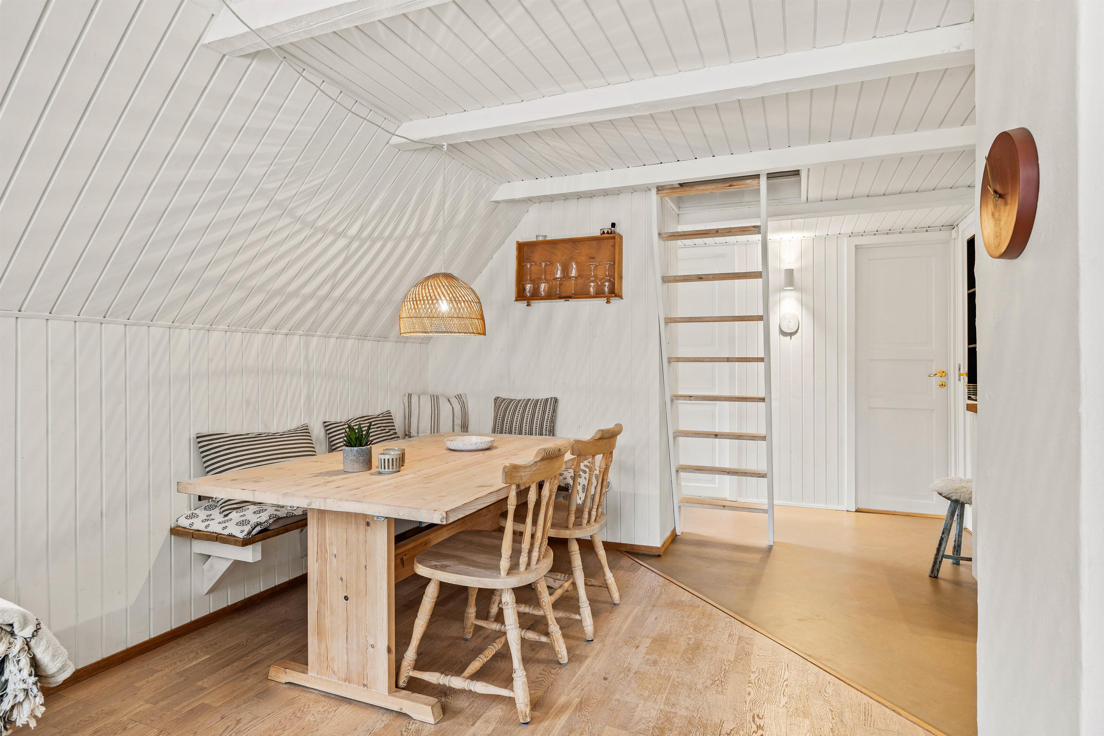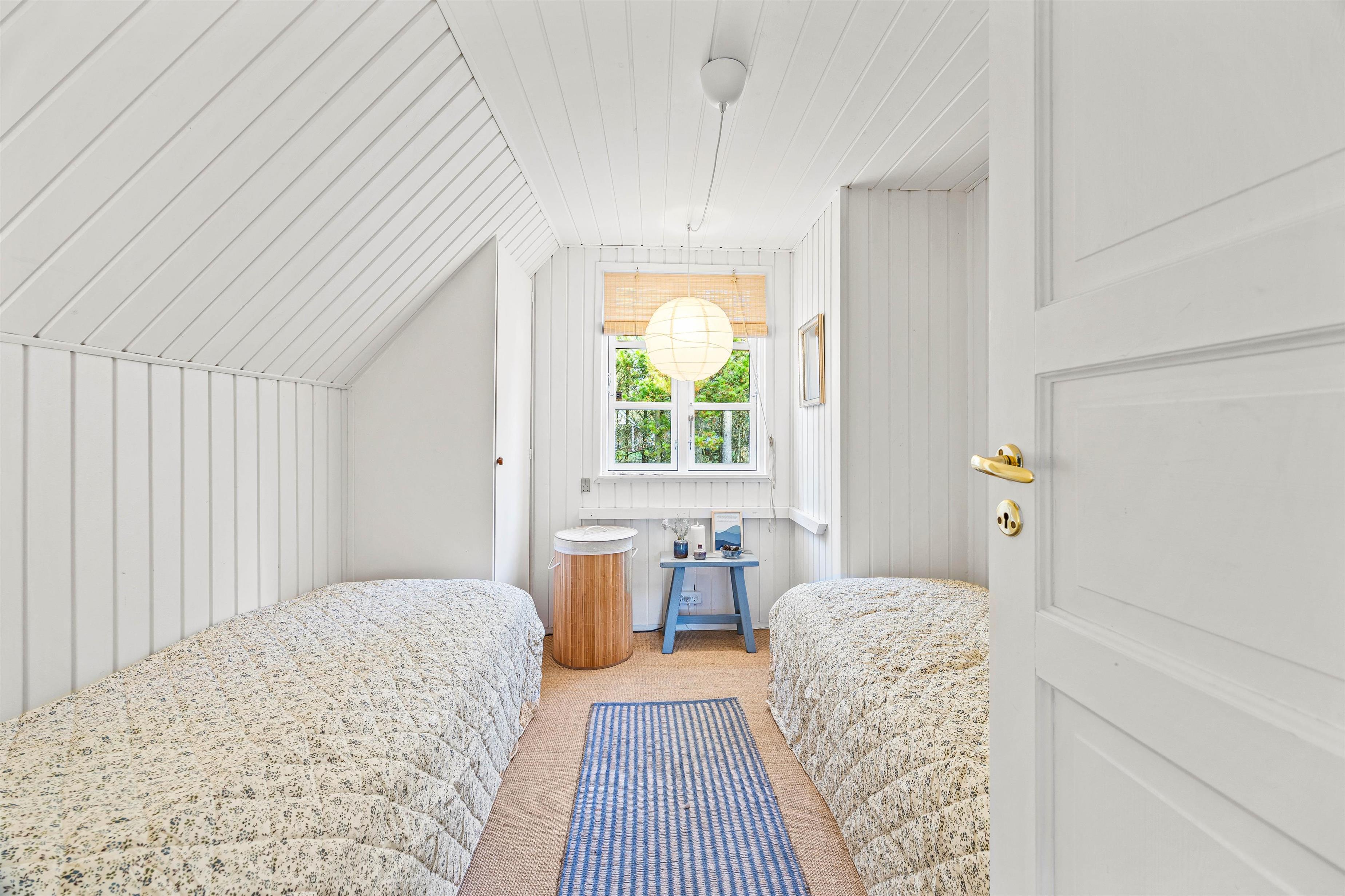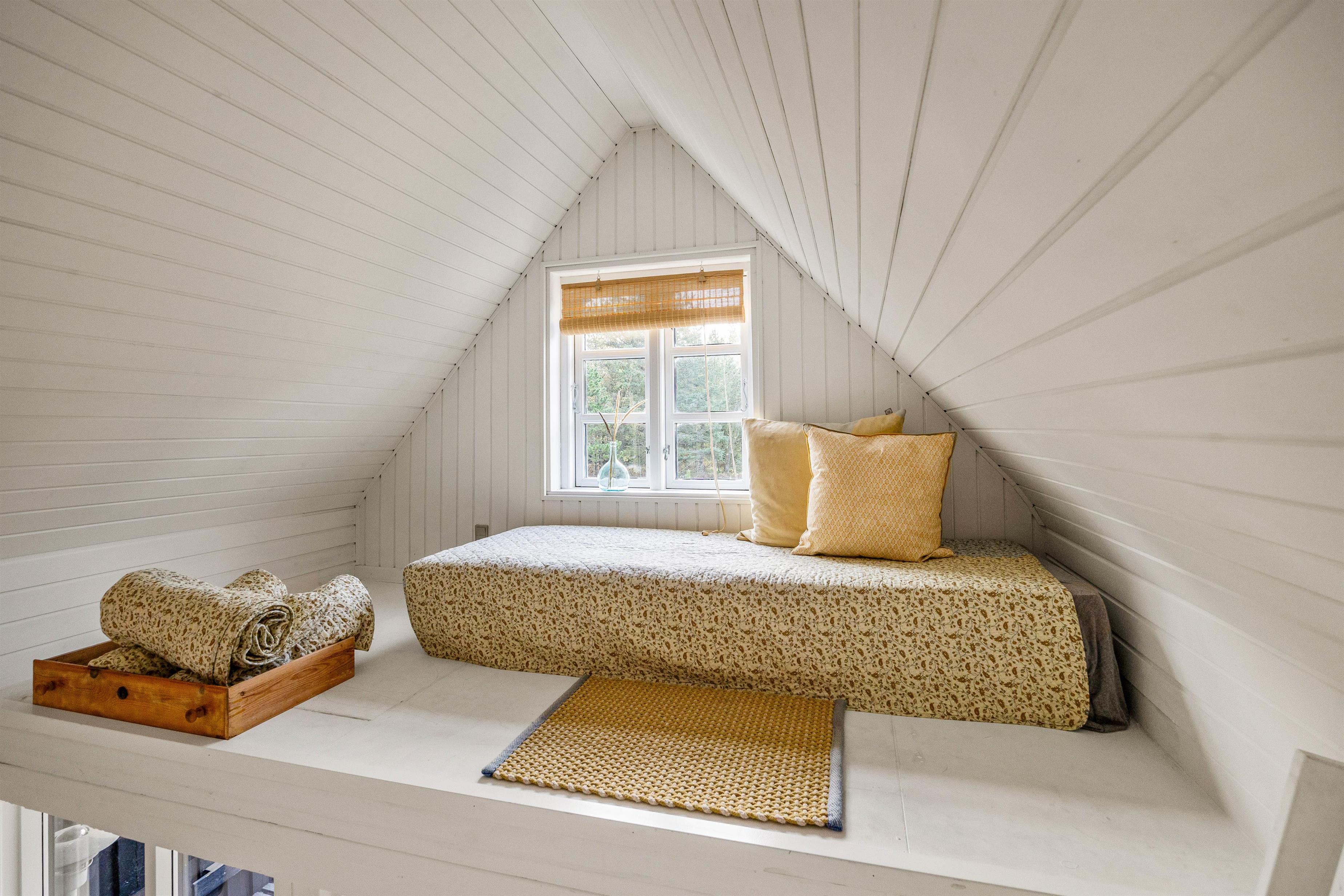 Over stuen findes en charmerende hems, der tilbyder en rolig oase til læsning og afslapning. Sommerhuset råder over to soveværelser; et med en dobbeltseng og et med to enkeltsenge.