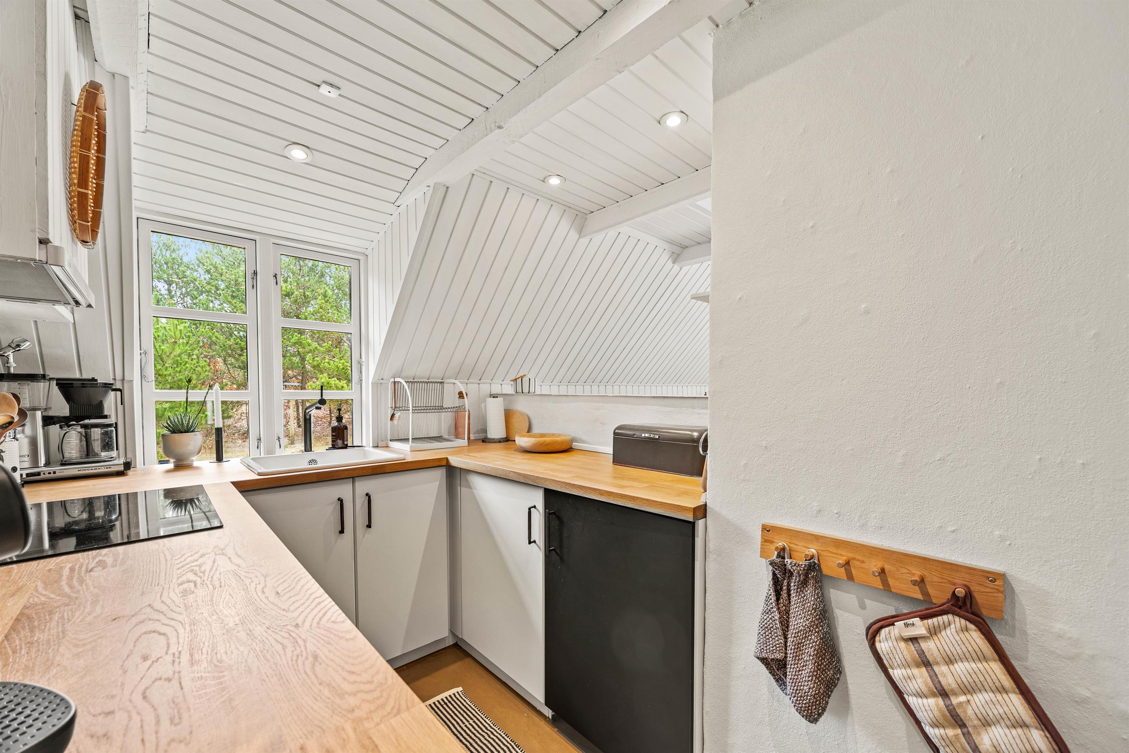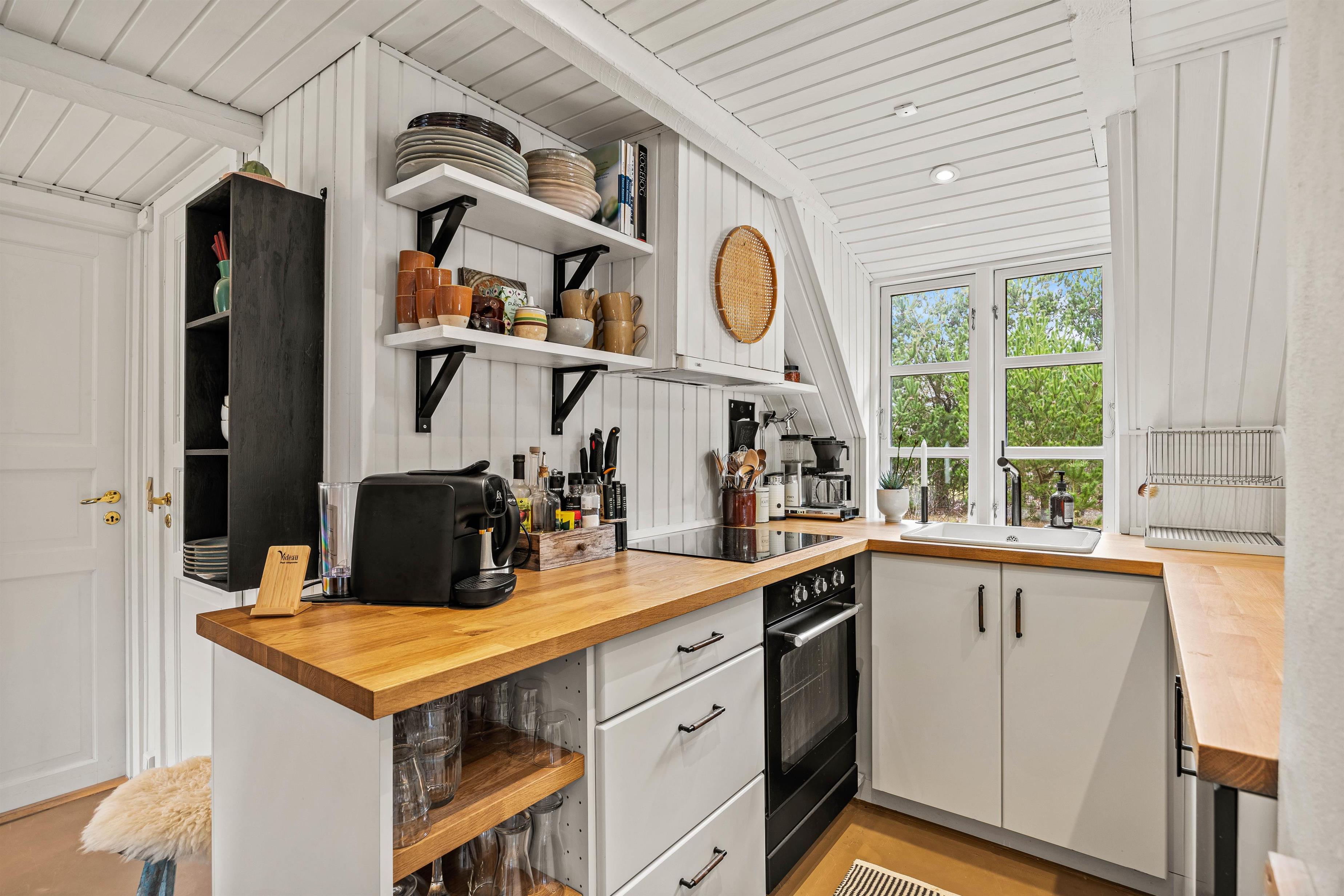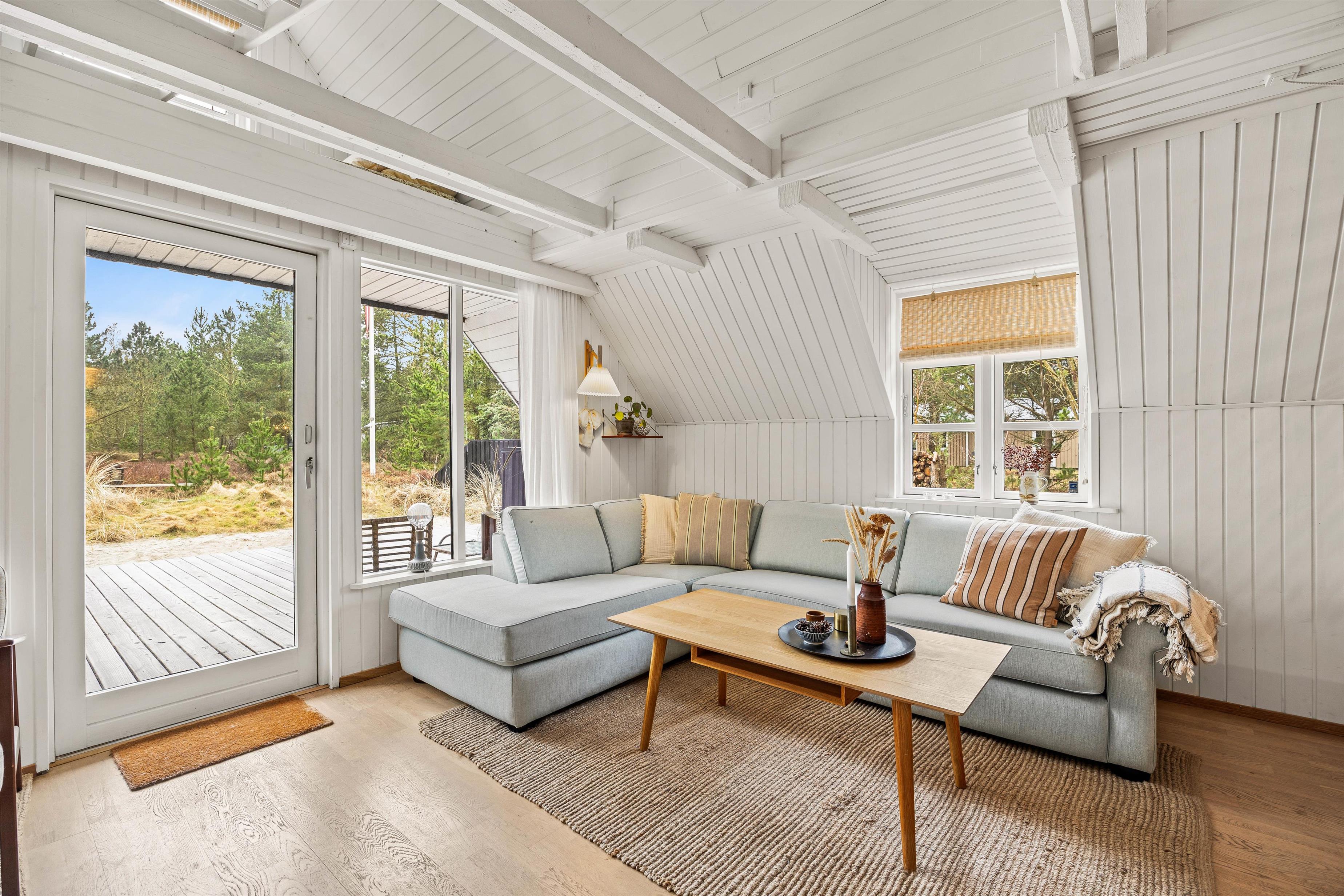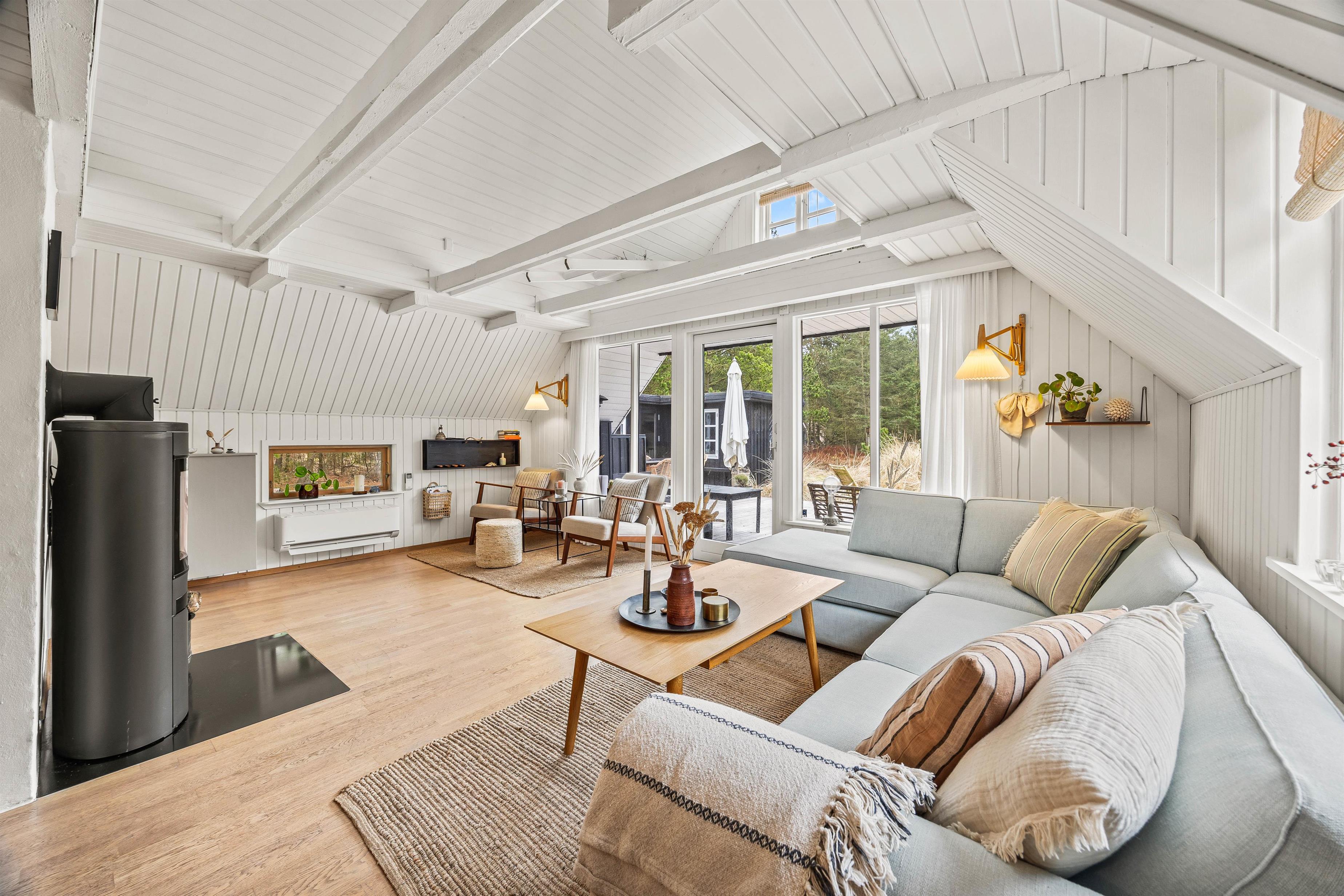 Sommerhuset er indrettet med lyse farver og sans for detaljer. Det åbne køkken giver udsigt til spisestuen og stuen, hvilket gør det muligt at holde samtalen i gang fra tilberedningen af mad til hyggelige brætspil rundt om spisebordet. Stuen er udstyret med en varm og indbydende brændeovn samt Chromecast, der sikrer underholdende aftener for alle.