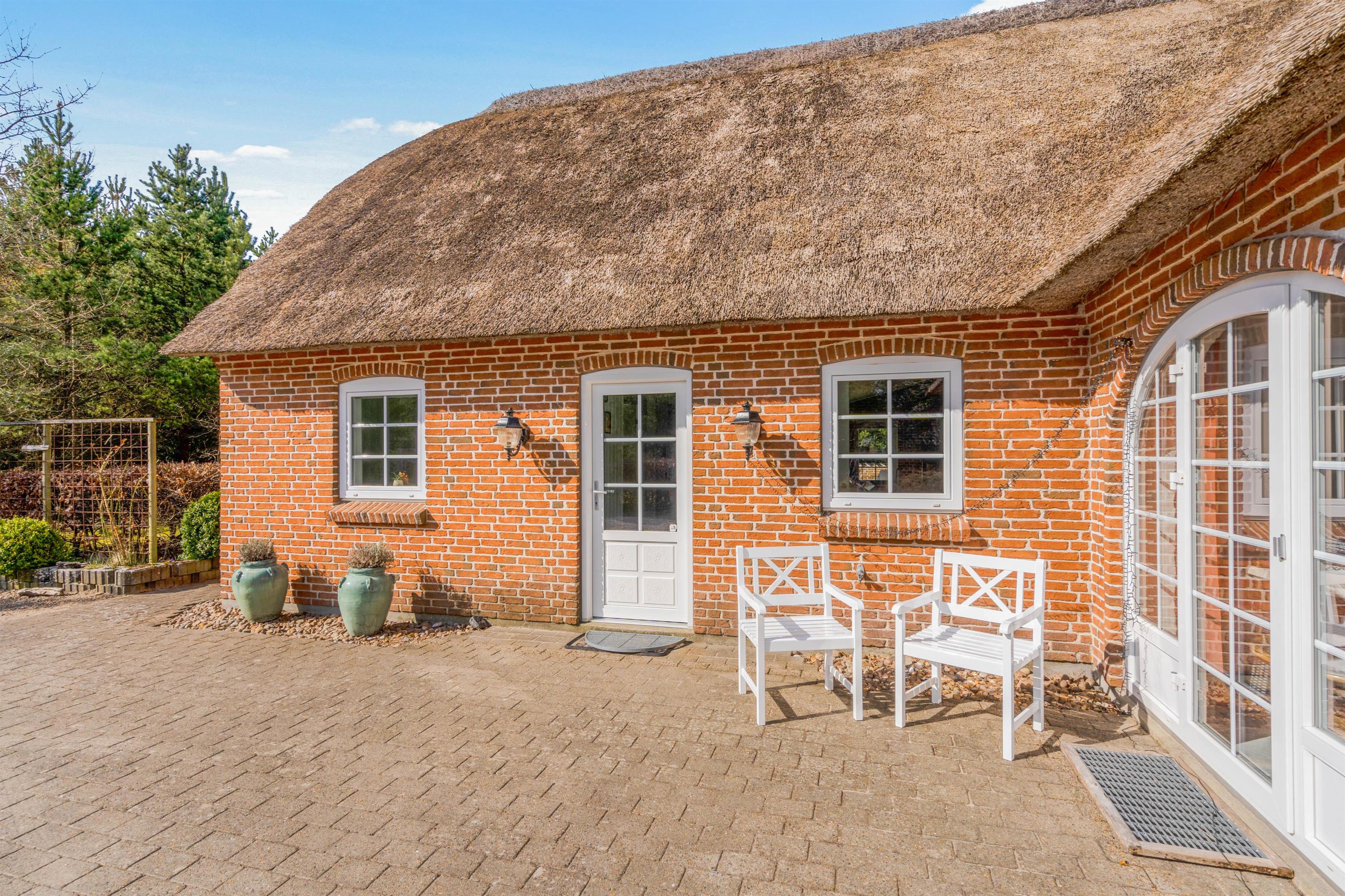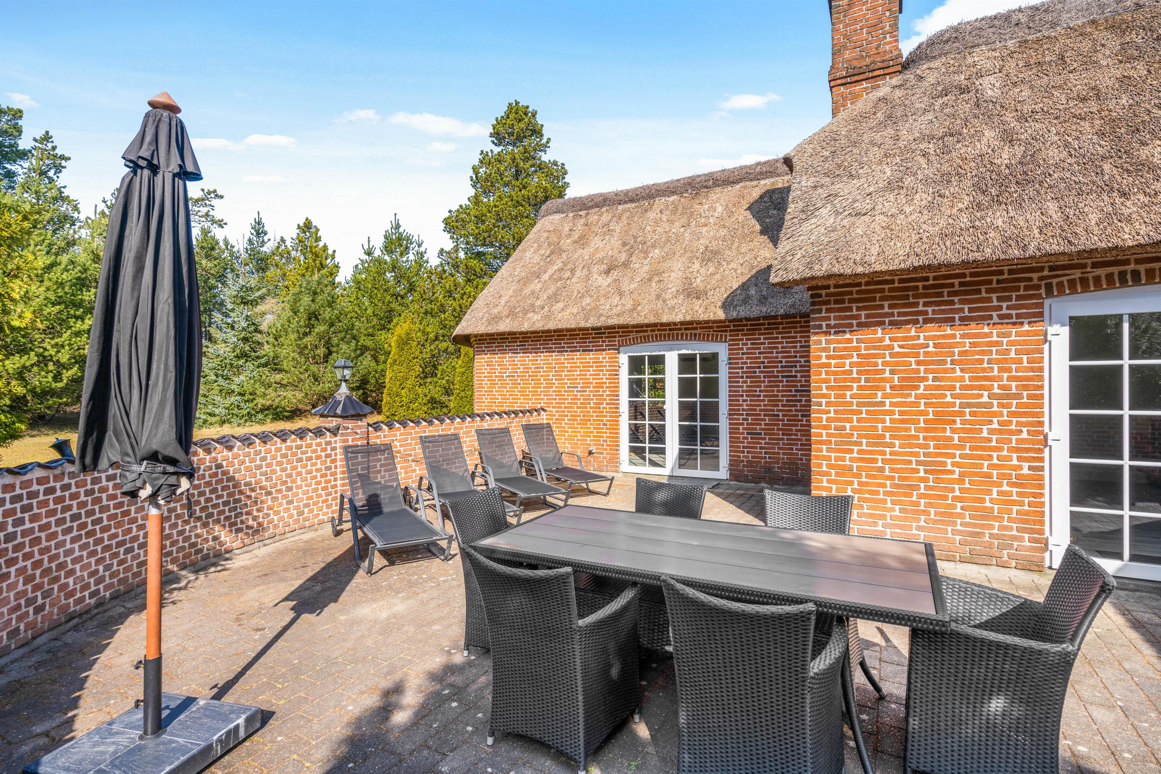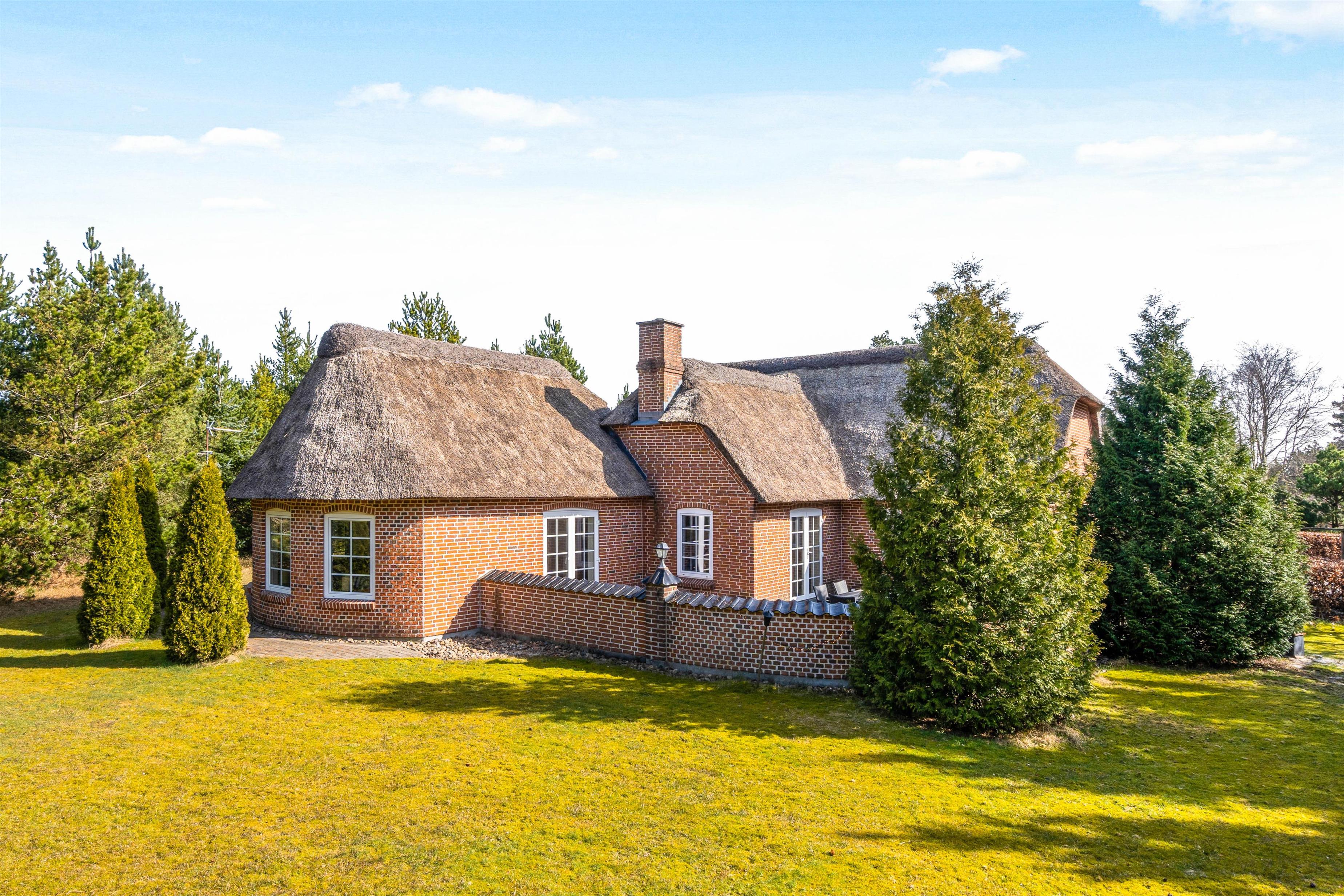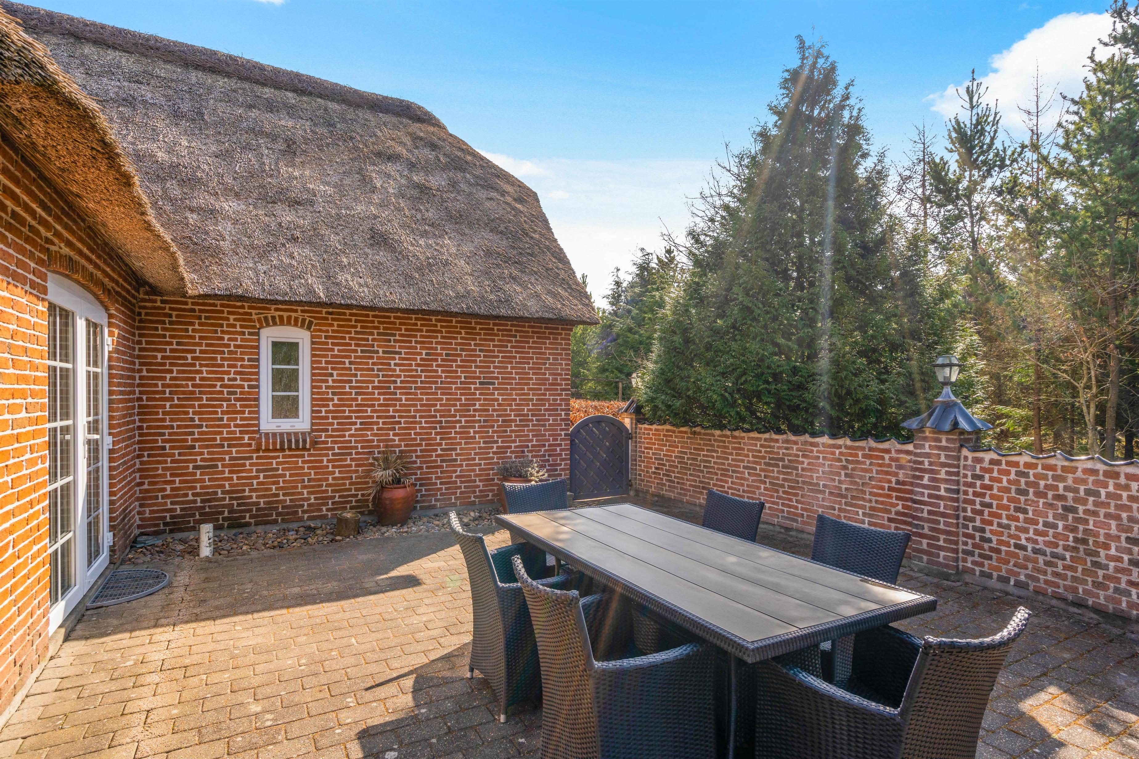 Det flotte stråtagshus er ikke kun dejlig rummeligt indvendig, men udvendig finder I også en stor lækker terrasse, hvor det gode vejr kan udnyttes fuldt ud. Børnene og hundene har masser af plads til at slå sig løs på den store græsplæne, mens I ser til fra liggestolene.