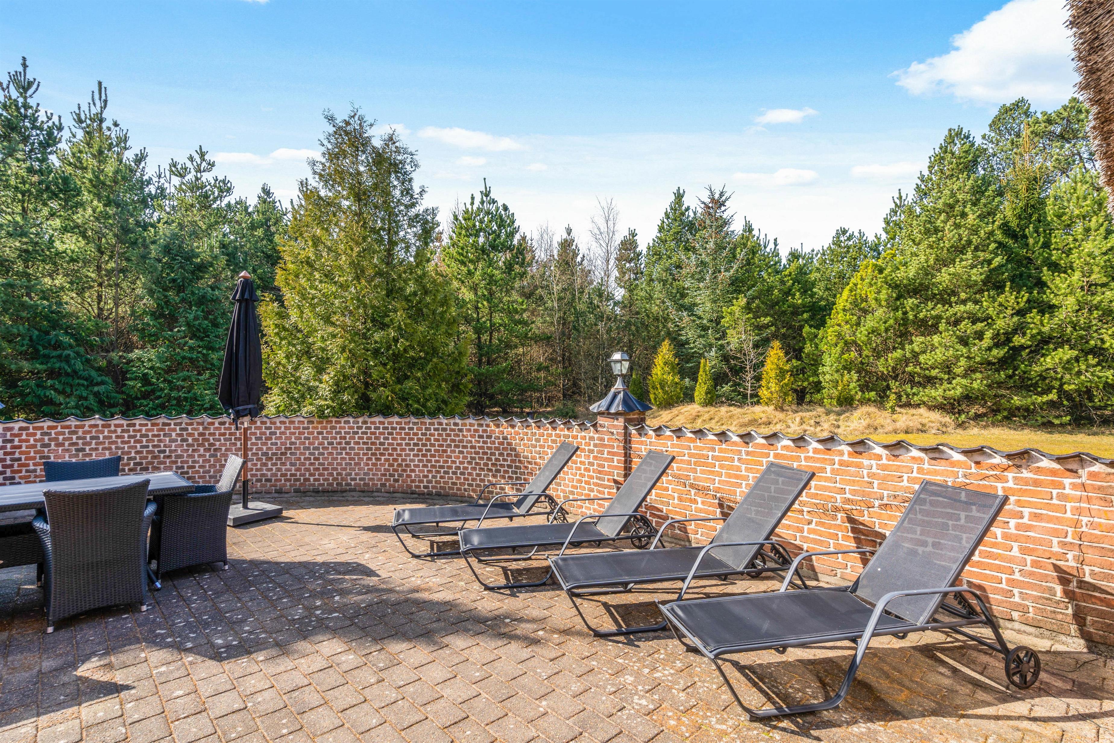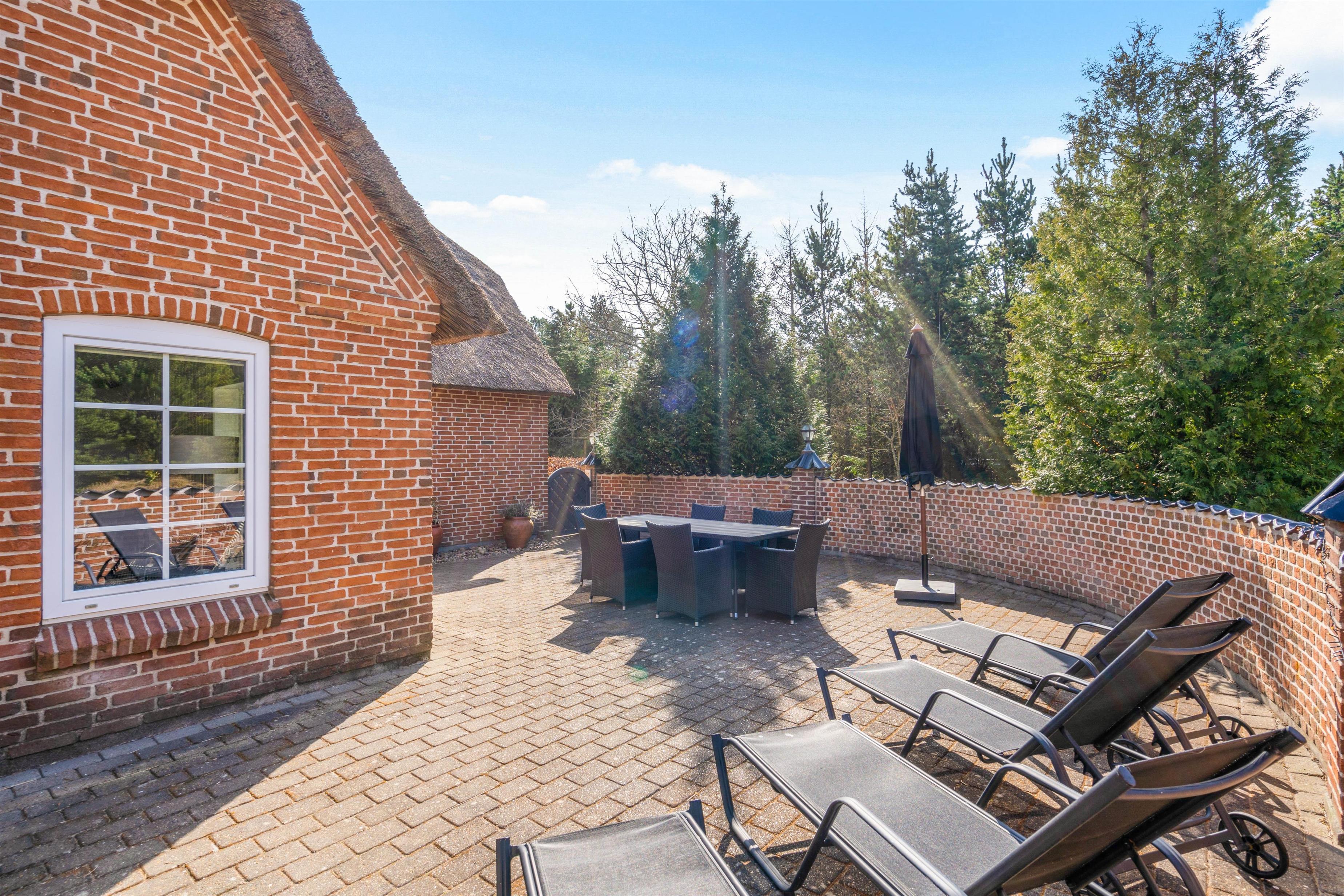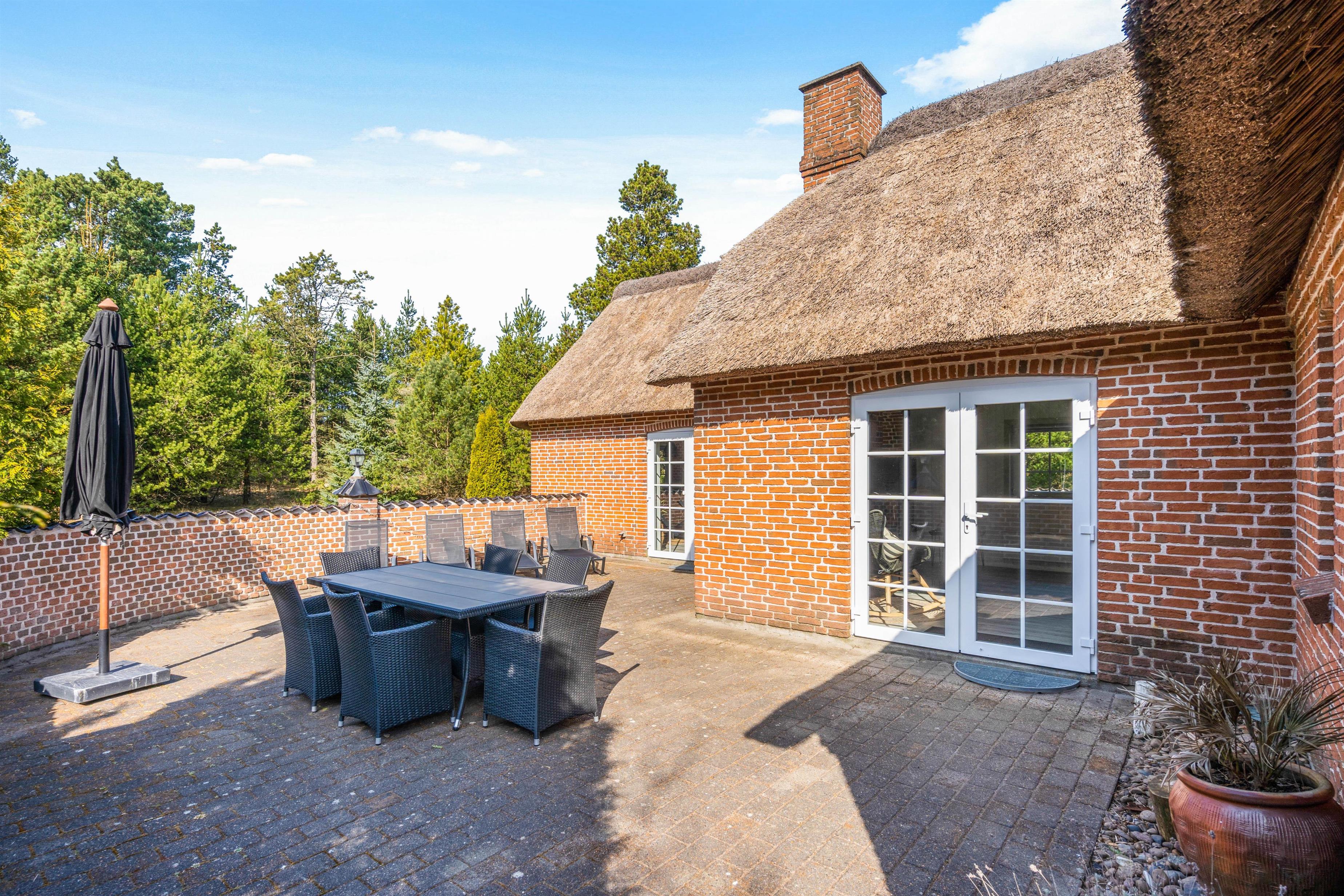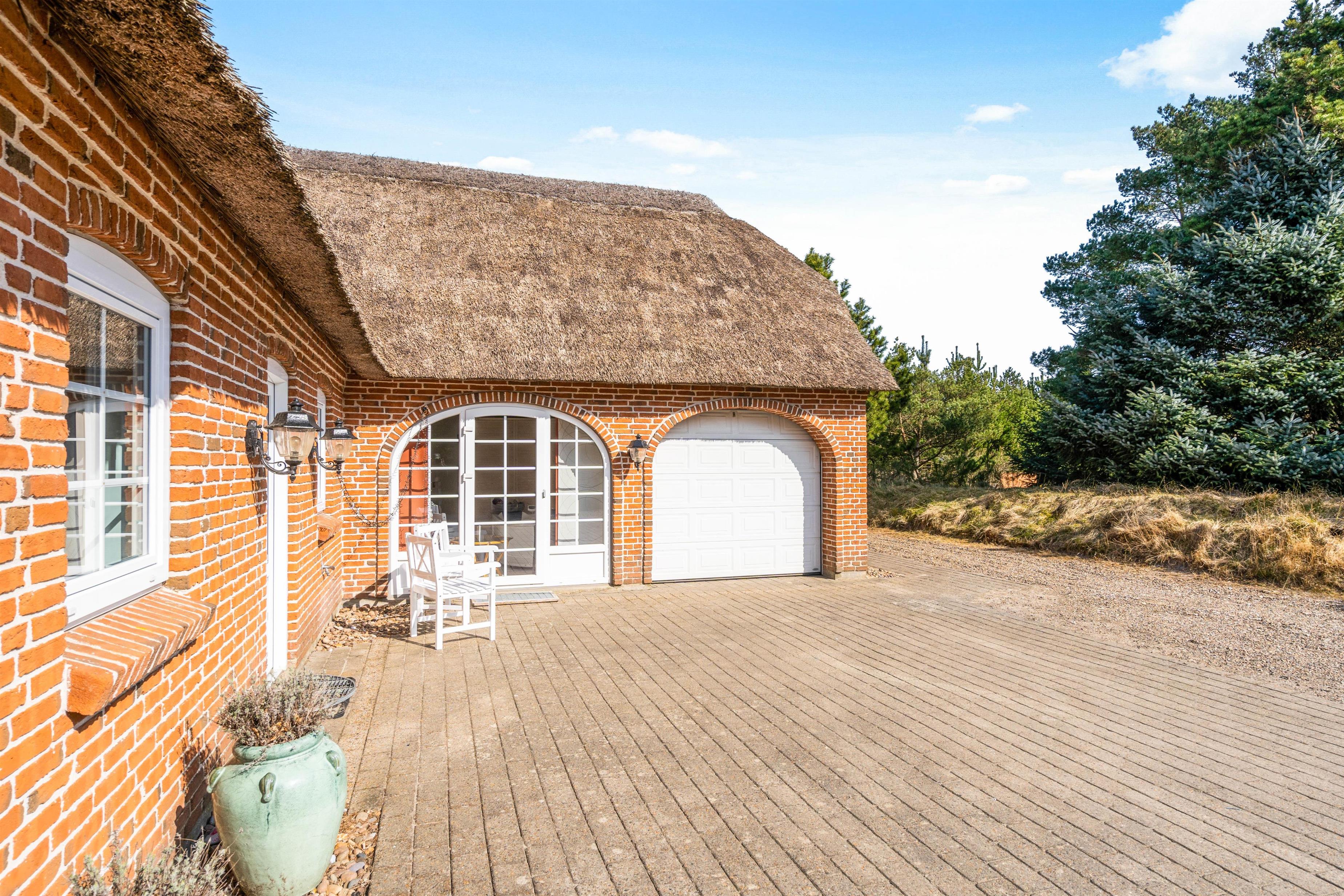 Det flotte stråtagshus er ikke kun dejlig rummeligt indvendig, men udvendig finder I også en stor lækker terrasse, hvor det gode vejr kan udnyttes fuldt ud. Børnene og hundene har masser af plads til at slå sig løs på den store græsplæne, mens I ser til fra liggestolene.