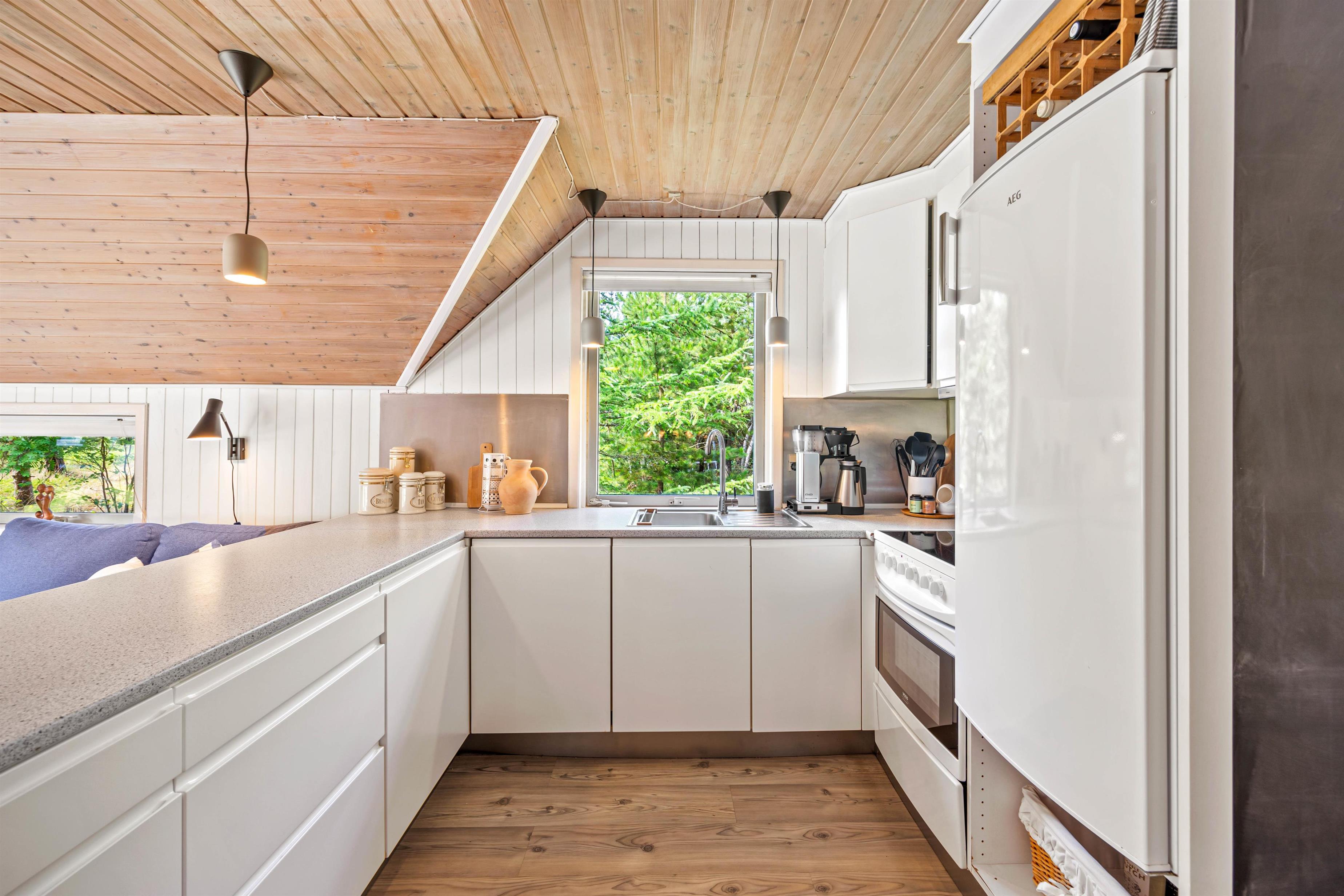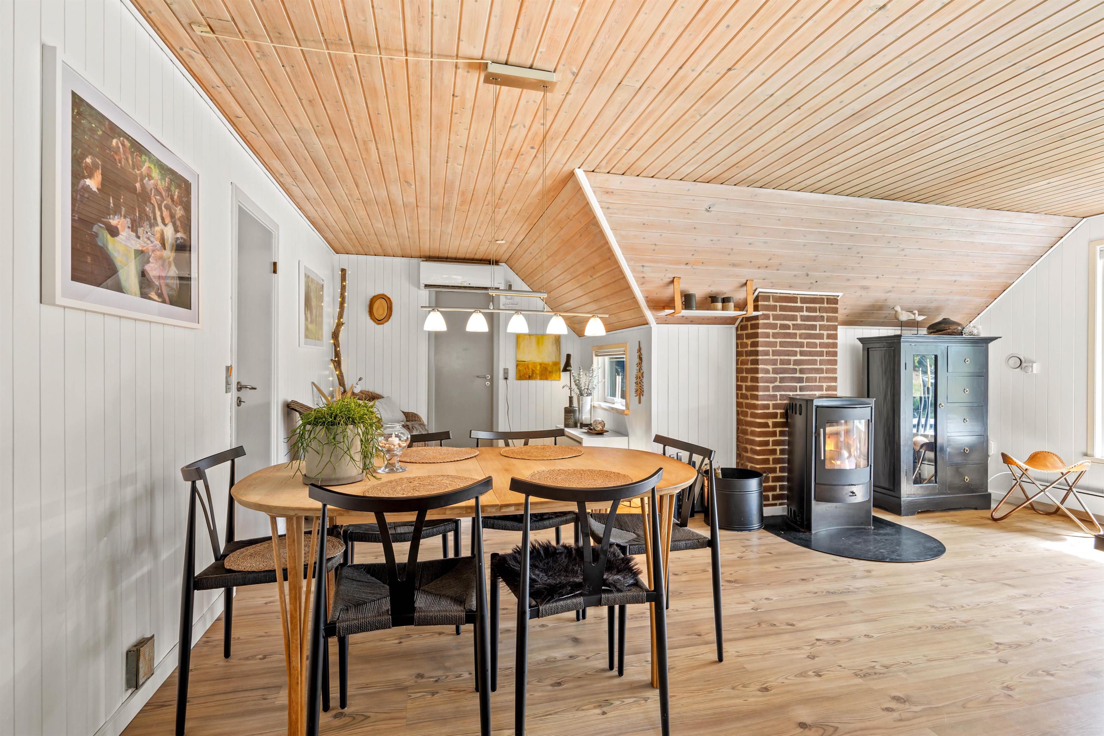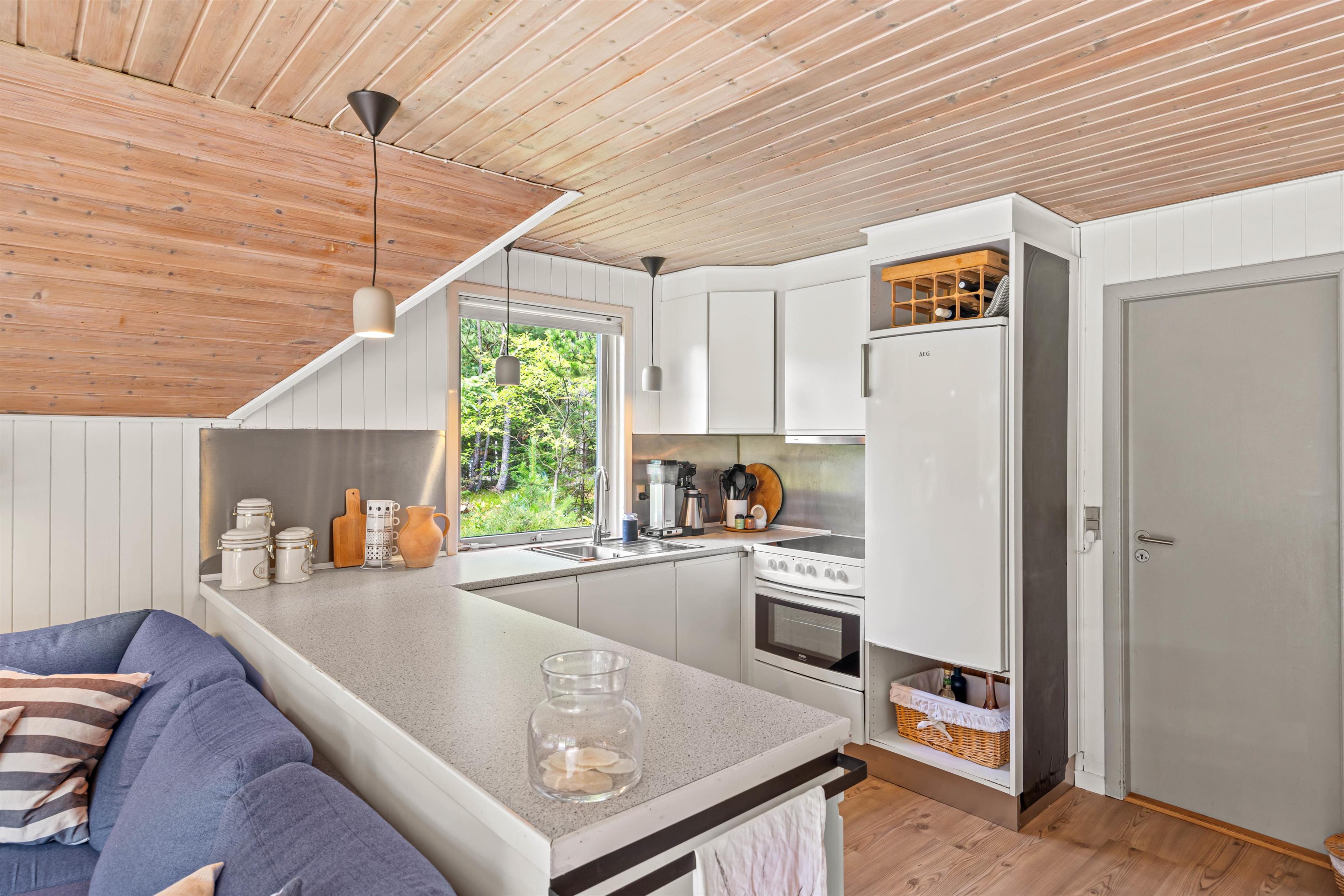 Dette sommerhus på Peder Larsensvej 7 er indrettet med fokus på både funktionalitet og hygge. Hjertet af huset er den rummelige stue, hvor en indbydende brændeovn skaber en varm og hyggelig atmosfære, perfekt til afslappende aftener. Skal der kokkeres er der masser plads i køkkenet, som også er veludstyret med en opvaskemaskine, der gør oprydningen efter måltiderne problemfri.