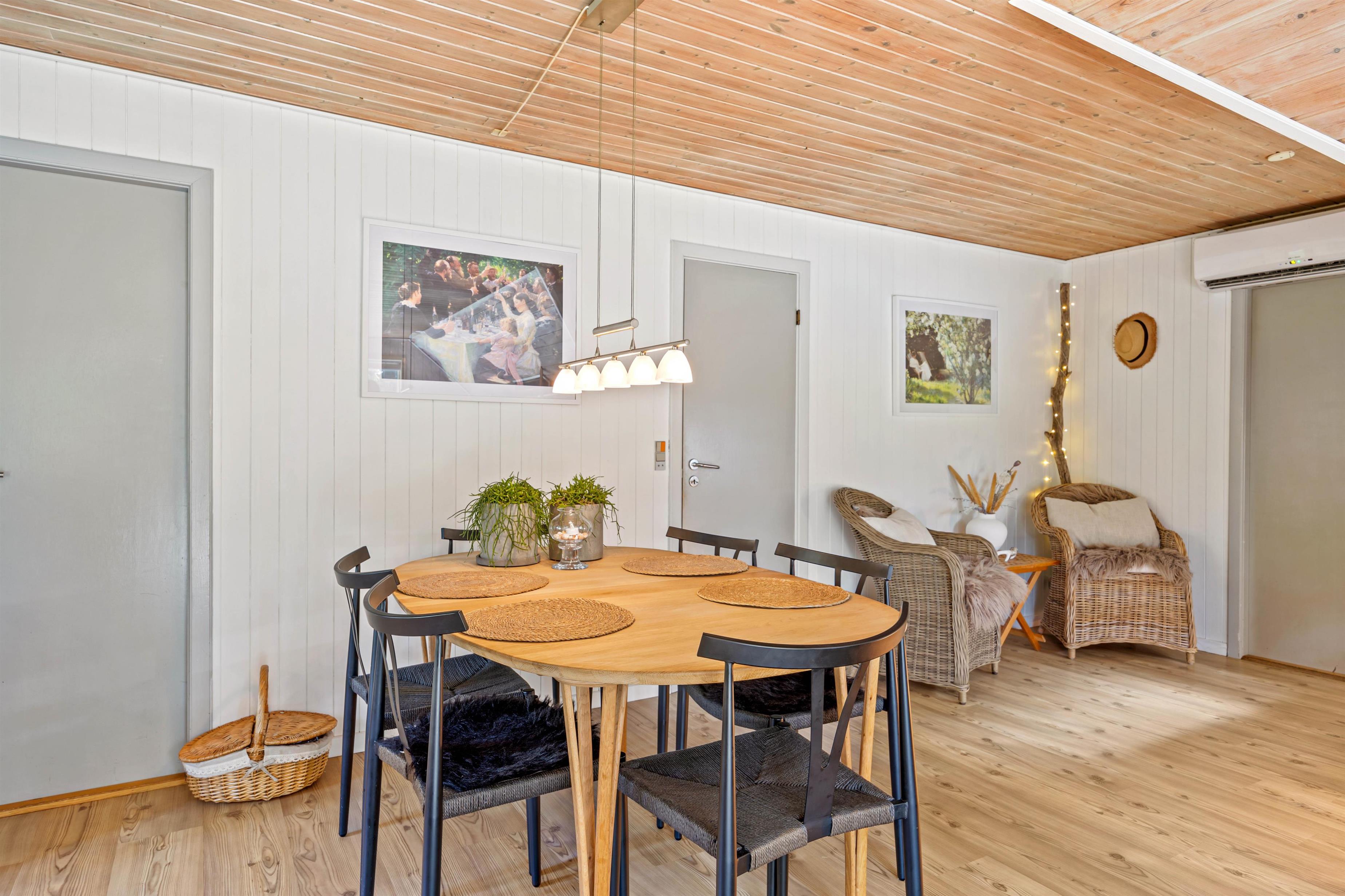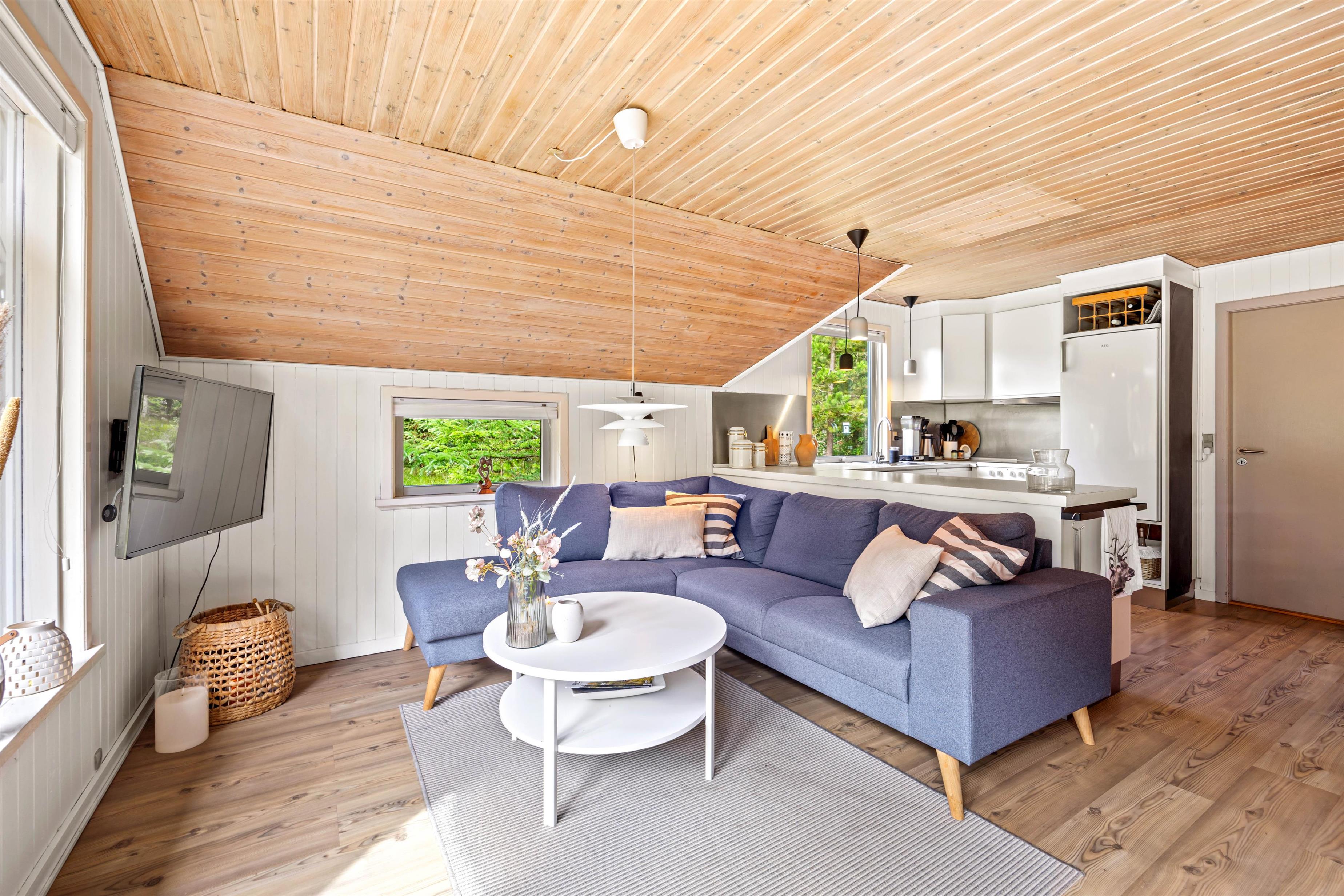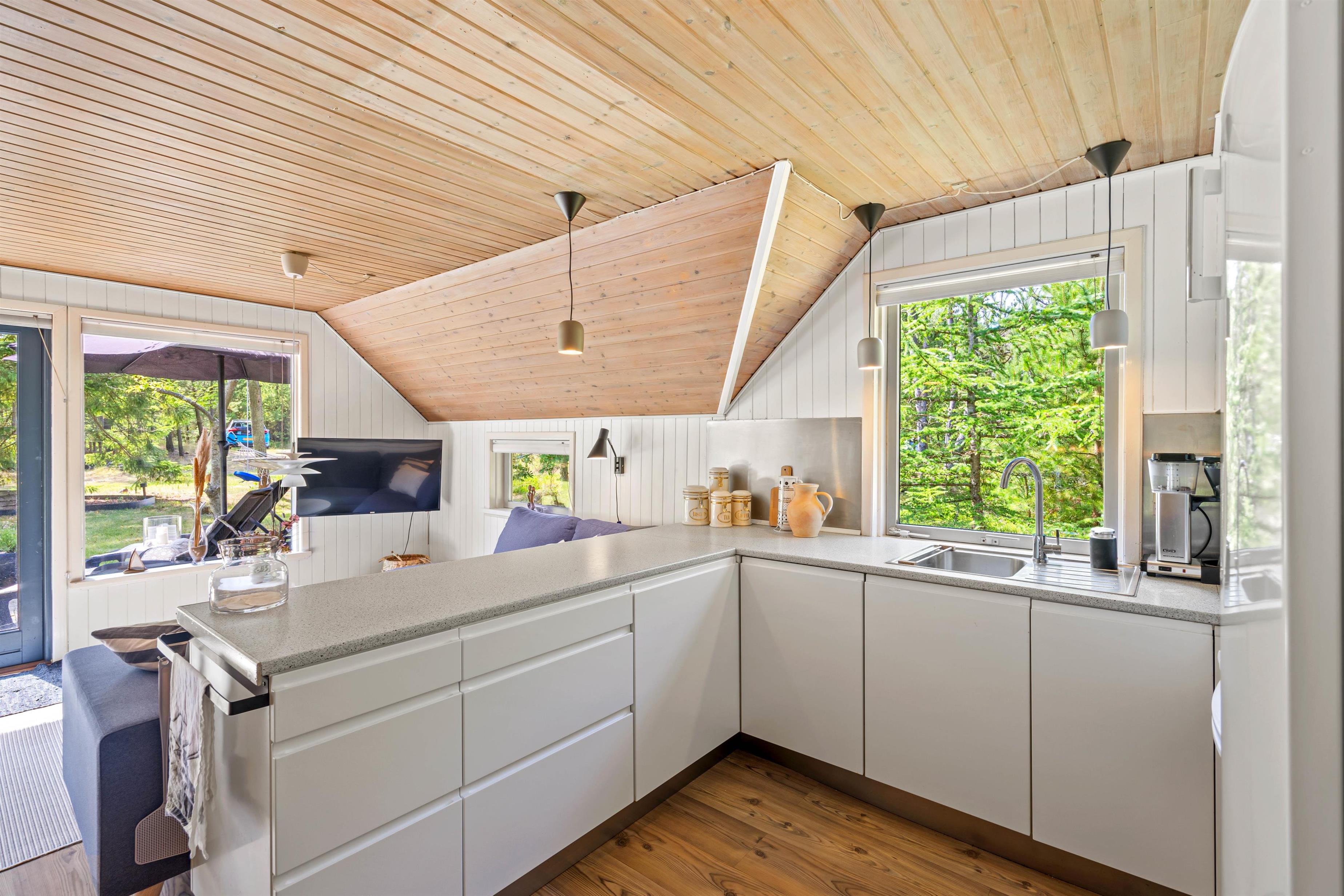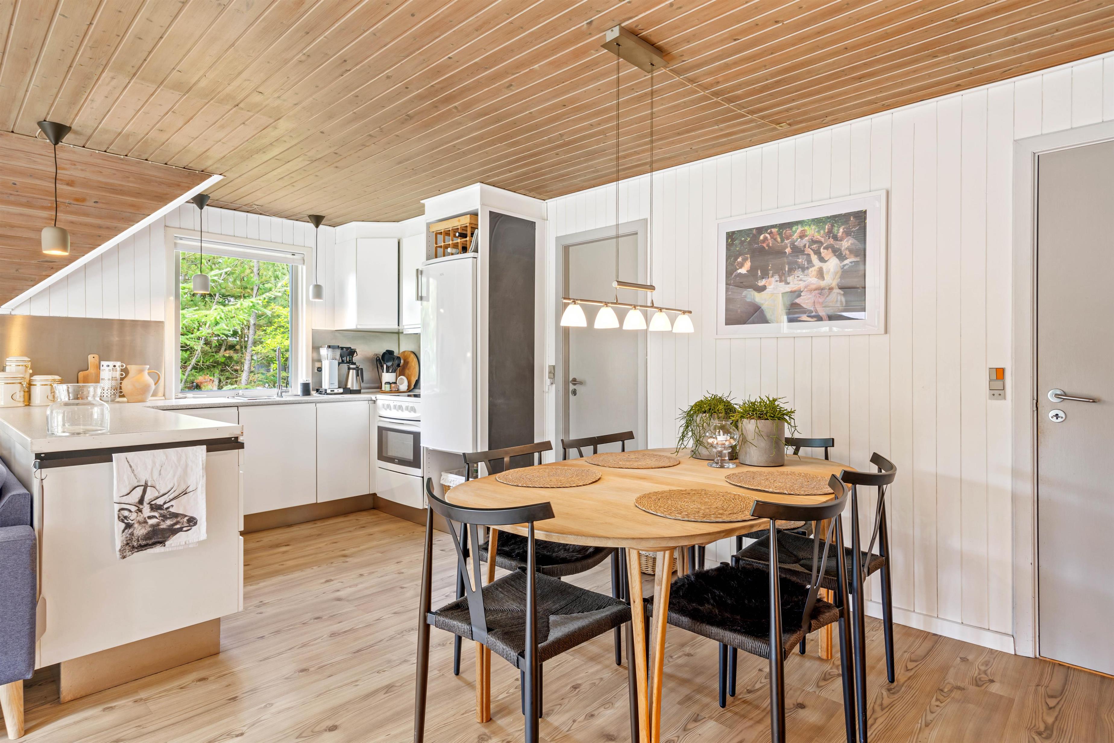 Dette sommerhus på Peder Larsensvej 7 er indrettet med fokus på både funktionalitet og hygge. Hjertet af huset er den rummelige stue, hvor en indbydende brændeovn skaber en varm og hyggelig atmosfære, perfekt til afslappende aftener. Skal der kokkeres er der masser plads i køkkenet, som også er veludstyret med en opvaskemaskine, der gør oprydningen efter måltiderne problemfri.