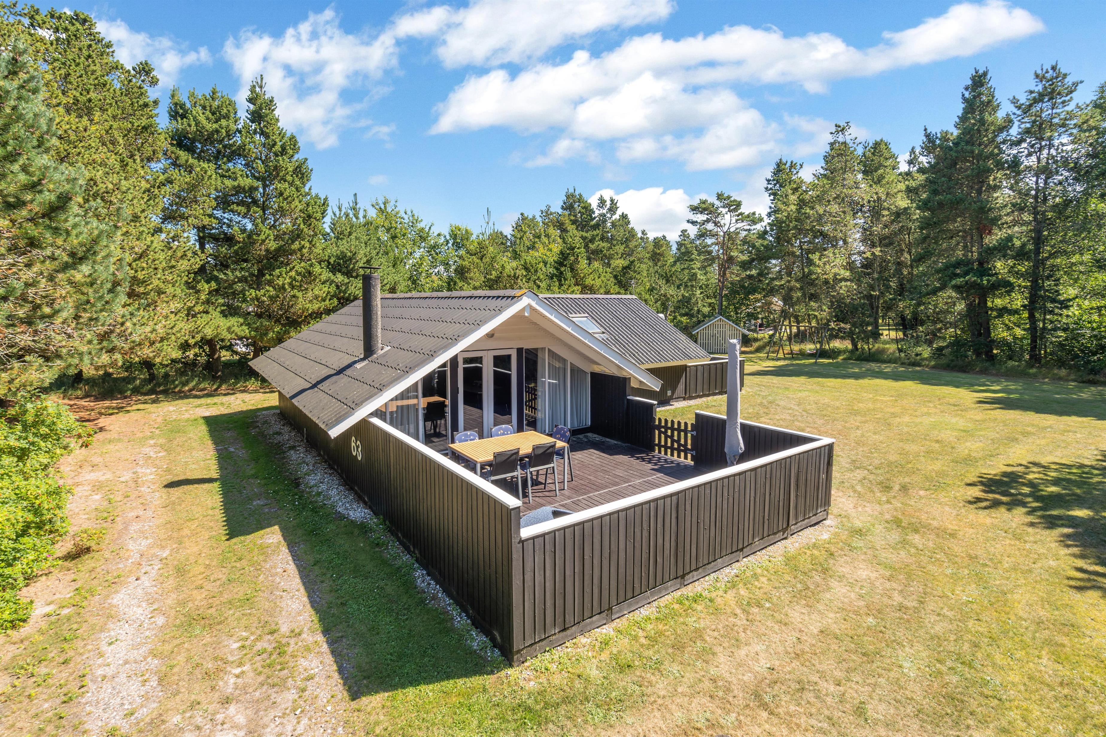For enden af en lukket vej ligger Hans Hansensvej 63. Sommerhuset, som har plads til 5 personer og 2 hunde, er placeret på en dejlig naturgrund, som er omgivet af høje træer. Feriehuset har 2 store indhegnede terrasser, den ene mod øst og den anden mod syd, så der er altid et hjørne med sol og læ. Selv når vejret ikke er i top, kan I her opholde jer ude, da en del af den ene terrasse er overdækket. Den store grund egner sig udmærket til et spil kroket eller andre aktiviteter.