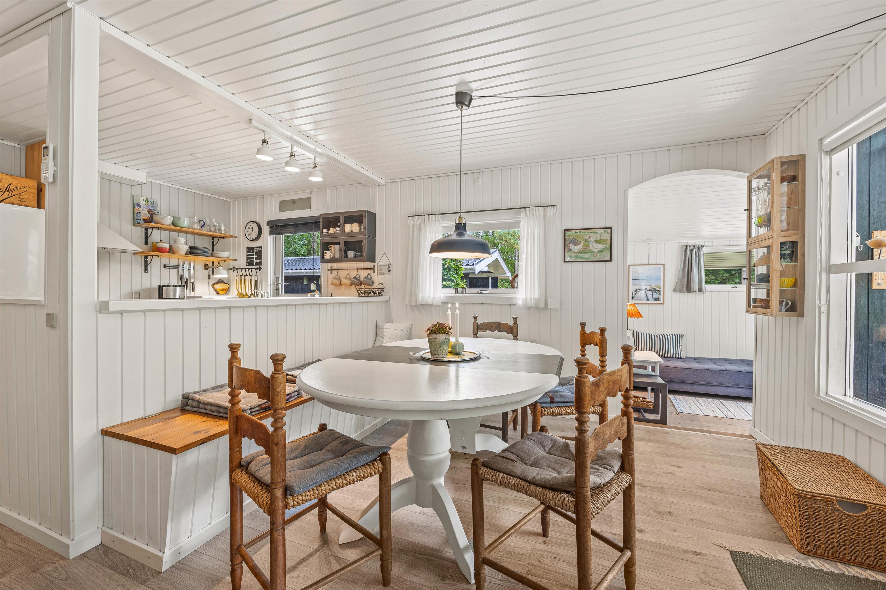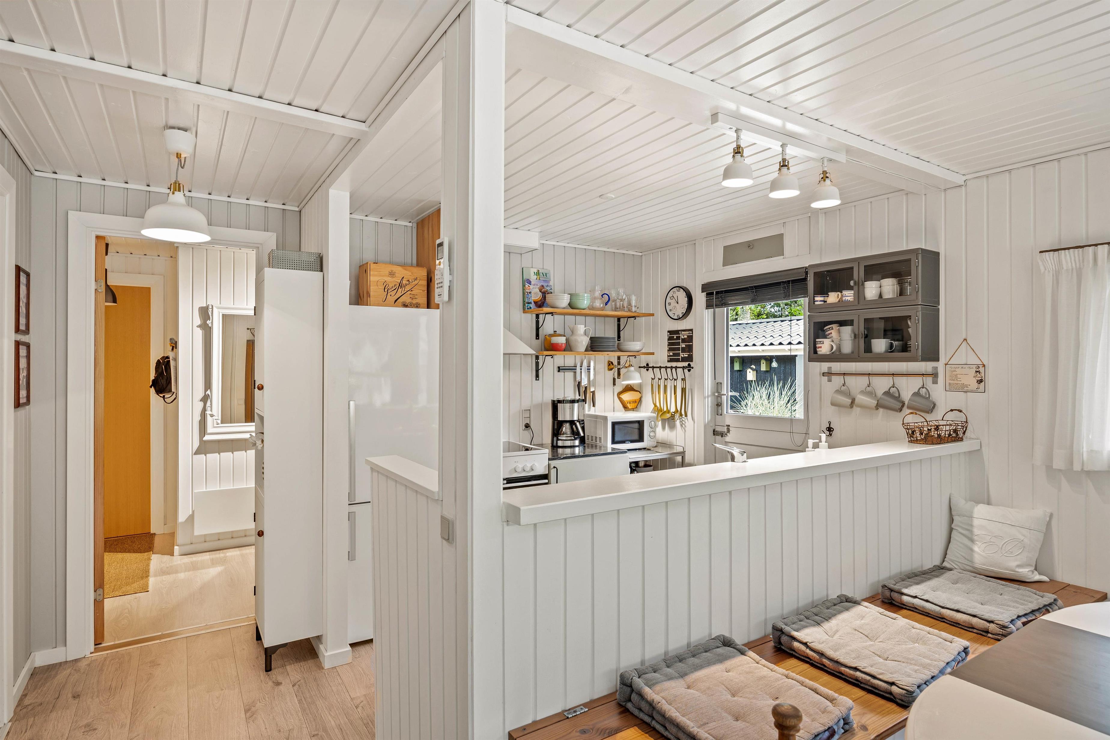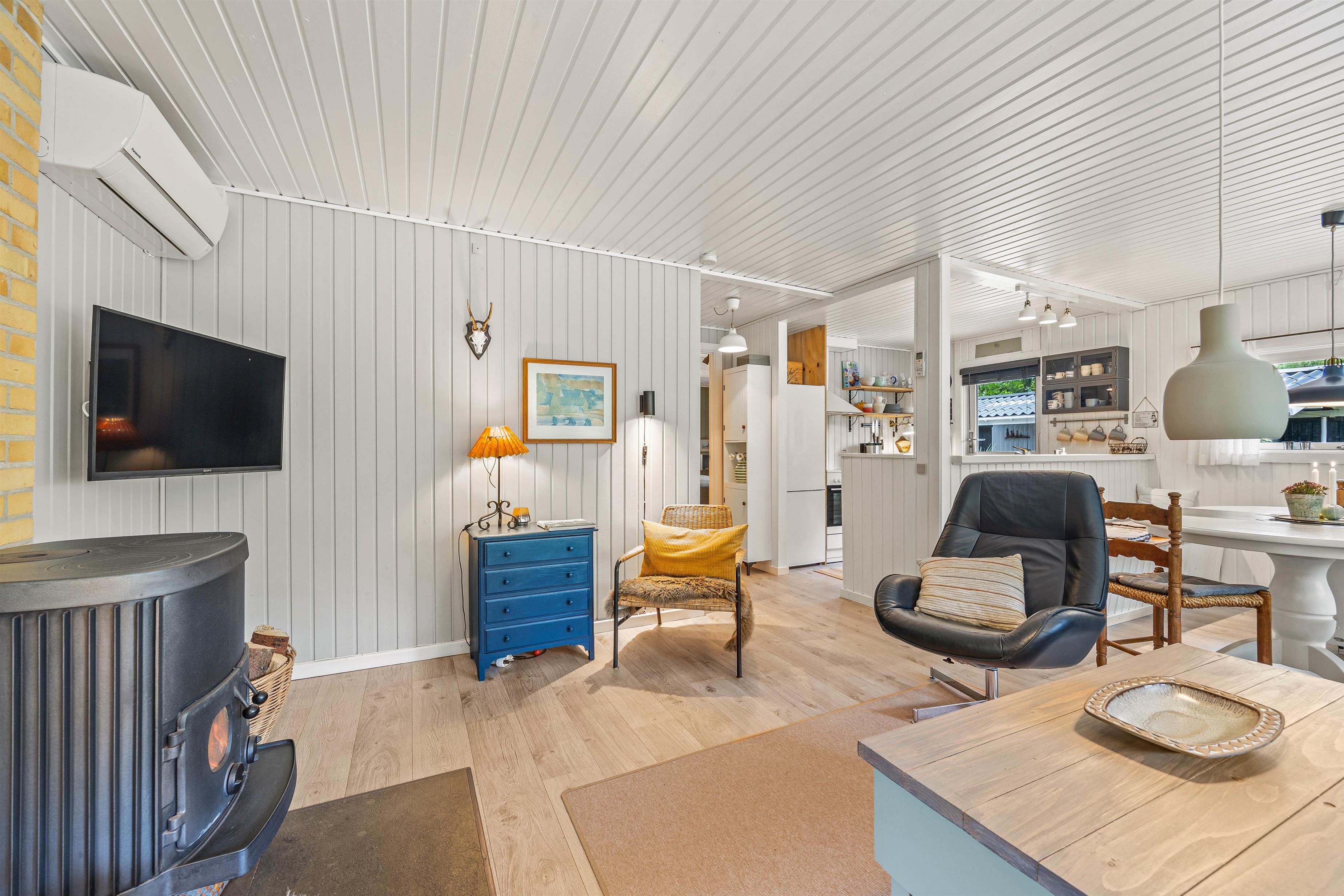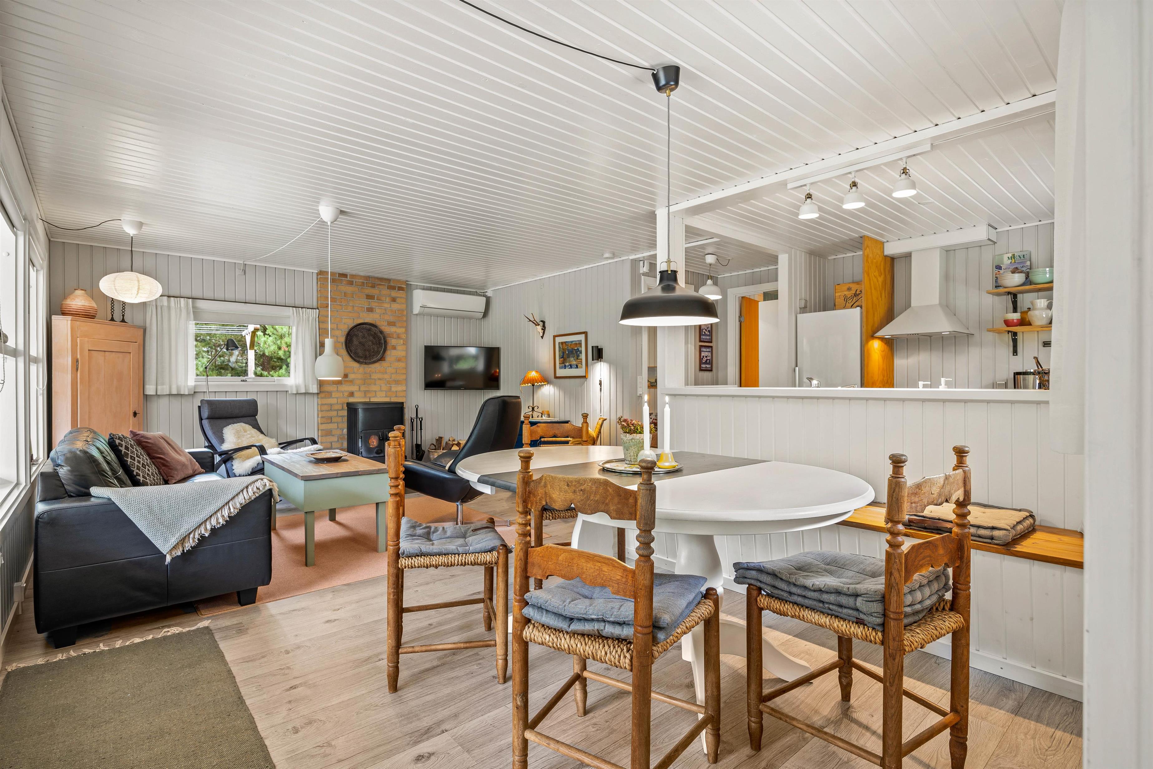 Den lyse, venlige stue med åbent køkken med induktionskomfur fungerer som husets hjerte. Feriehuset fik et flot, nyt badeværelse med gulvvarme i 2021 og man kan også finde en kombineret vaskemaskine og tørretumbler i sommerhuset, så tøjet kan blive vasket og tørret uden at I skal tænke på det. Køkkenet er udstyret med alle de redskaber, I har brug for, når der skal tilberedes en lækker feriemiddag. På kolde dage spreder den knitrende brændeovn en behagelig varme, og i den lille udestue kan I drikke en varm kop kaffe og nyde den omkringliggende natur hele året rundt.