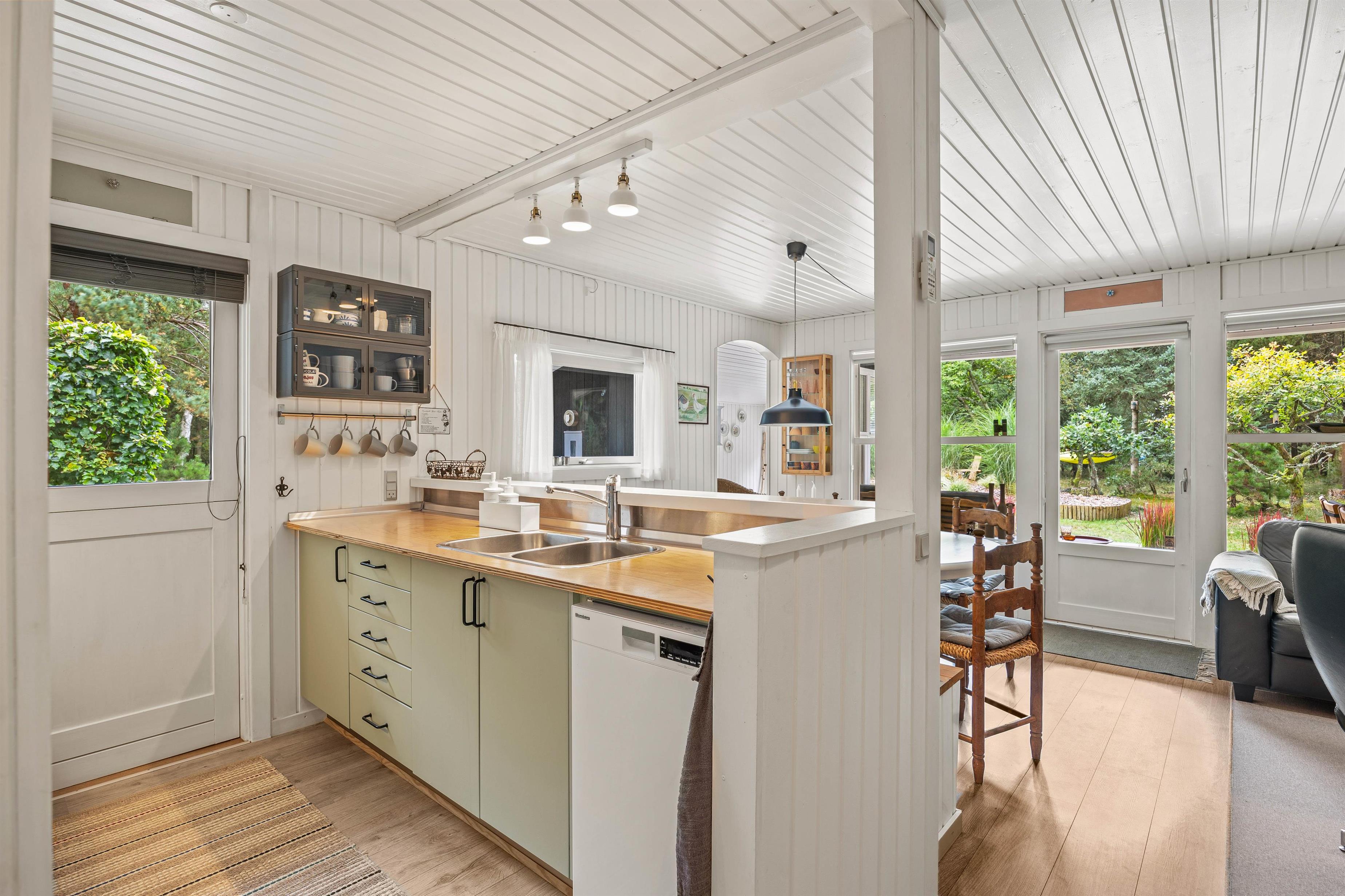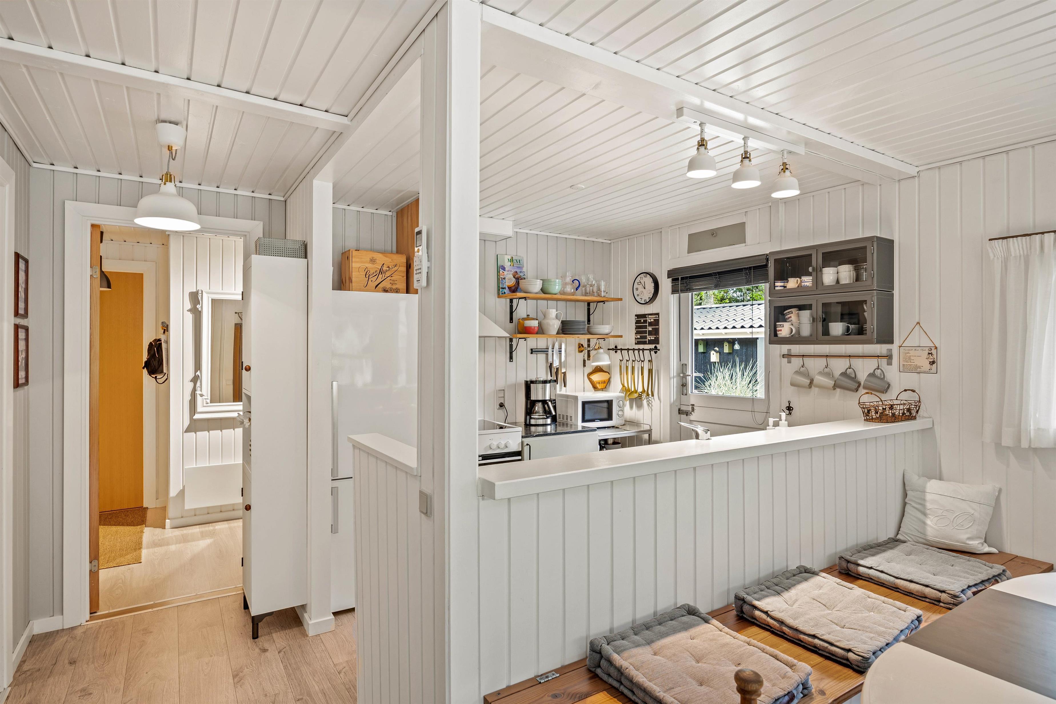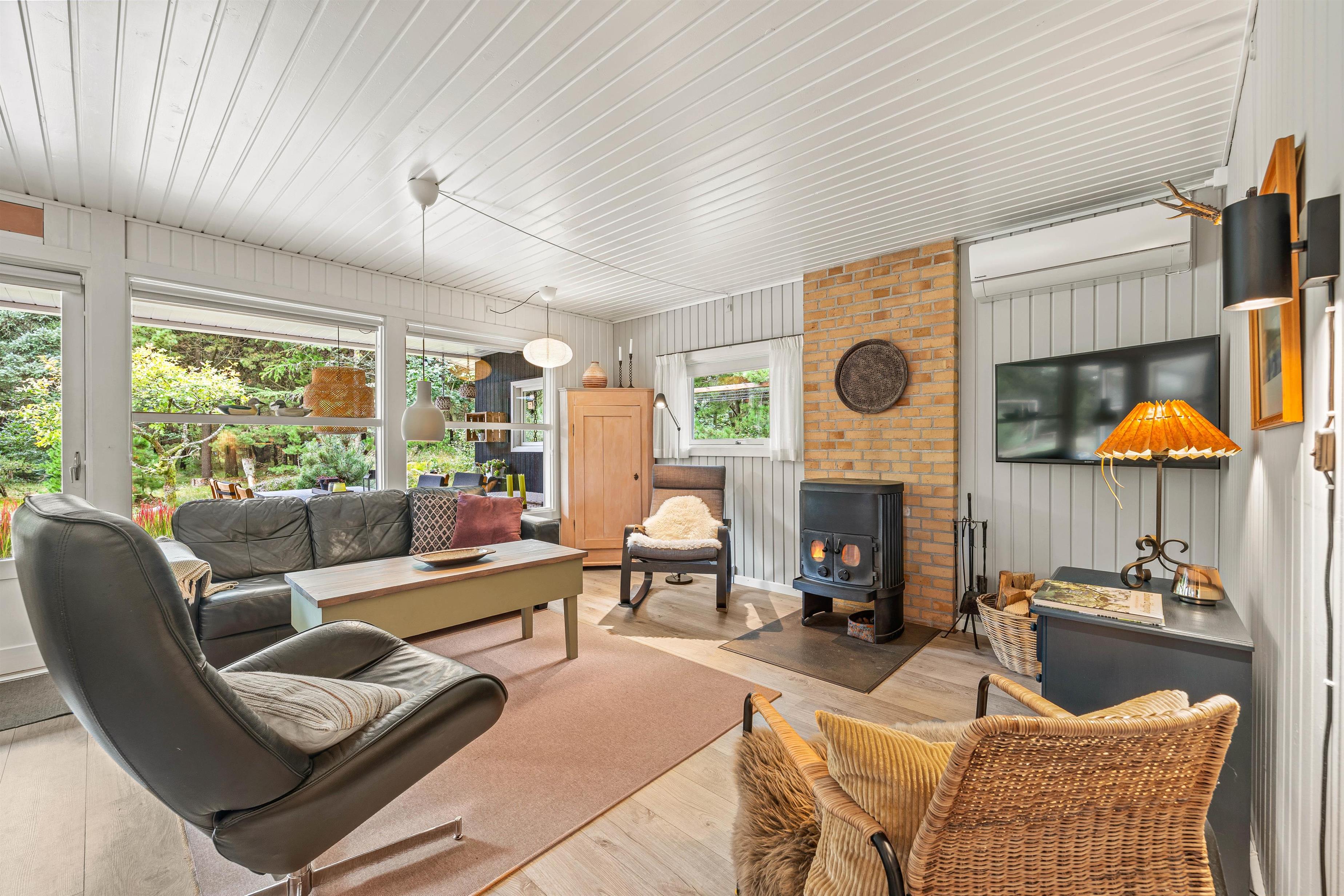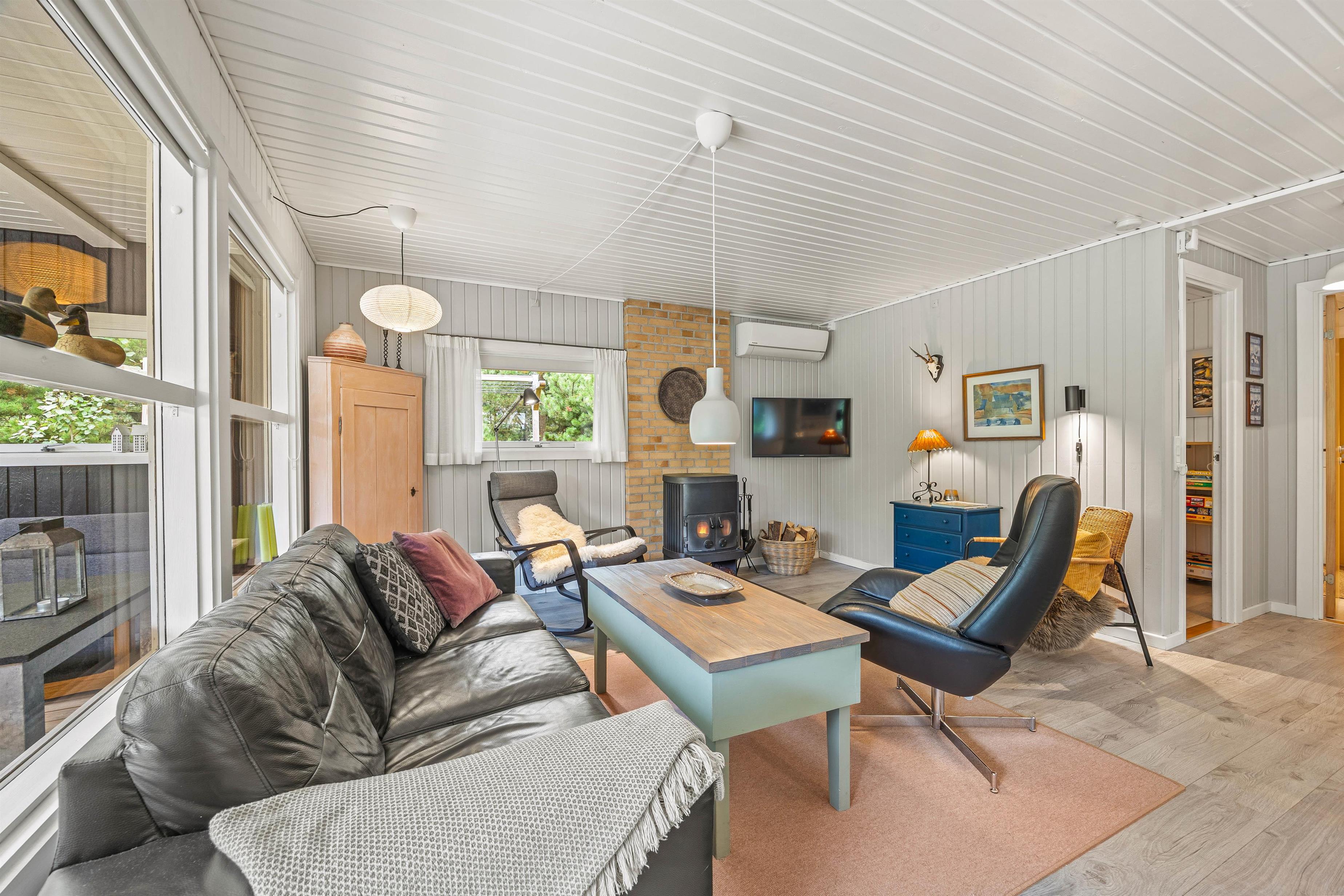 Den lyse, venlige stue med åbent køkken med induktionskomfur fungerer som husets hjerte. Feriehuset fik et flot, nyt badeværelse med gulvvarme i 2021 og man kan også finde en kombineret vaskemaskine og tørretumbler i sommerhuset, så tøjet kan blive vasket og tørret uden at I skal tænke på det. Køkkenet er udstyret med alle de redskaber, I har brug for, når der skal tilberedes en lækker feriemiddag. På kolde dage spreder den knitrende brændeovn en behagelig varme, og i den lille udestue kan I drikke en varm kop kaffe og nyde den omkringliggende natur hele året rundt.