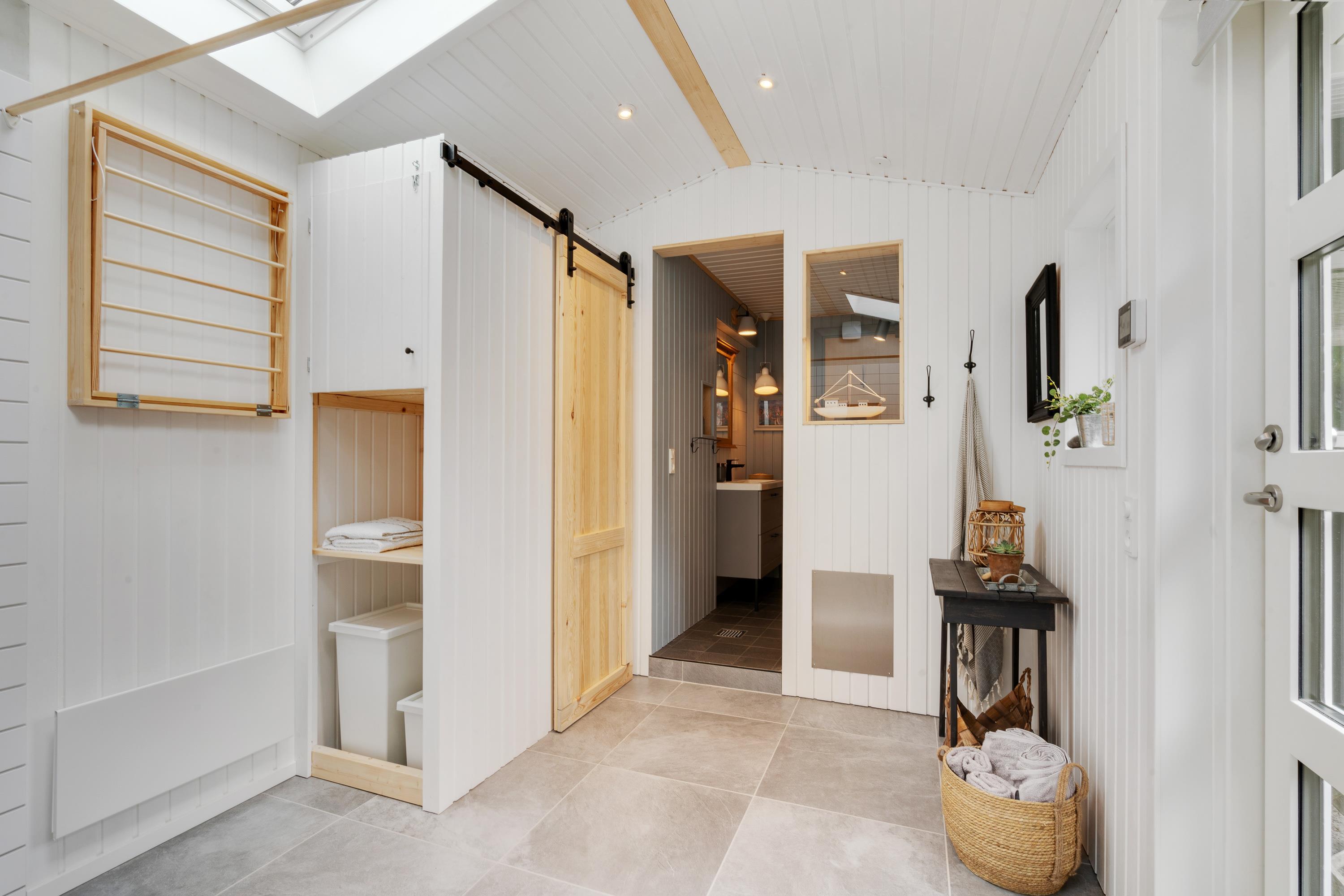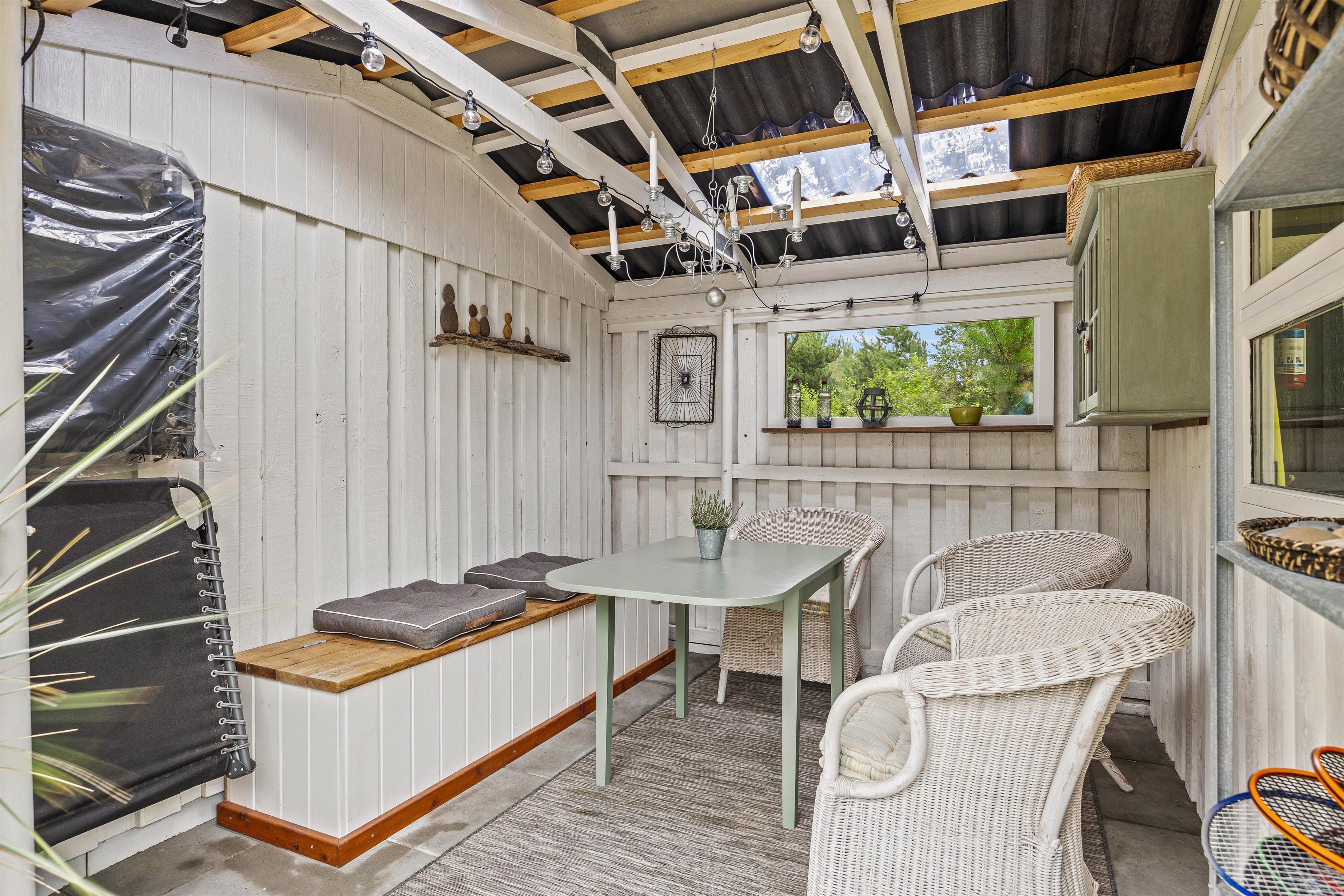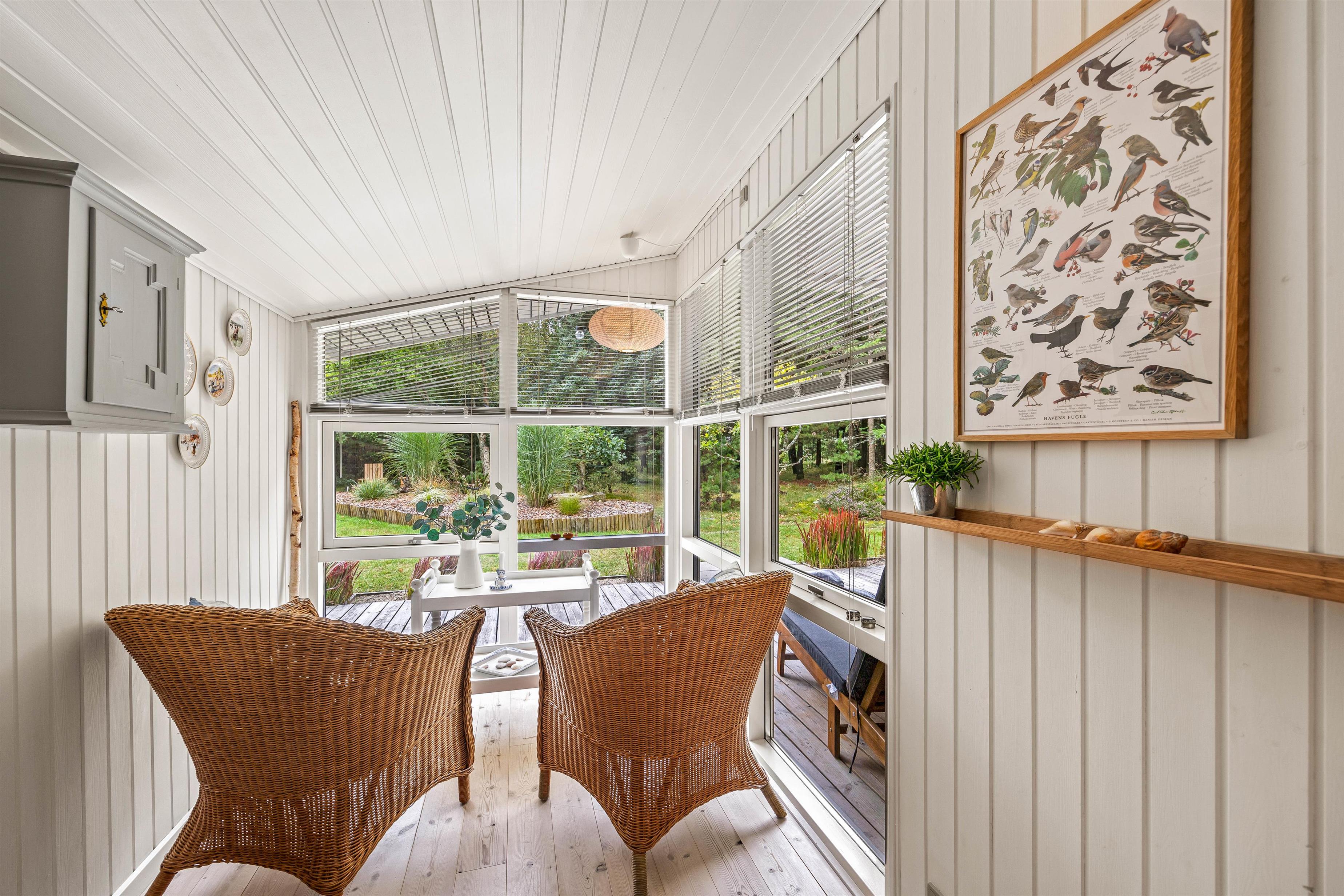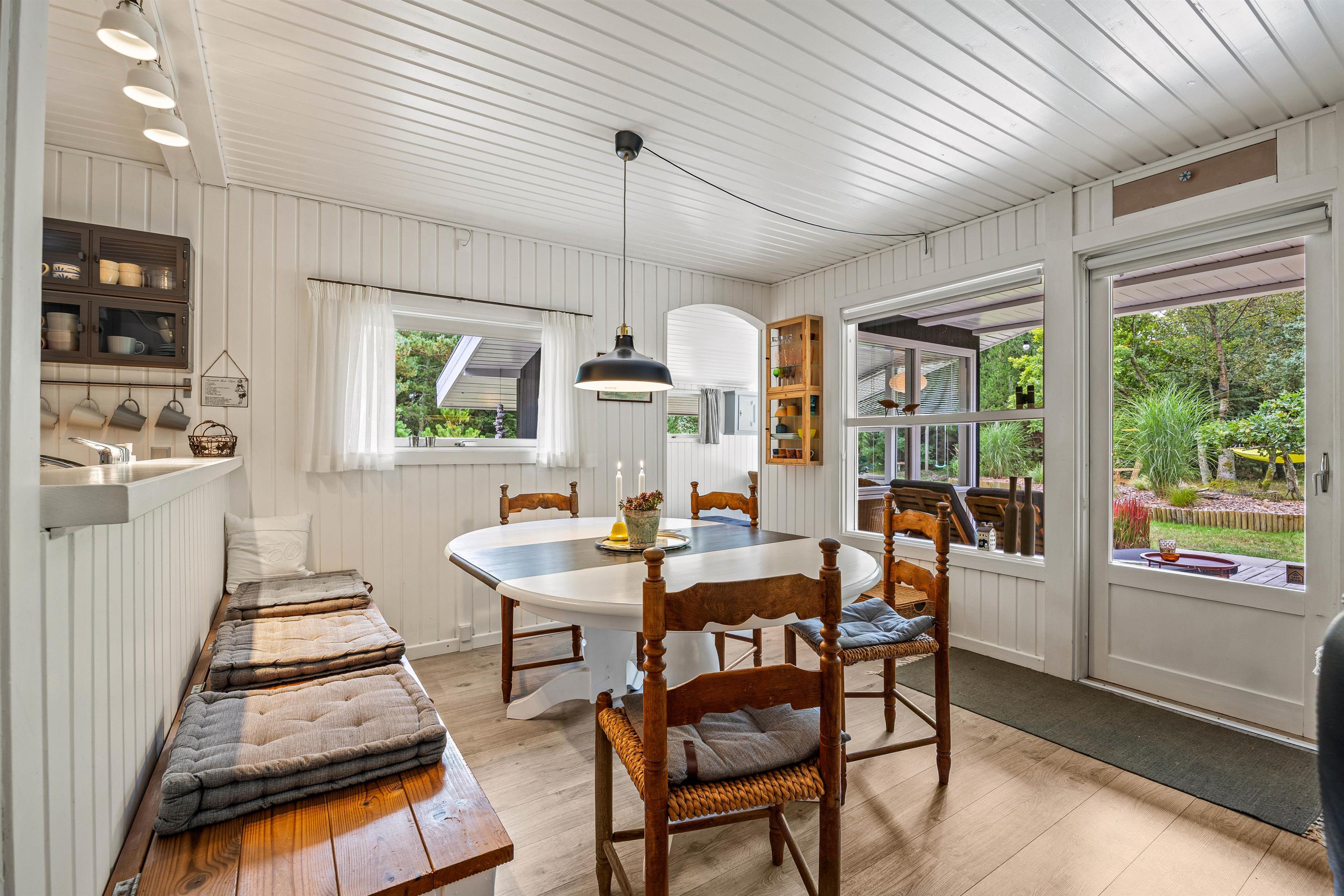 Den lyse, venlige stue med åbent køkken med induktionskomfur fungerer som husets hjerte. Feriehuset fik et flot, nyt badeværelse med gulvvarme i 2021 og man kan også finde en kombineret vaskemaskine og tørretumbler i sommerhuset, så tøjet kan blive vasket og tørret uden at I skal tænke på det. Køkkenet er udstyret med alle de redskaber, I har brug for, når der skal tilberedes en lækker feriemiddag. På kolde dage spreder den knitrende brændeovn en behagelig varme, og i den lille udestue kan I drikke en varm kop kaffe og nyde den omkringliggende natur hele året rundt.