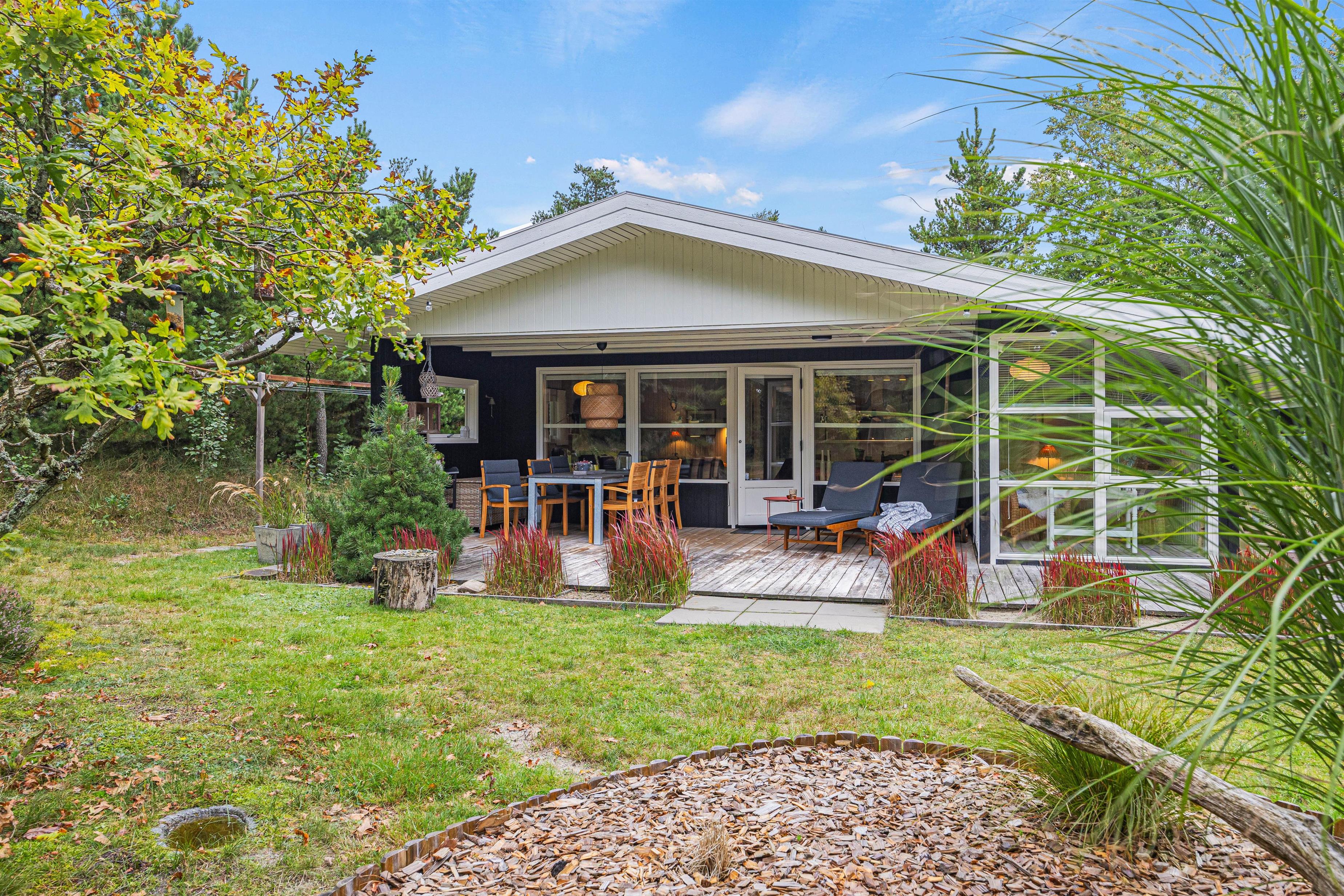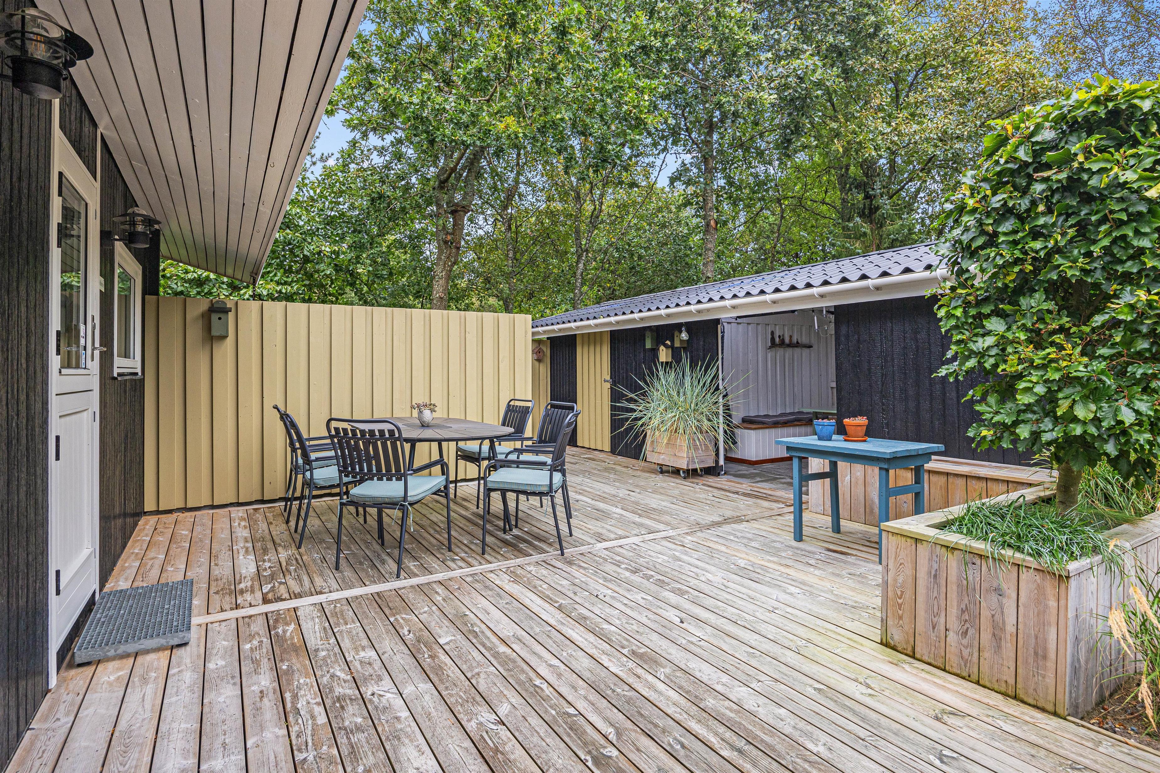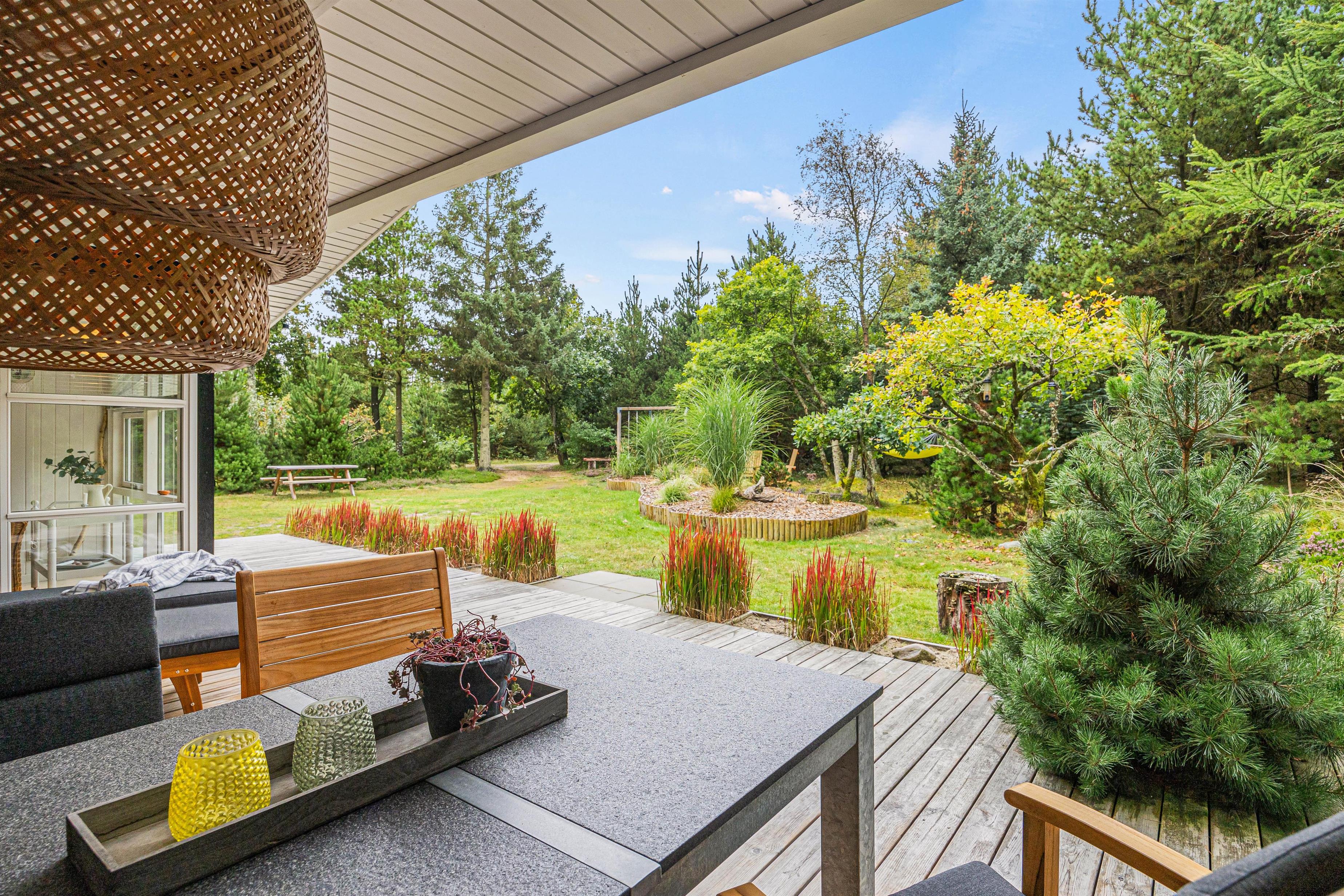 Med 2 overdækkede terrasser finder I altid den perfekte plads,- og skulle I have lyst til at blive siddende, selv om det bliver lidt køligt, så er der mulighed for at tænde for terrassevarmeren og således forlænge en hyggelig grillaften. Dejlige terrasser omgiver næsten hele huset. Her finder I både en plads i solen og i skyggen. På grunden og terrasserne finder I flere hyggelige kroge, hvor I kan slappe af i solen eller læse en god bog i ro og fred.