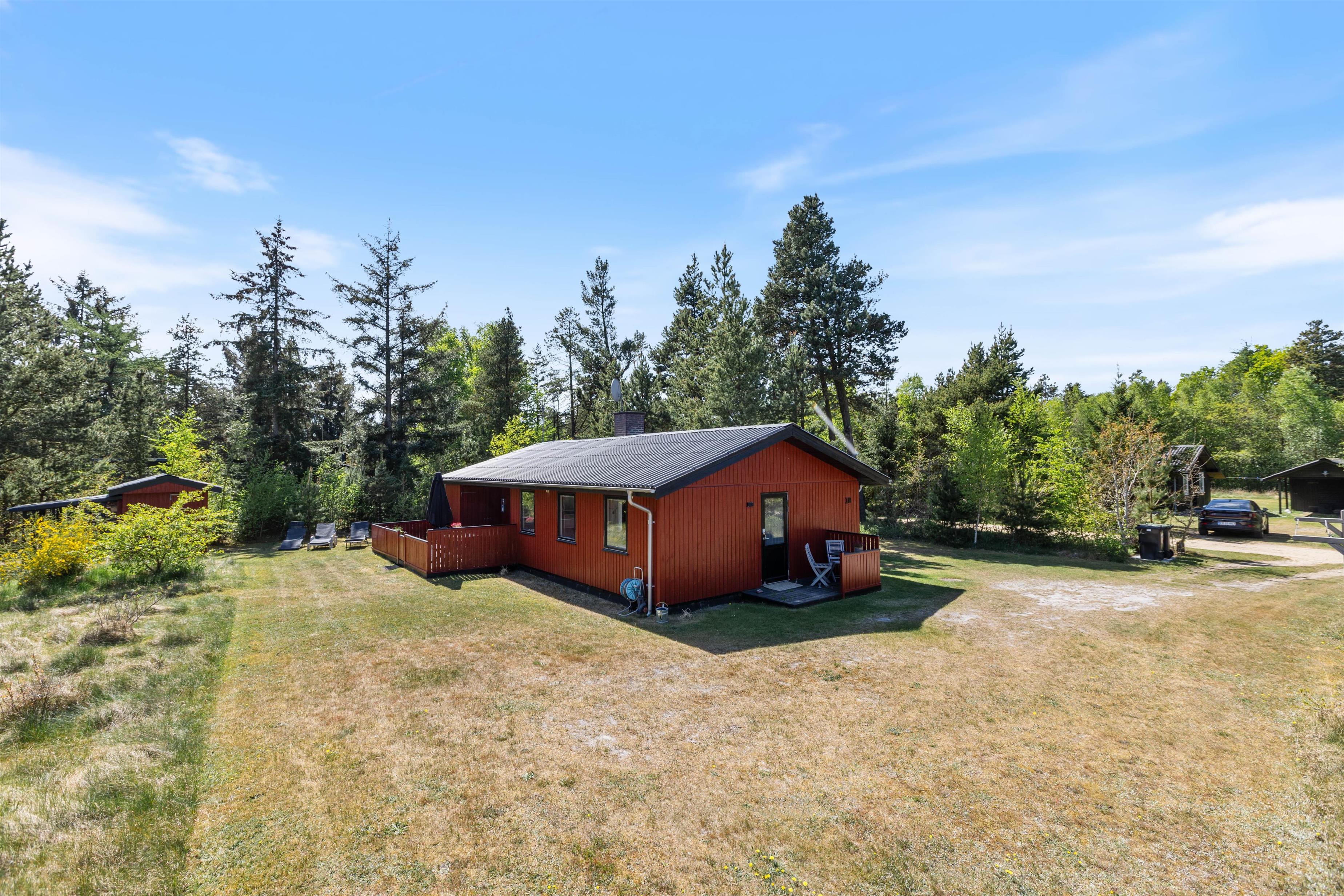 Træder I ud af terrassedøren vil I finde en skøn kombination af plads og natur, der inviterer til både afslapning og aktiviteter. På den store naturgrund, der strækker sig over 2100 kvadratmeter, kan I nyde rolige stunder omgivet af træernes grønne kroner.
