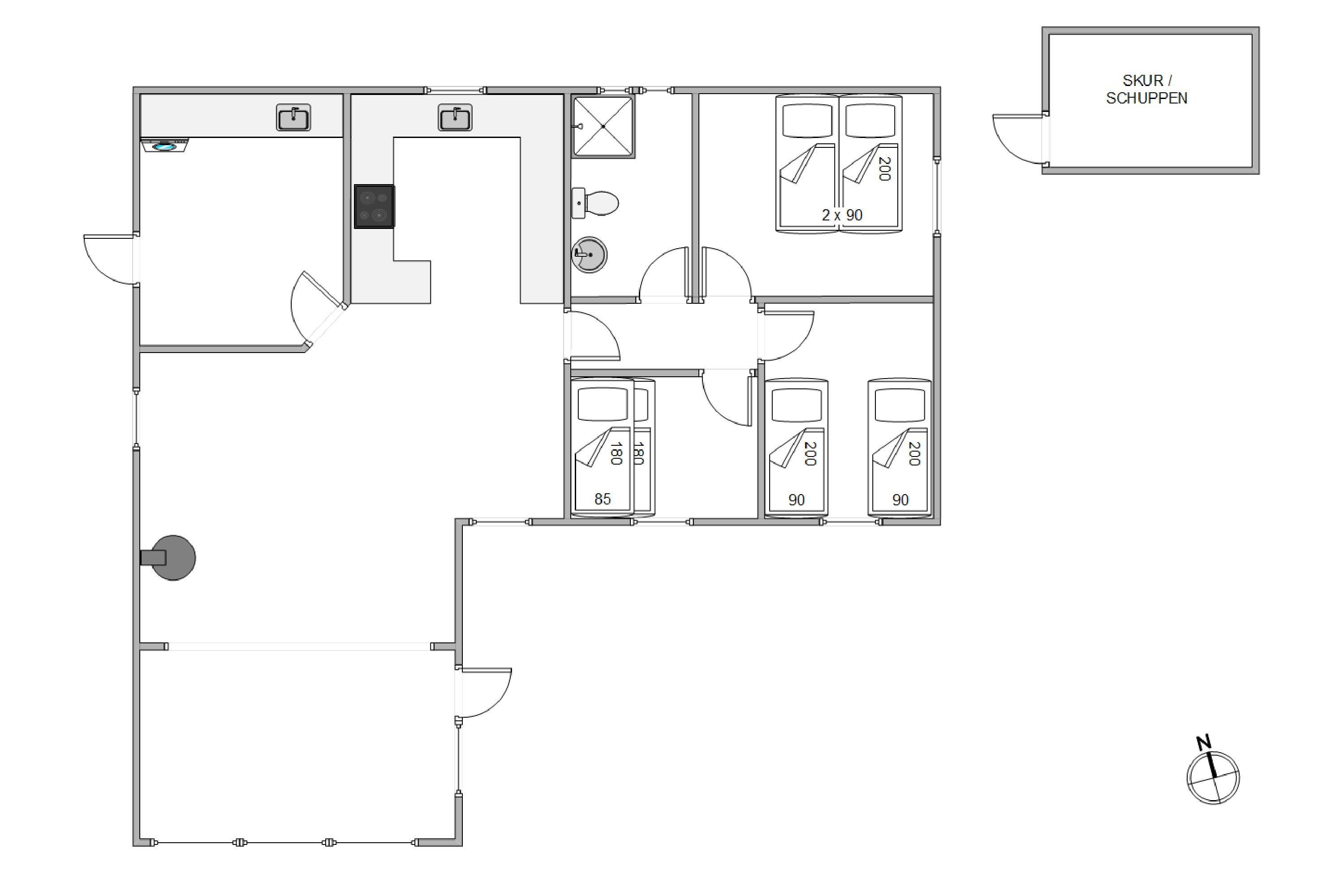 I sommerhuset på Søndervang 29 i Houstrup, der er 100 kvadratmeter stort, finder I 3 soveværelser, der er indrettet med henholdsvis en dobbeltseng, 2 enkeltsenge og en etageseng. Desuden er her også et badeværelse, der er udstyret med gulvvarme, så I slipper for at starte dagen med kolde tæer.
