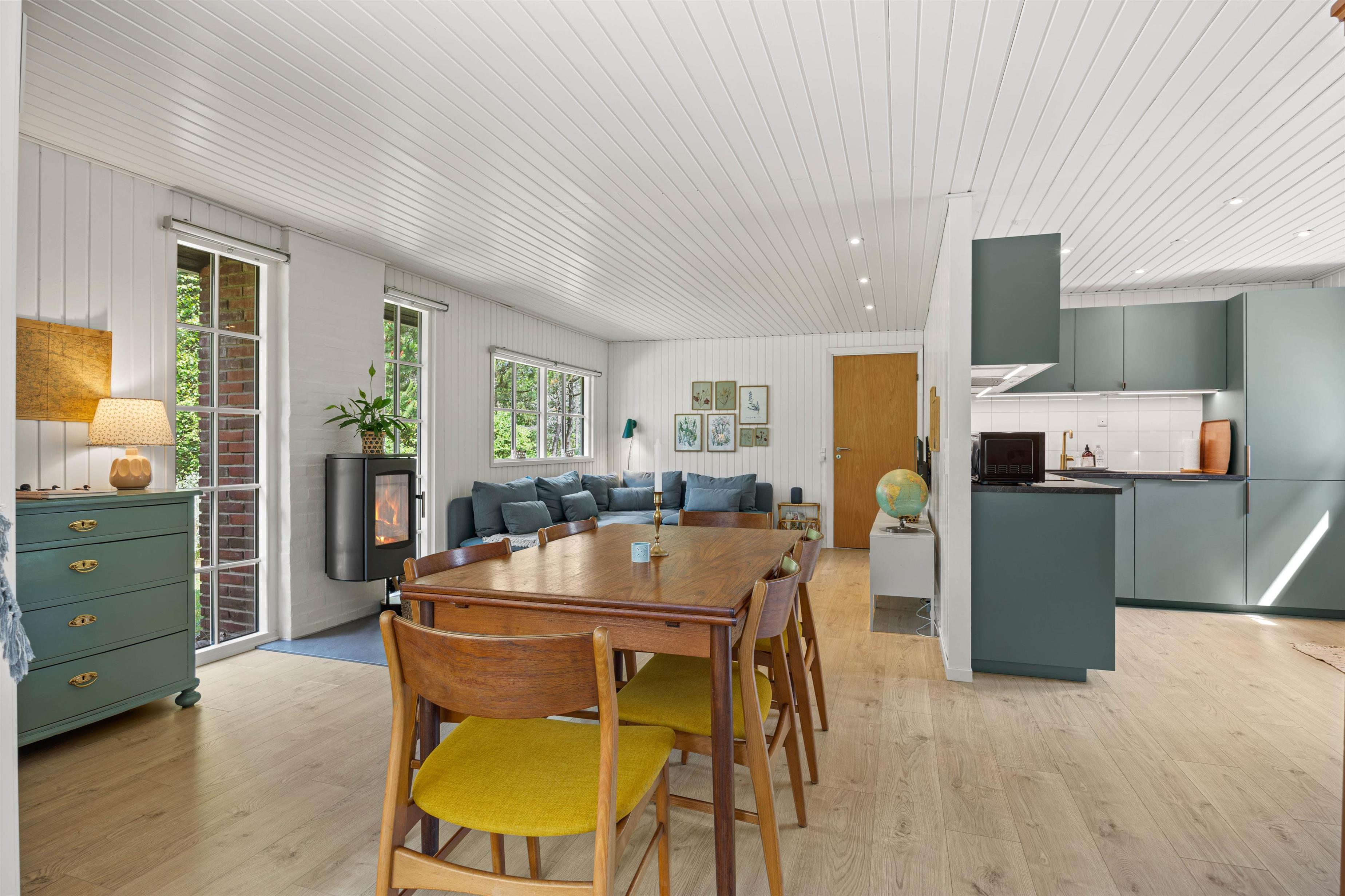 I huset er der masser af plads til familiehygge. Står fælles madlavning på dagsorden, så danner det godt udstyret køkken gode rammer. Her står bl.a. en opvaskemaskine og et kombineret køleskab med fryser til rådighed. Det hjemmelavede måltid kan bagefter nydes ved det store spisebord, hvor der også kan spilles kort bagefter. Den hyggelige sofagruppe ved siden af brændeovnen giver gode muligheder for film og hygge.