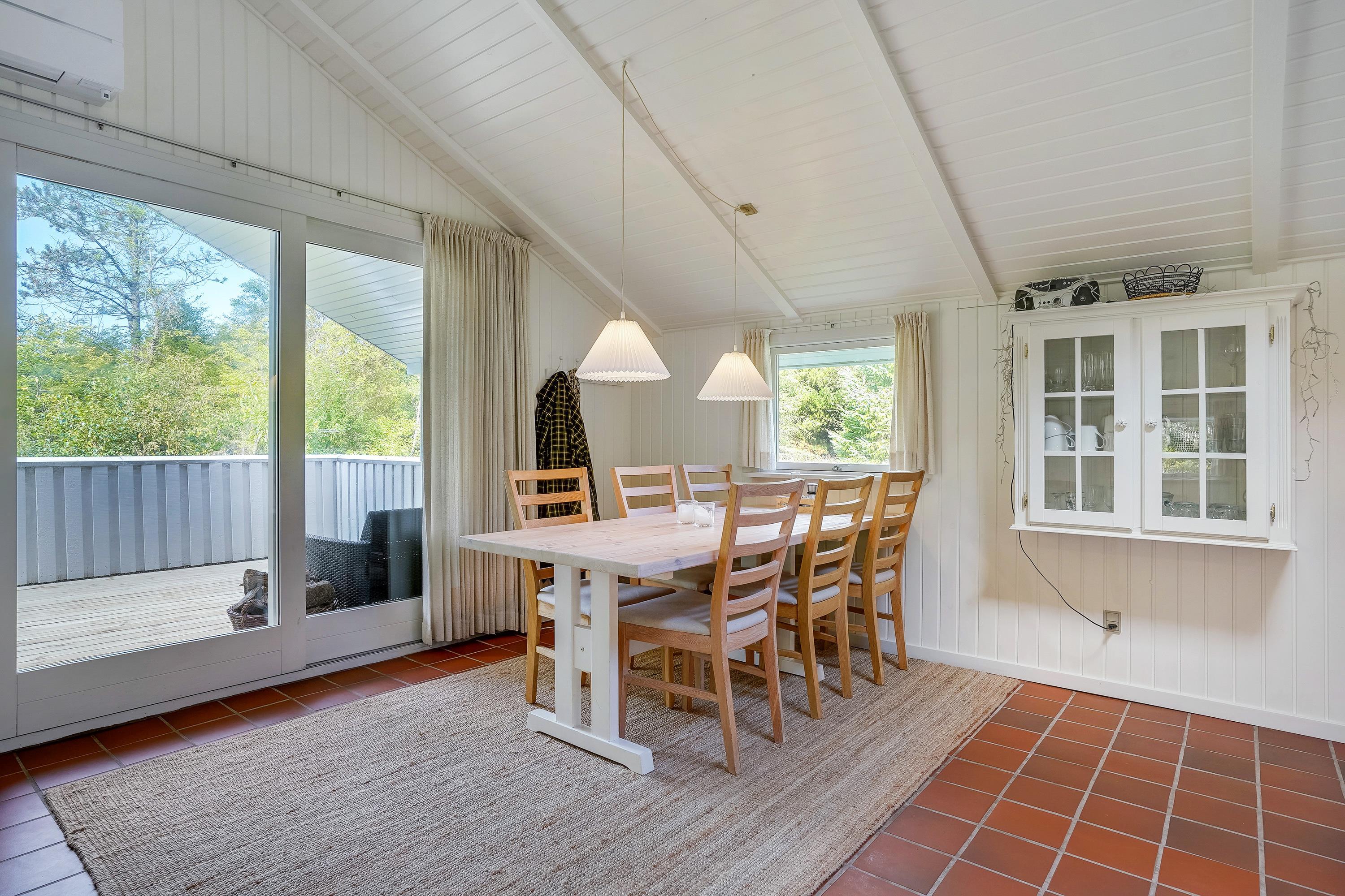 Sommerhuset er lyst og venligt indrettet, væggene er lyse, og vinduerne giver dejlige udblik i den grønne natur. Samlingssted er feriehusets køkkenalrum med stue. Det er her, der skal hygges med familiespil ved spisebordet eller slappes af på sofaen.