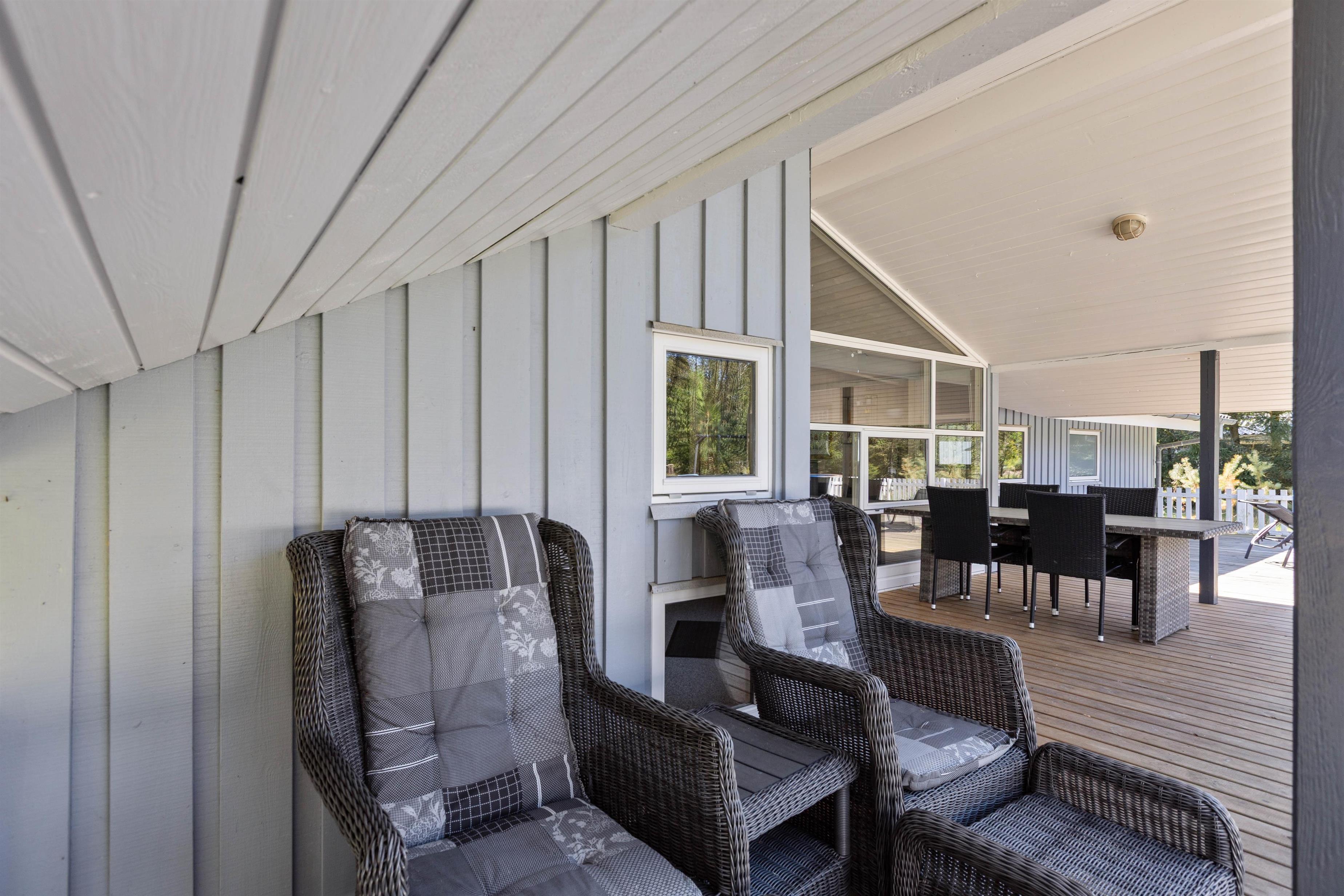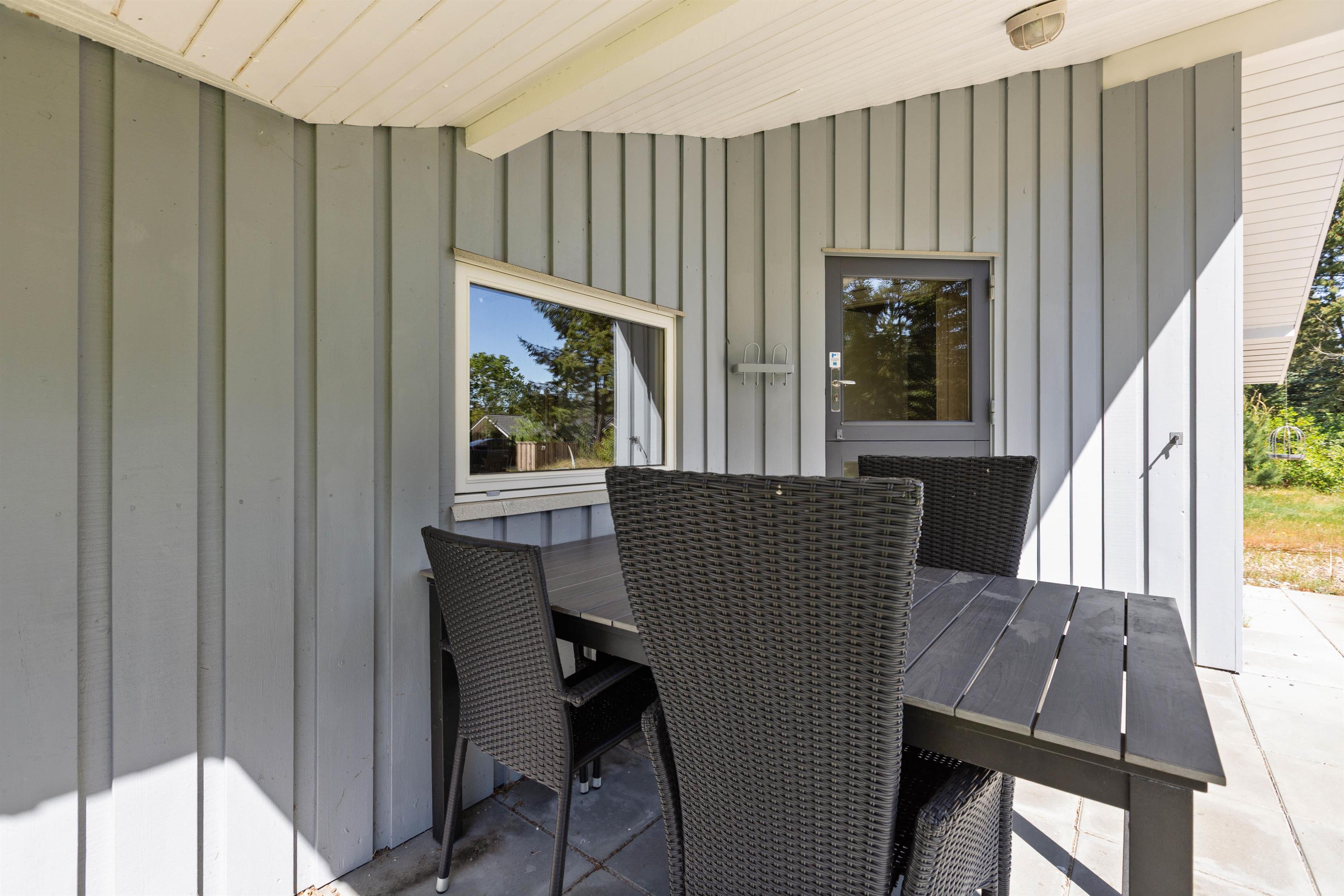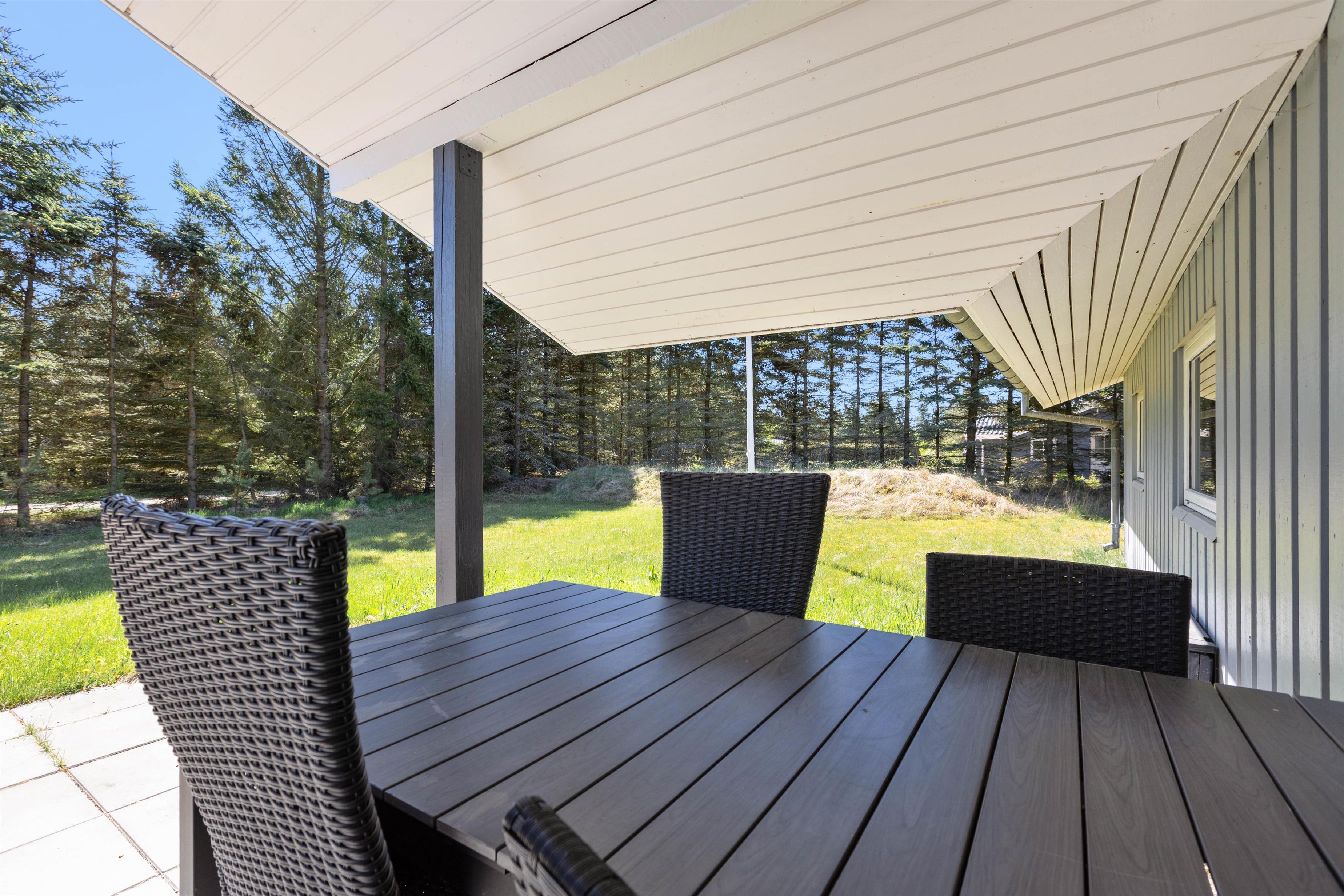 På udeområdet har I også en dejlig terrasse, der er lukket og delvist overdækket, så her kan I altså både sidde i ly og læ. I har havemøbler og liggestole, som I kan læne jer tilbage i på terrassen, og om aftenen kan I samles på terrassen til en lækker middag, som I kan tilberede på grillen.