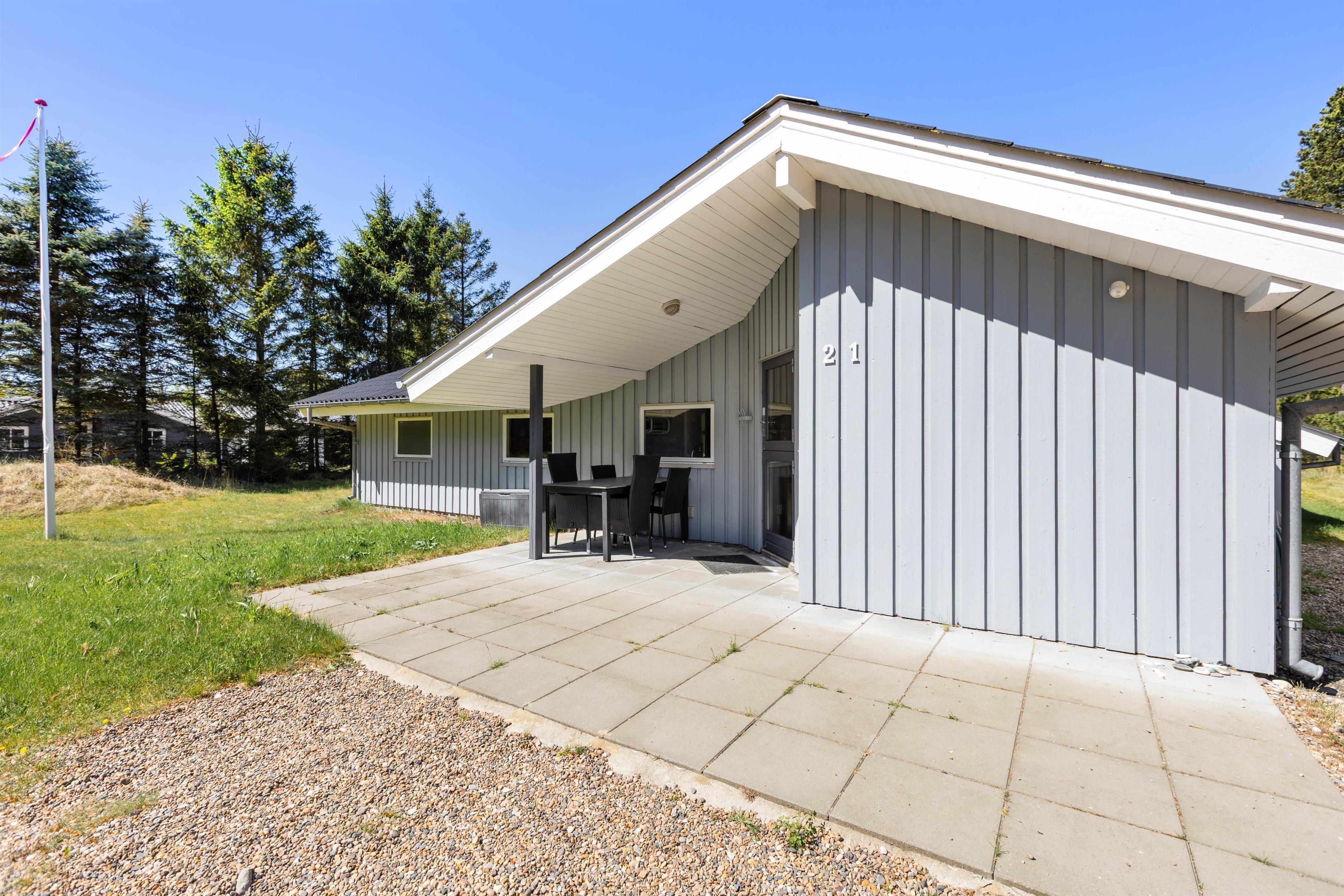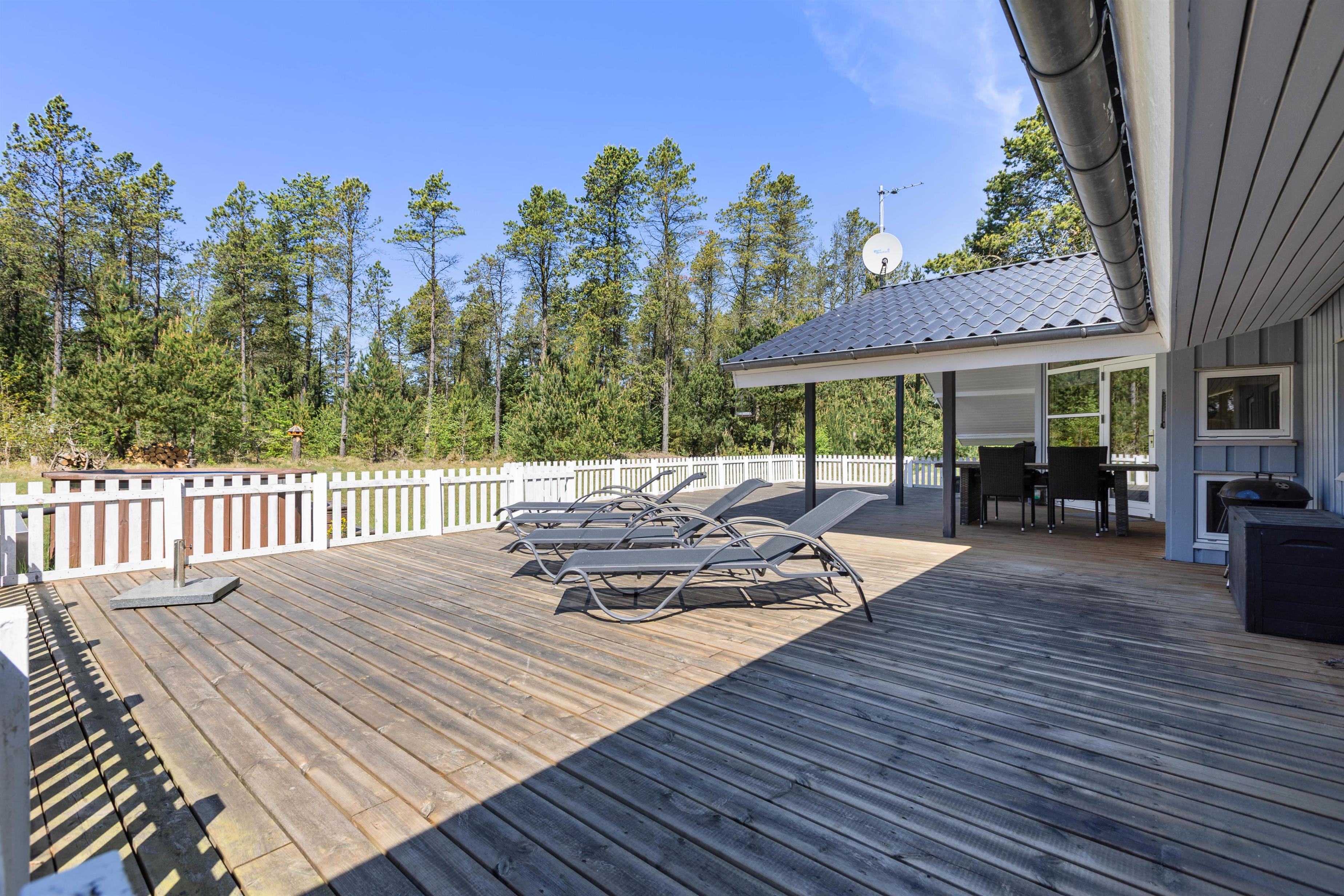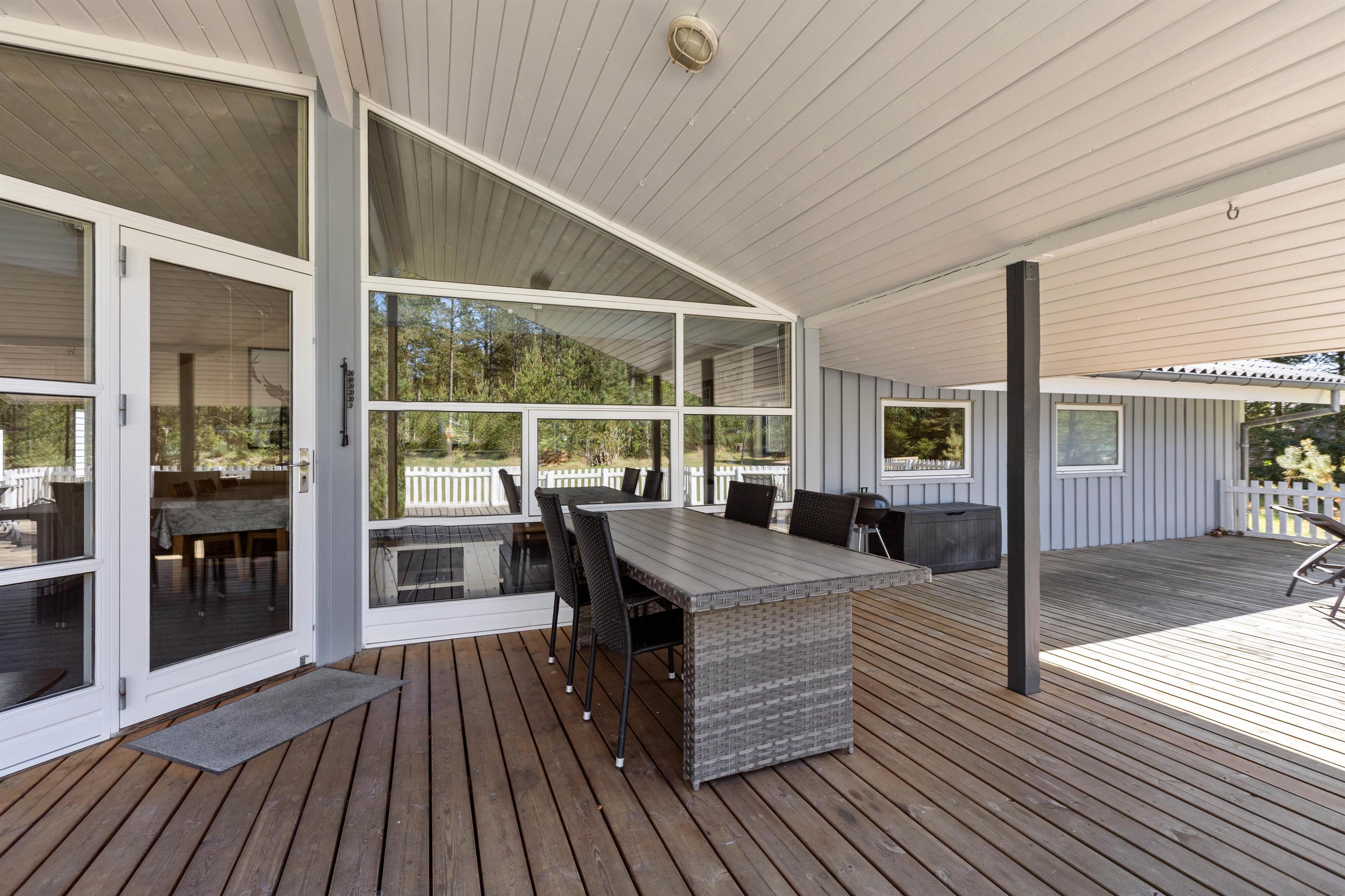 På udeområdet har I også en dejlig terrasse, der er lukket og delvist overdækket, så her kan I altså både sidde i ly og læ. I har havemøbler og liggestole, som I kan læne jer tilbage i på terrassen, og om aftenen kan I samles på terrassen til en lækker middag, som I kan tilberede på grillen.
