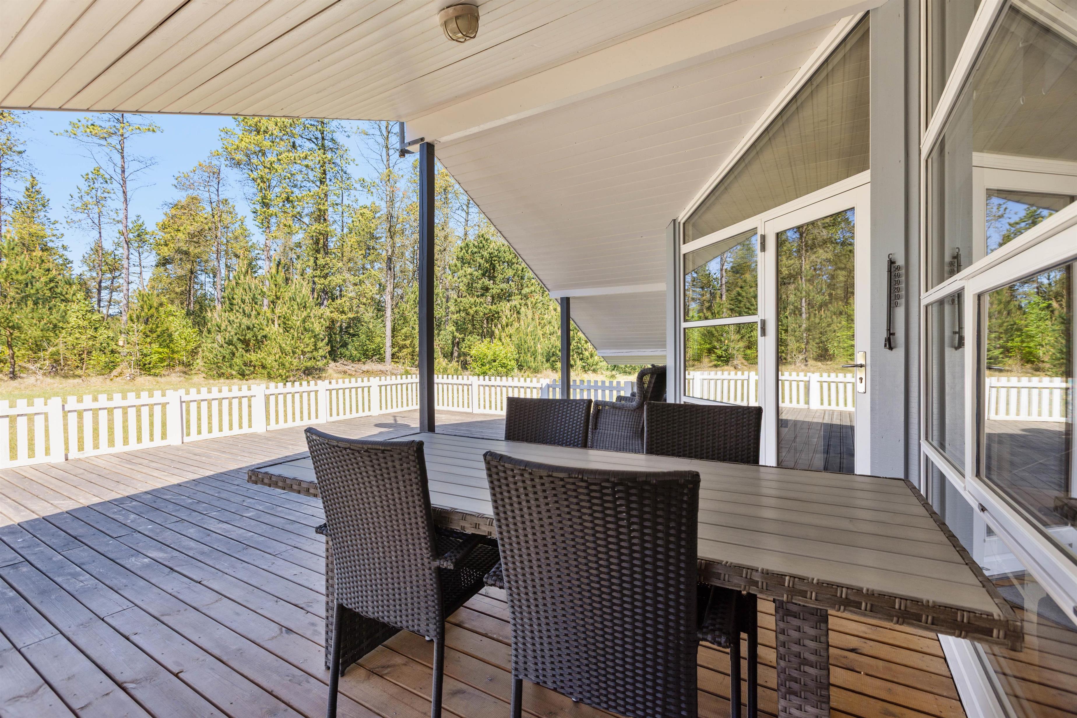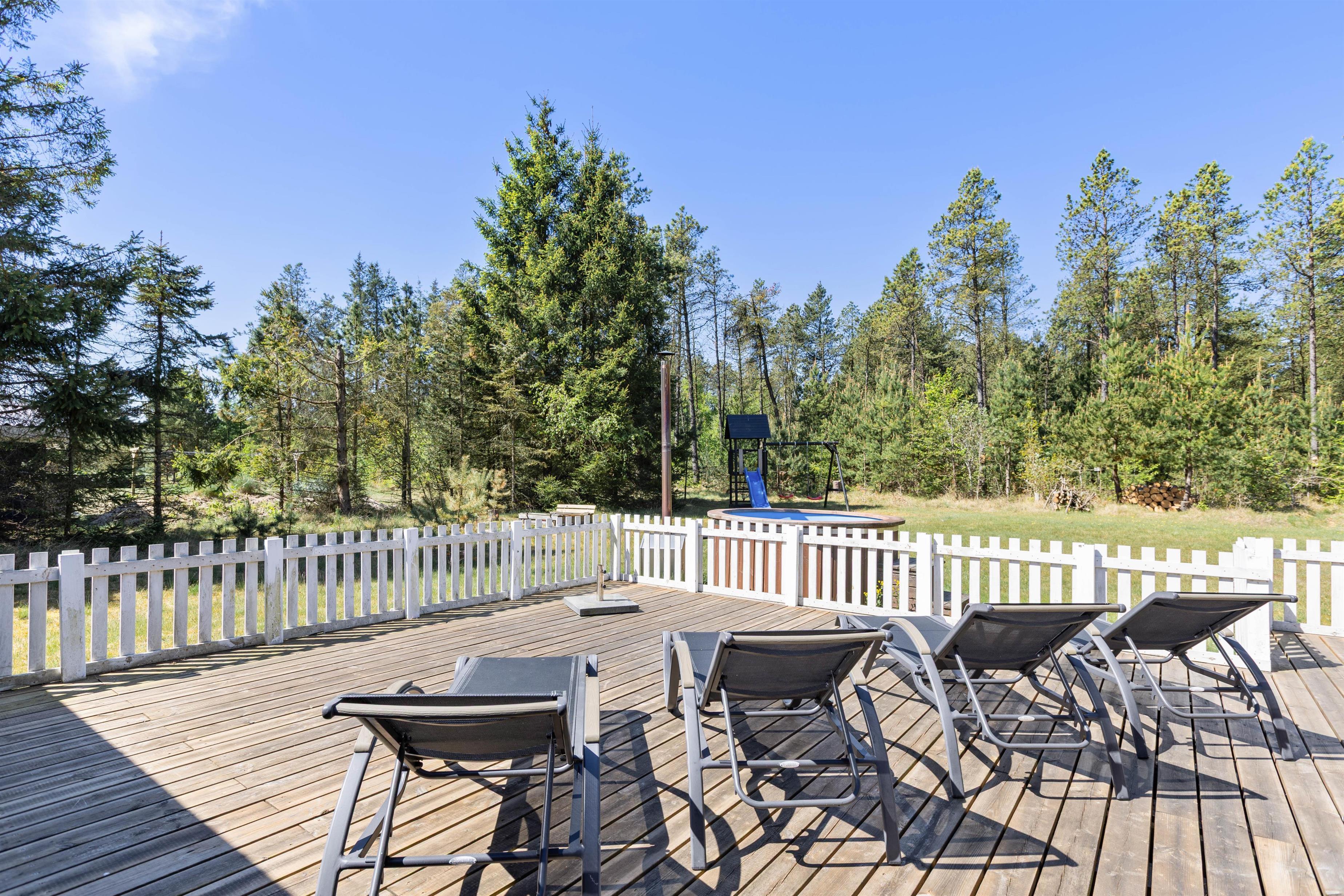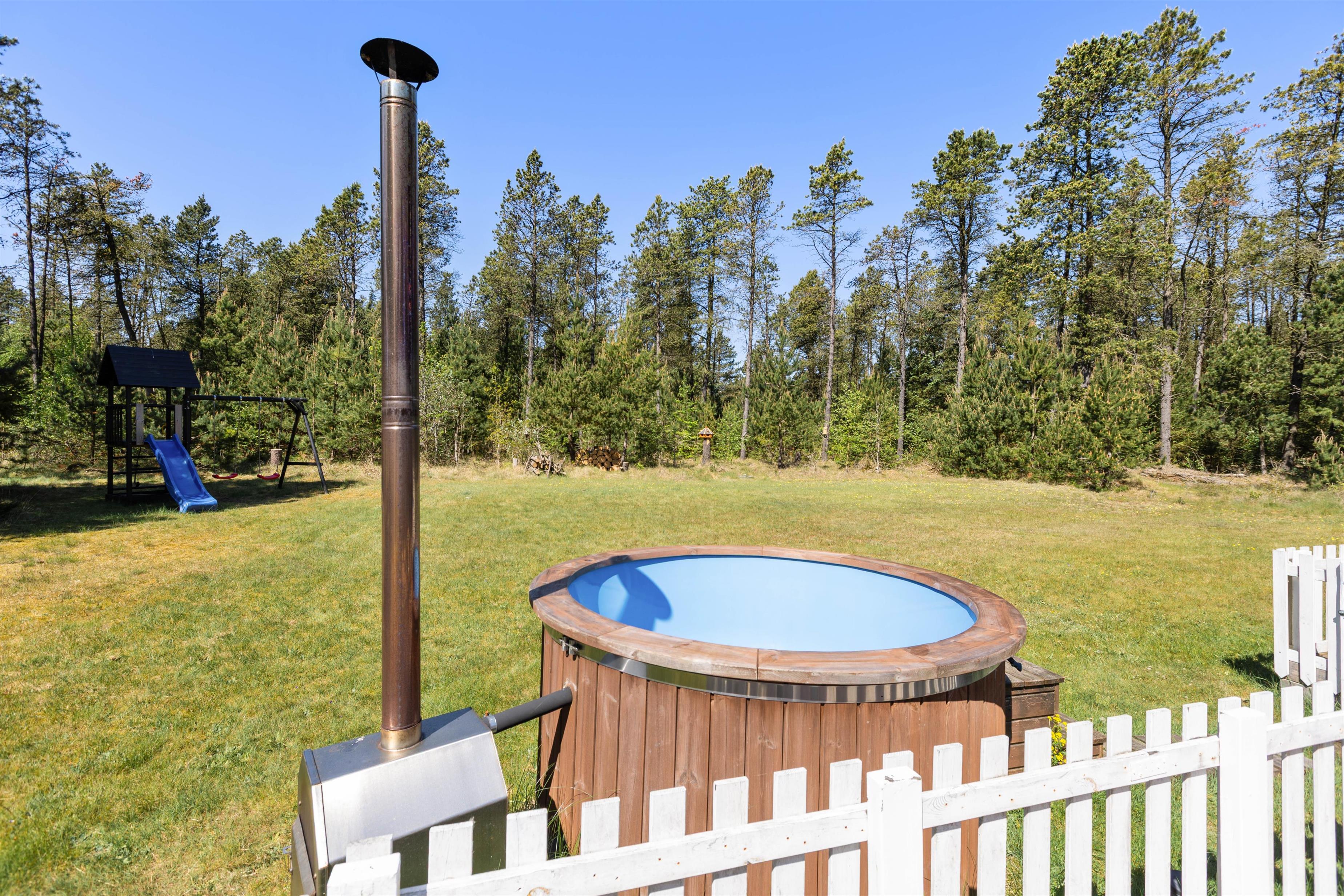 Sommerhuset på Fyrrekrogen 21 er beliggende på en grund i Houstrup, der er mere end 2.800 kvadratmeter stor, og her er der masser af plads, I kan boltre jer på. På det store udeområde venter jer også et af sommerhusets højdepunkter: vildmarksbadet.