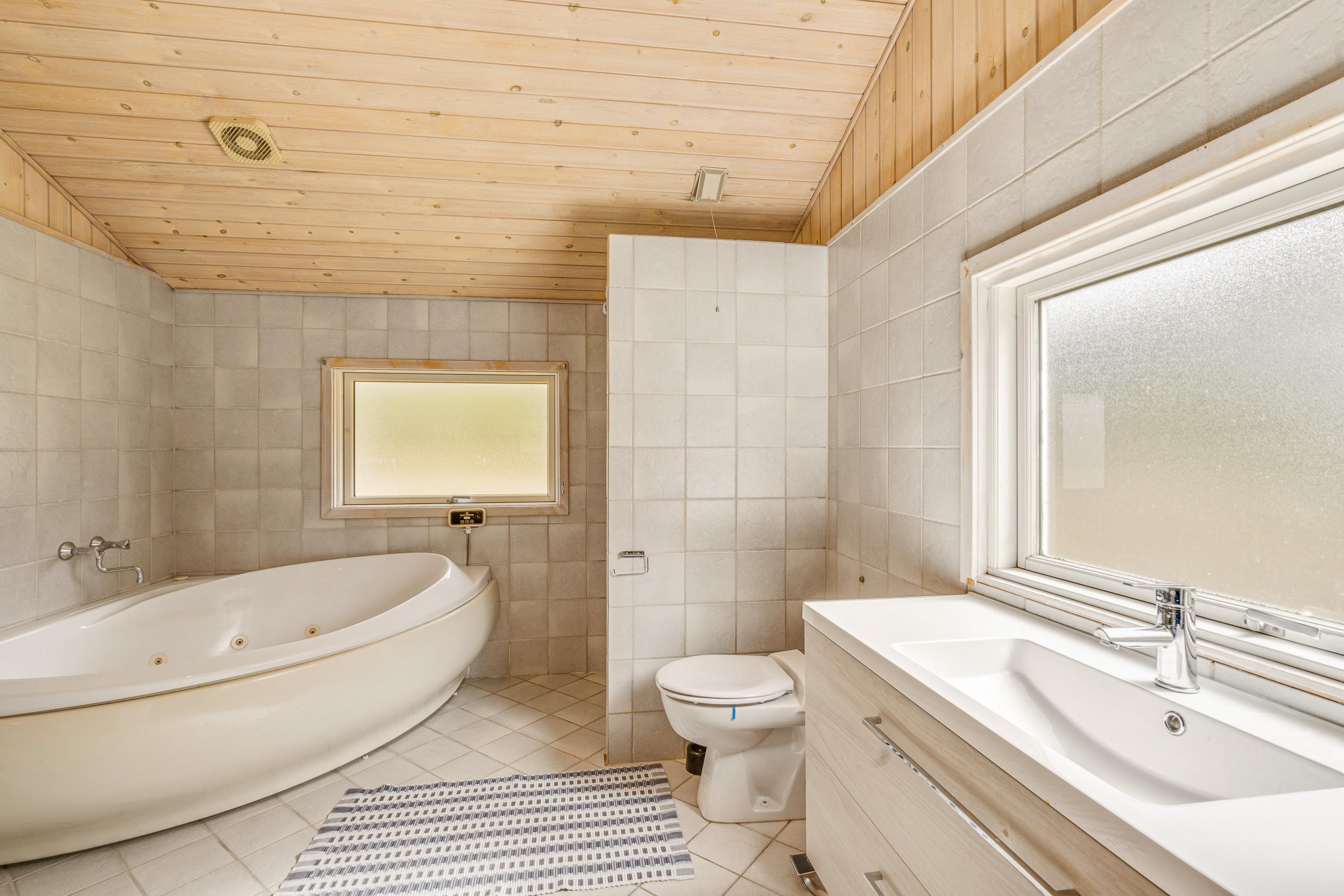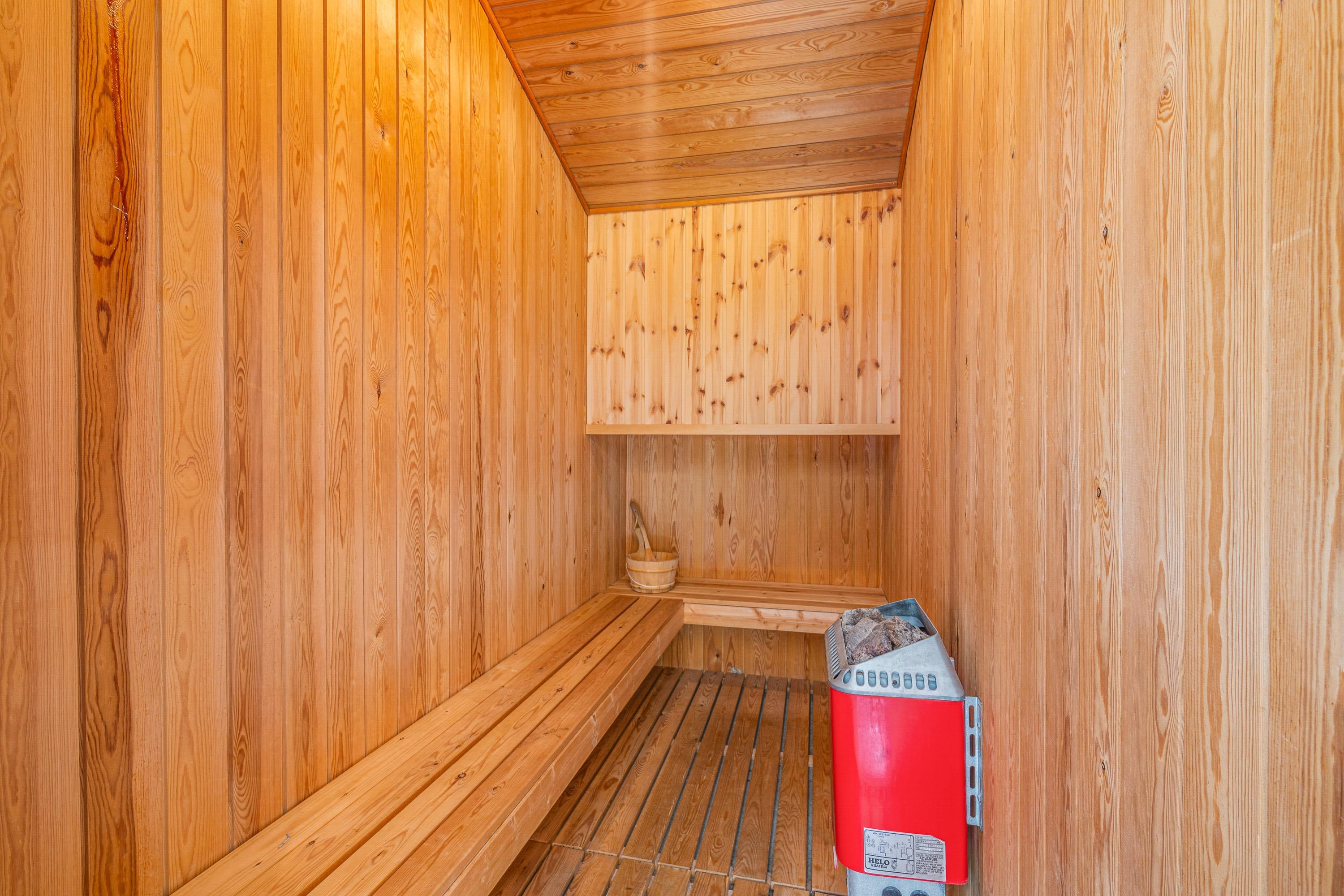 Flere af sommerhusets højdepunkter finder I på det ene af sommerhusets badeværelser. Her venter jer et wellnessområde med spa og sauna, som indbyder til afslappende stunder på jeres ferie, hvor I kan få slappet fuldstændig af og komme helt ned i gear.