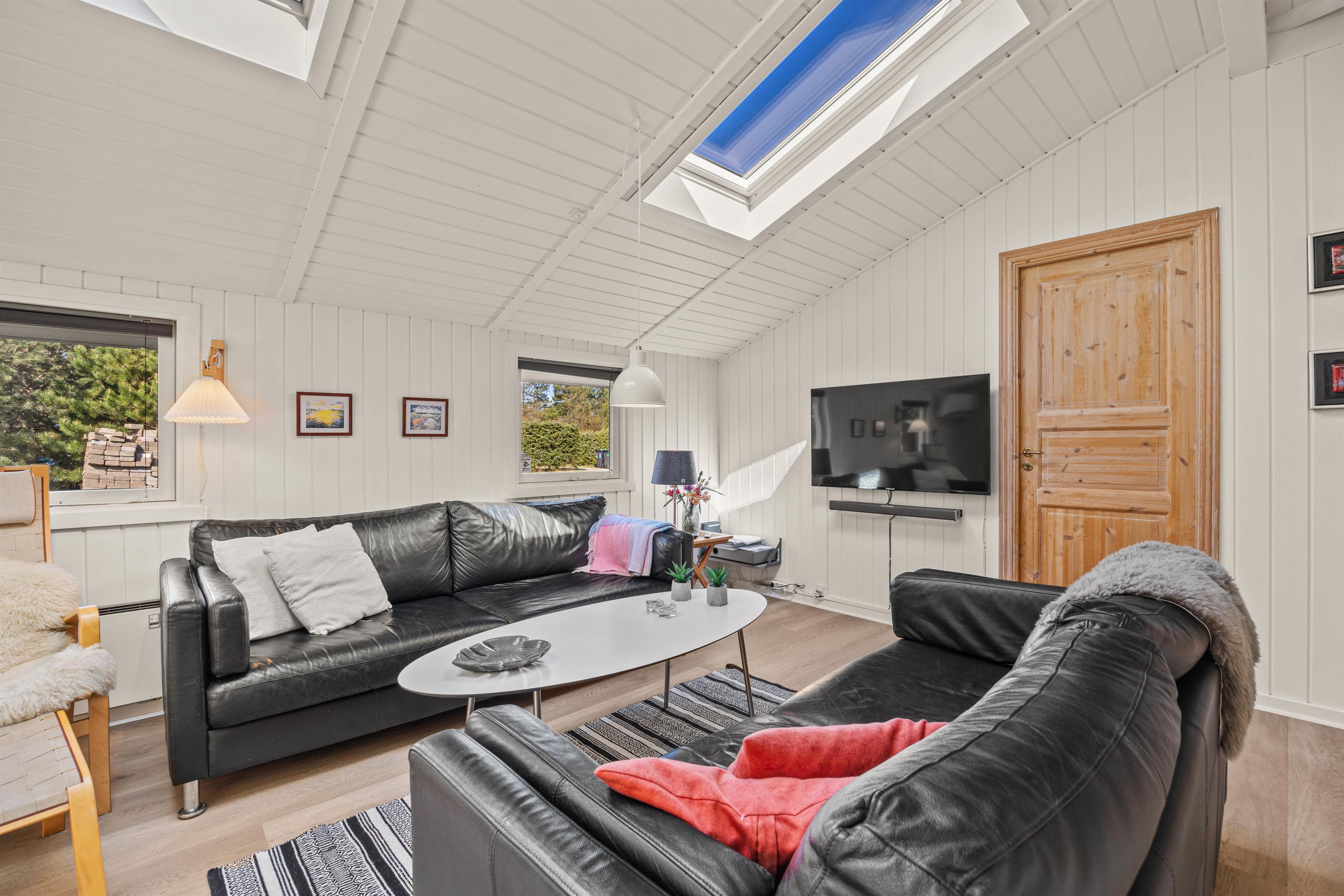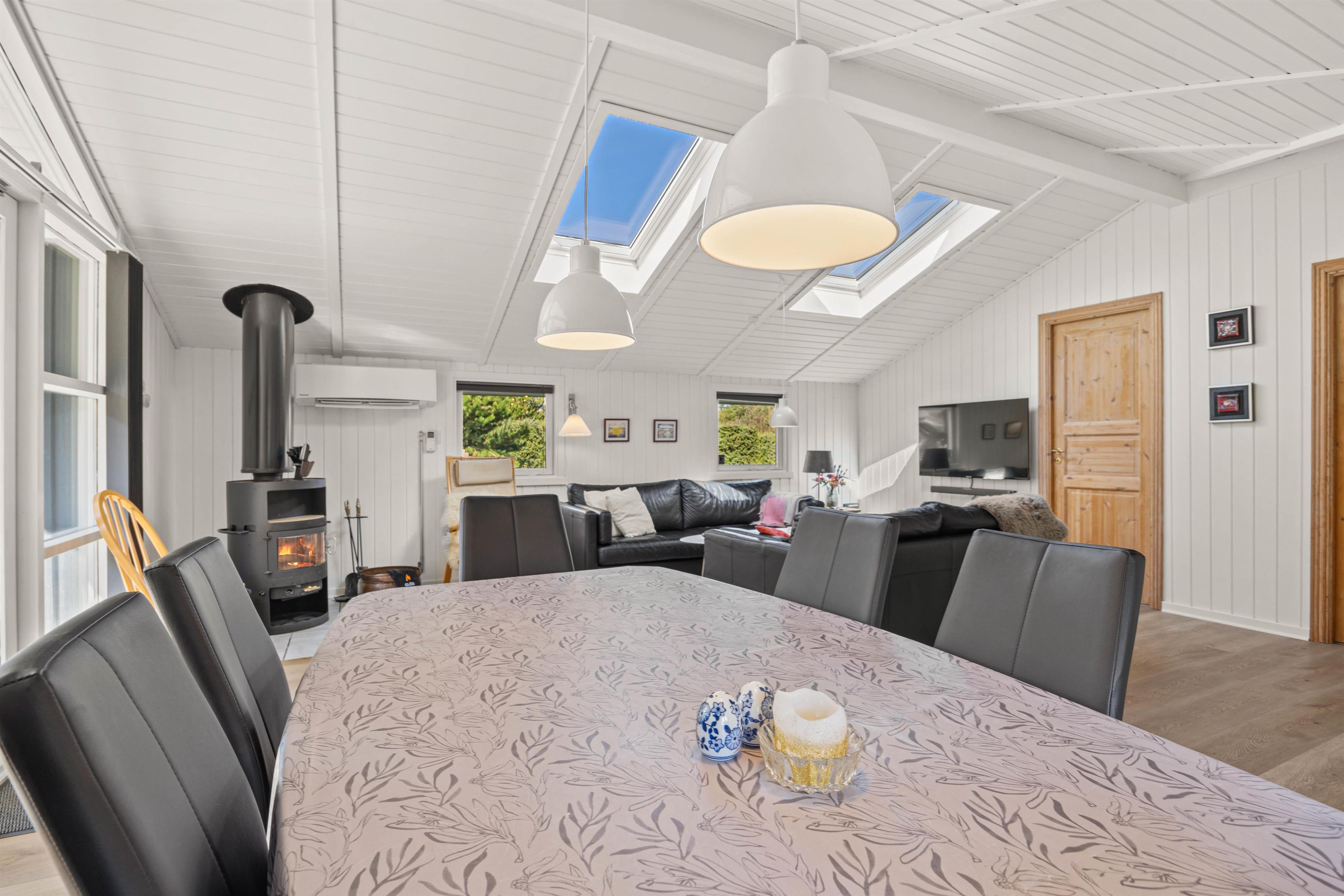 Samlingspunktet er det åbne alrum, som forener køkken og stue i ét. Her er lyst, ovenlysvinduerne giver en lys og luftig atmosfære. Der er rigeligt med siddepladser, og mens mørket falder på udenfor, kan hele familien samles til filmhygge og kortturneringer, mens brændeovnens (fra 2025) knitren sørger for ekstra god feriestemning i de sene aftentimer. Også en energibesparende varmepumpe er installeret i sommerhuset.