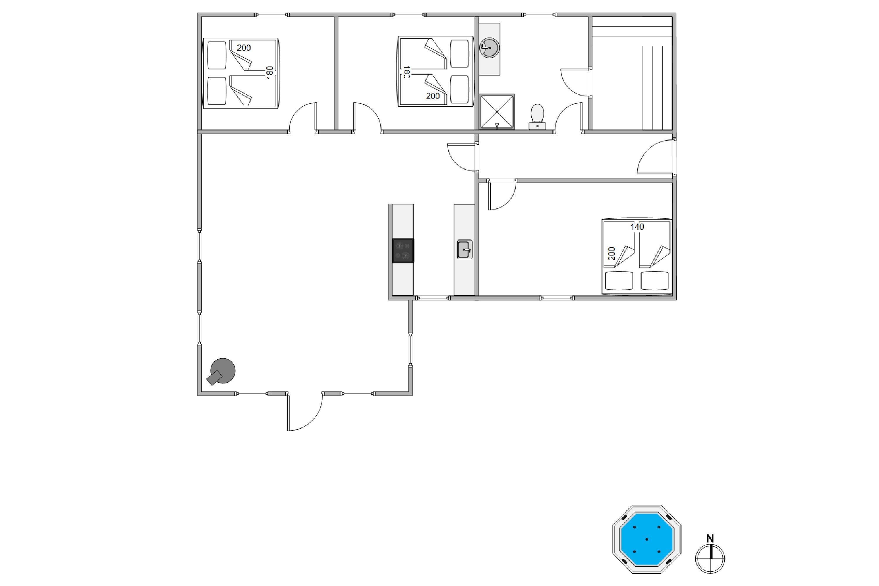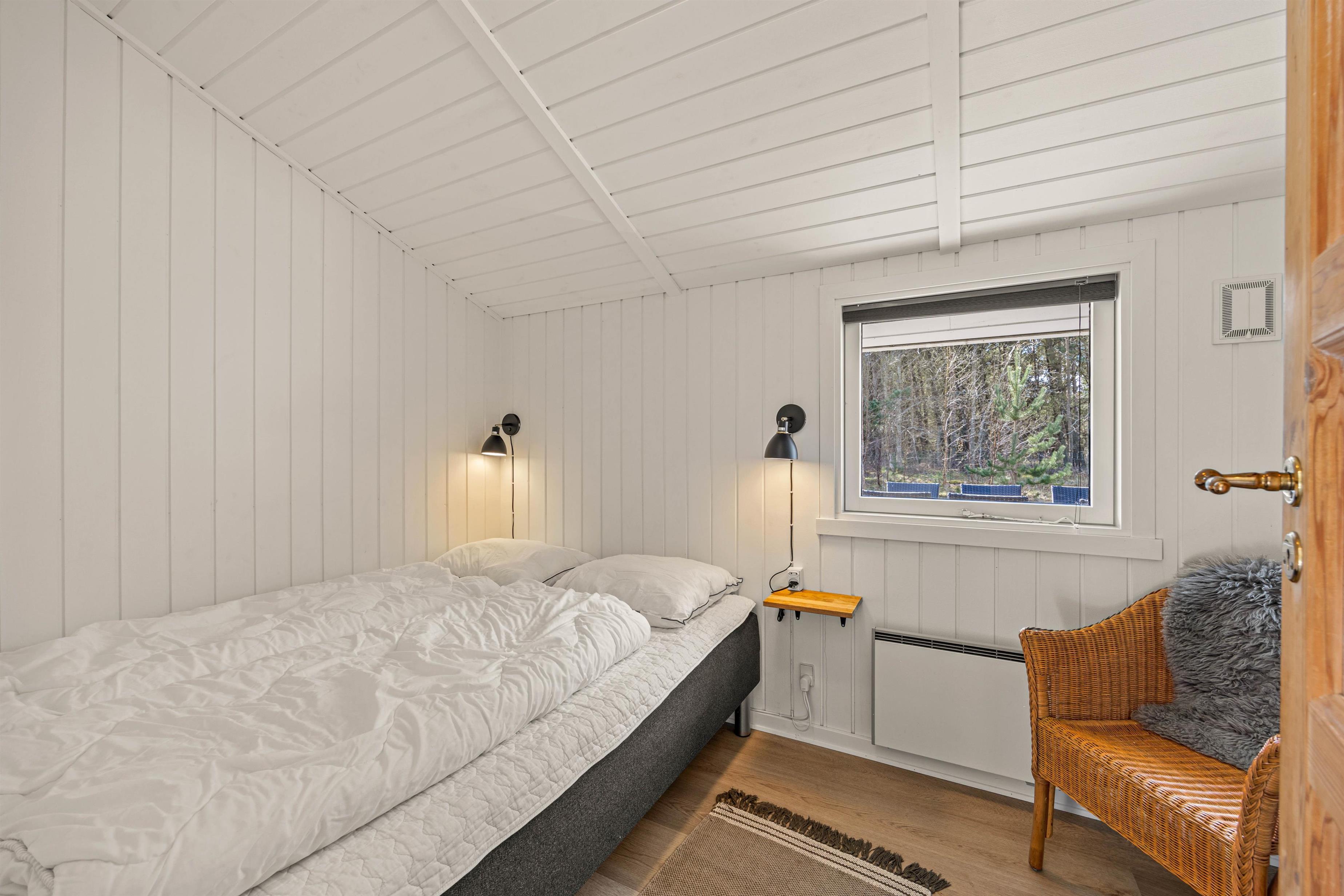 De 6 sovepladser fordeler sig på 3 rummelige værelser. Her er I sikret en god nattesøvn. På badeværelset er der naturligvis gulvvarme, så I ikke fryser tæerne. Det er også herinde, boblebadet og saunaen venter jer. Her kan I kravle ind efter en lang tur i skoven og igen få varmen. Vaskemaskinen finder I også her på badeværelset.