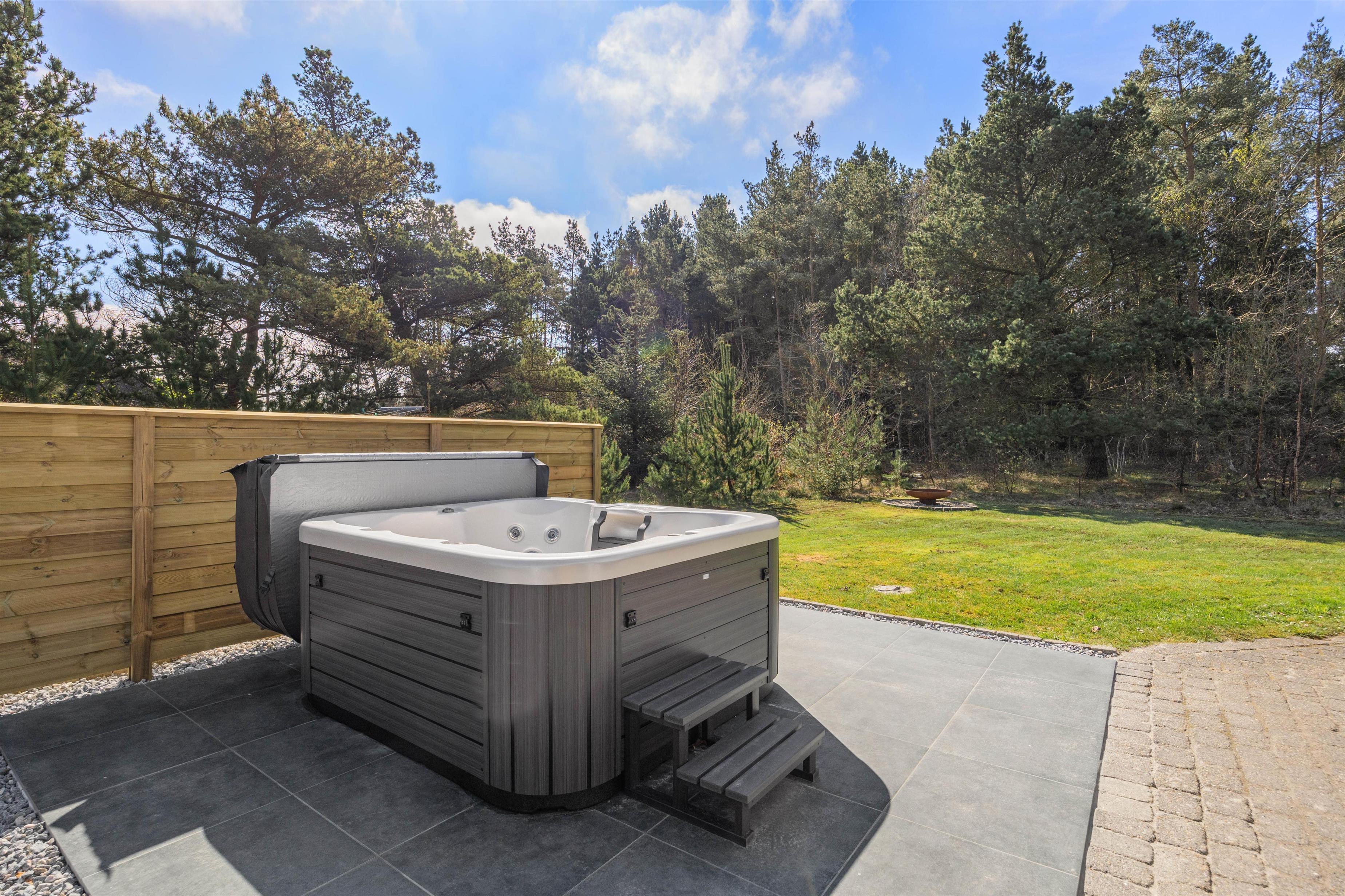 Når mørket falder på, kan I hoppe i det varme vand i det udendørs spabad, hvor I kan nyde stjernerne komme frem. Perfekt afslutning på endnu en skøn feriedag.