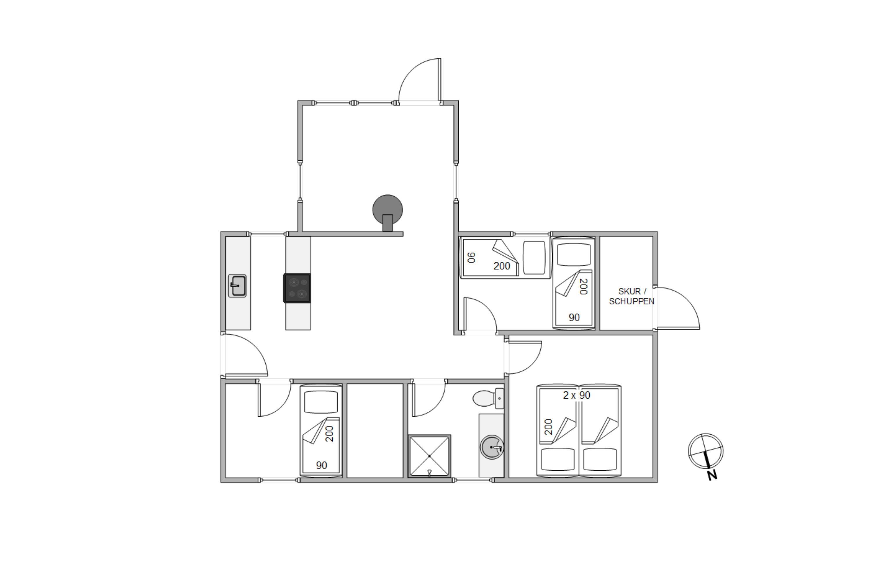 Når I kommer ind i sommerhuset, træder I direkte ind i køkkenalrummet, hvorfra I har adgang til alle ferieboligens andre rum, heraf 3 soverum, hvor det første er indrettet med en enkeltseng, det næste med 2 enkeltsenge og det sidste med en dobbeltseng. Dertil har sommerhuset et badeværelse med gulvvarme, så I ikke skal fryse fødderne på vej ud af badet.