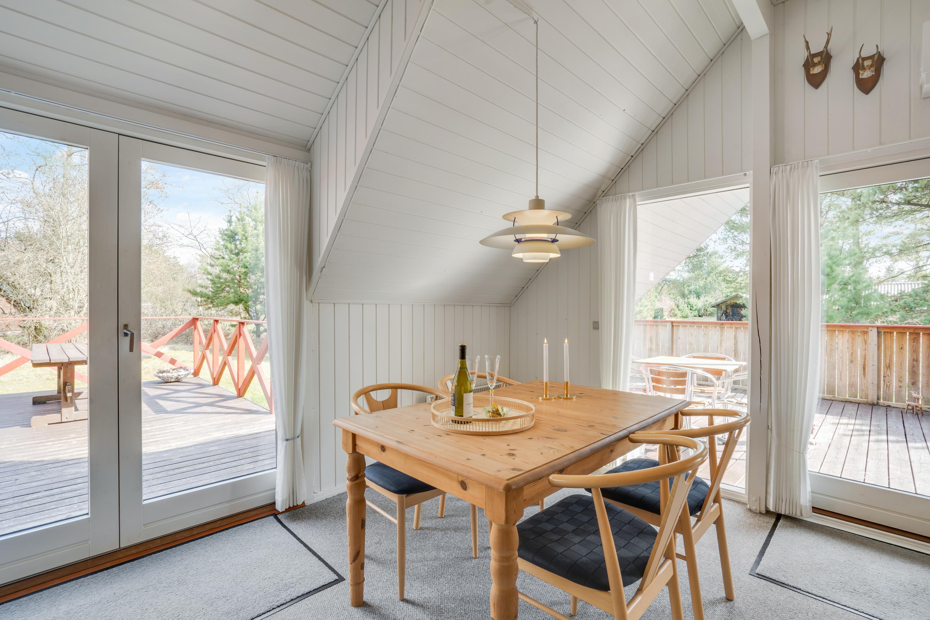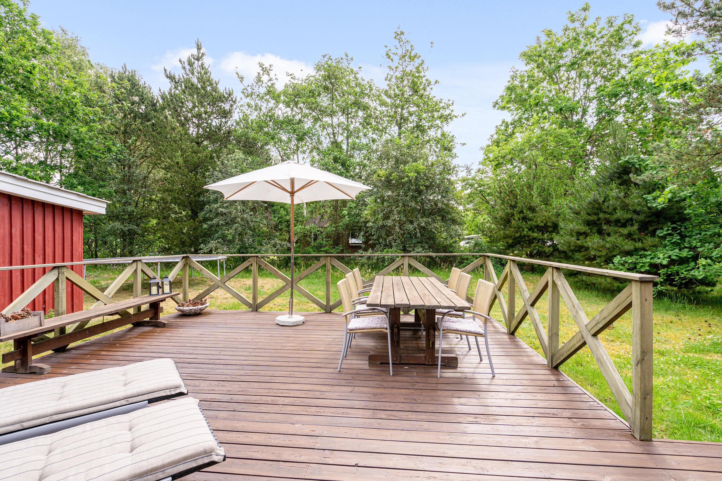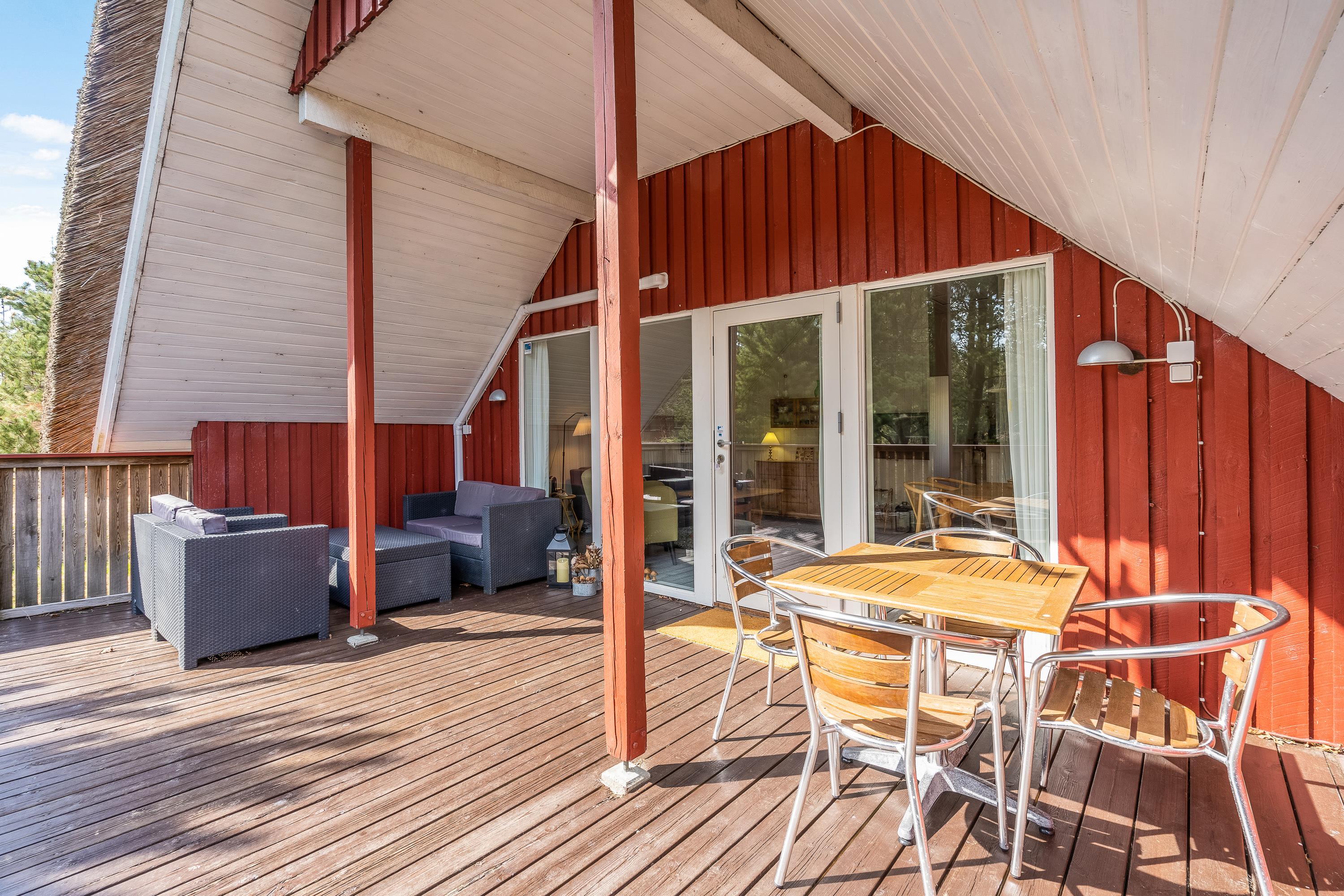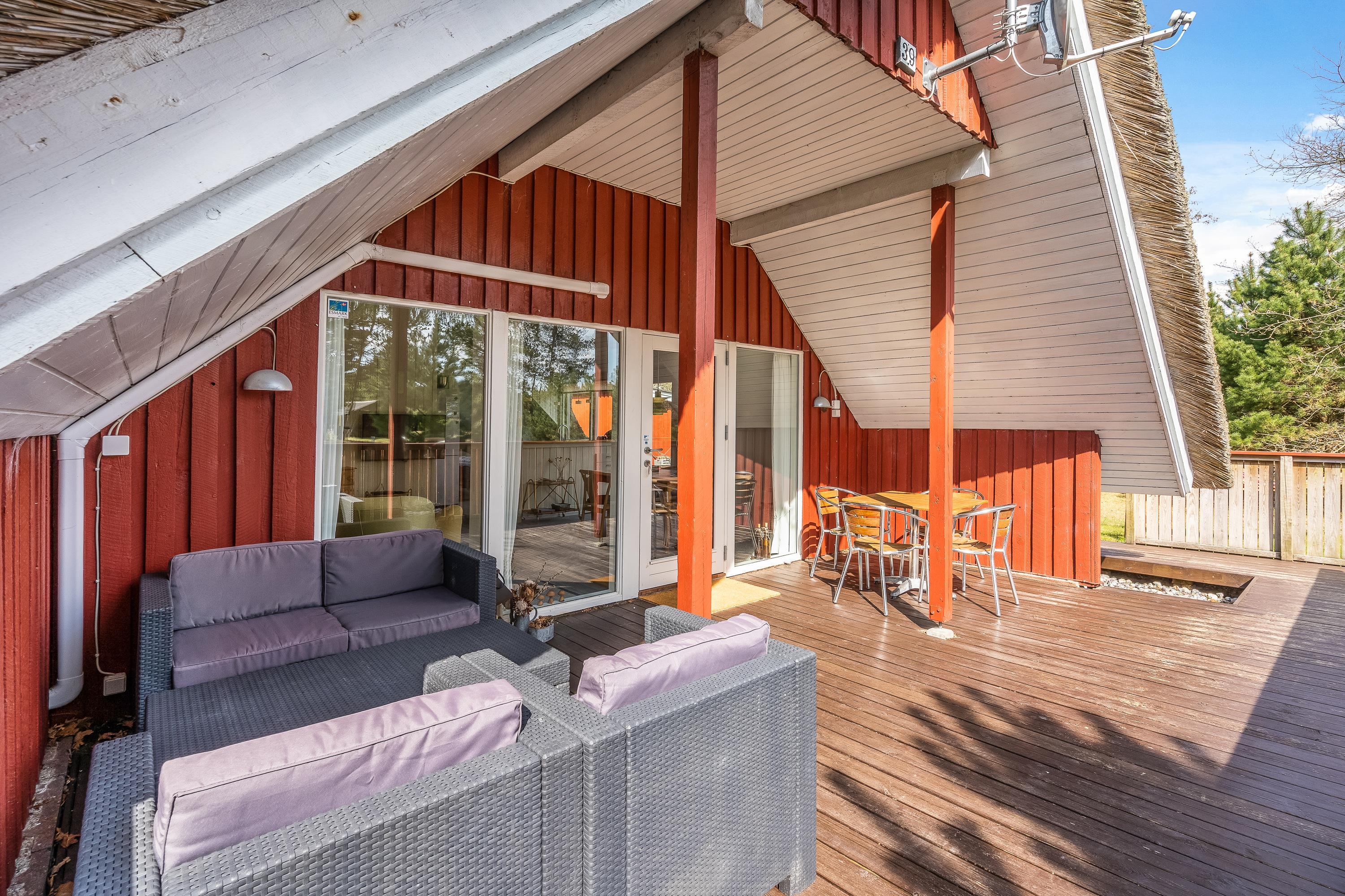 Fra stuen er der direkte udgange til husets lækre terrasser. Til den ene side er terrassen delvist overdækket og afskærmet, så man her kan hygge sig næsten hele året. Skal der tankes sol på liggestolene så er det store åbne terrassedæk stedet, her sidder I også dejligt privat, når der skal hygges med grillmad.