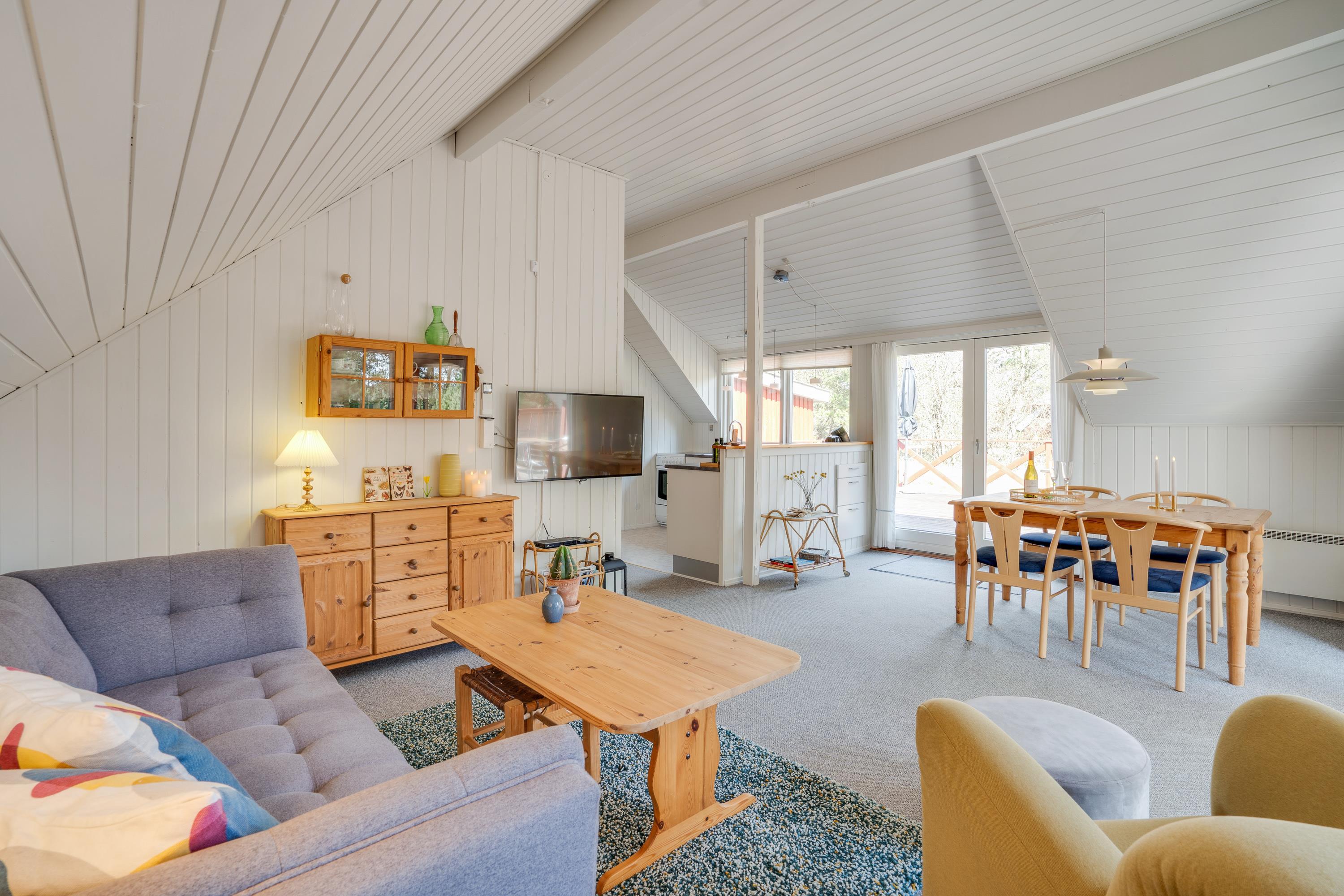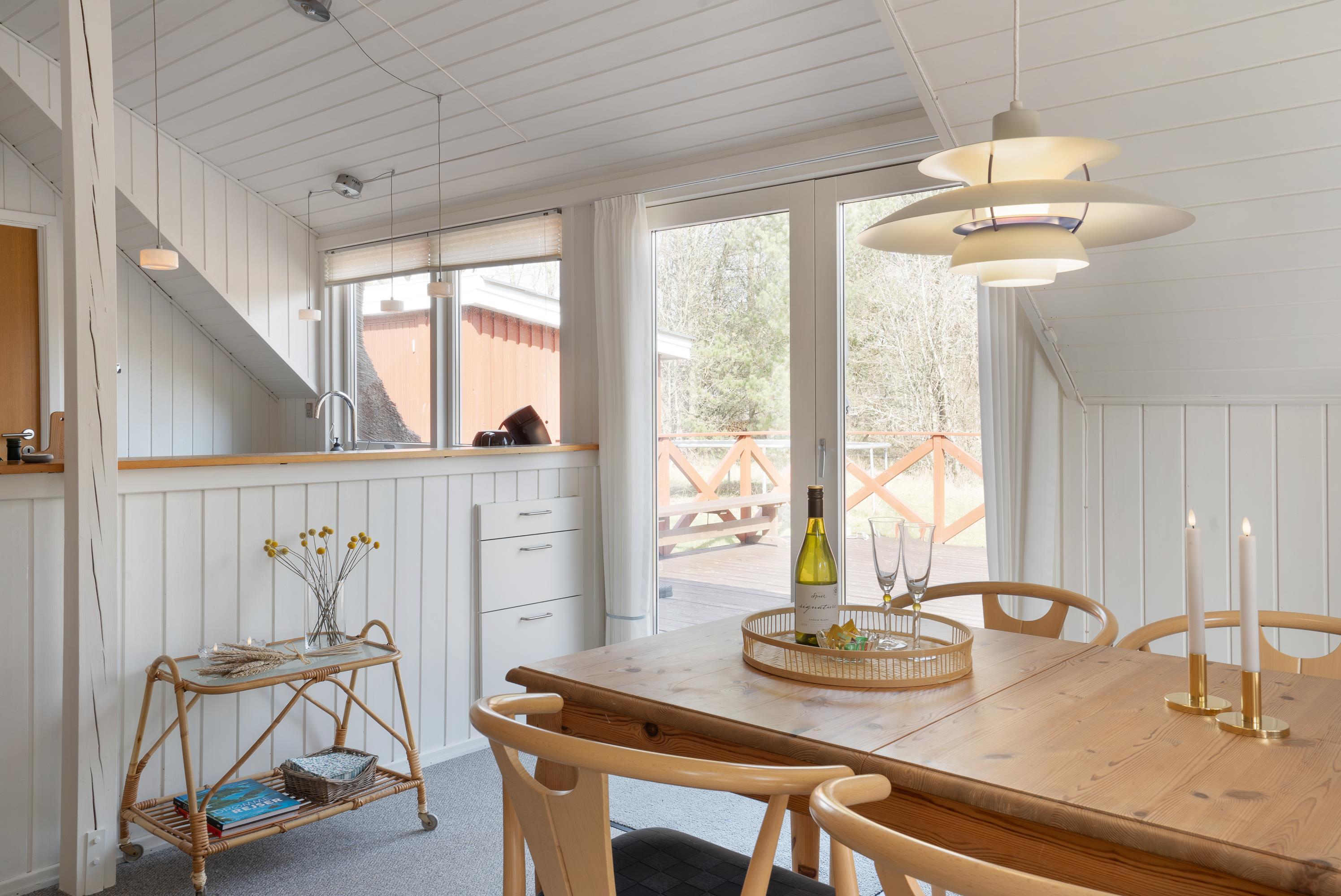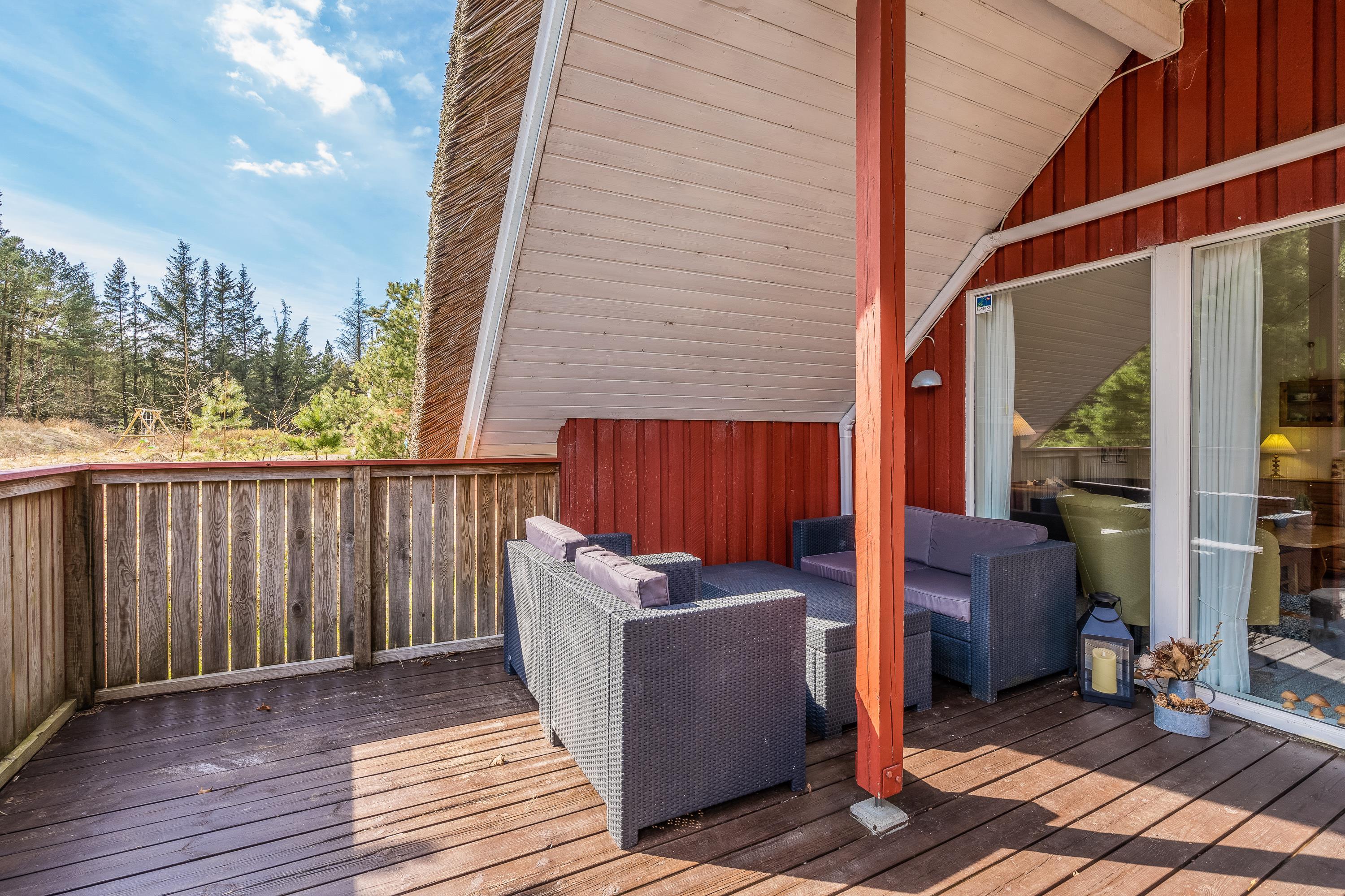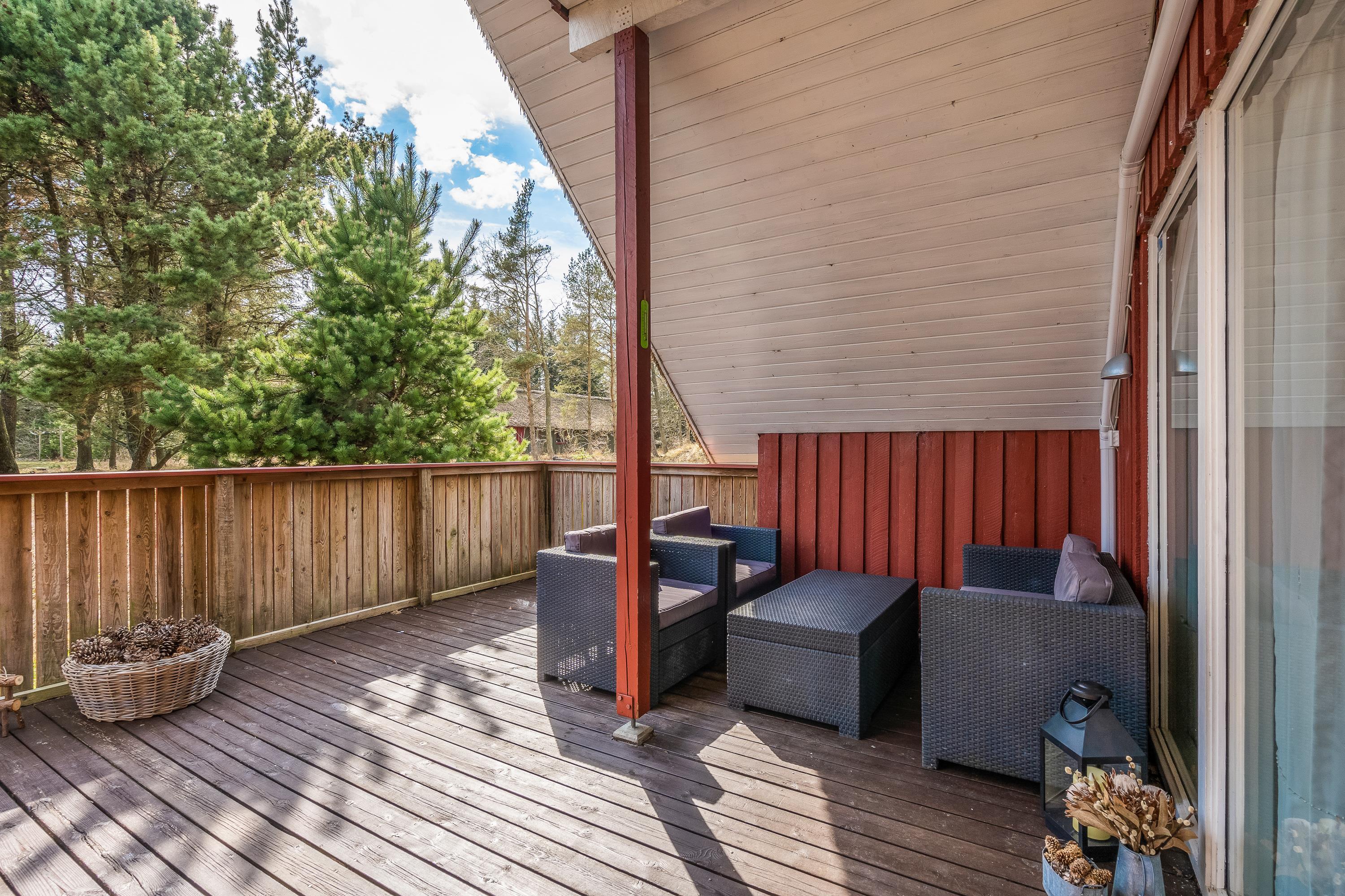 Fra stuen er der direkte udgange til husets lækre terrasser. Til den ene side er terrassen delvist overdækket og afskærmet, så man her kan hygge sig næsten hele året. Skal der tankes sol på liggestolene så er det store åbne terrassedæk stedet, her sidder I også dejligt privat, når der skal hygges med grillmad.