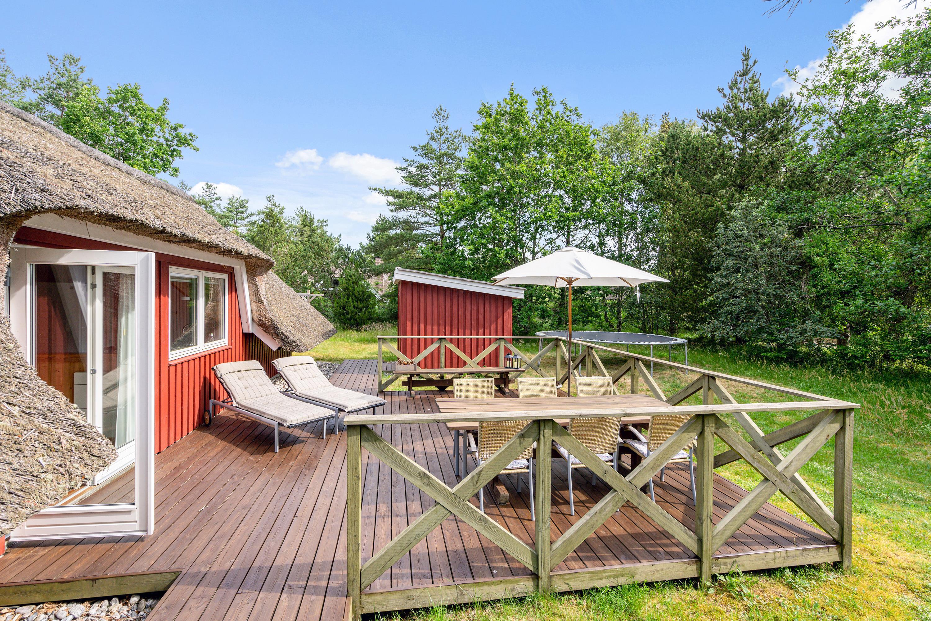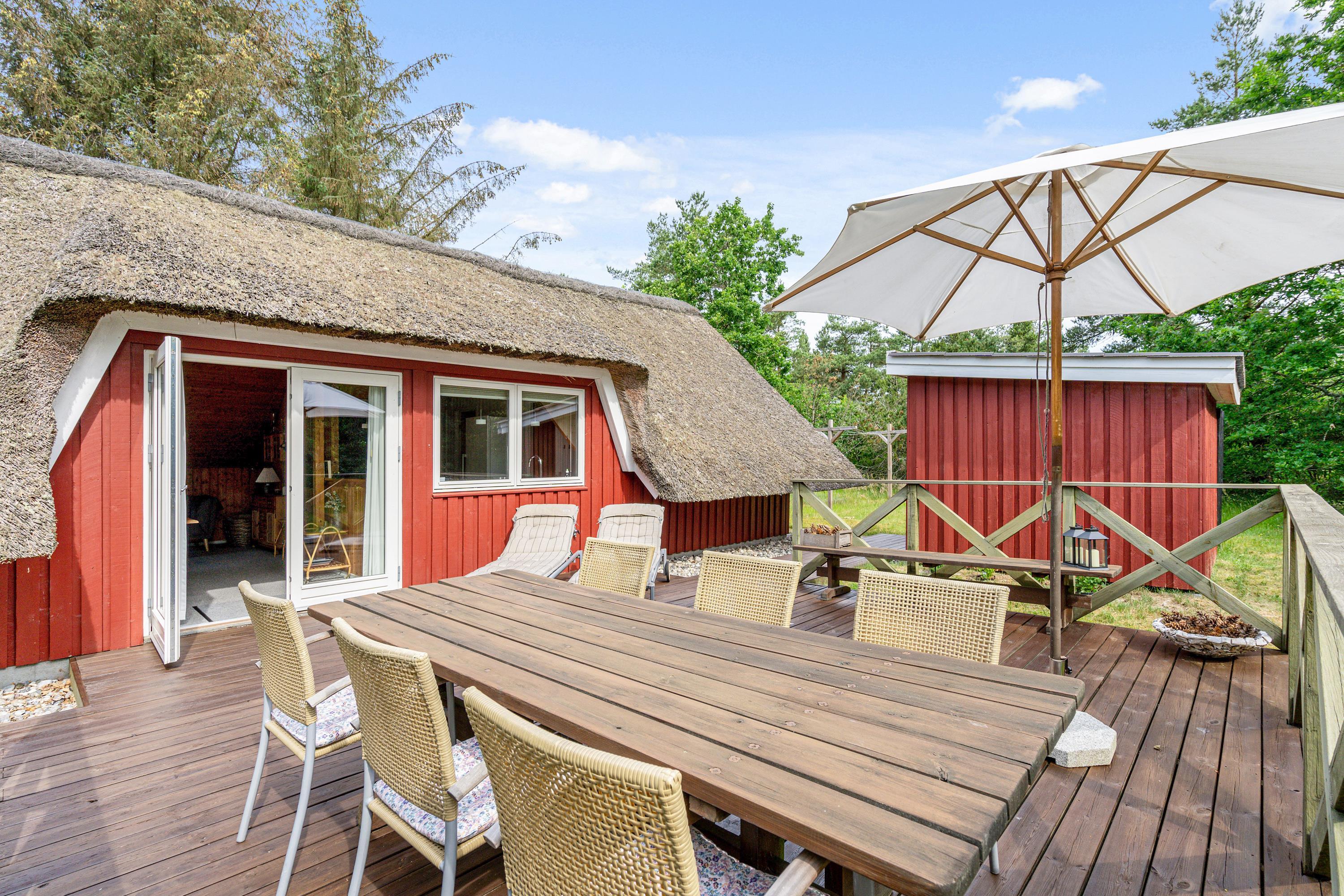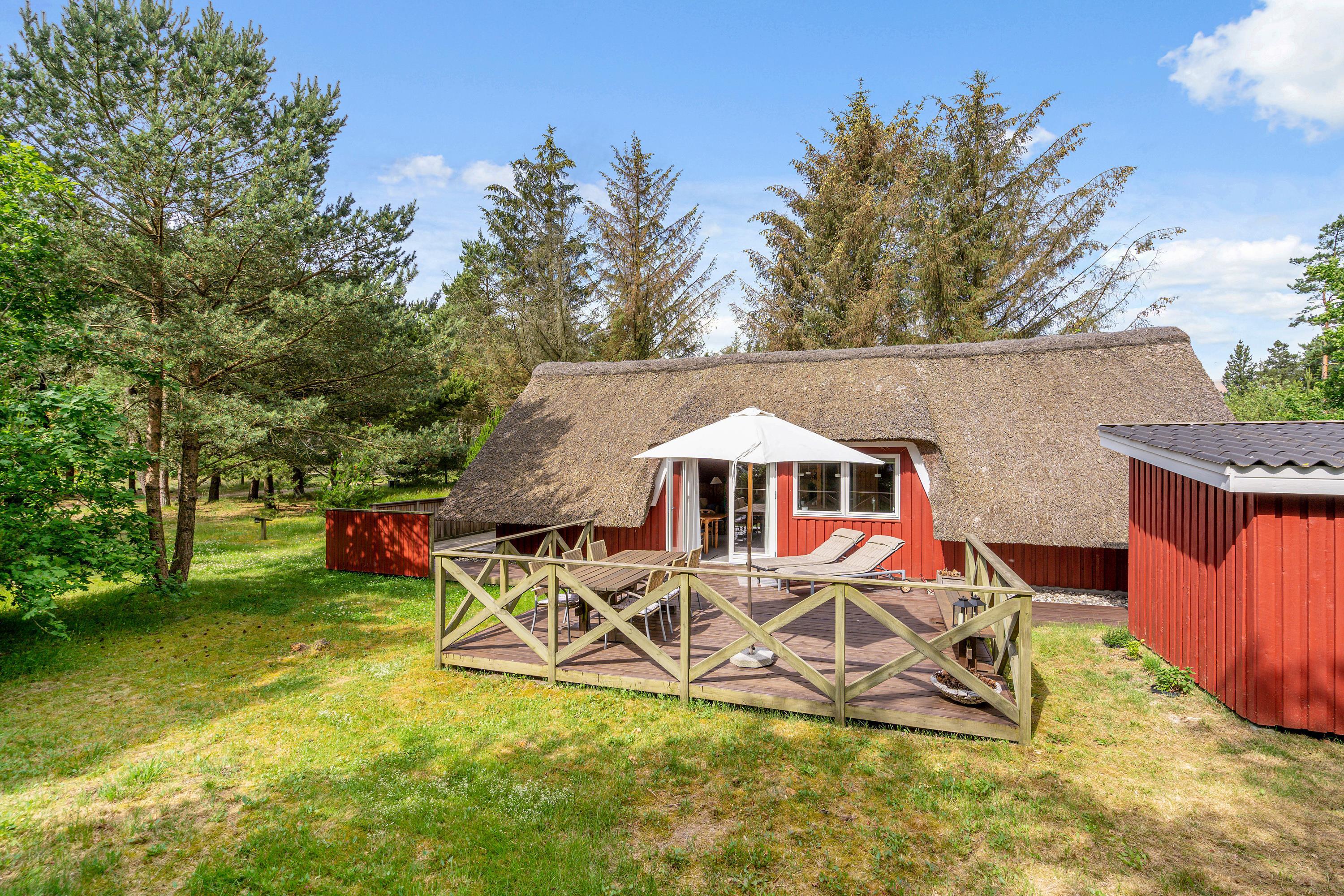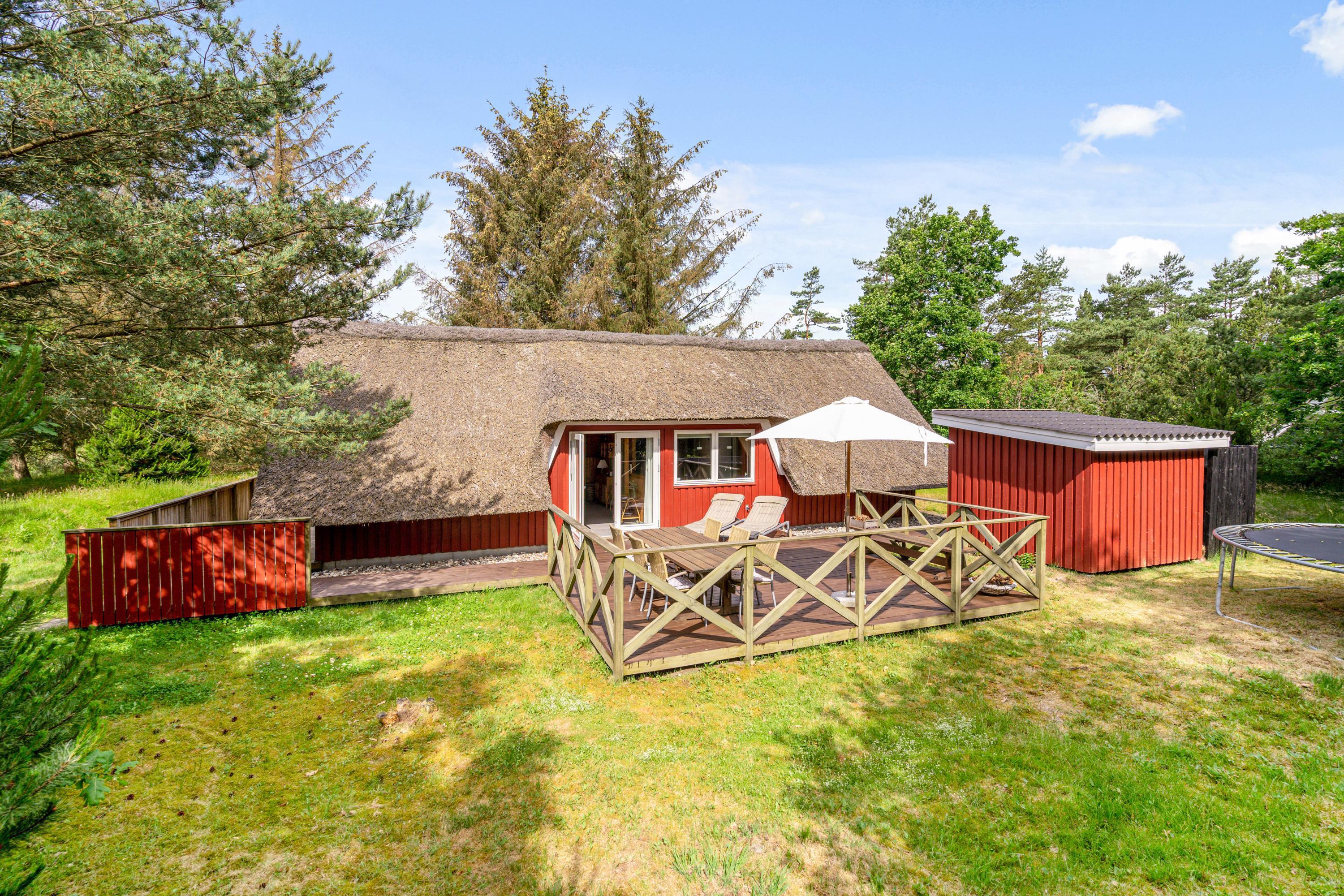 Ægte sommerhusstemning ”i skovens dybe stille ro”. Beliggende på en dejlig naturgrund med læ- og lygivende træer er dette super hyggelige feriehus perfekt til jer, der vil slappe af i naturskønne omgivelser. Det lille fine stråtækte hus med plads til 4 har skønne terrasseforhold, udebruser, trampolin og indenfor et energivenligt varmesystem - og det er således perfekt til familiehygge både inde og ude.