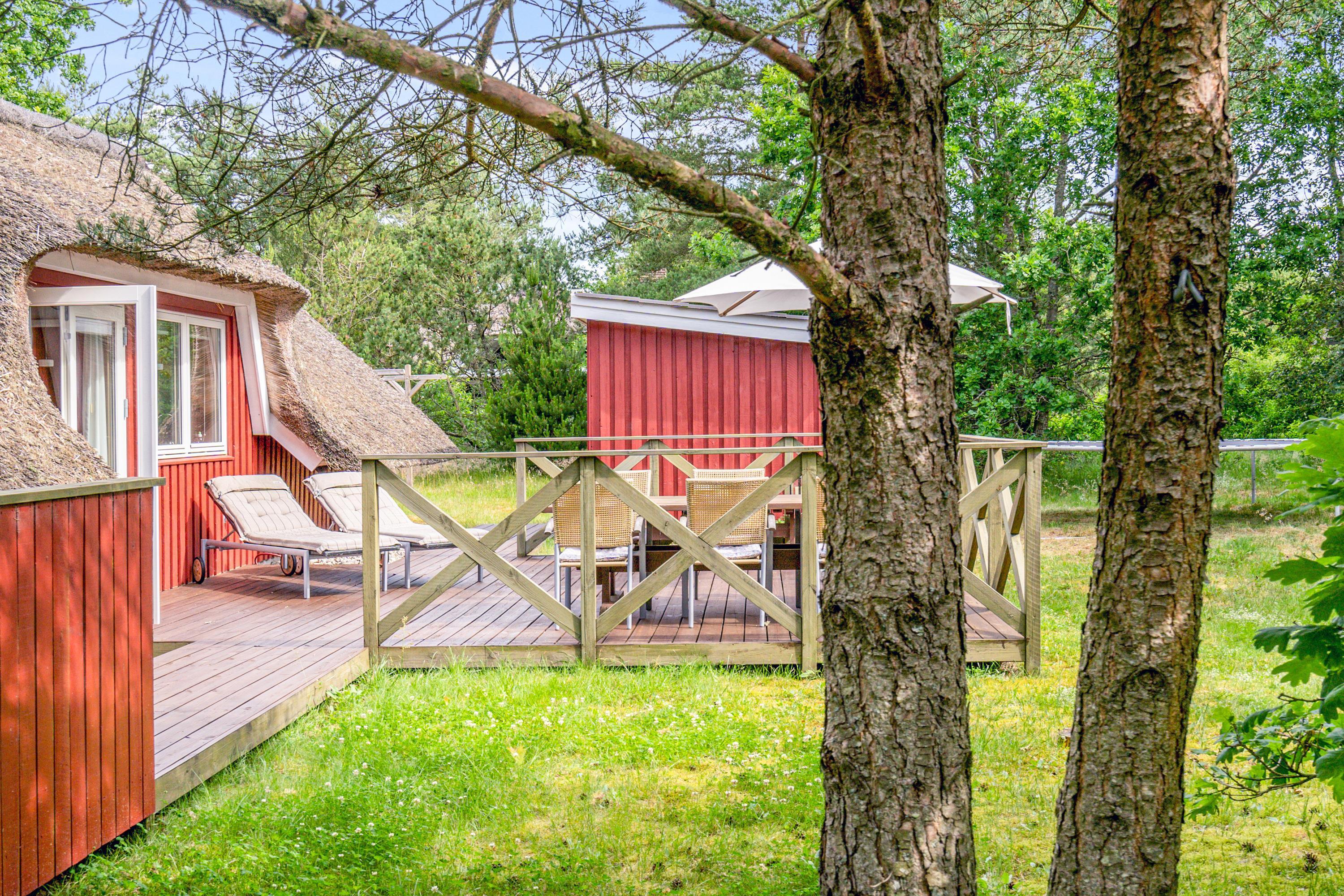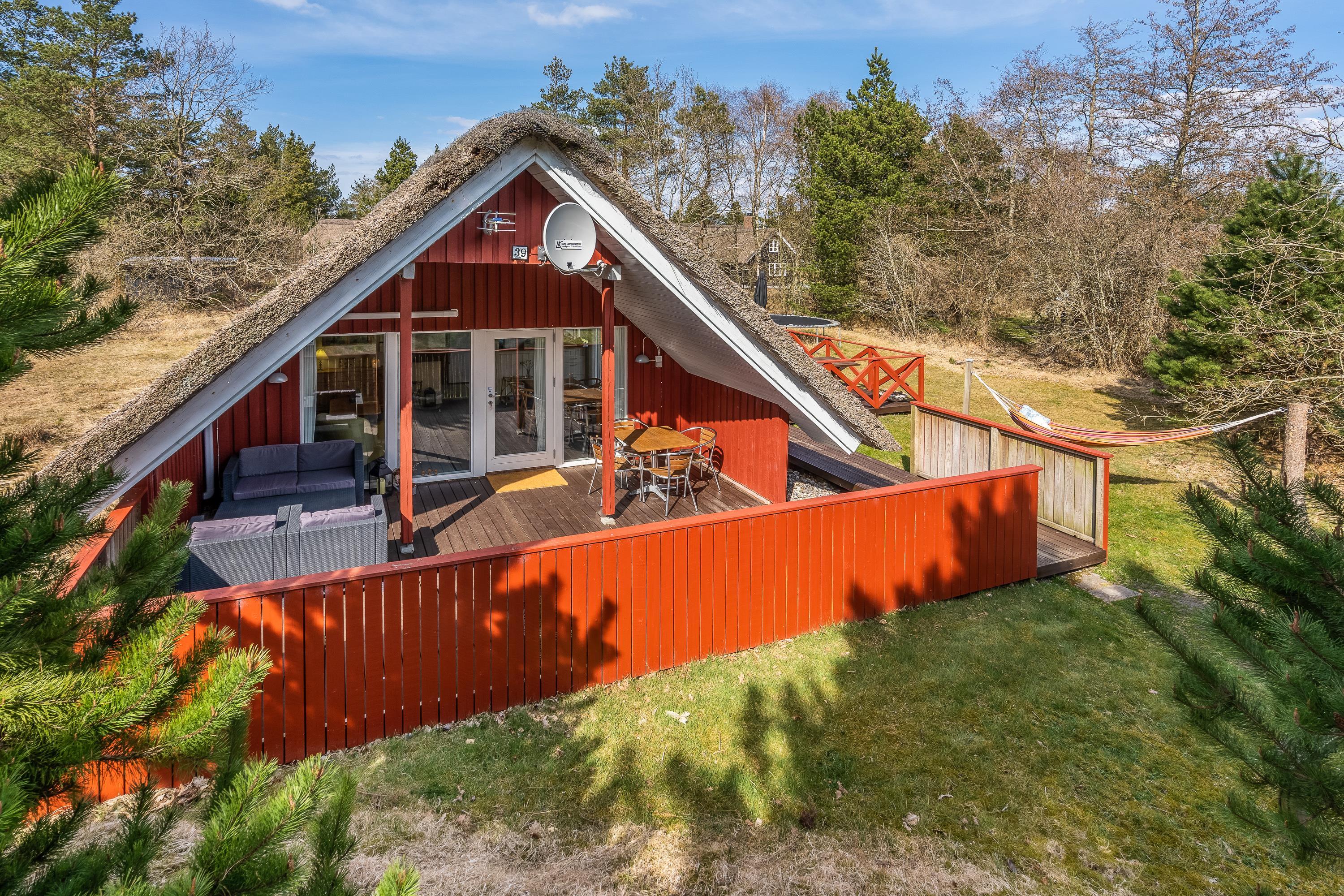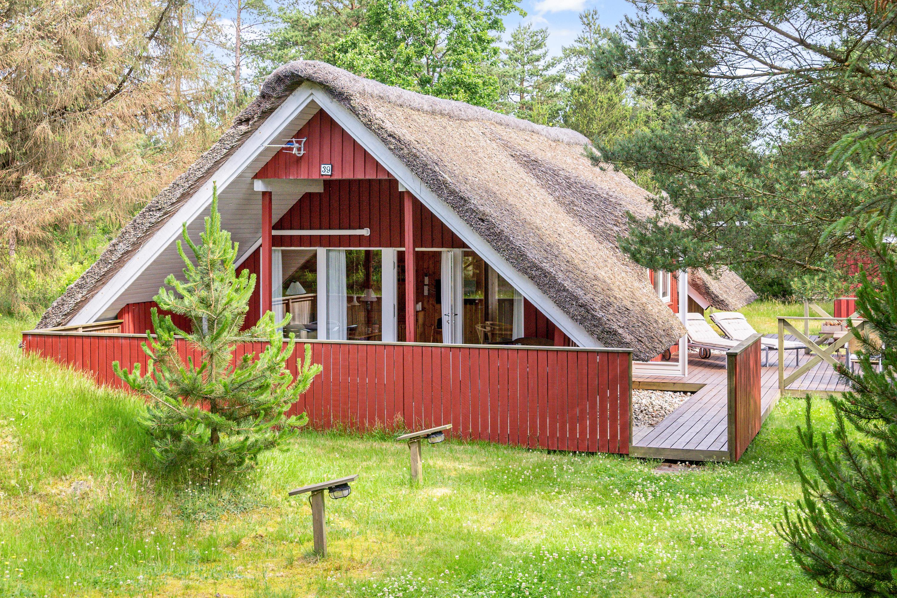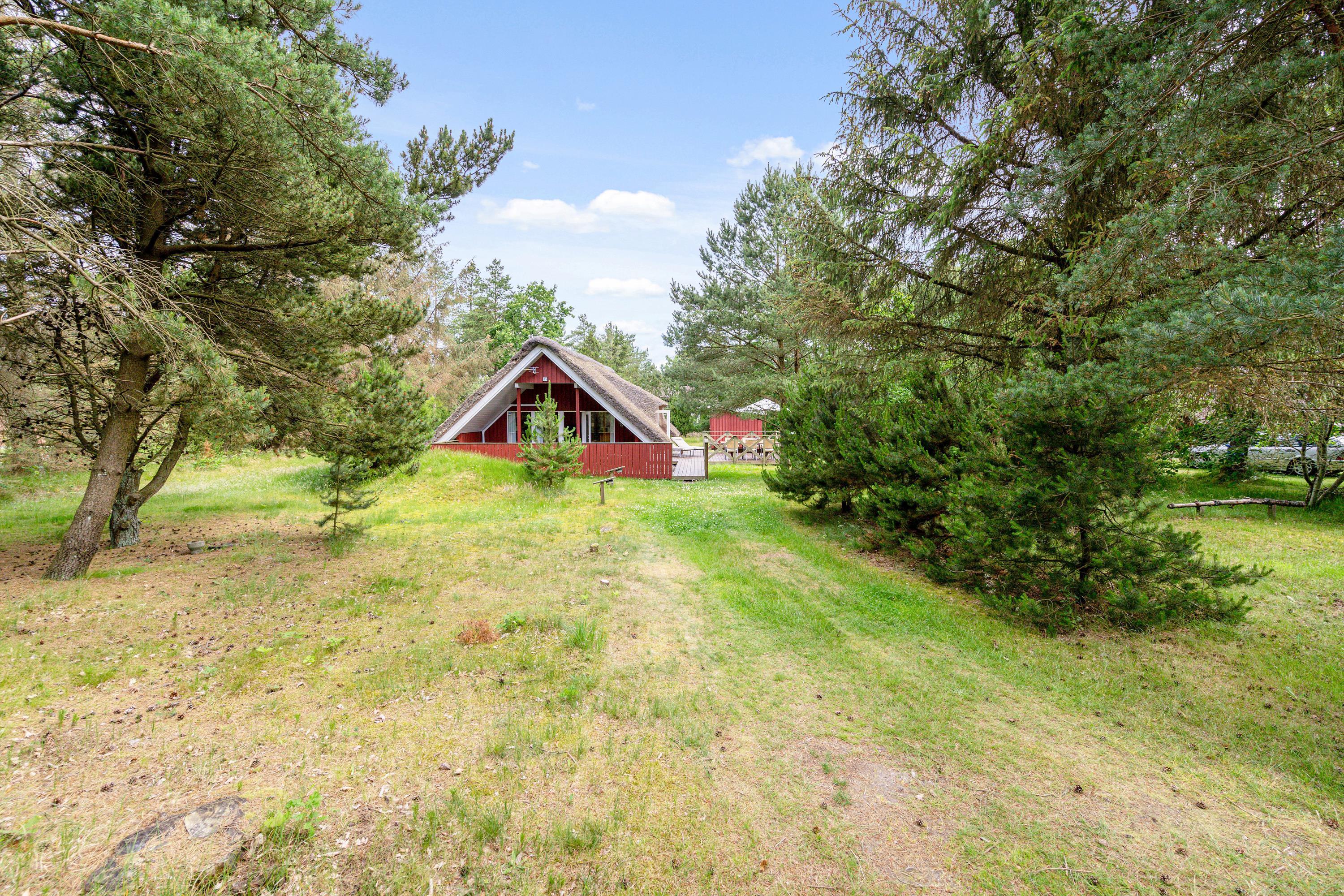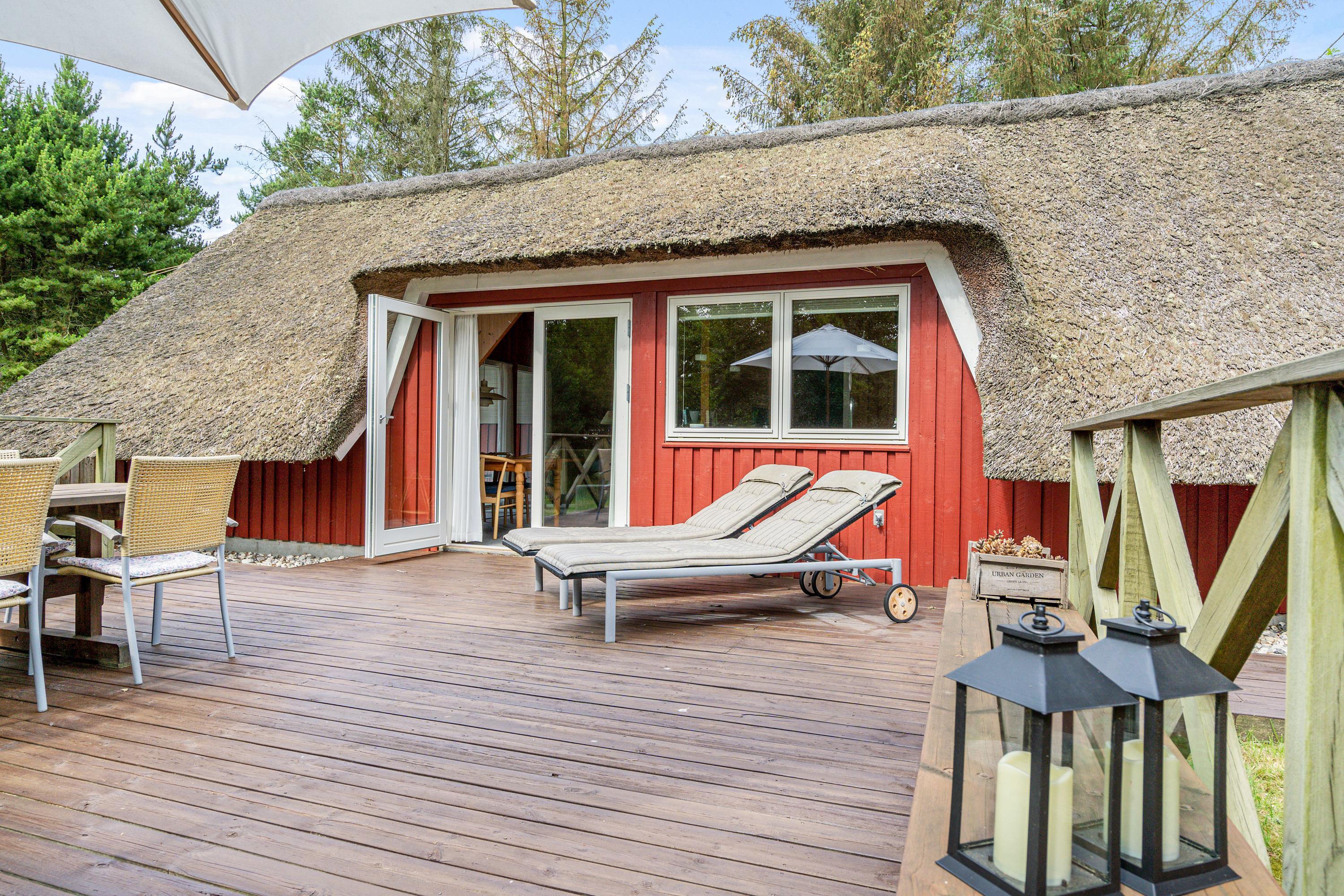 Ægte sommerhusstemning ”i skovens dybe stille ro”. Beliggende på en dejlig naturgrund med læ- og lygivende træer er dette super hyggelige feriehus perfekt til jer, der vil slappe af i naturskønne omgivelser. Det lille fine stråtækte hus med plads til 4 har skønne terrasseforhold, udebruser, trampolin og indenfor et energivenligt varmesystem - og det er således perfekt til familiehygge både inde og ude.