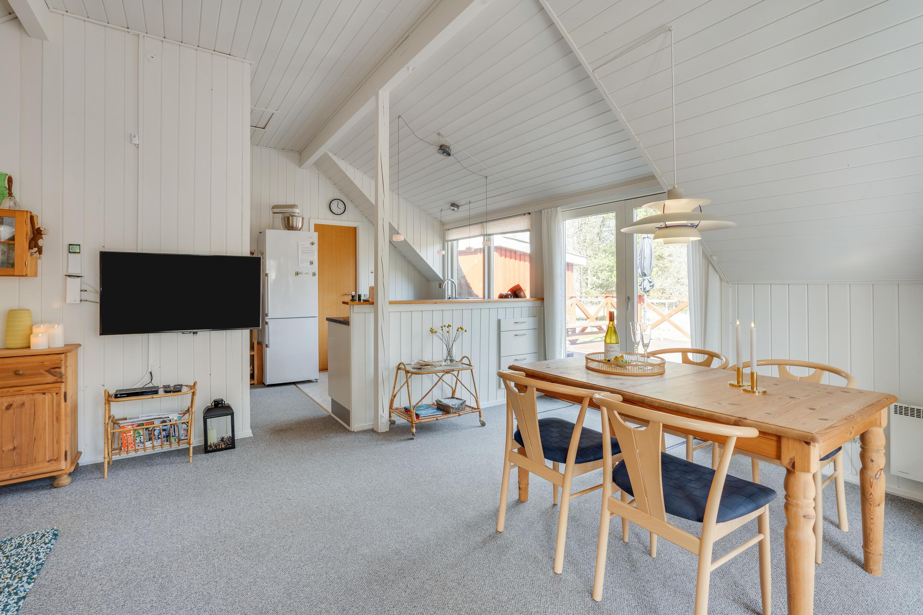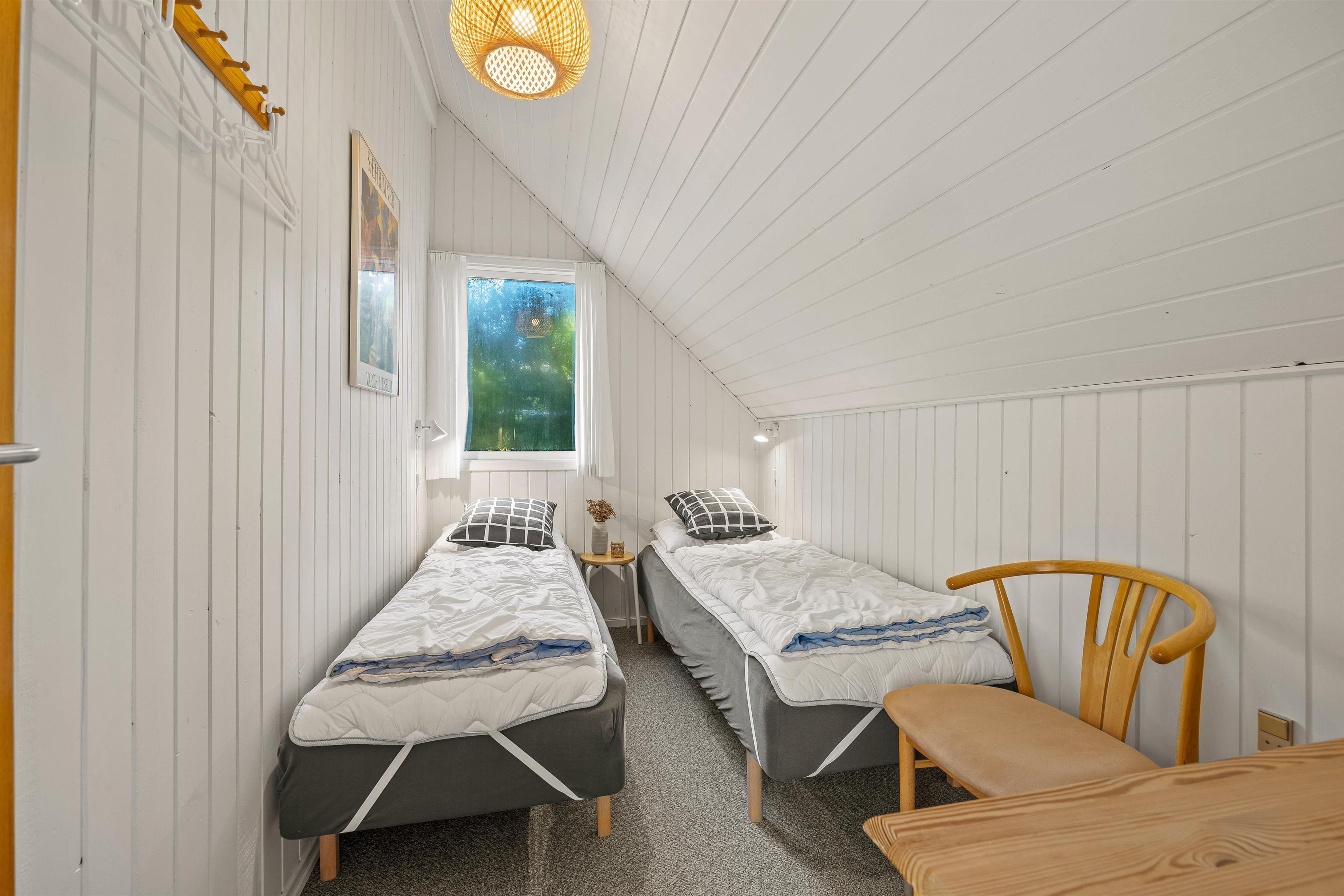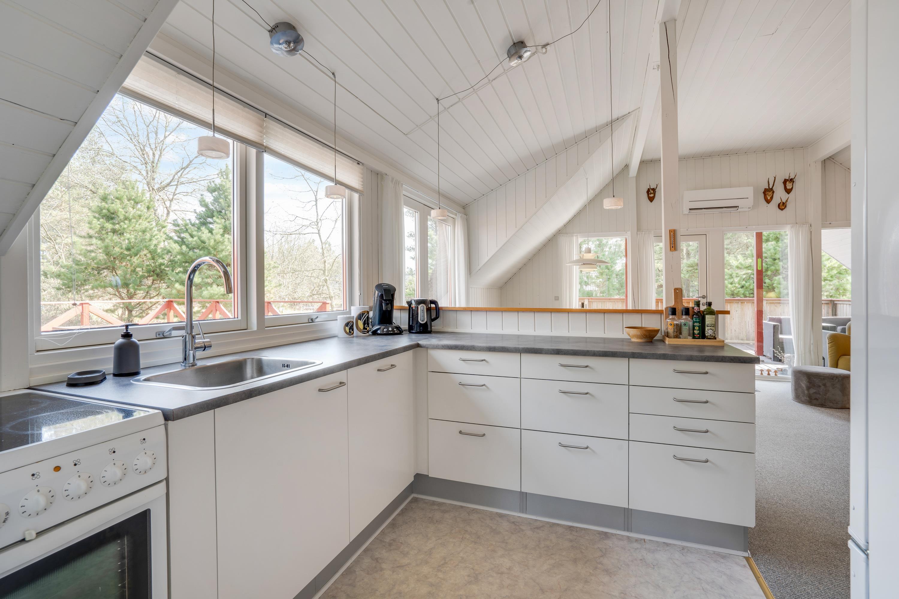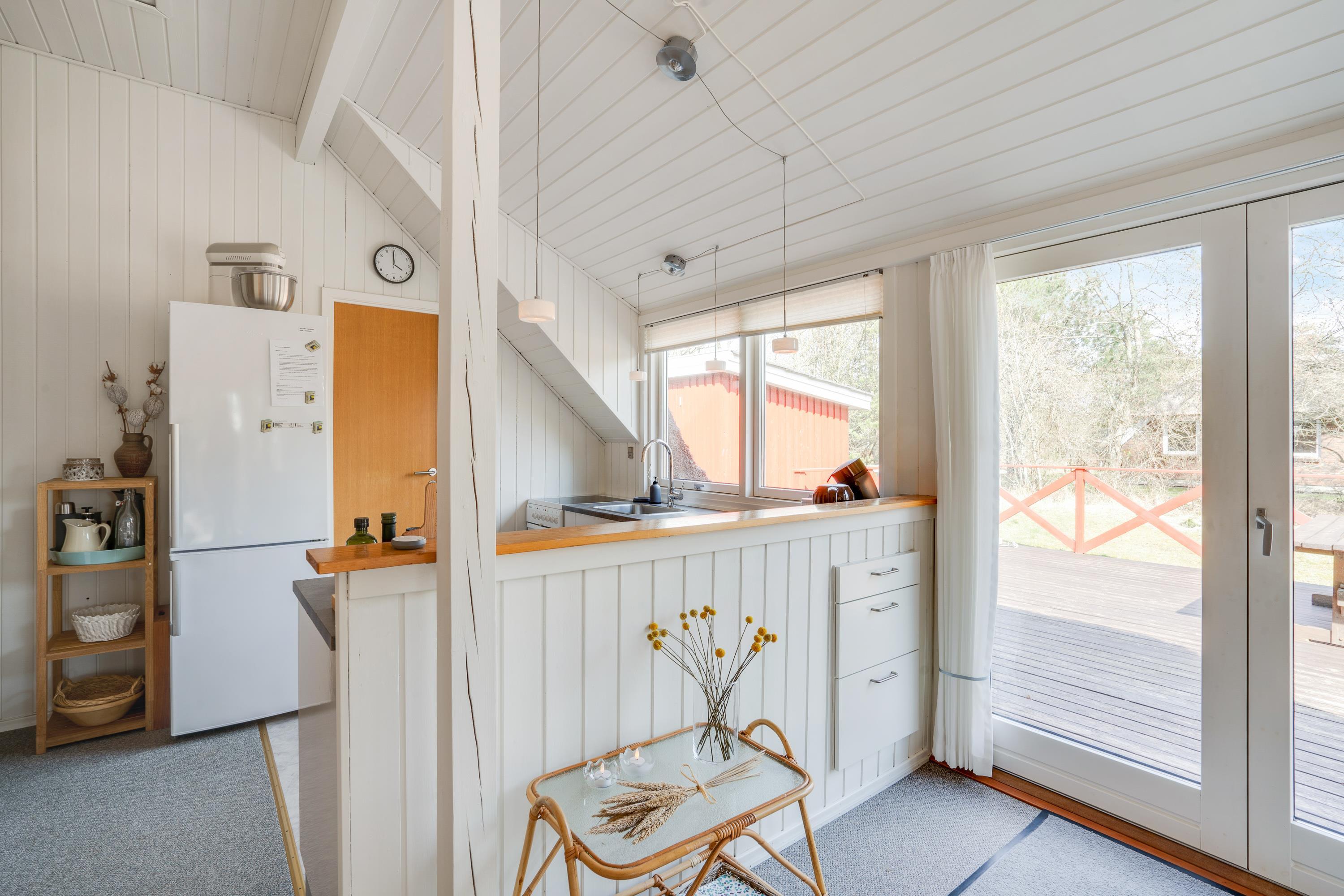 Rustikbrædder og et venligt hvidt køkken med opvaskemaskine formidler en dejlig hyggelig stemning i det lille røde hus. Her er alt, man har brug for til en afslapningsferie med den lille familie eller kæresten – 2 soverum, det ene med en 140ér dobbeltseng og det andet med 2 enkeltsenge, bad med brus og et dejligt opholdsrum, ed spisebord og sofahjørne. Fra køkkenet er der en dejlig udsigt over grunden, så man kan følge med i børnenes leg på trampolinen eller græsplænen.