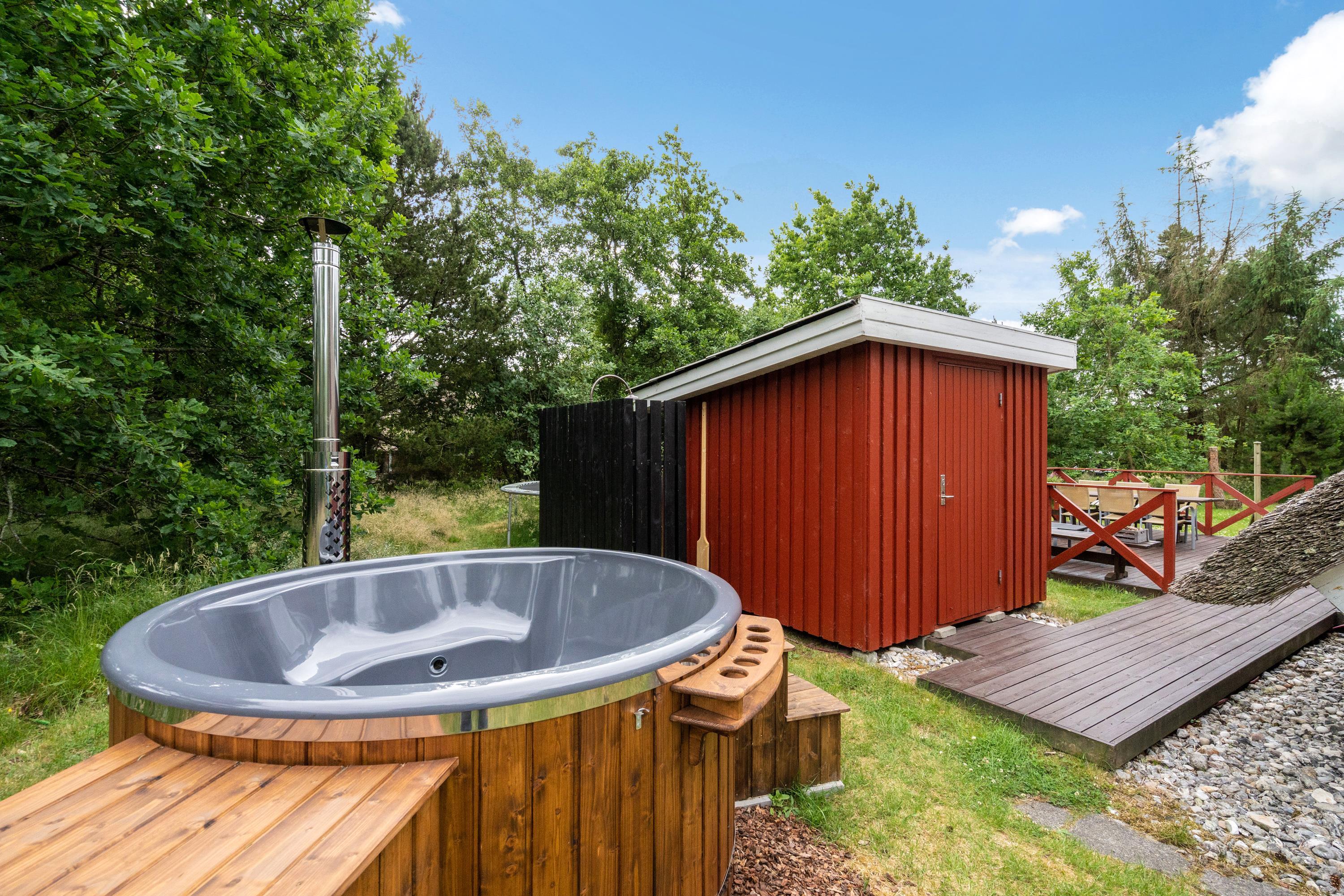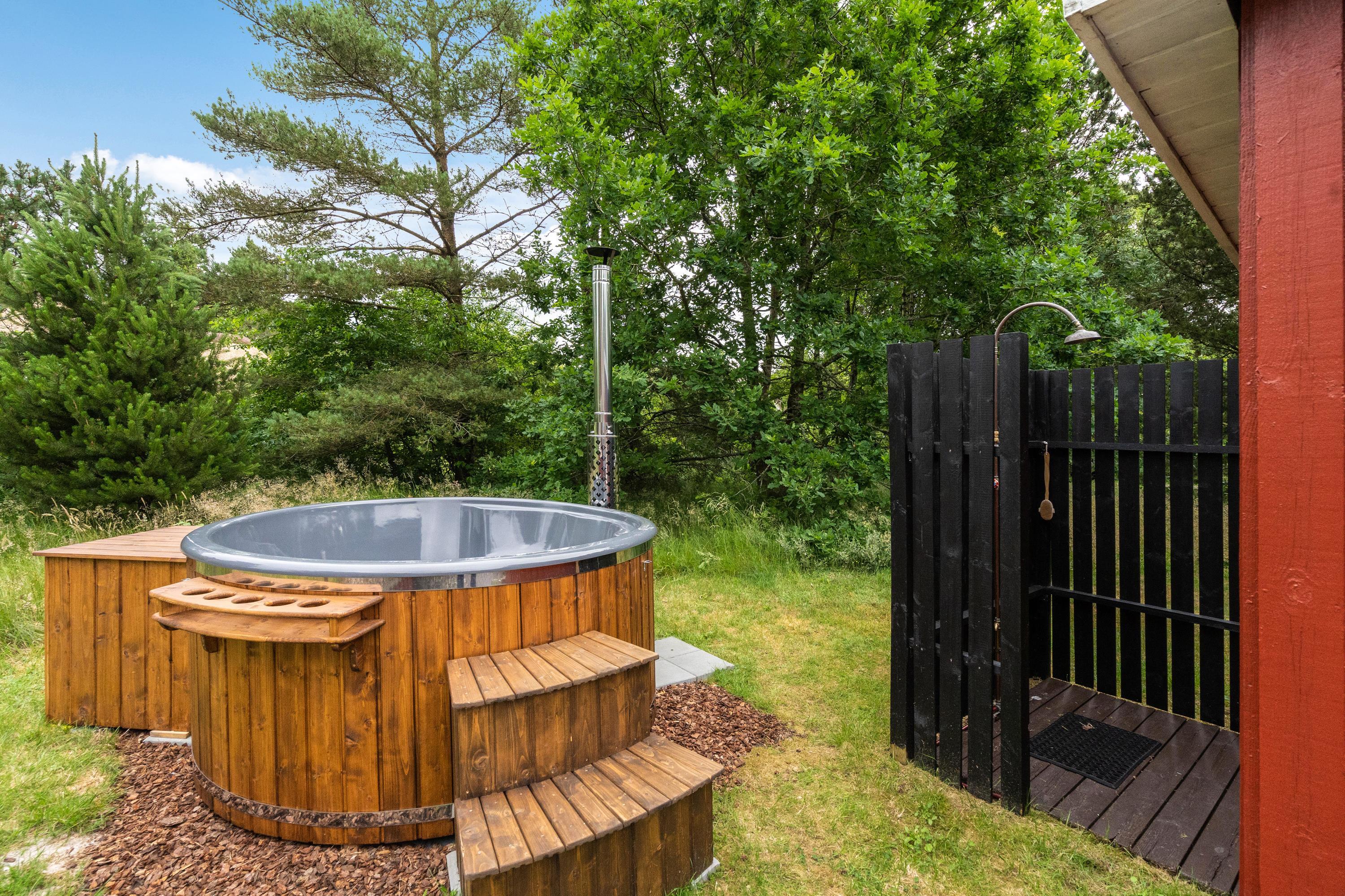 For ekstra luksus og hygge kan I tænde op i husets vildmarksbad, hurtigt et smut under udebruseren og så op i karret. Det er vildt hyggeligt således at sidde mellem træerne og ligegyldigt vejrudsigten bare nyde at slappe af i det dejligt varme vand.