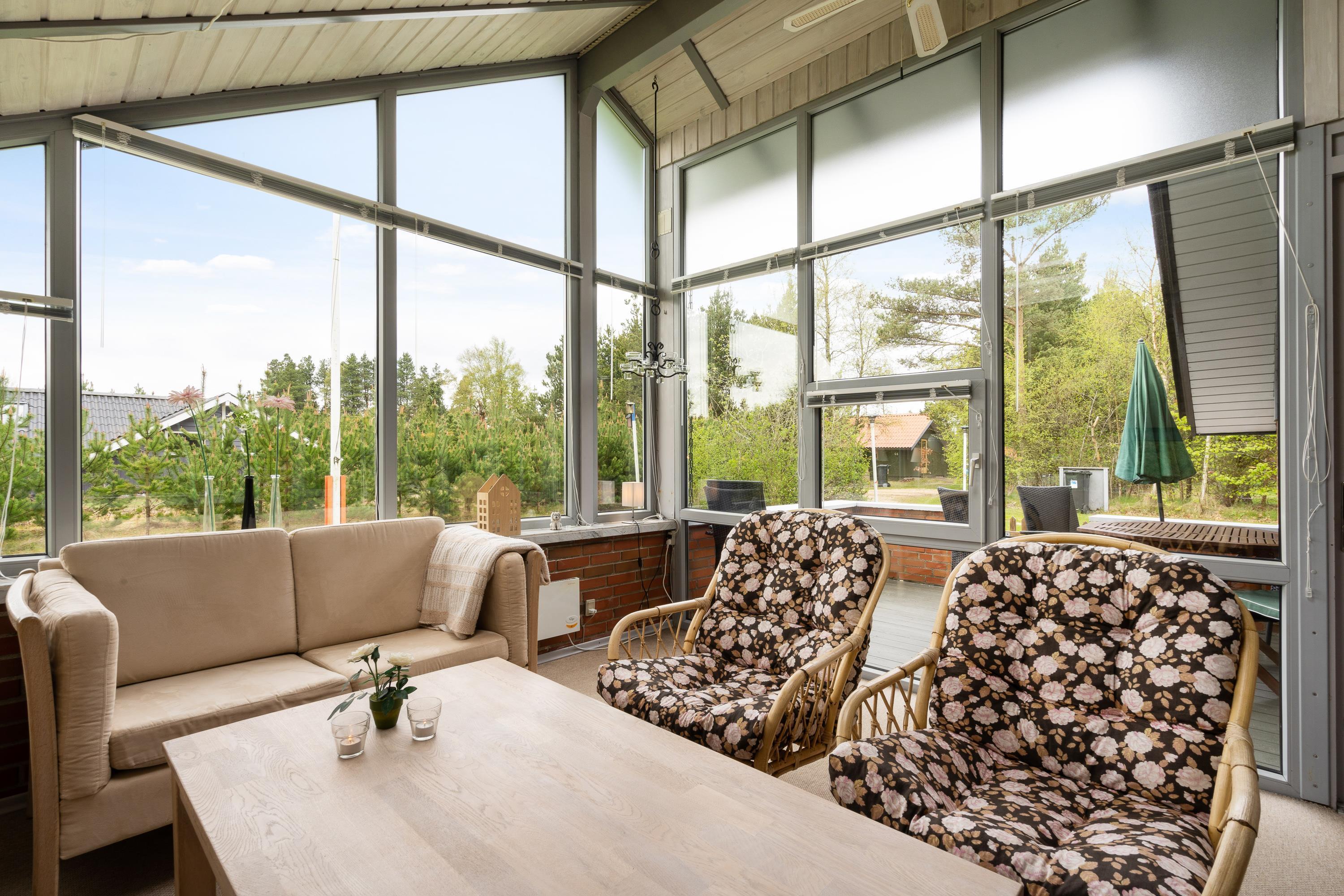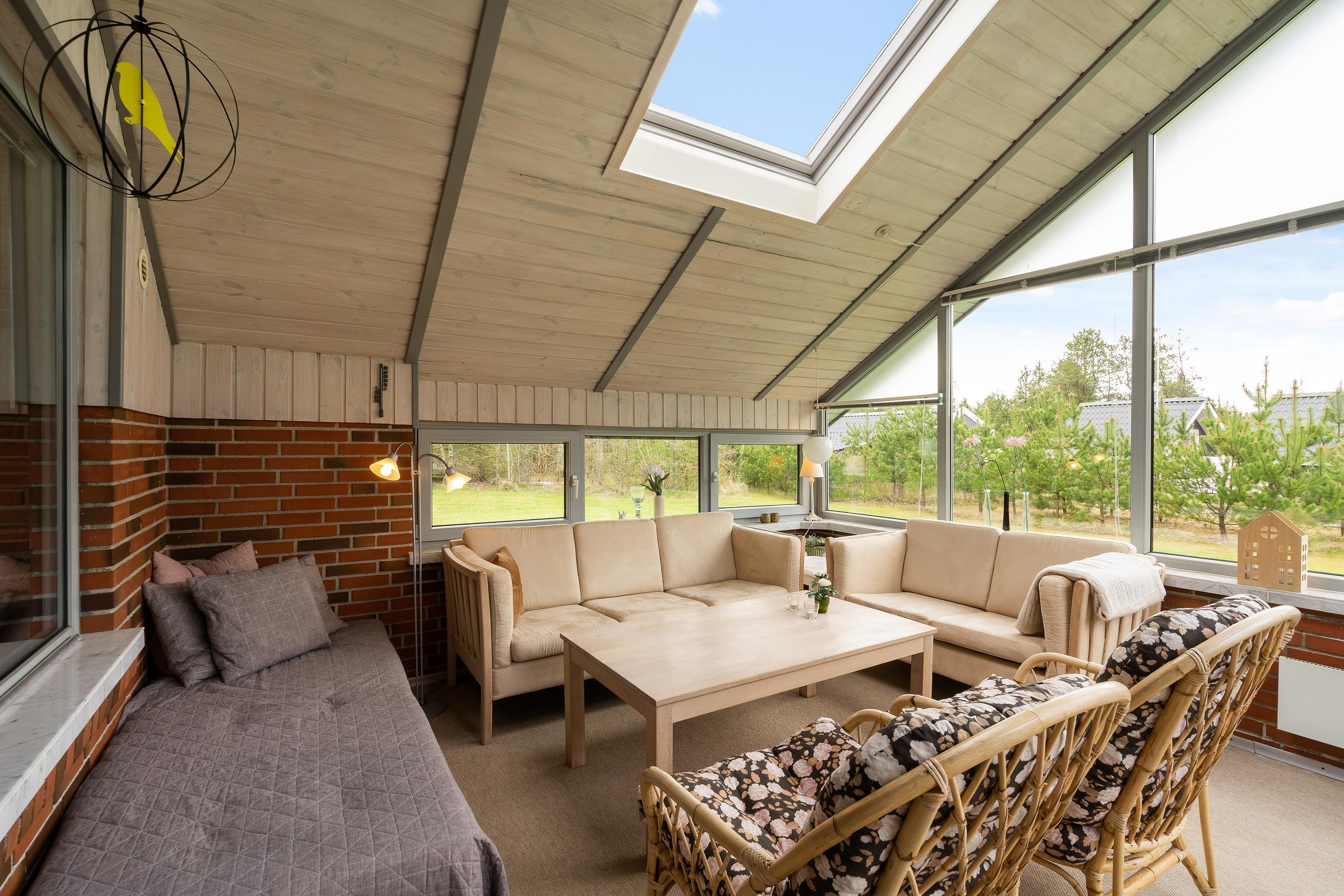 Fra stuen kommer I ind i et af feriehusets highlights, udestuen. Gennem de store vinduer har I frit udsyn til Houstrups grønne natur, og der findes næppe noget mere afslappende end at nyde en varm kop kaffe, mens regnen trommer på ruderne.