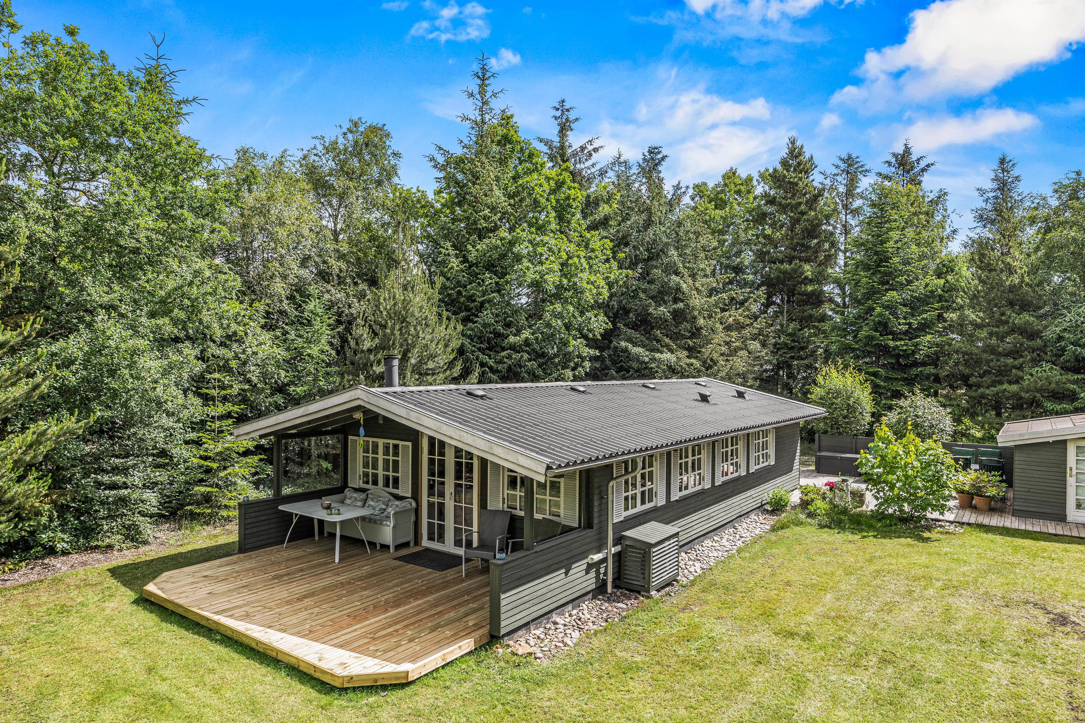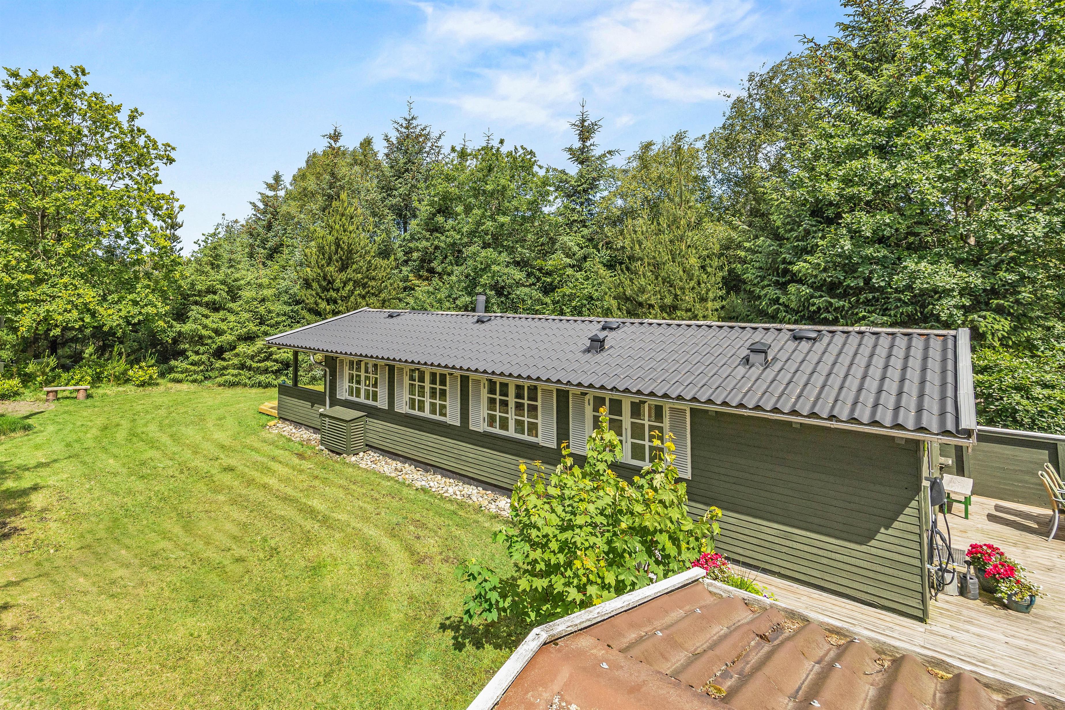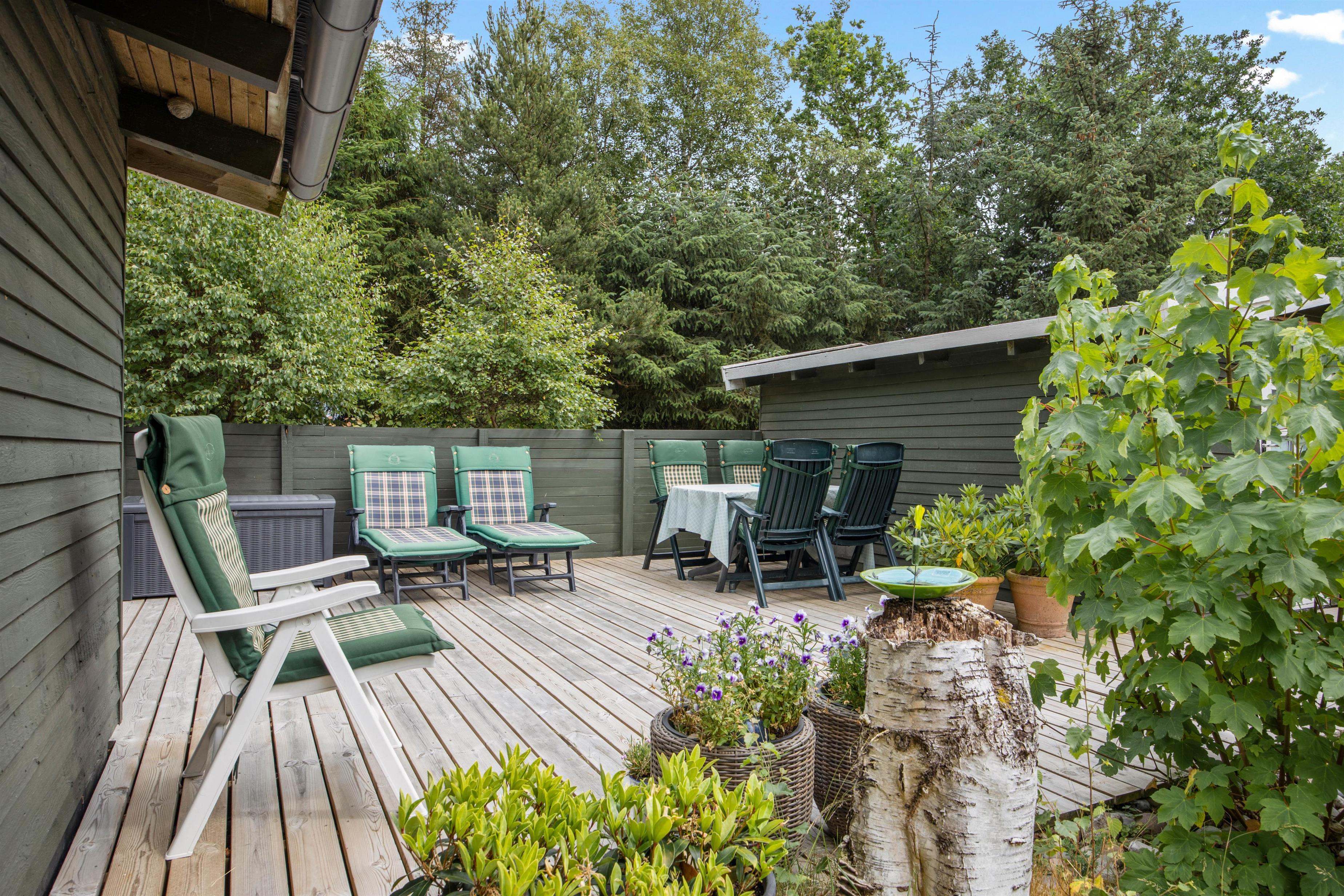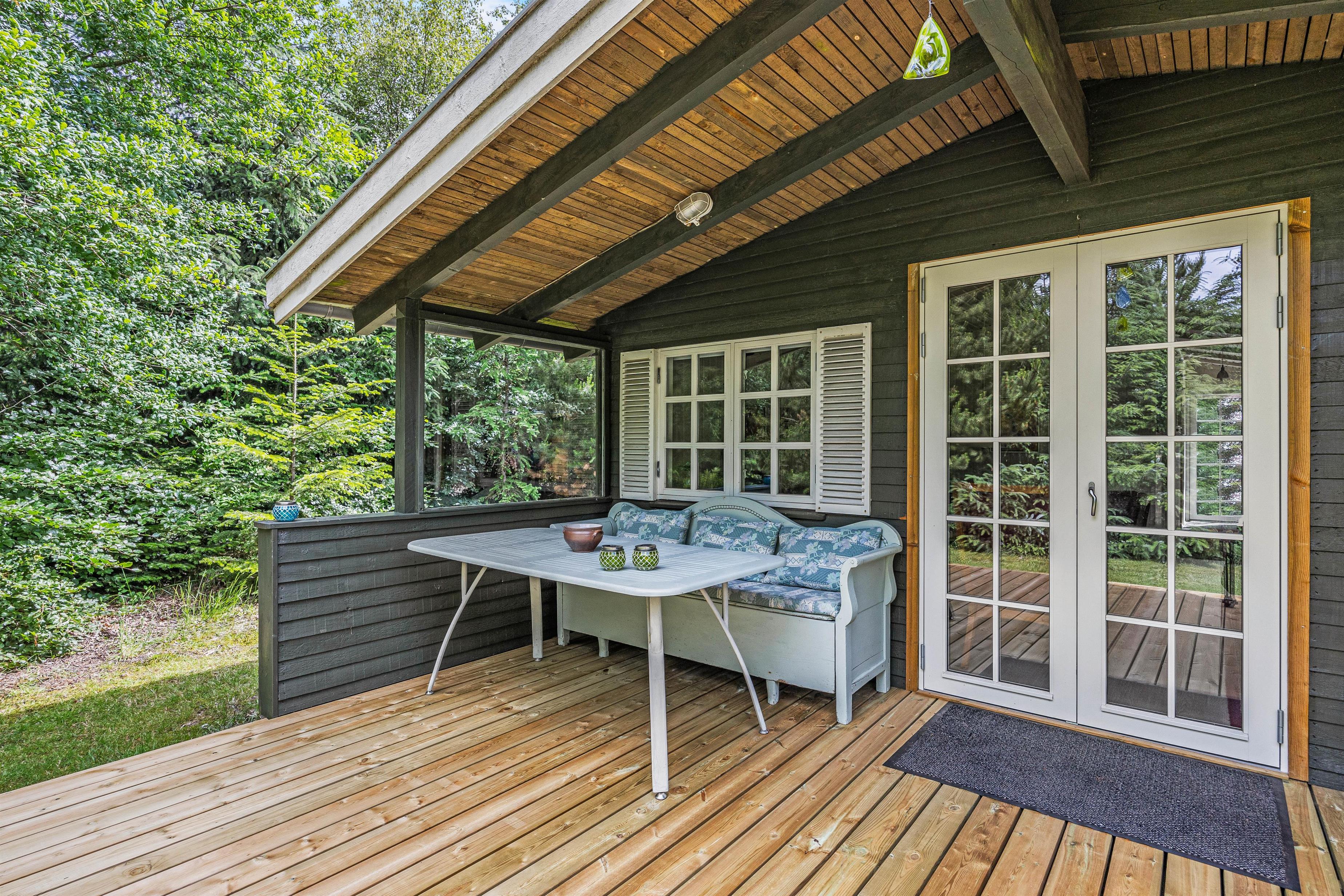 Sommerhuset er placeret på en 1850m2 stor grund, der både har plæne, men også områder, hvor græsset får lov at vokse. Den skønne terrasse er overdækket, så I kan sidde ude, selvom det skulle dryppe lidt. Den er samtidig afskærmet på flere sider, mens siden ud mod haven er åben, så I kan slappe af i de komfortable havemøbler, mens grillen varmer op og I nyder udsigten og hvem ved, måske kommer der et egern, en hare eller en hjort forbi.