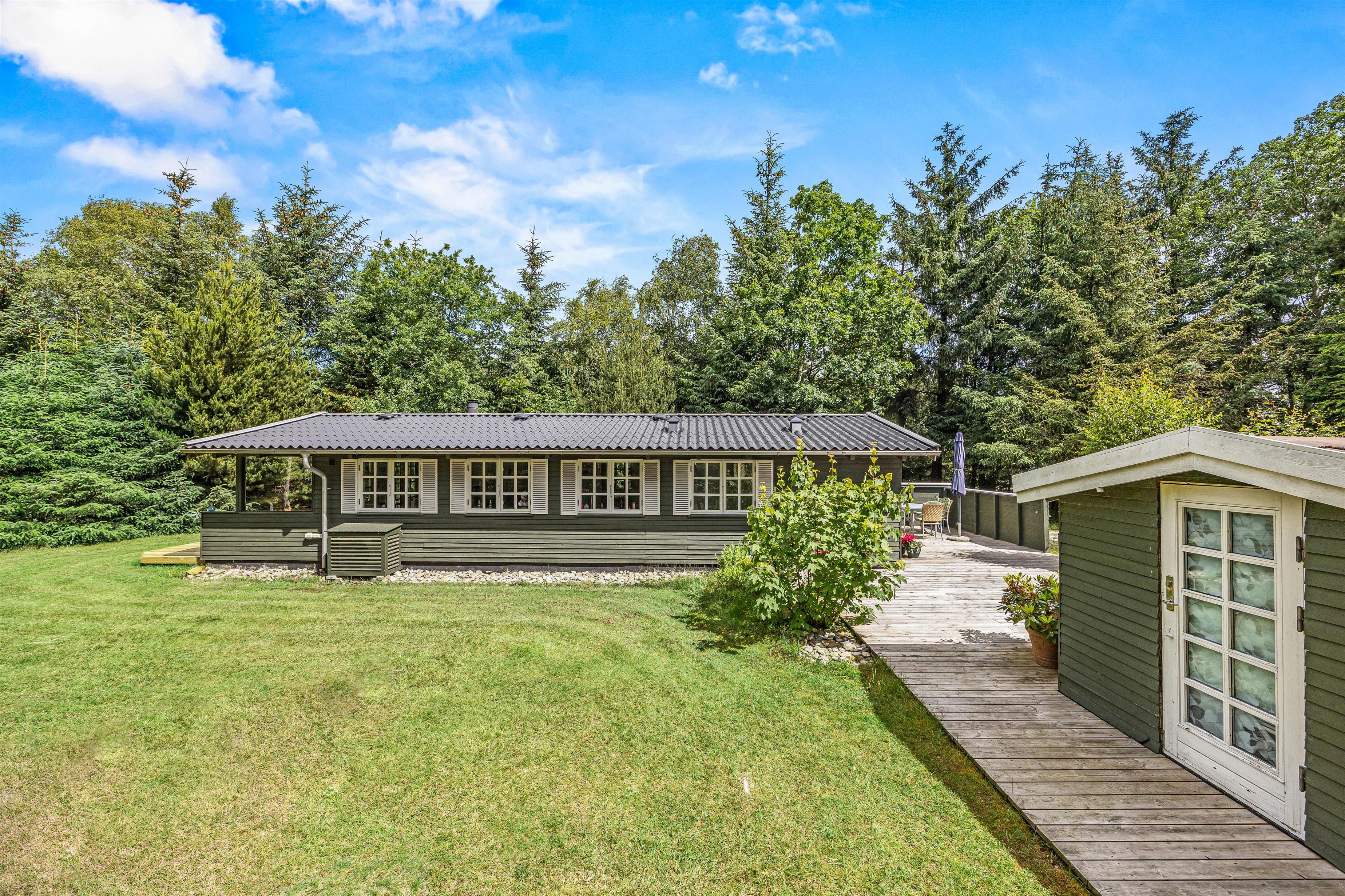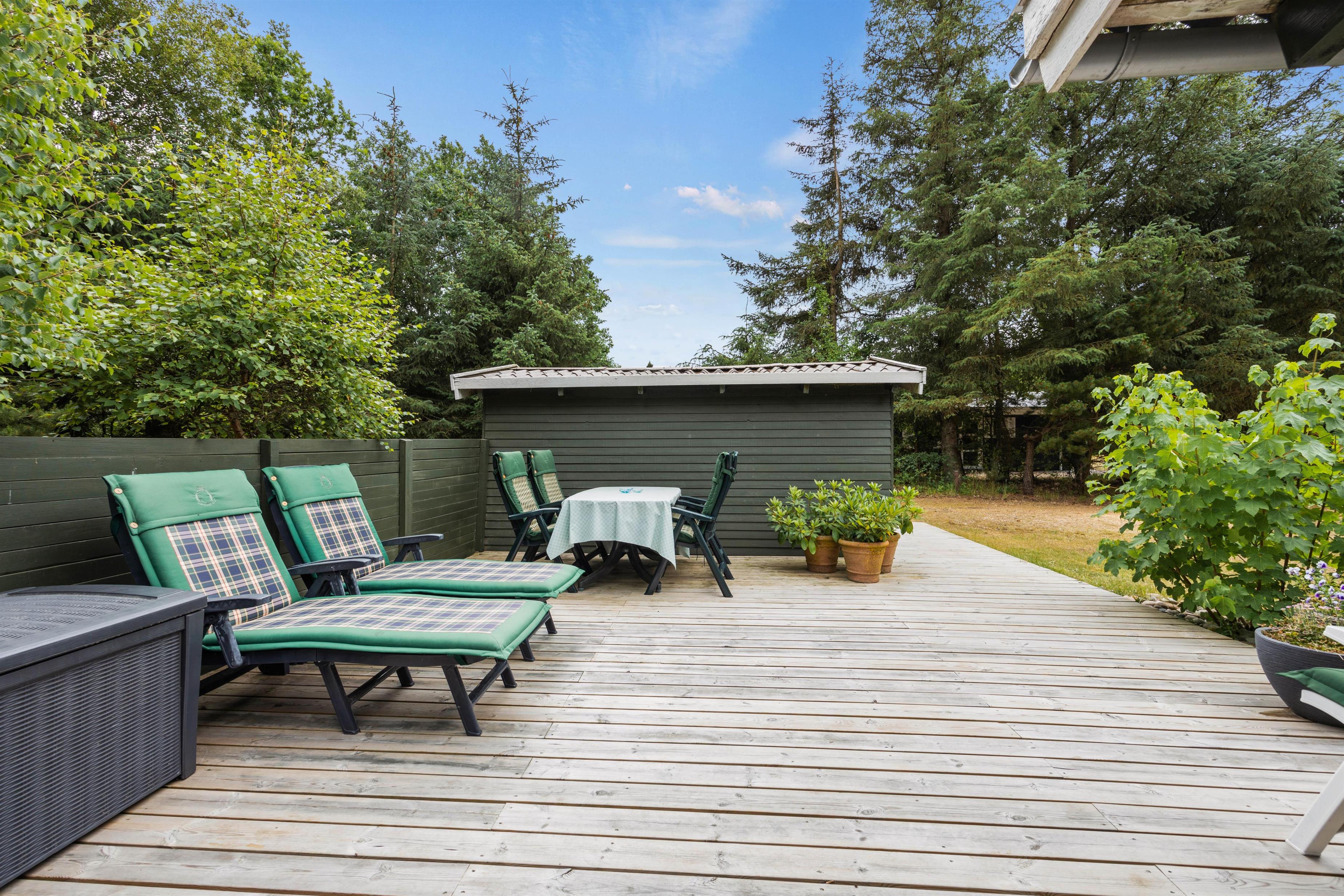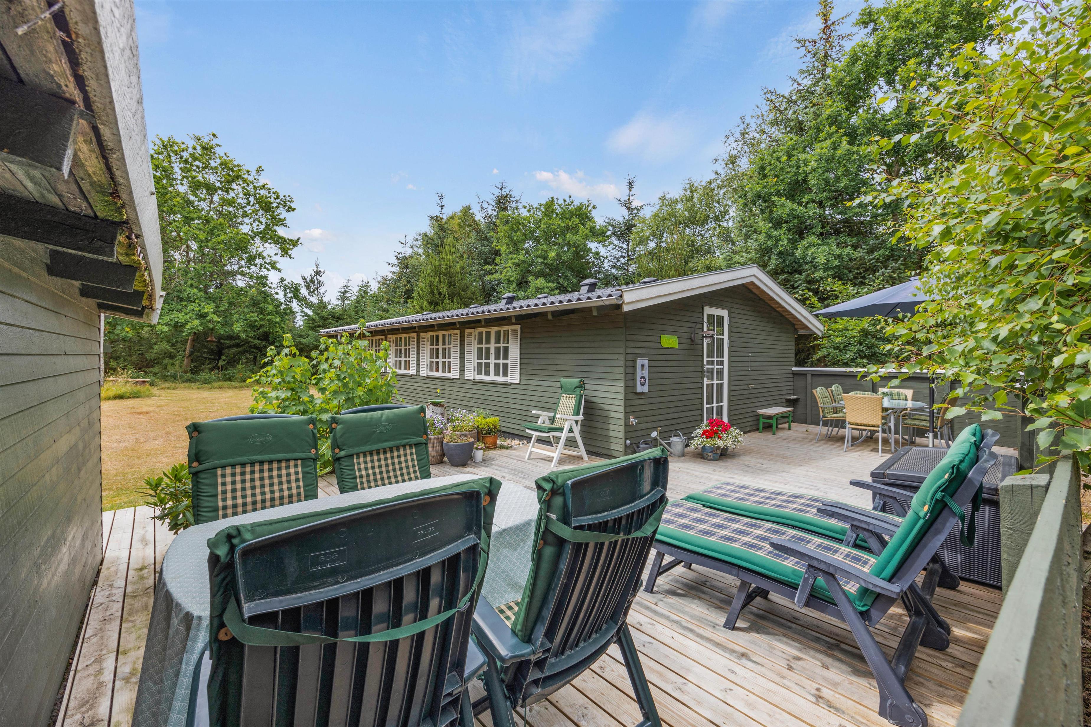 Sommerhuset er placeret på en 1850m2 stor grund, der både har plæne, men også områder, hvor græsset får lov at vokse. Den skønne terrasse er overdækket, så I kan sidde ude, selvom det skulle dryppe lidt. Den er samtidig afskærmet på flere sider, mens siden ud mod haven er åben, så I kan slappe af i de komfortable havemøbler, mens grillen varmer op og I nyder udsigten og hvem ved, måske kommer der et egern, en hare eller en hjort forbi.