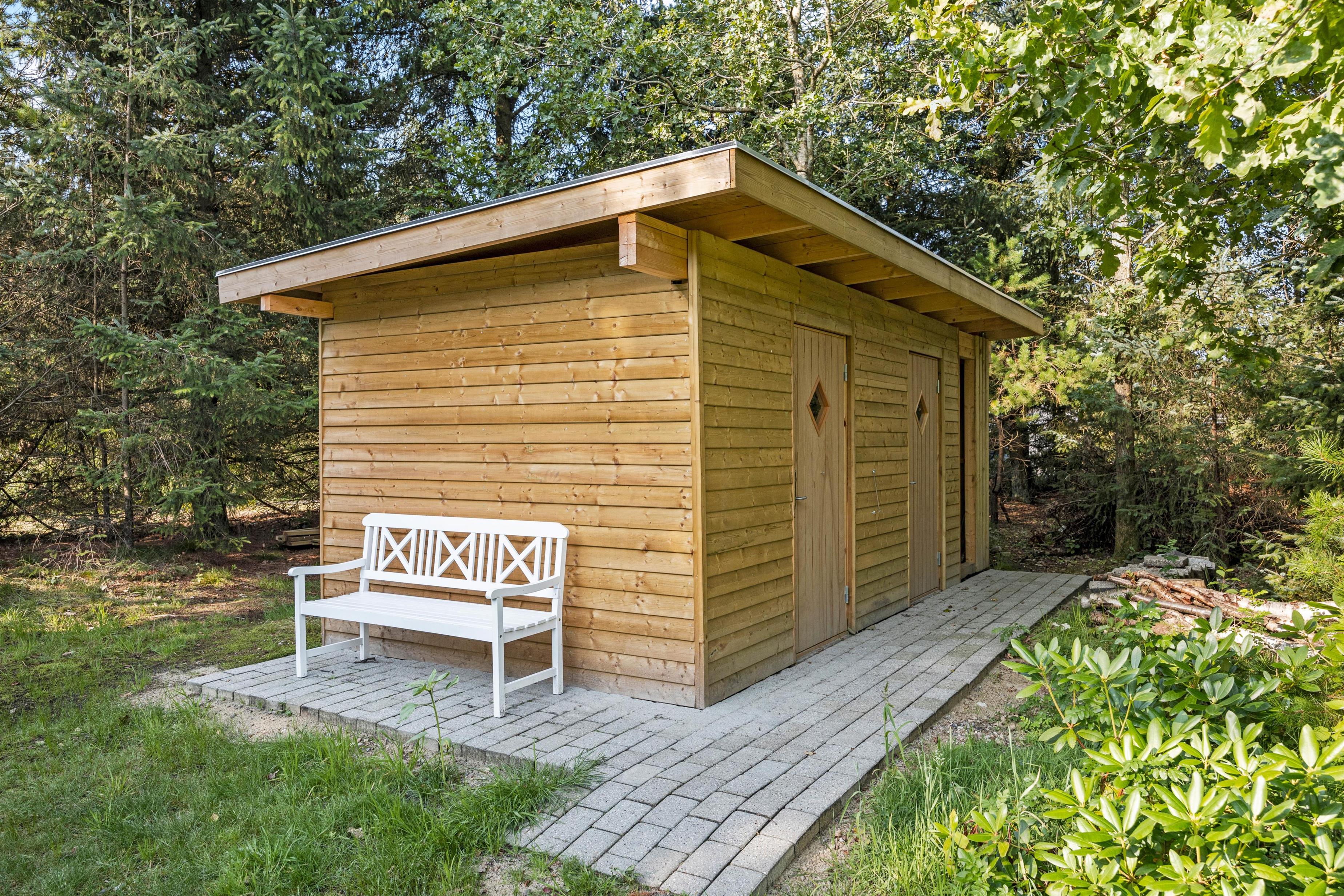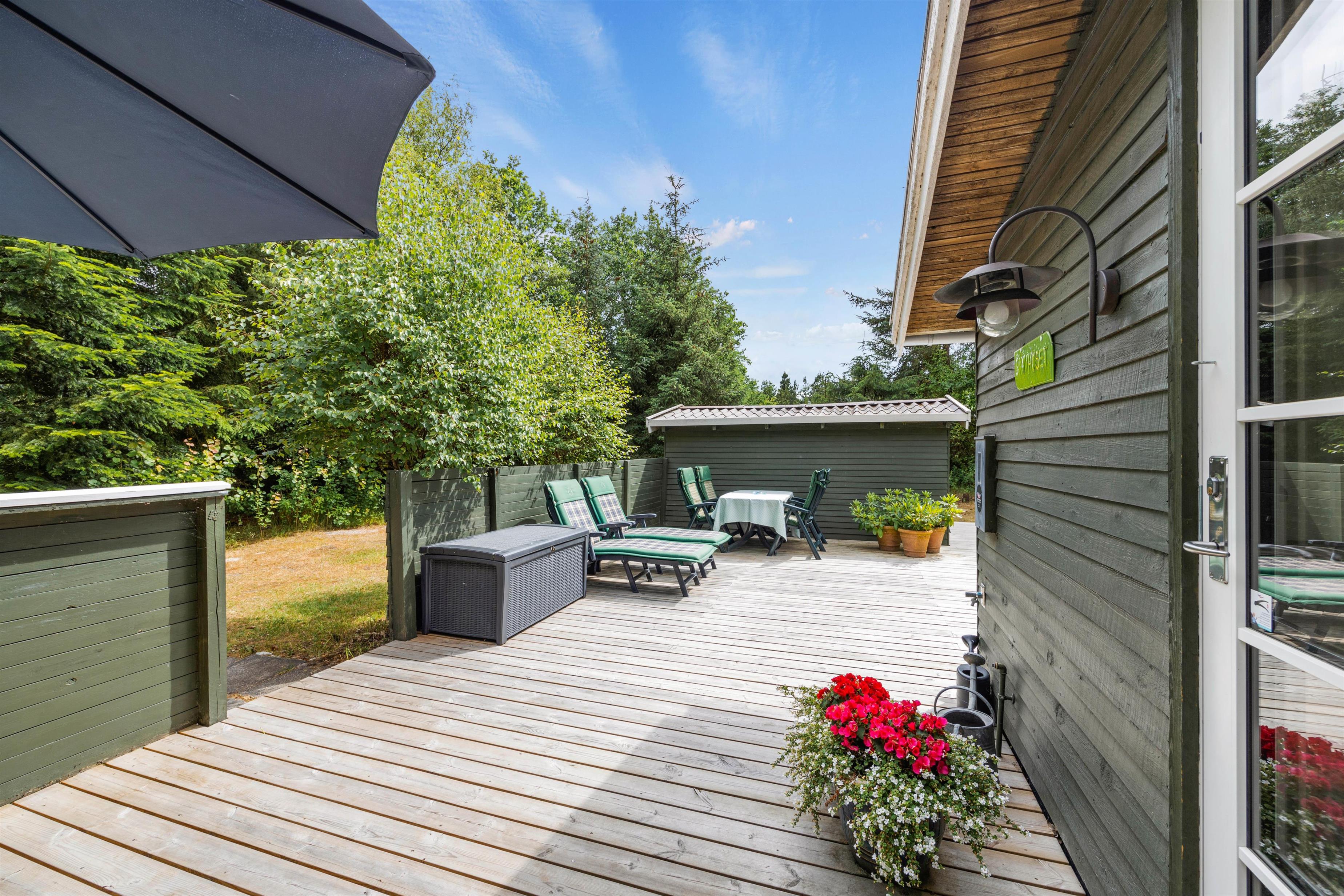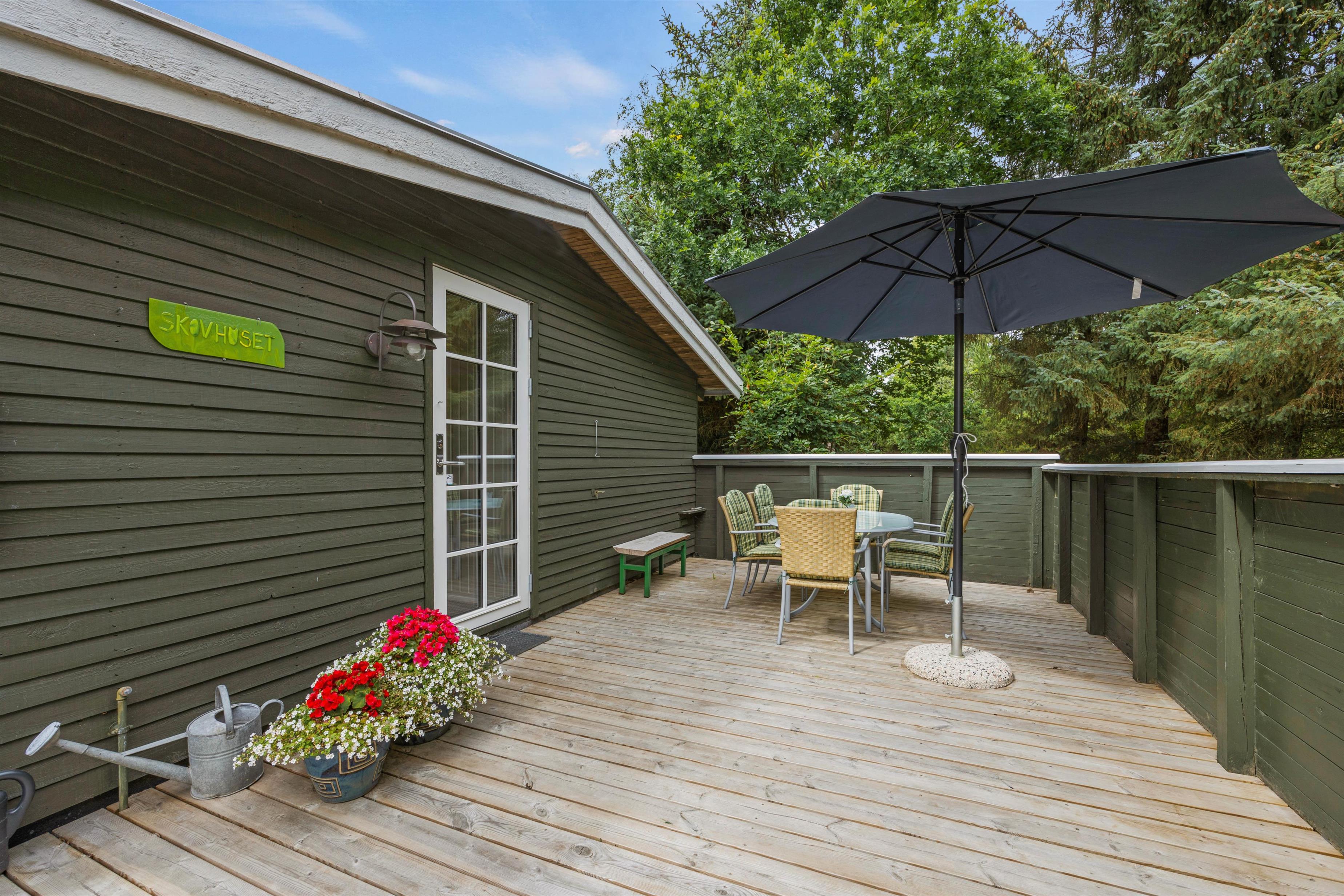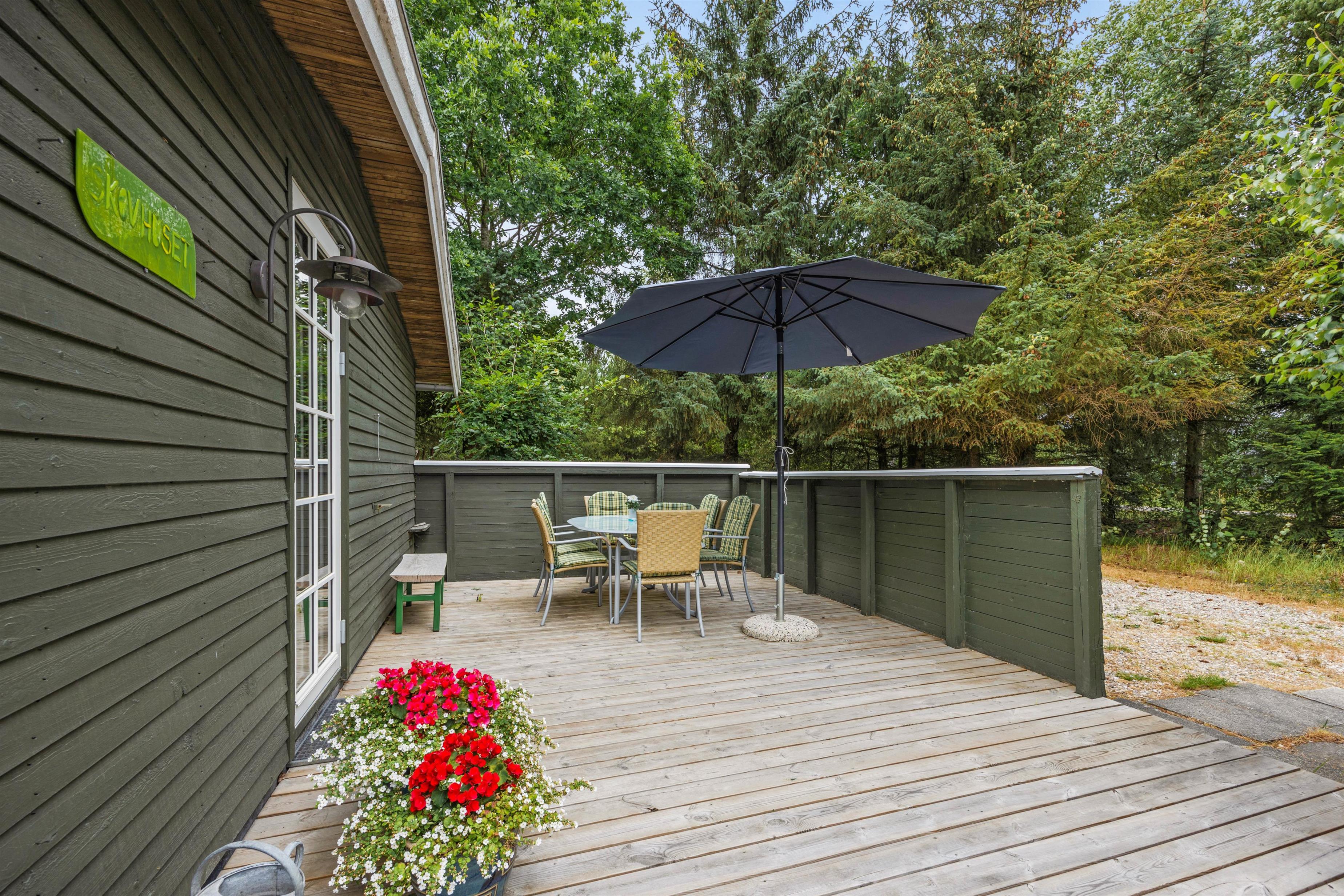 Sommerhuset er placeret på en 1850m2 stor grund, der både har plæne, men også områder, hvor græsset får lov at vokse. Den skønne terrasse er overdækket, så I kan sidde ude, selvom det skulle dryppe lidt. Den er samtidig afskærmet på flere sider, mens siden ud mod haven er åben, så I kan slappe af i de komfortable havemøbler, mens grillen varmer op og I nyder udsigten og hvem ved, måske kommer der et egern, en hare eller en hjort forbi.