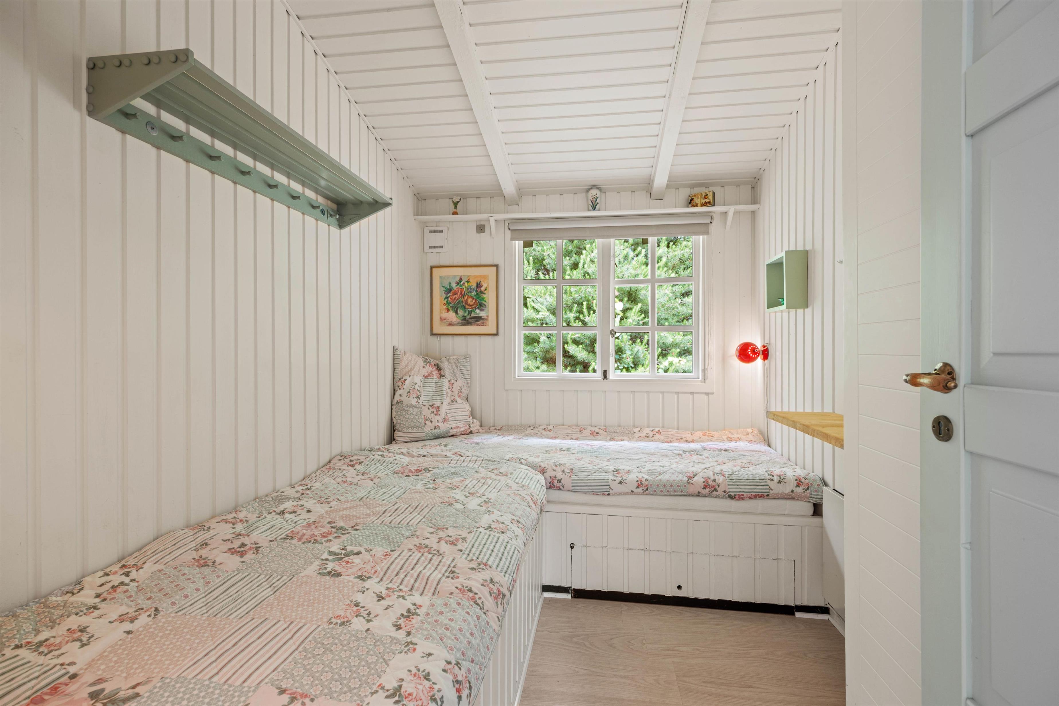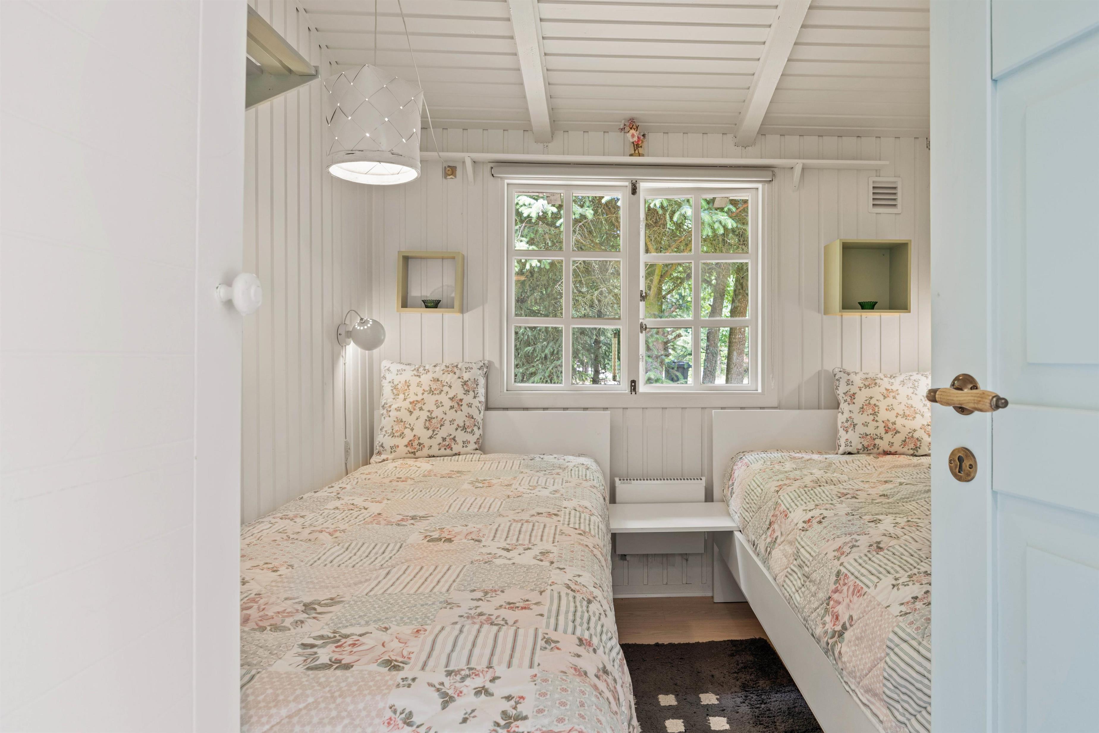 Der er 4 sovepladser fordelt i 2 hyggelige rum. Alle værelser er udstyret med 2 enkeltsenge hver. Sommerhuset har også 1 badeværelse, hvor der er gulvvarme, så I ikke skal fryse fødderne på de køligere dage.