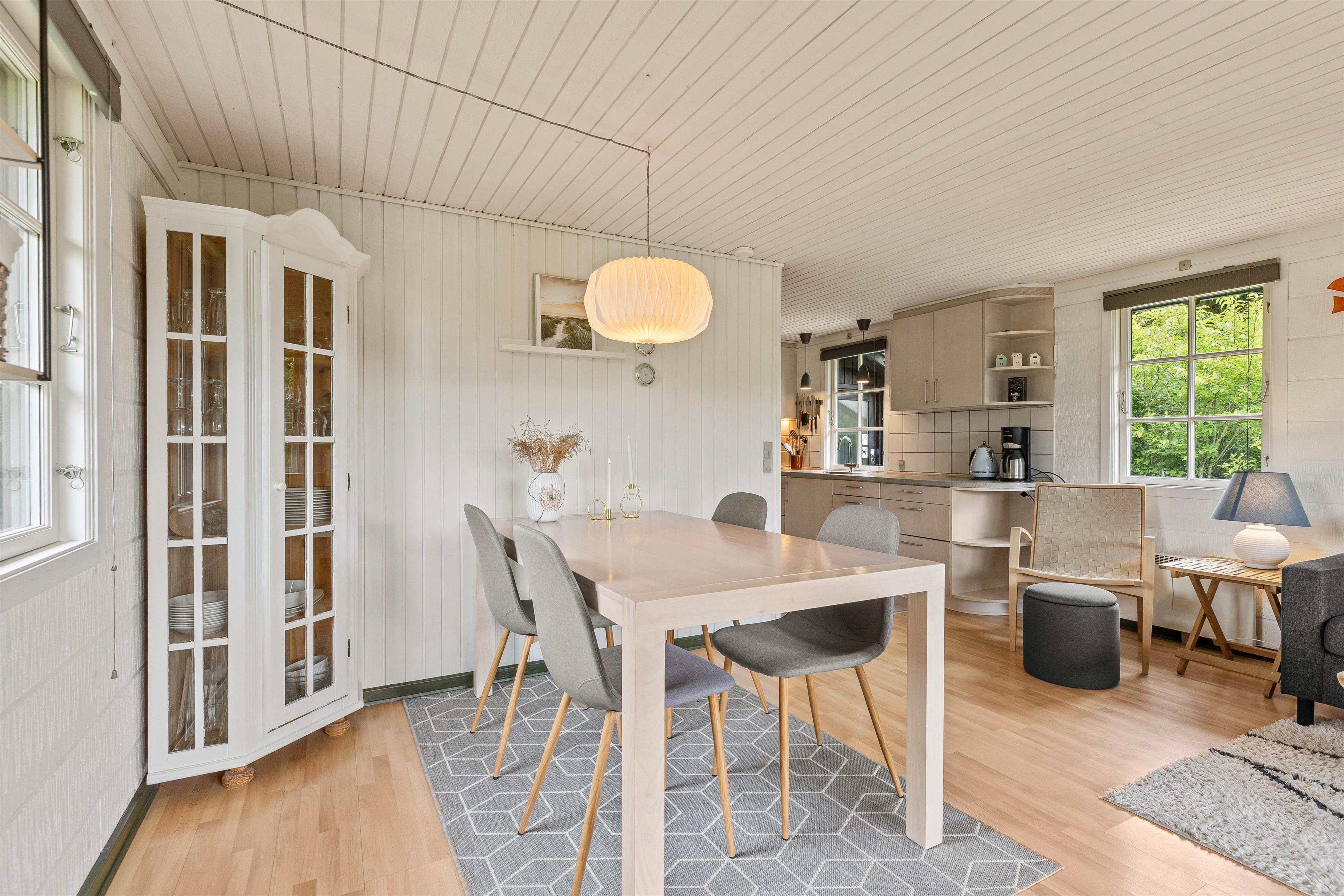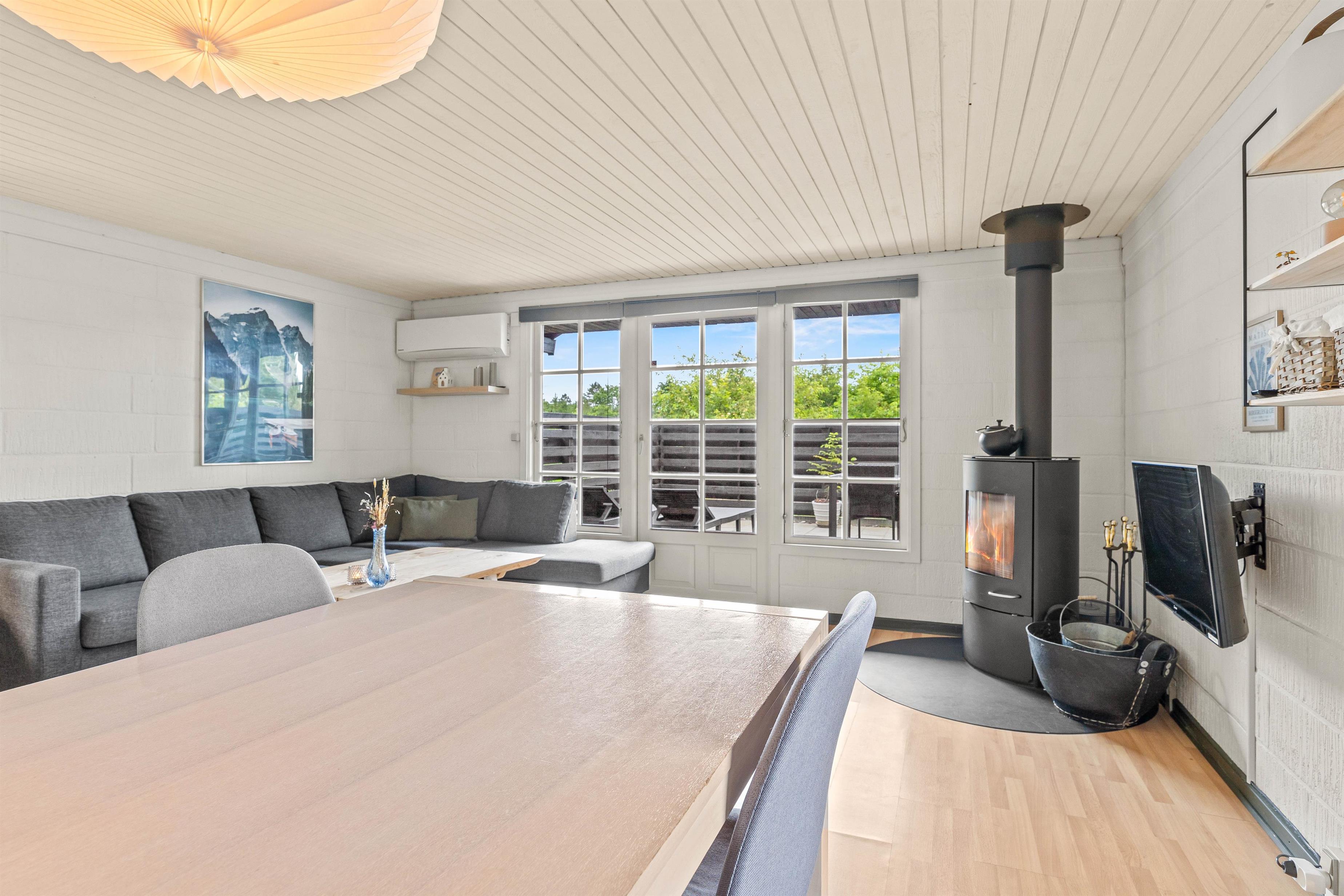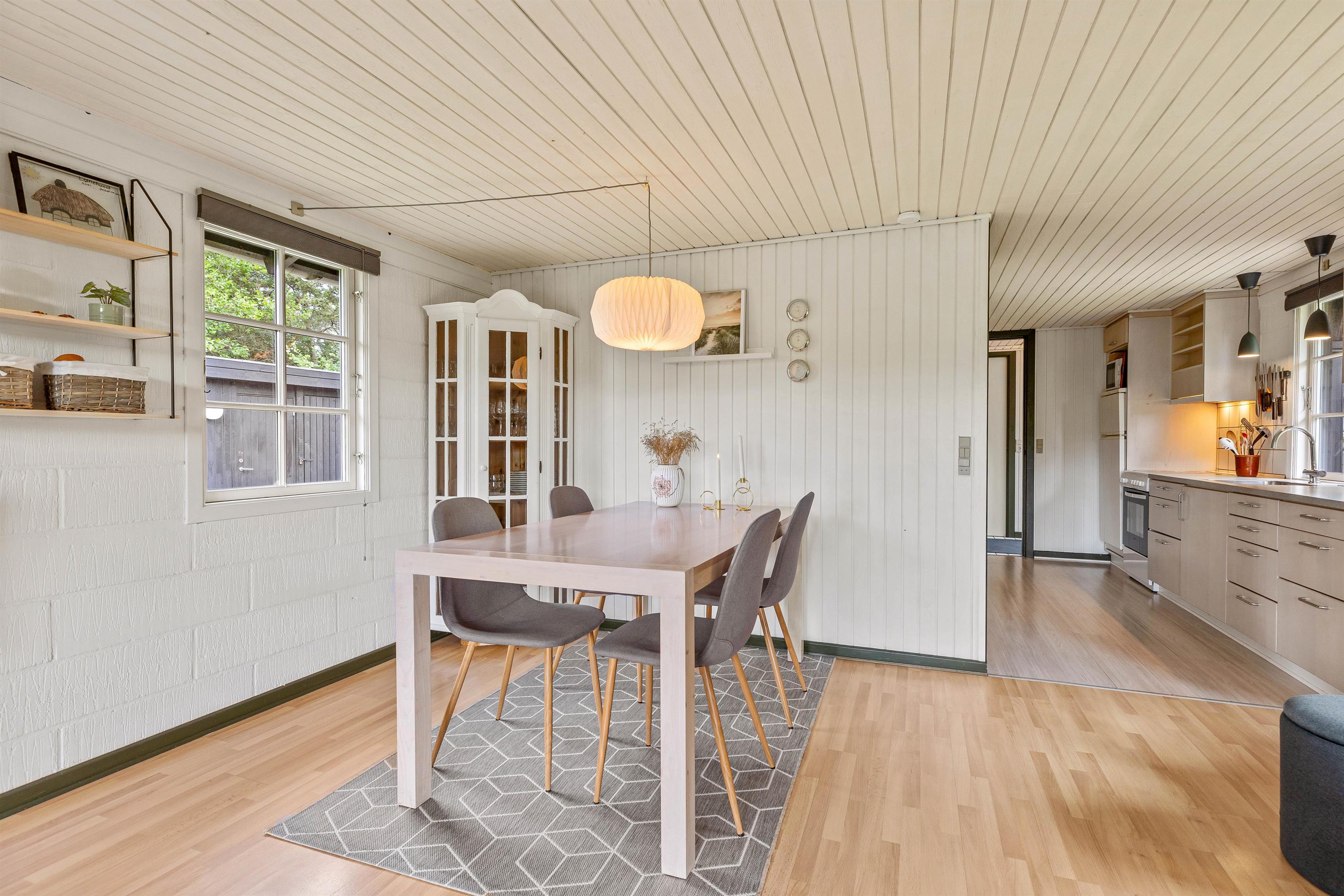 Køkkenet er i direkte forbindelse med spisestuen og stuen. Her kan I samles ved spisebordet eller i sofaen til diverse brætspil eller puslespil. En brændeovn i sommerhusets stue afrunder billedet og giver den klassiske sommerhusstemning.