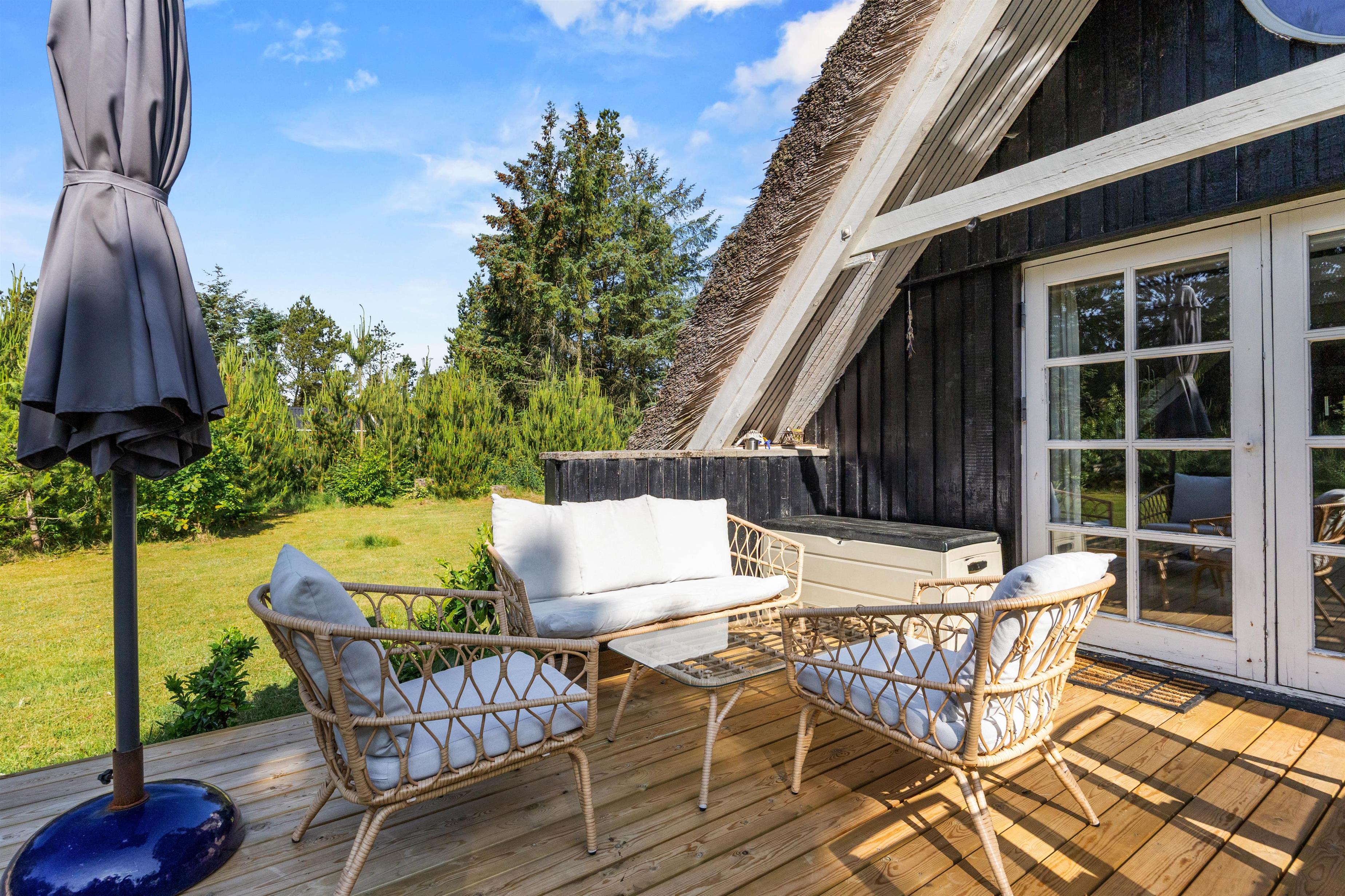 Når benene skal op, kan I slappe af på husets sydvendte terrasse, hvor der er mulighed for sol det meste af dagen. Her kan I finde havemøbler og liggestole frem og nyde et glas vin i eftermiddagssolen eller en god kop kaffe om morgenen. Terrassen er også afskærmet, så I kan krybe i skjul for vestenvinden.