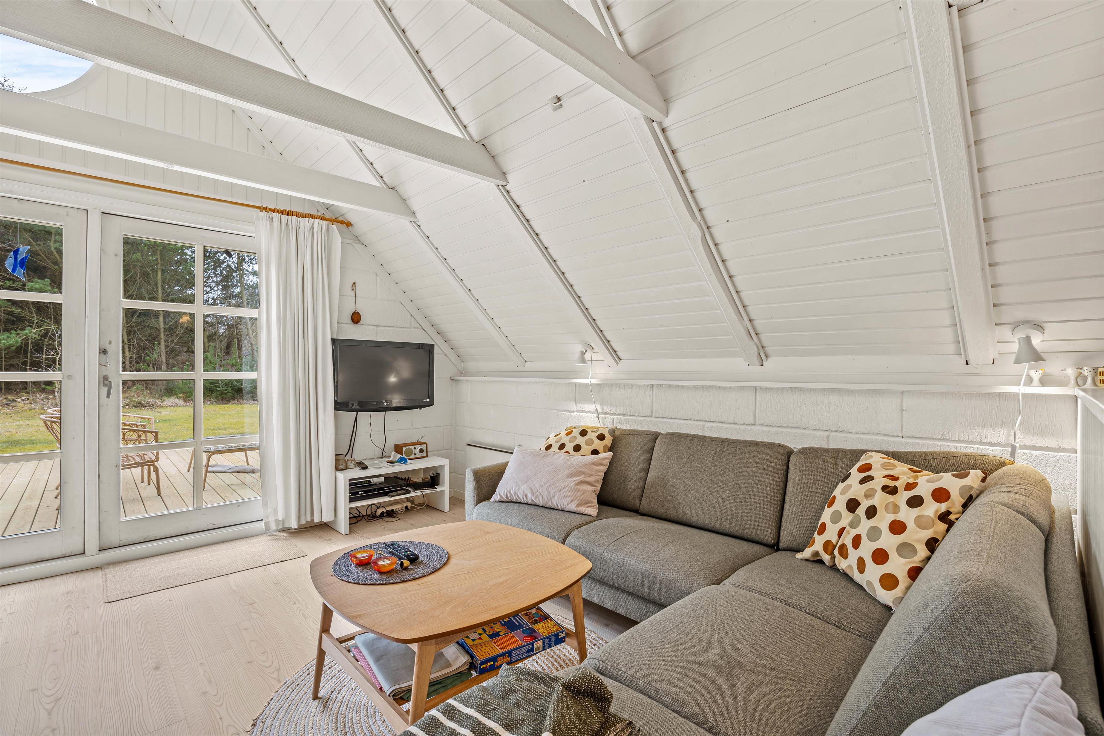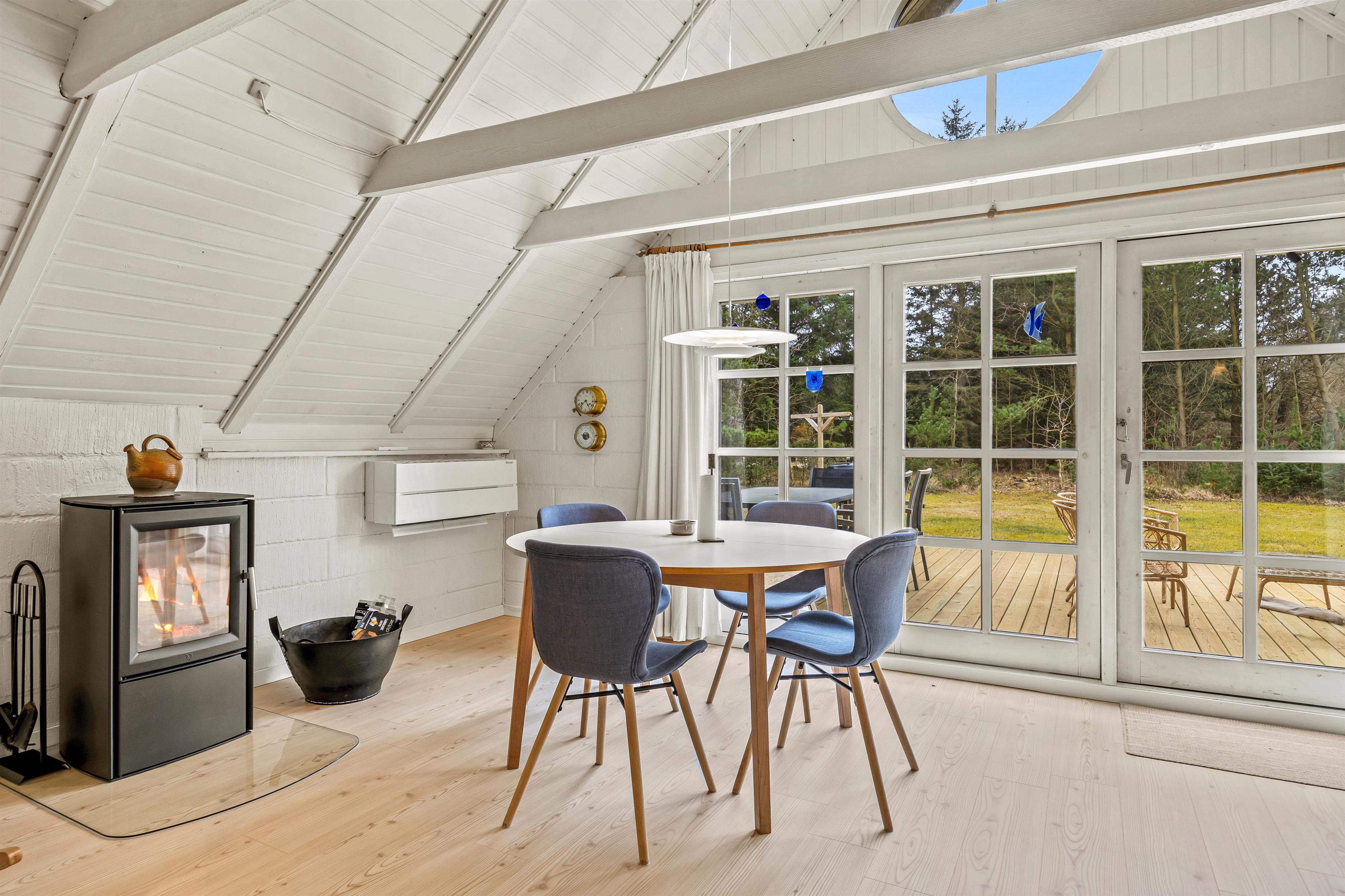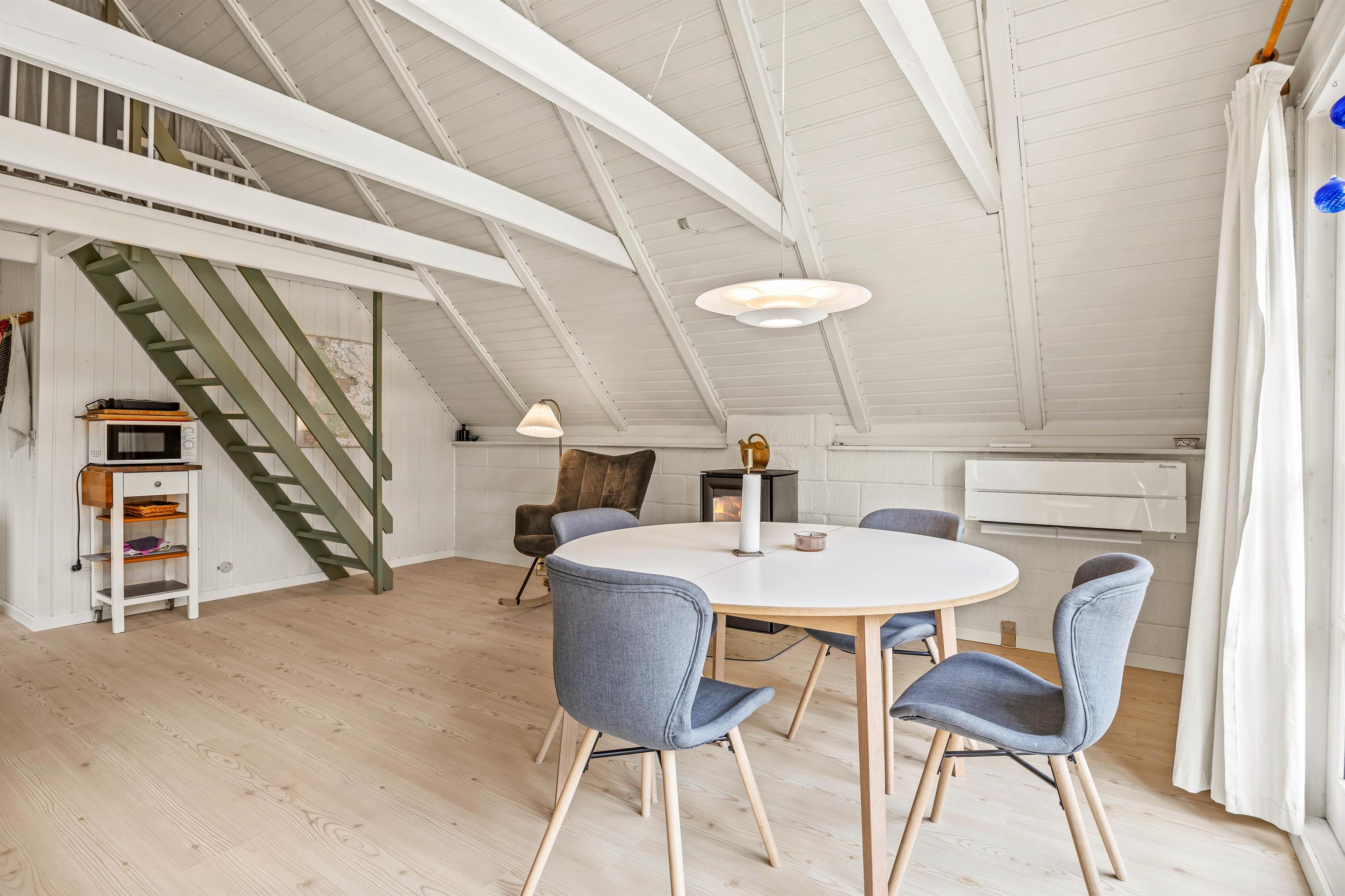 Sommerhuset er hyggeligt indrettet, og det er oplagt til hygge og socialt samvær med familien. Feriehuset har kombineret stue, køkken og spisestue, så hele familien kan være med, når der laves mad, ses film eller spilles brætspil foran brændeovnen. Når børnene skal have fred til at lege, kan de kravle op på sommerhusets hyggelige hems, hvor der er god plads til dem at lege på.