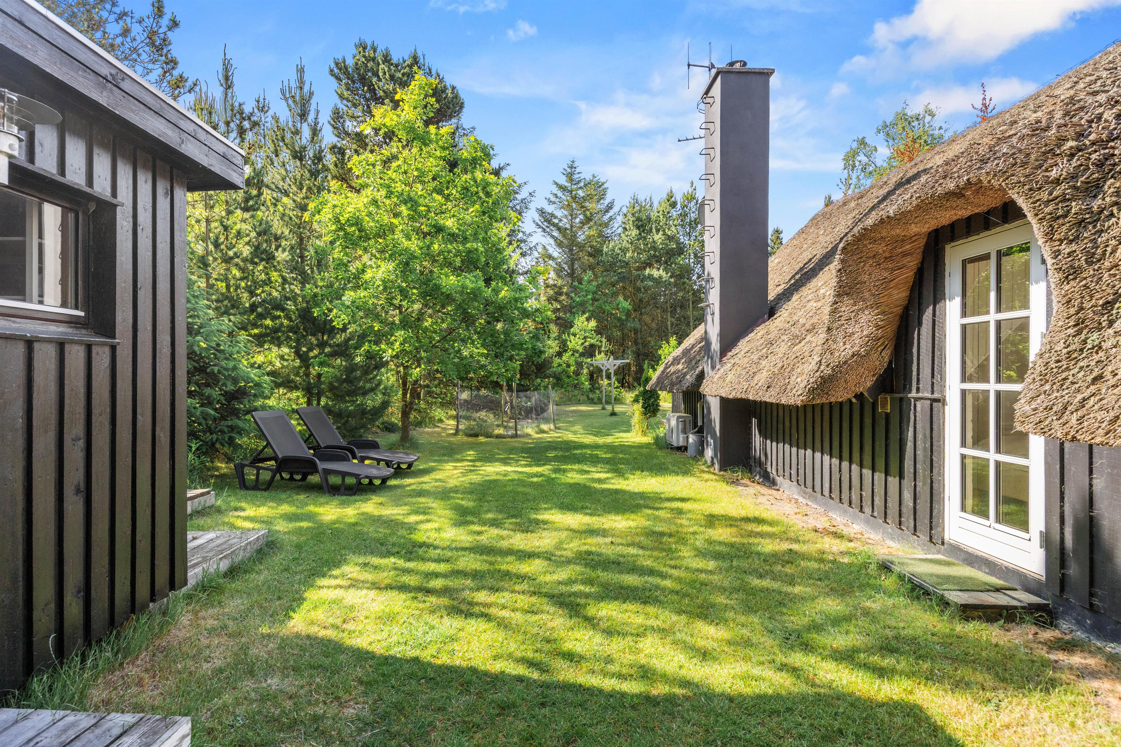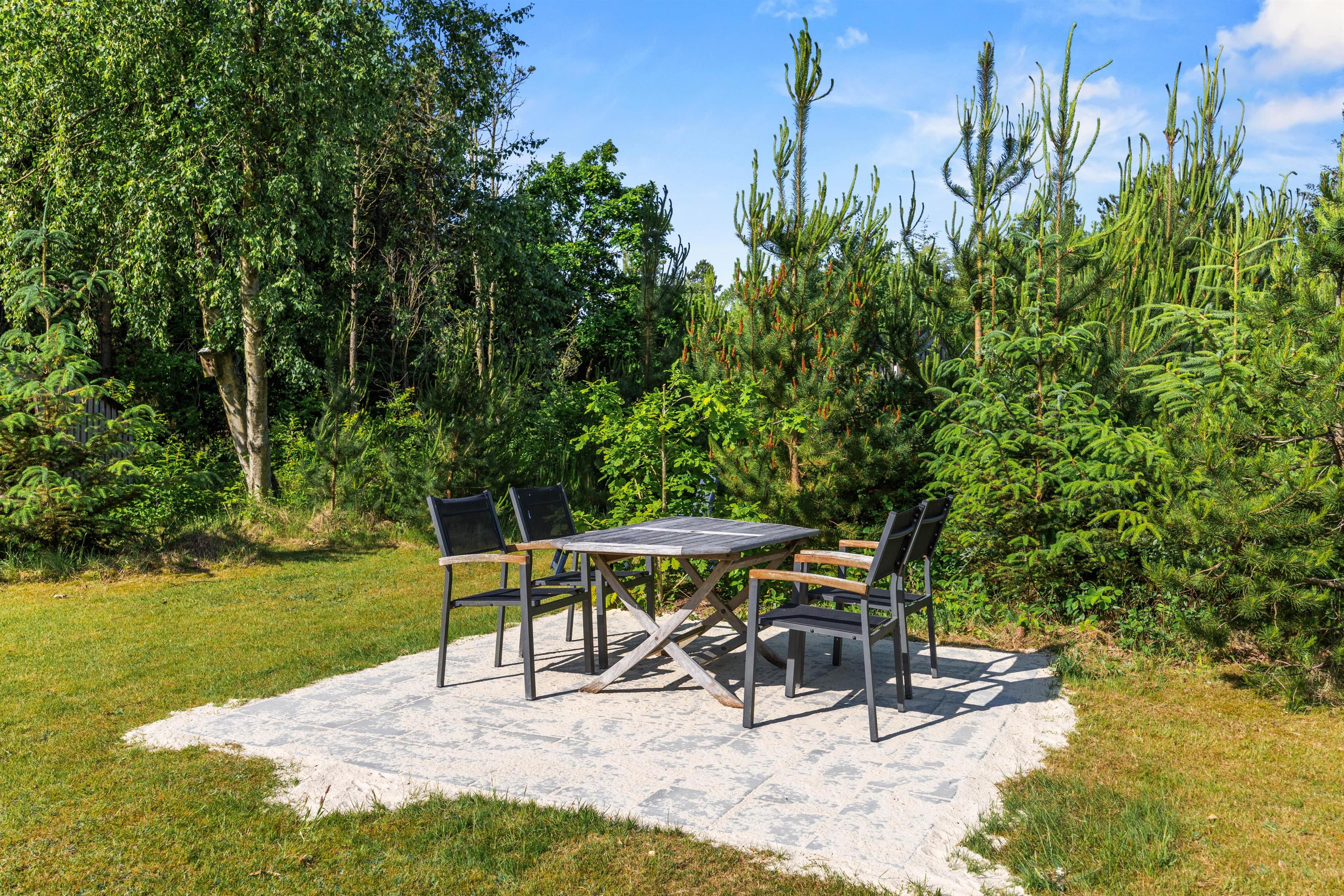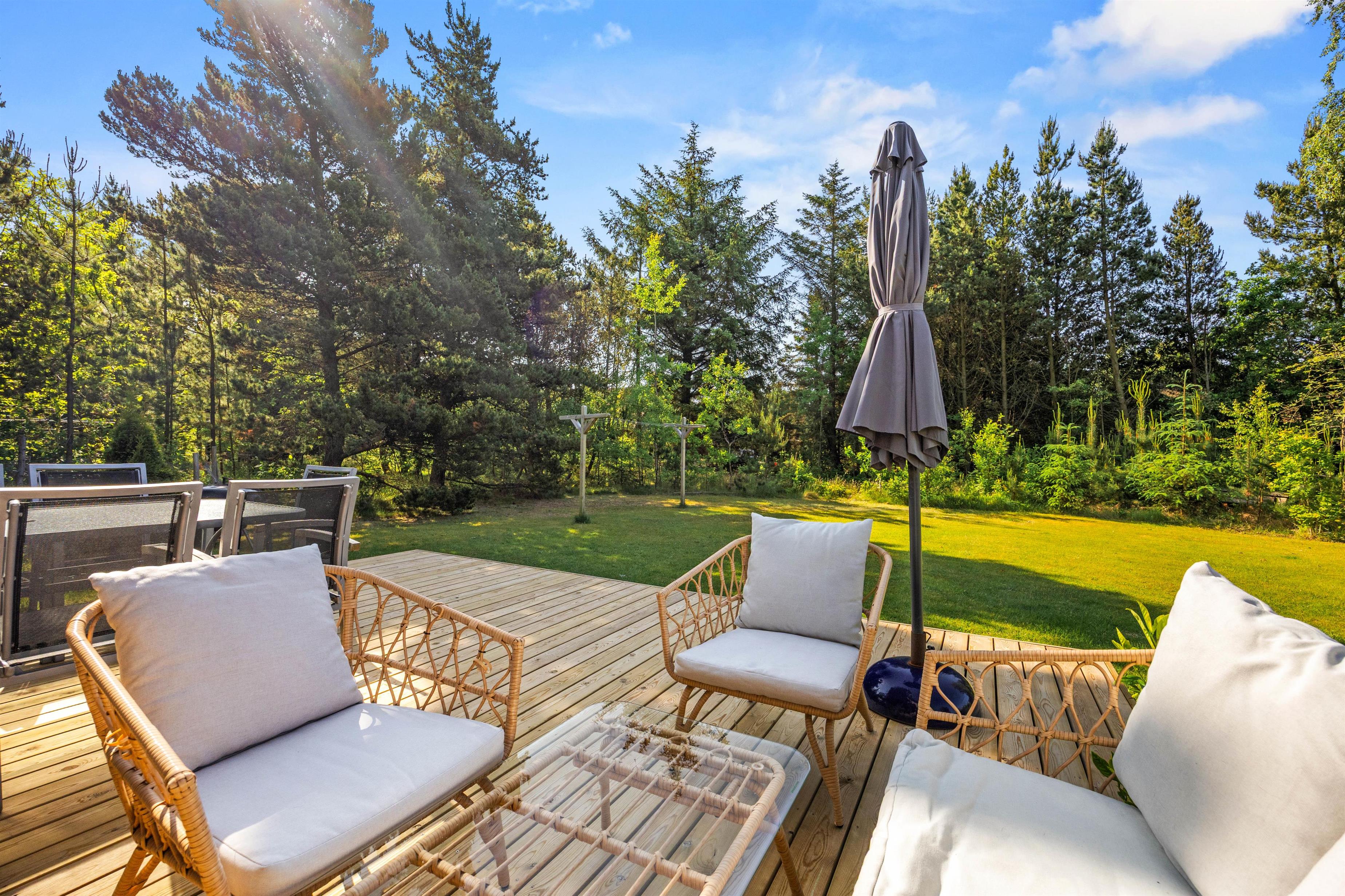 Feriehuset er beliggende på en 1.400 kvadratmeter stor grund. Den er omkranset af træer og sørger for, at I har privatliv i ferieafslapningen. Sommerhusets store græsplæne er oplagt til leg med hunden og boldspil med børnene.