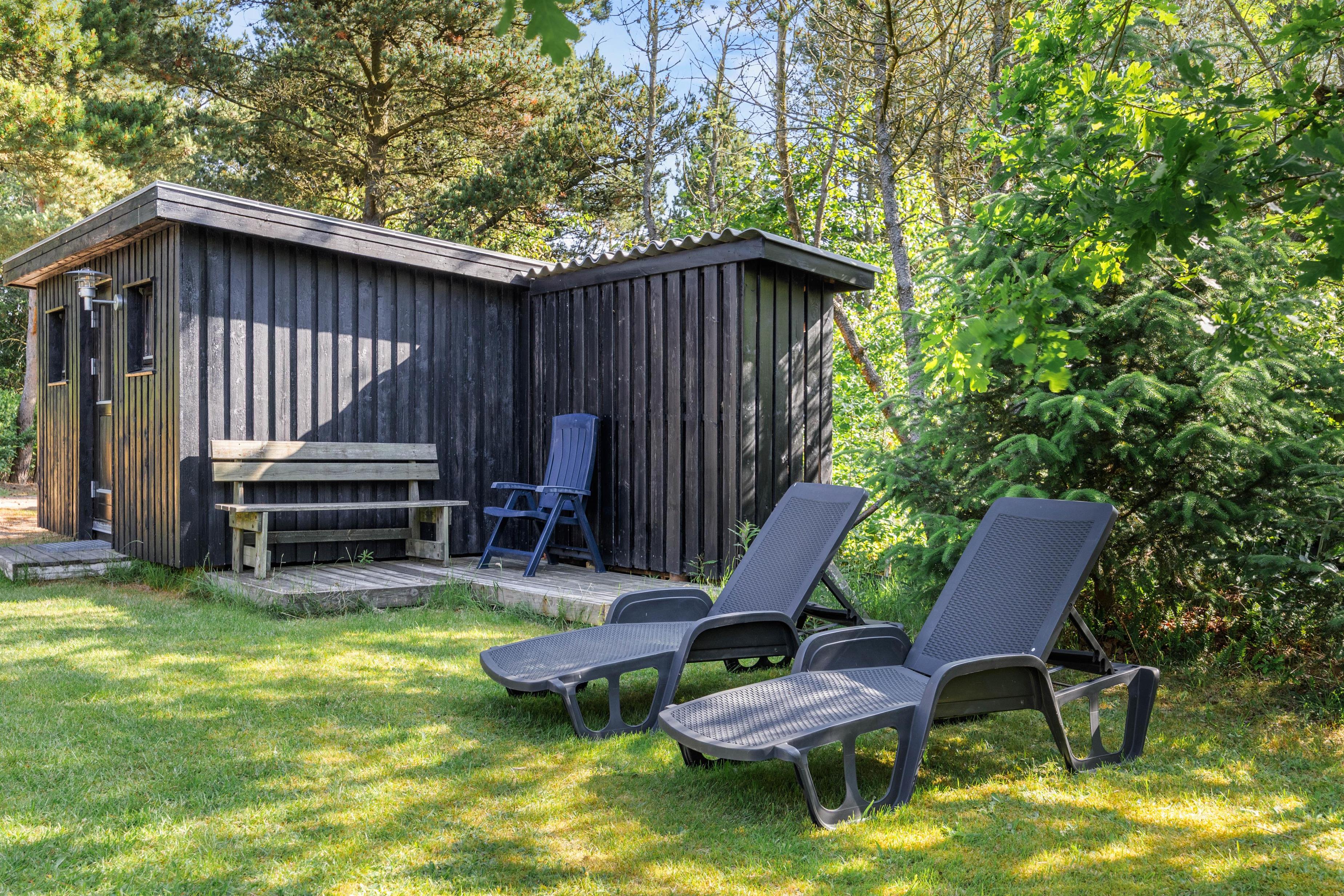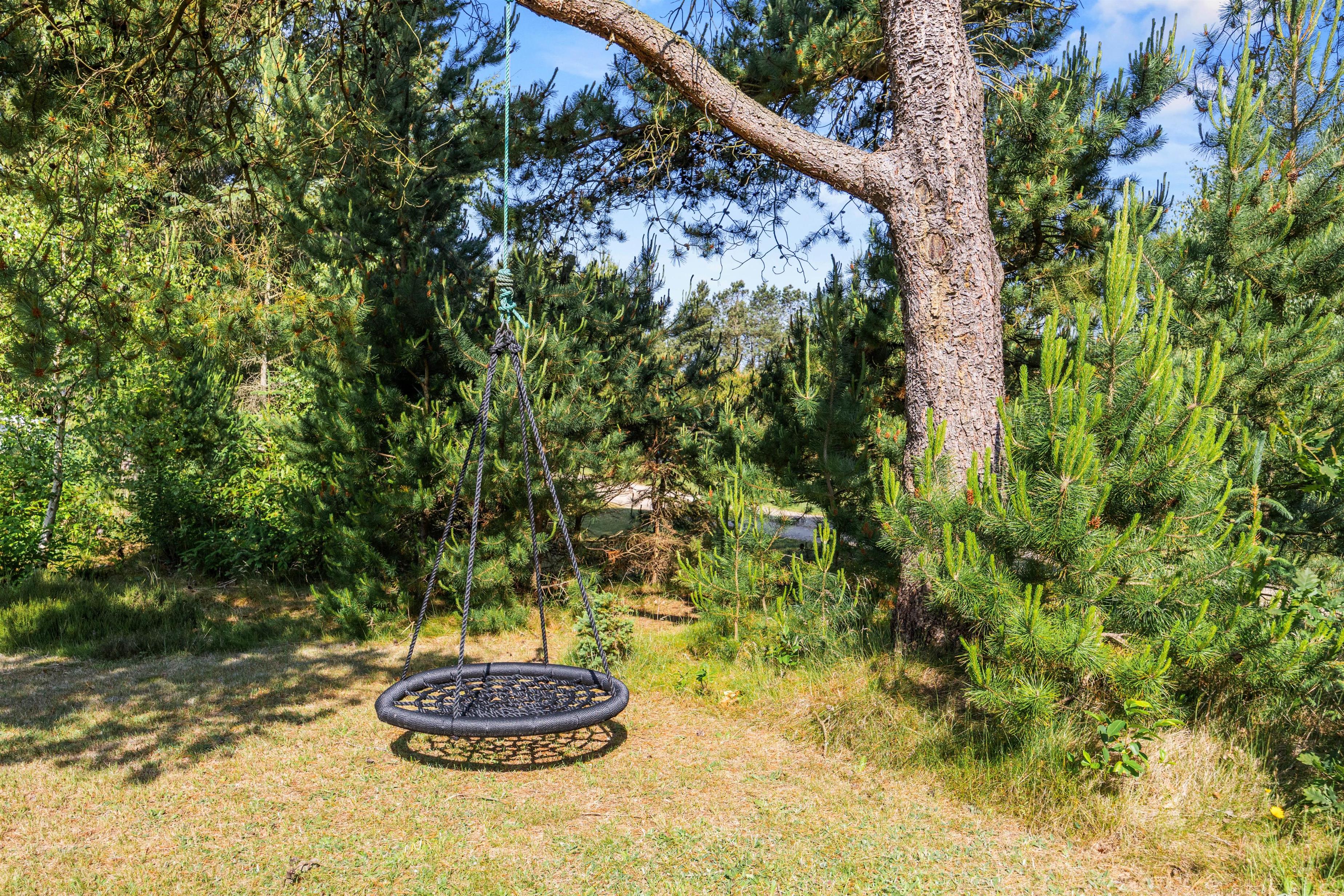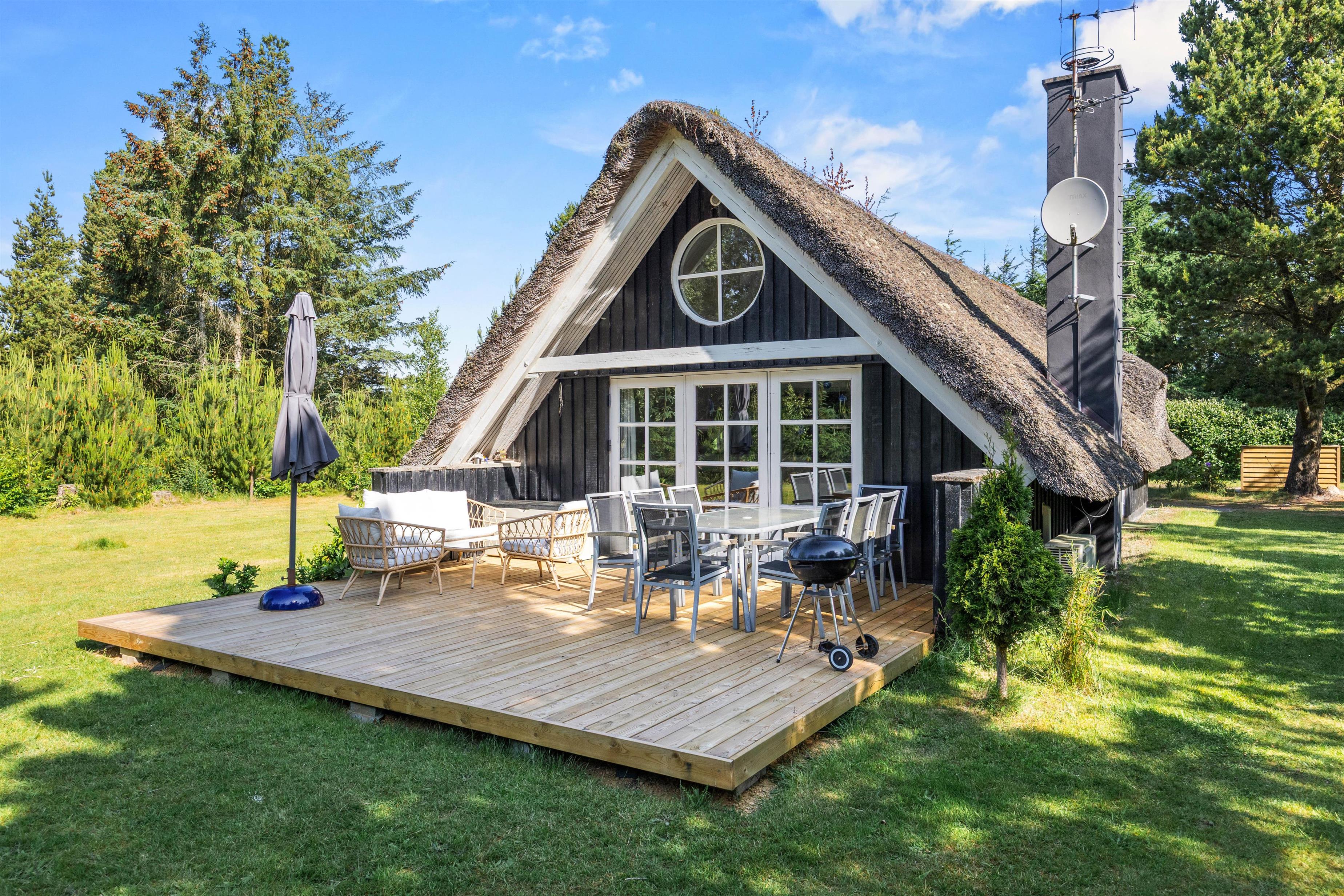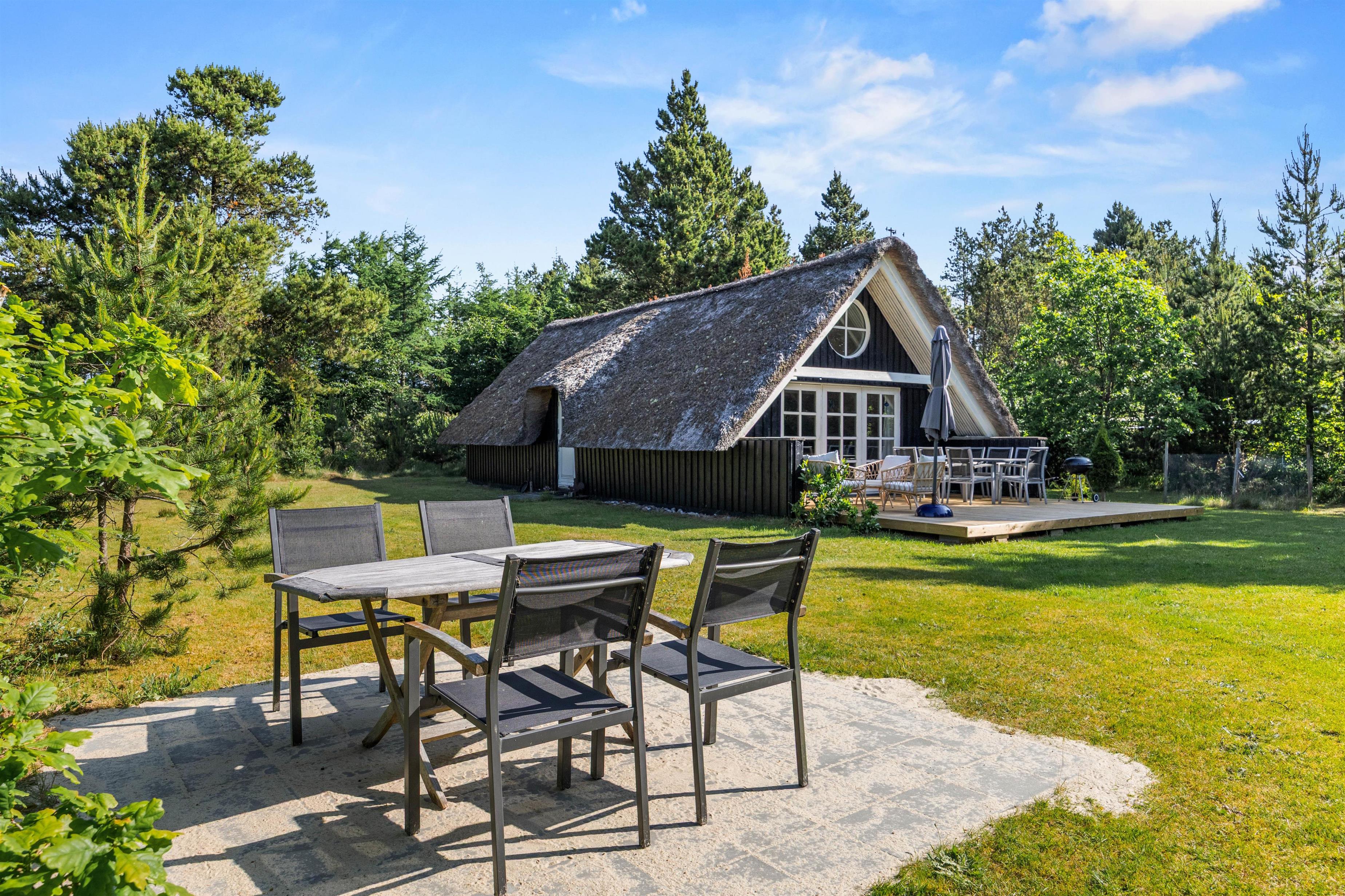 Feriehuset er beliggende på en 1.400 kvadratmeter stor grund. Den er omkranset af træer og sørger for, at I har privatliv i ferieafslapningen. Sommerhusets store græsplæne er oplagt til leg med hunden og boldspil med børnene.